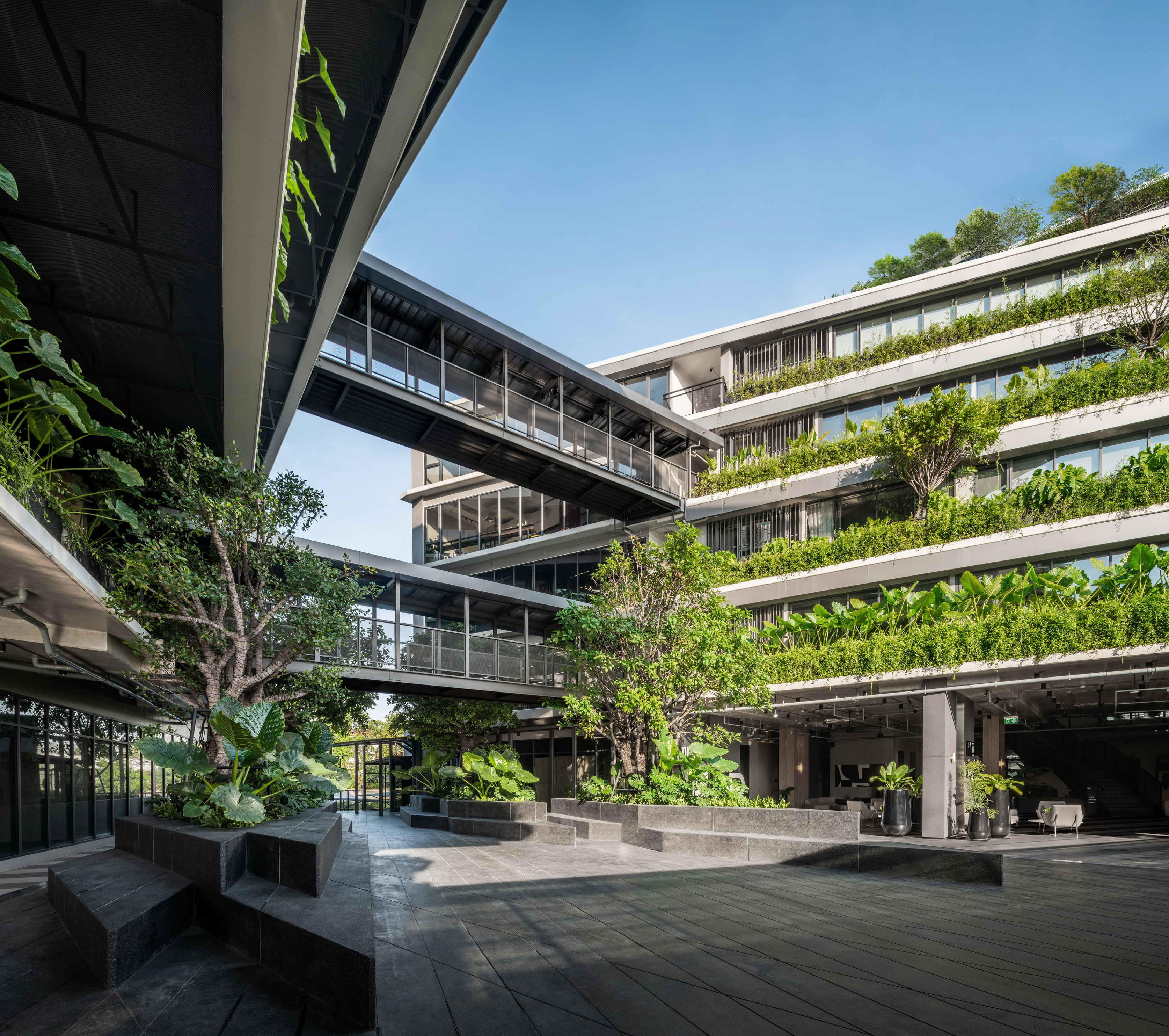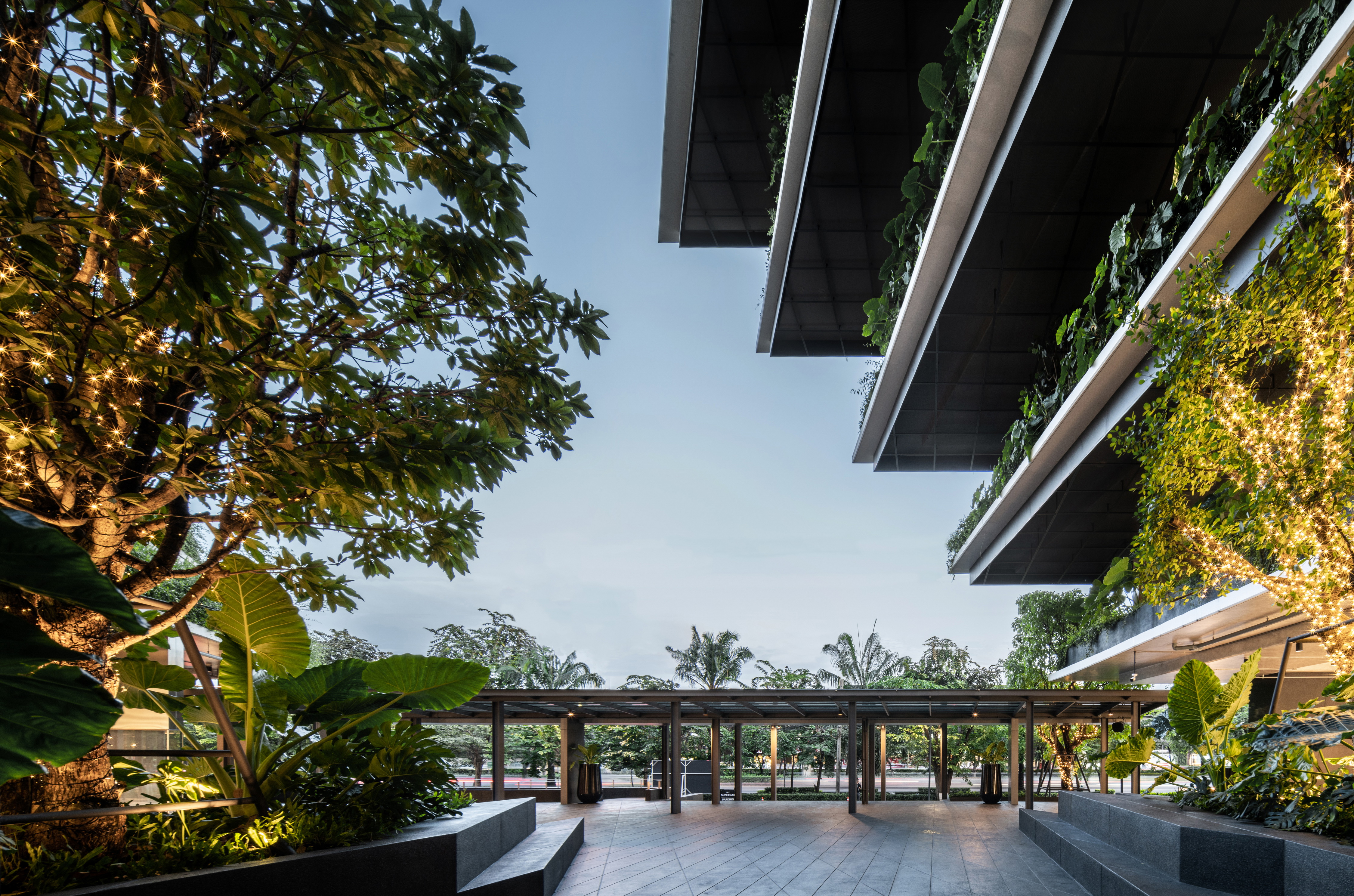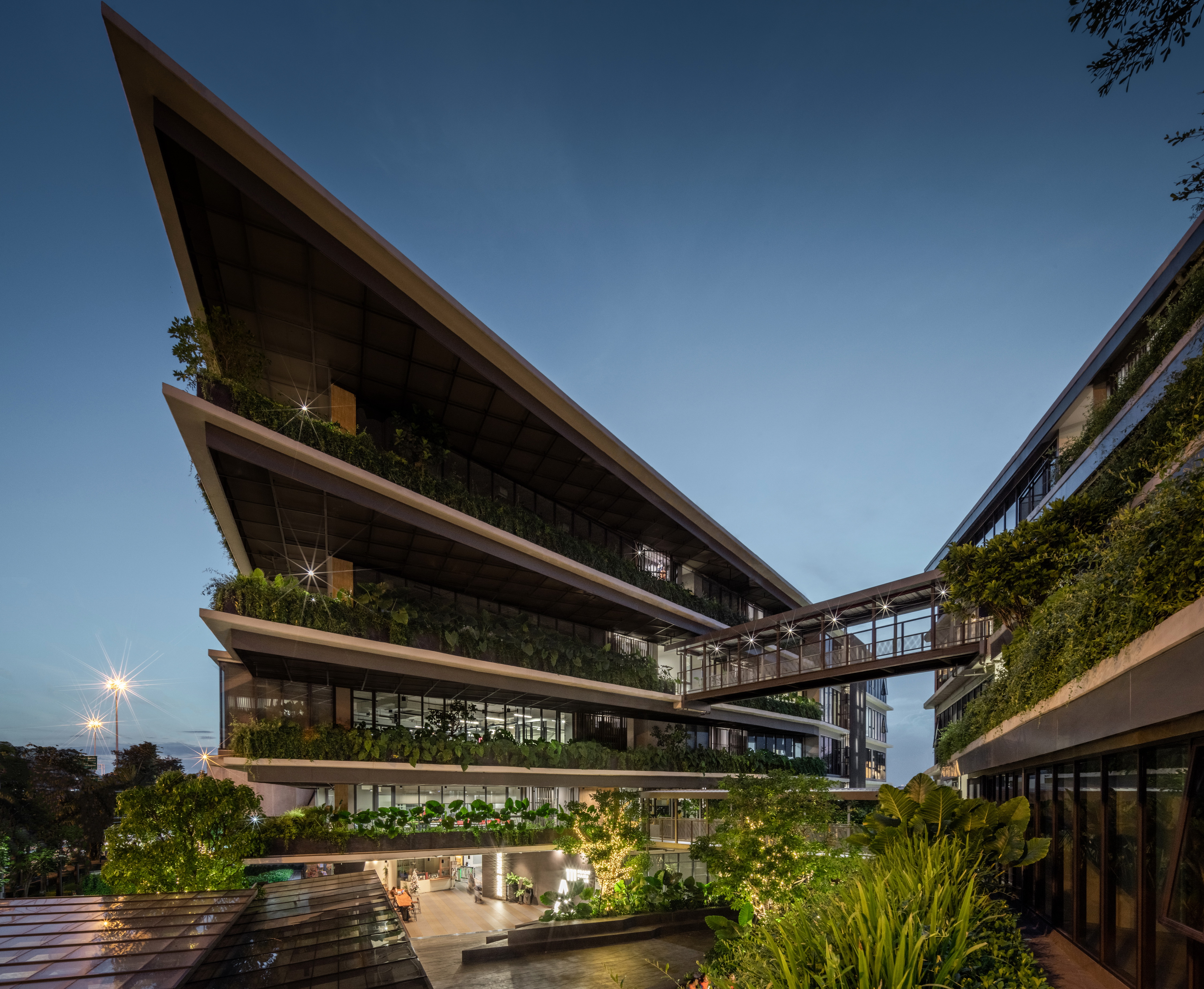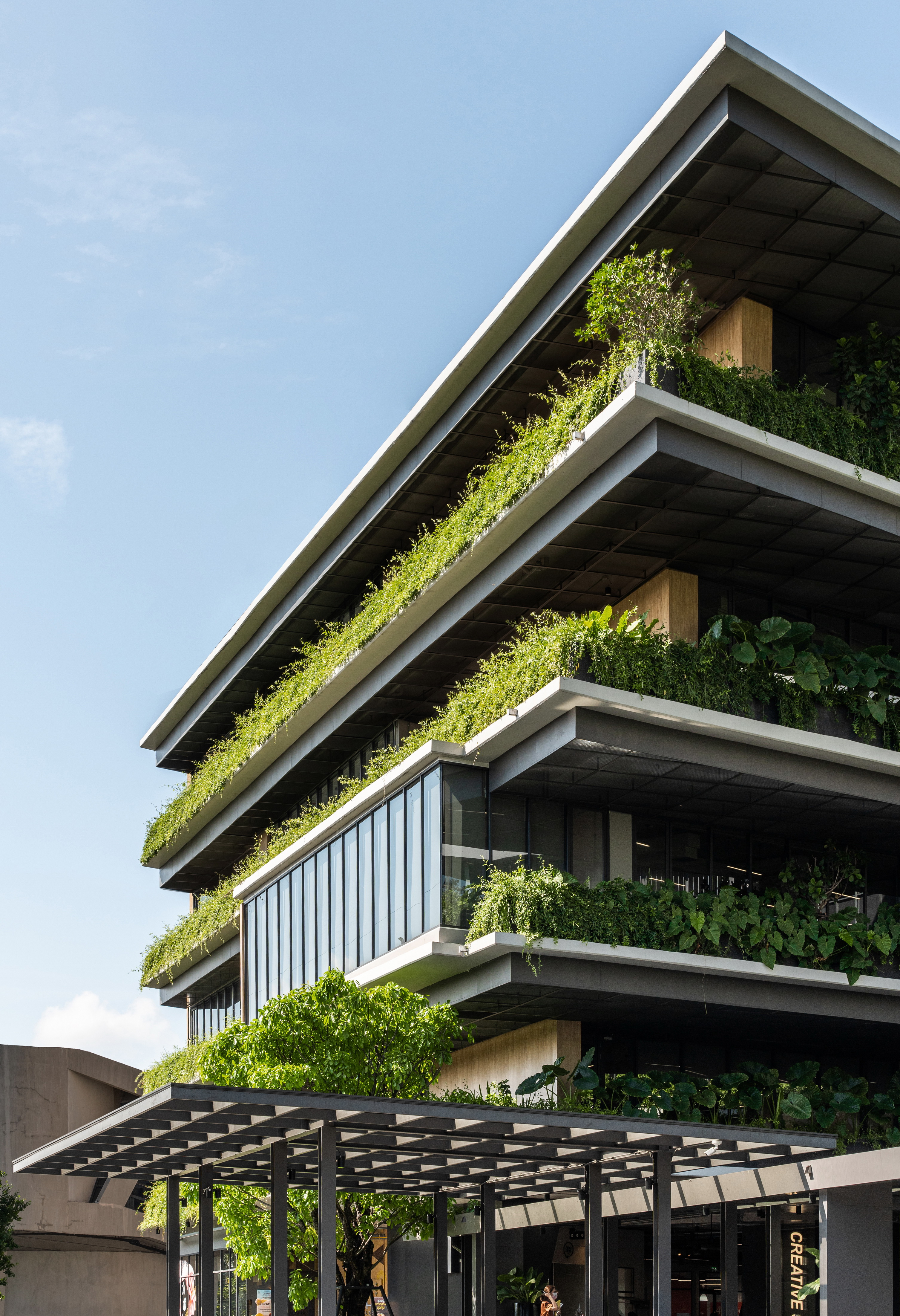 In a dense urban context where green area and spaces for leisure or recreation are scarce, the project seeks to bring nature into the office life in the areas for landscape within the tiered balconies that feature layers of green on the sheared triangular mass, pockets of green spaces within the semi-outdoor terraces and the outdoor public plaza that also acts as the central atrium and lobby. The shear cantilevered mass provides all-day shading to this large communal space, to encourage interaction and foster a sense of community with diverse tenants of this creative hub.