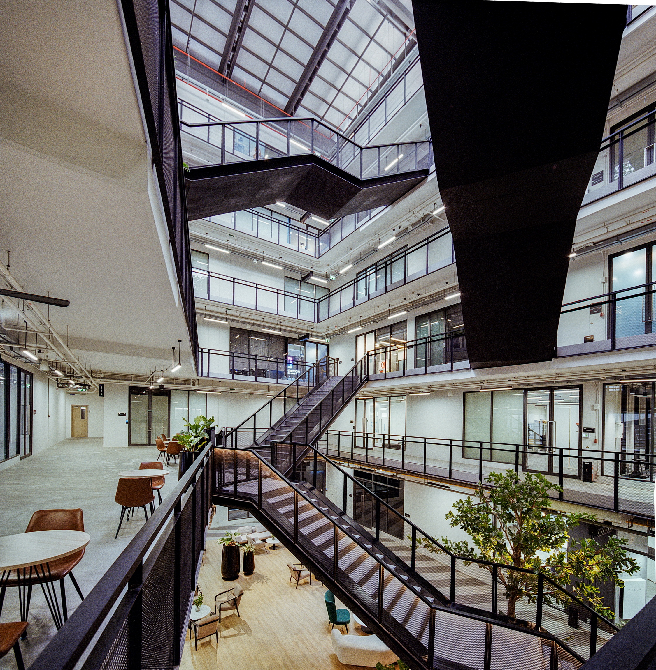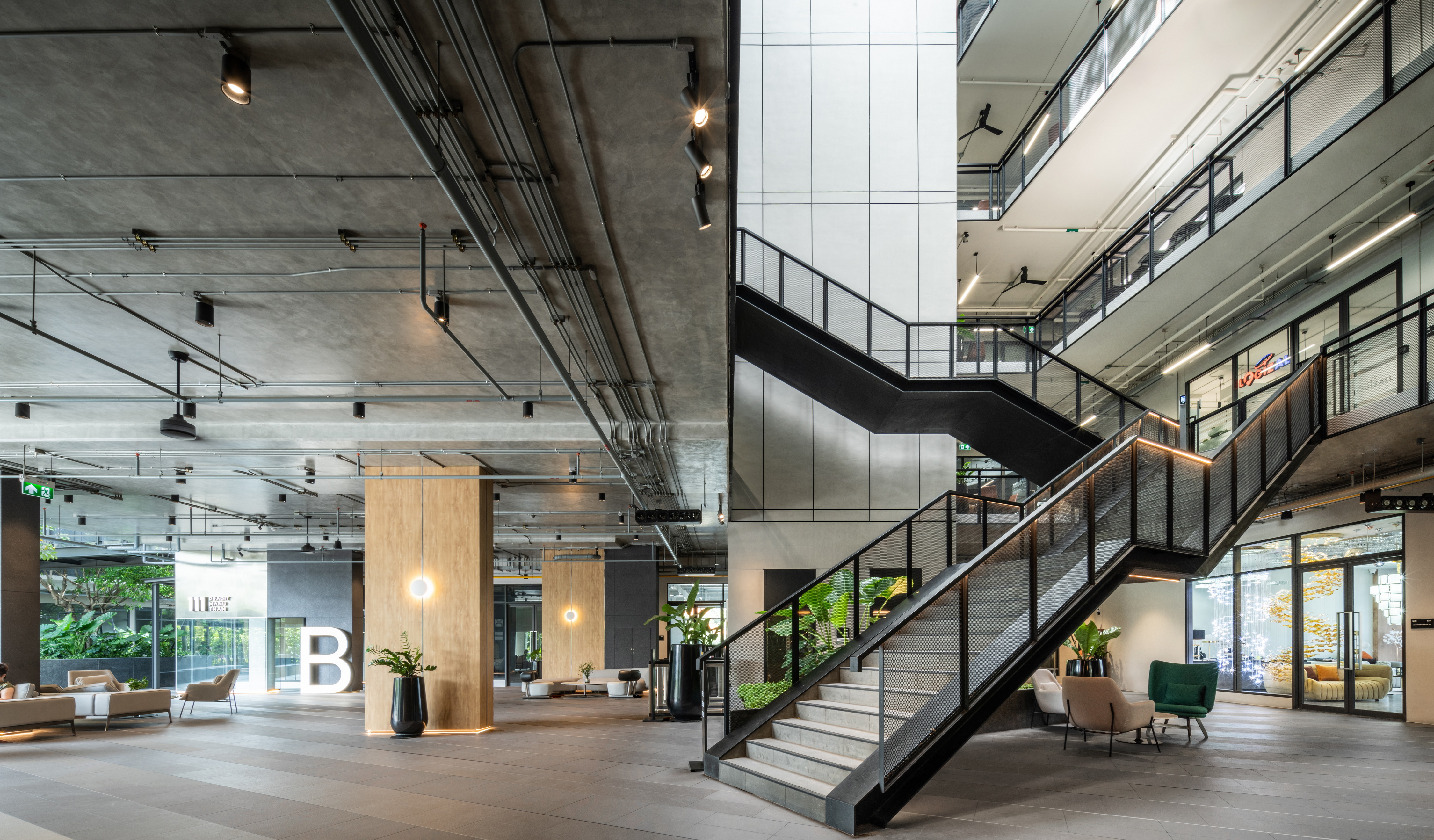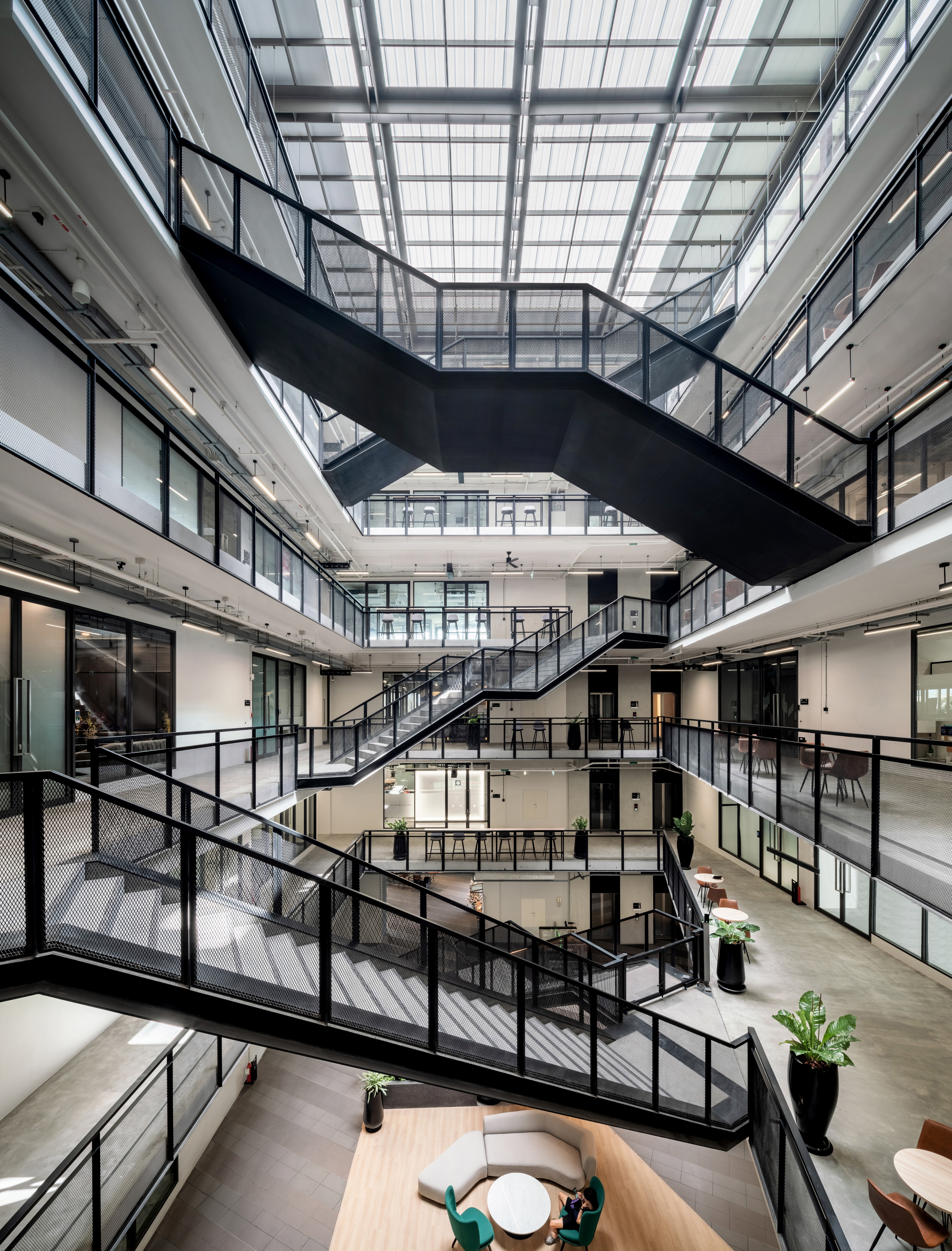 Flexibility, sustainability and feasibility are the three main concerns of the project. Leasable area is divided into multiple unit types and allocated in diverse arrangements throughout the buildings. Each unit is an open plan, allowing flexibility. To enhance the quality of space, leisure areas consisting of inner courtyards, skylights, green pockets and semi-outdoor decks are embedded into the buildings, allowing daylight to benefit the functional space and natural ventilation to flow through the common areas. User experience and optimizing working conditions became the driving force behind not only the overall design and massing of the project, but also in the integration of aspects including interior and lighting, resulting in a coherent space that engenders wellness, collaboration and community within the work environment.