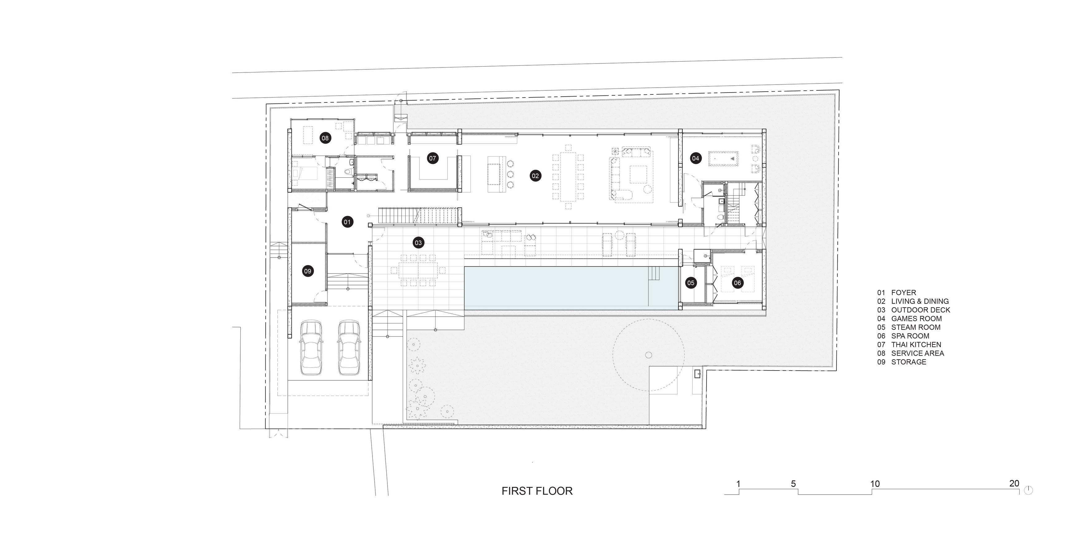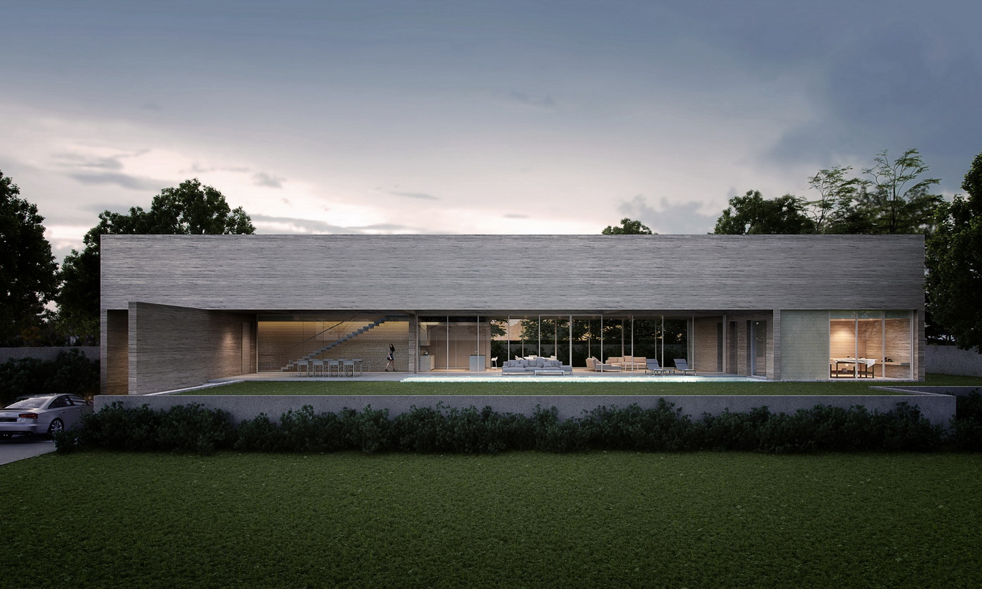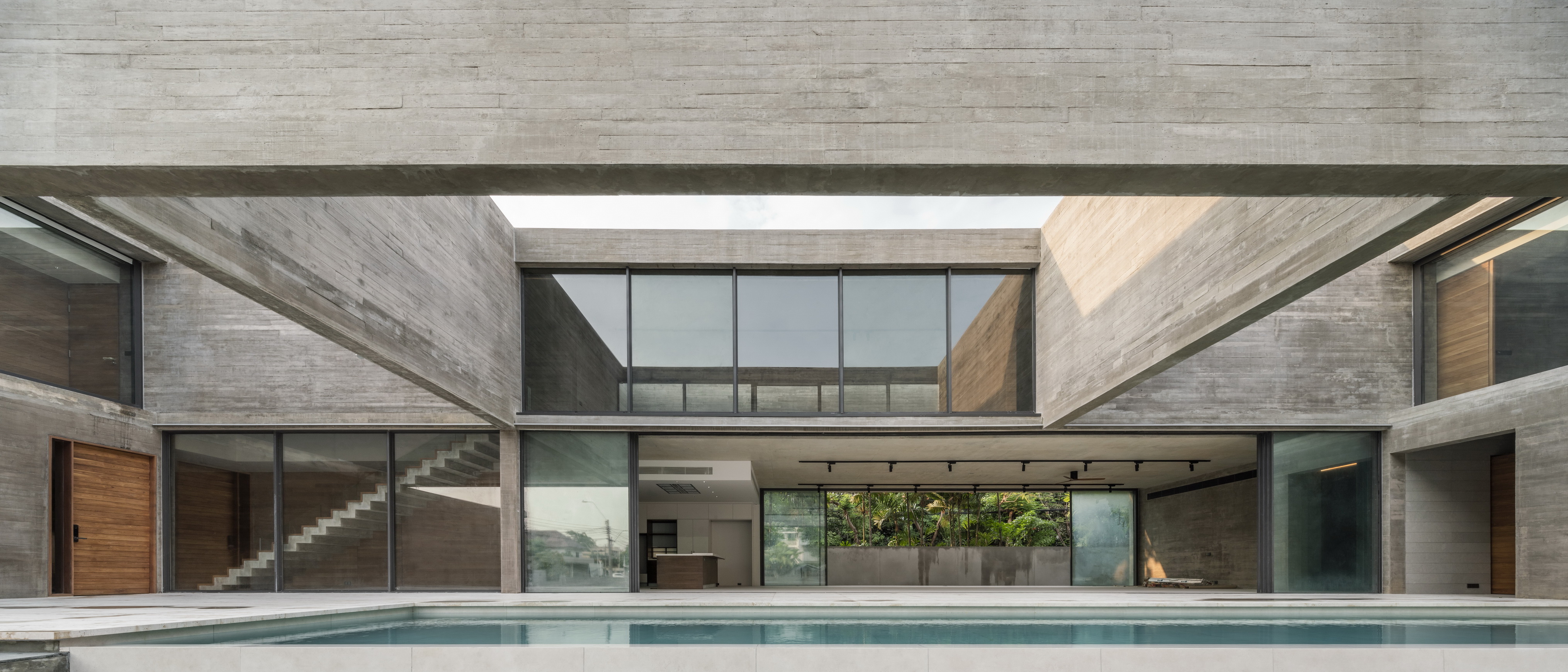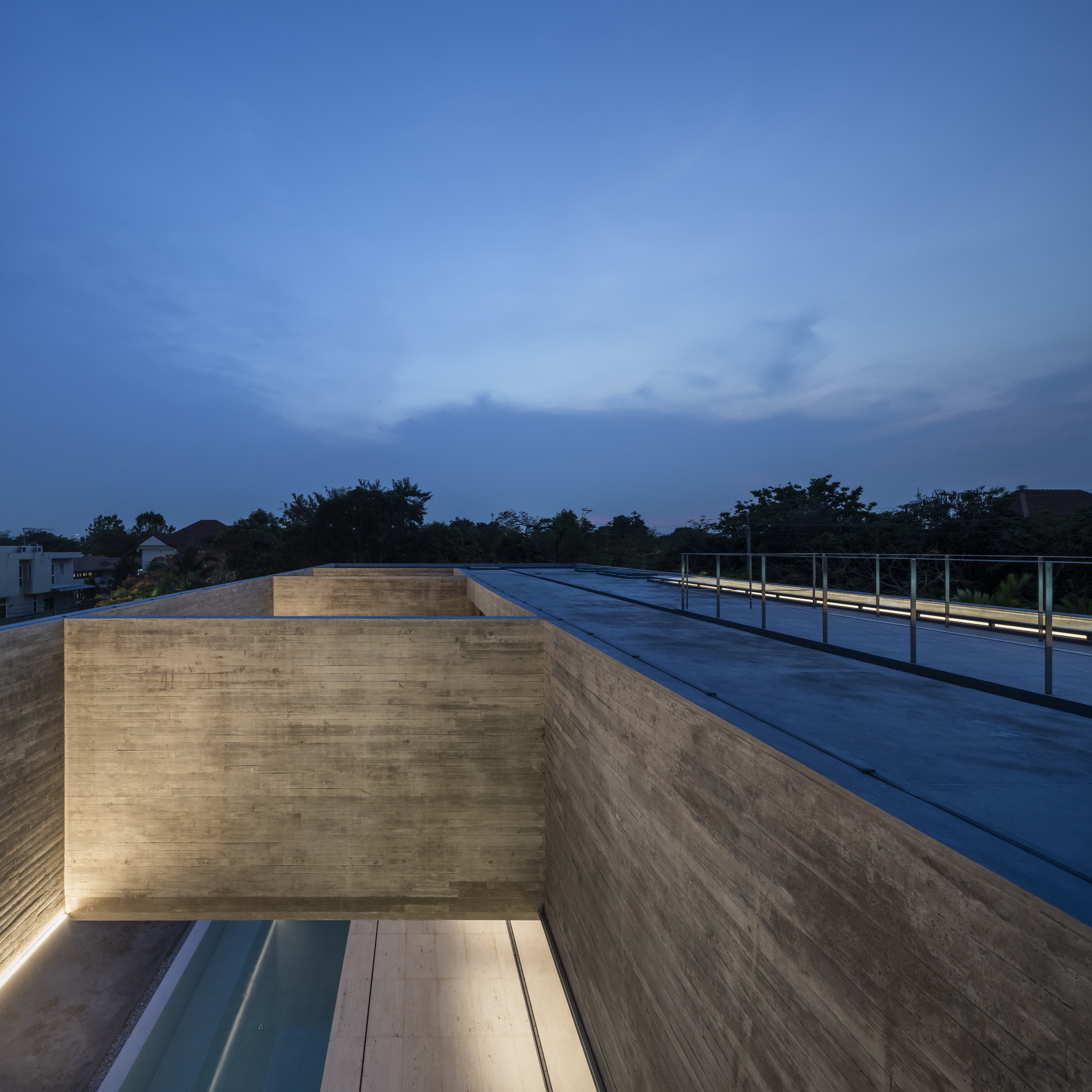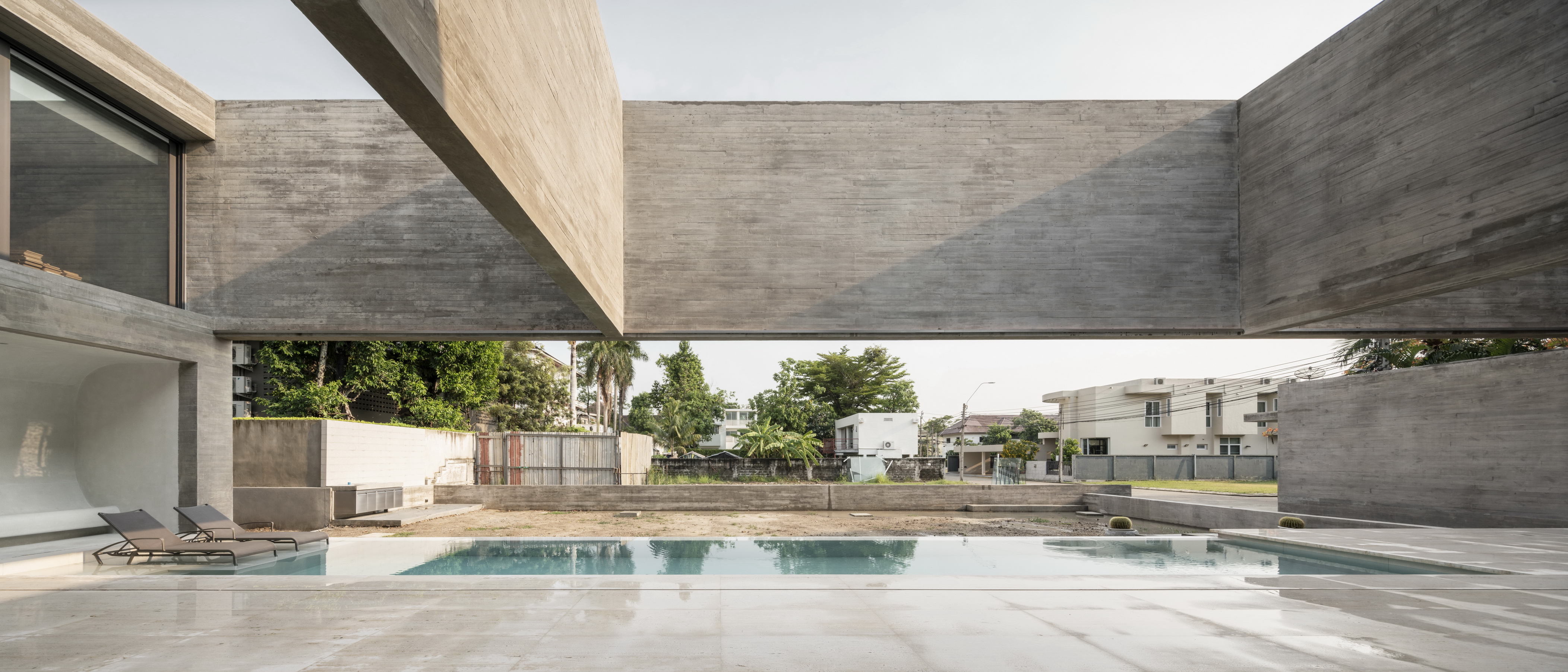 While providing visual barrier towards the surrounding neighborhood, the cast-concrete planes also act as a buffer, providing sound barrier from the public road directly adjacent to the site. Divided into two levels, the semi-public living quarter on the ground floor compose of various thresholds that blur the lines between garden-pool-living and interior and exterior spaces, while the upper level consists of private quarters for its residents. Expressing the internal program and function, the planes divide each living quarter to maintain privacy and give distinction to each bounded space. Contrarily, the 37 m. long-span cantilevered plane on the second-floor act not only as the main façade of the residence, but a consistent ‘backdrop’ that tie each of the quarters together.