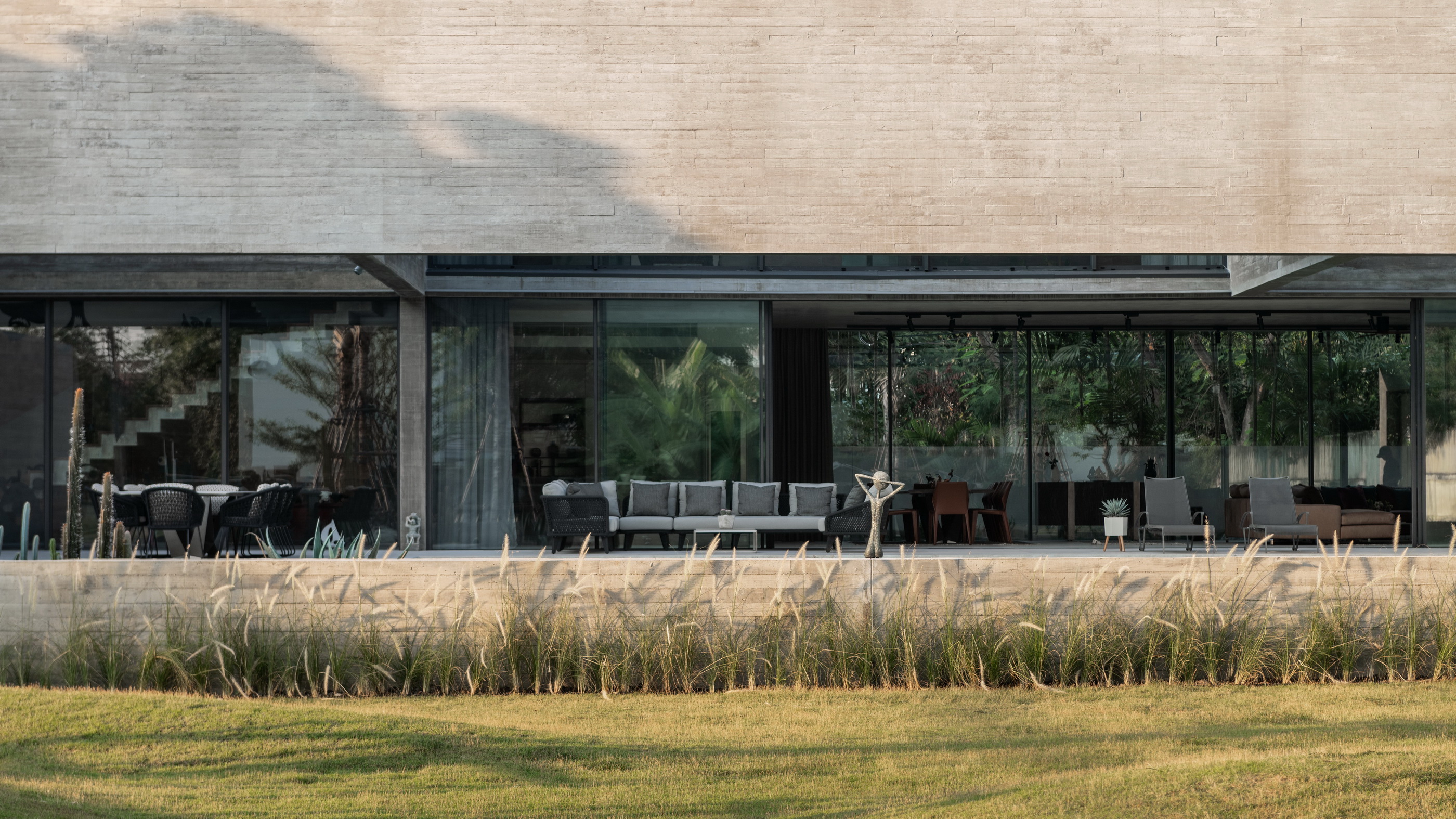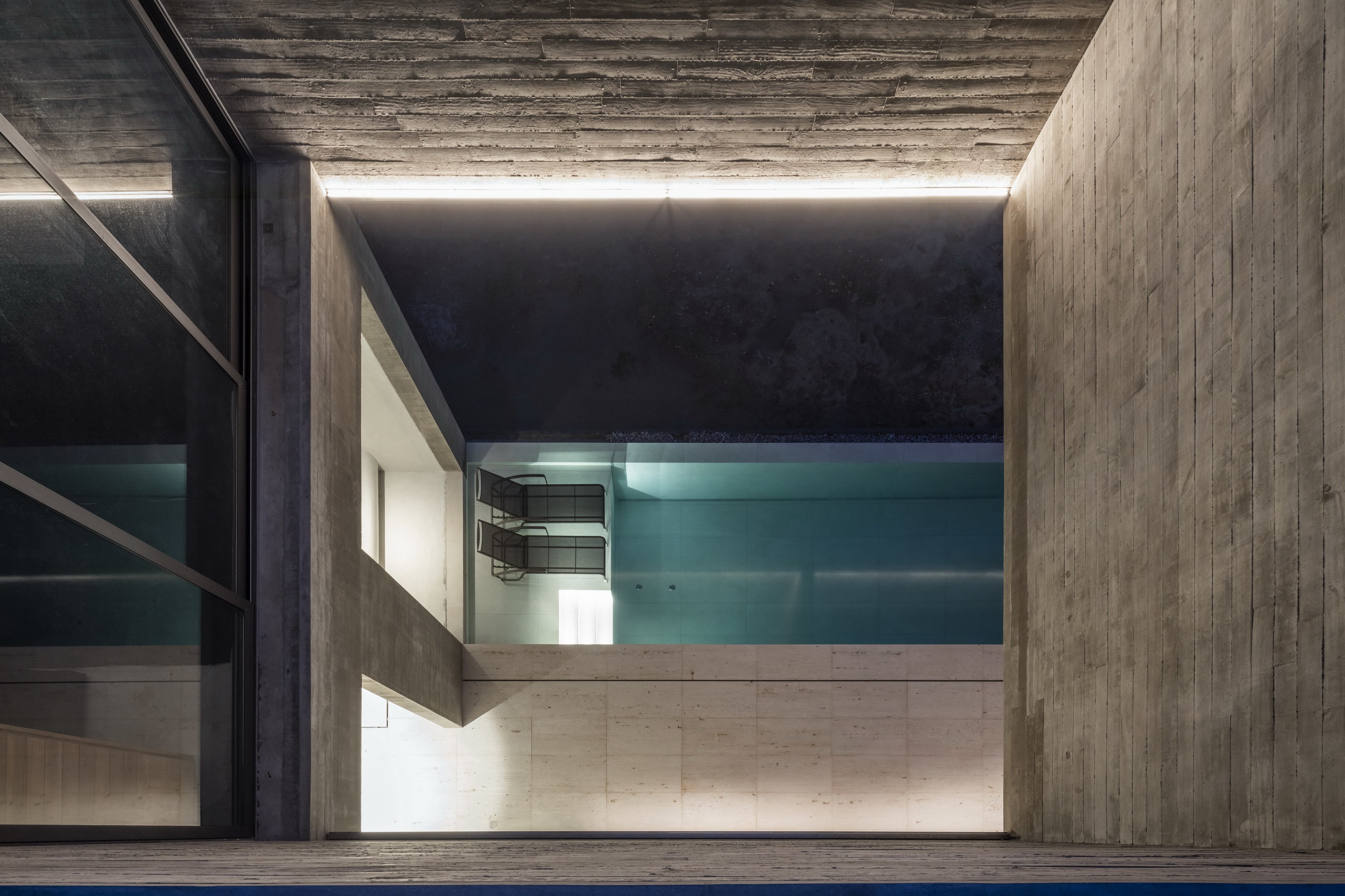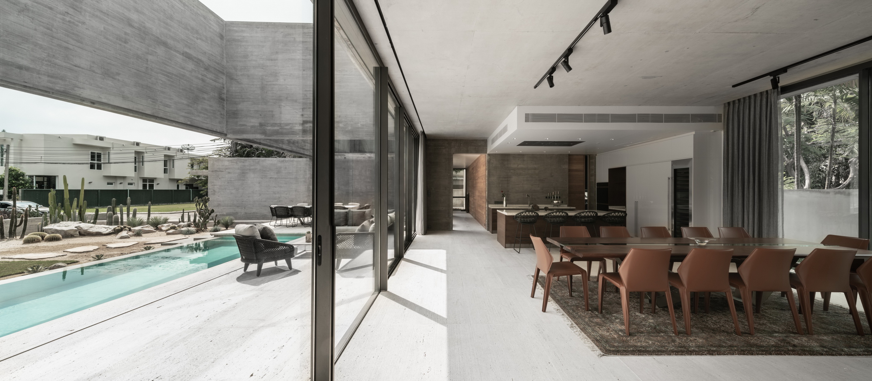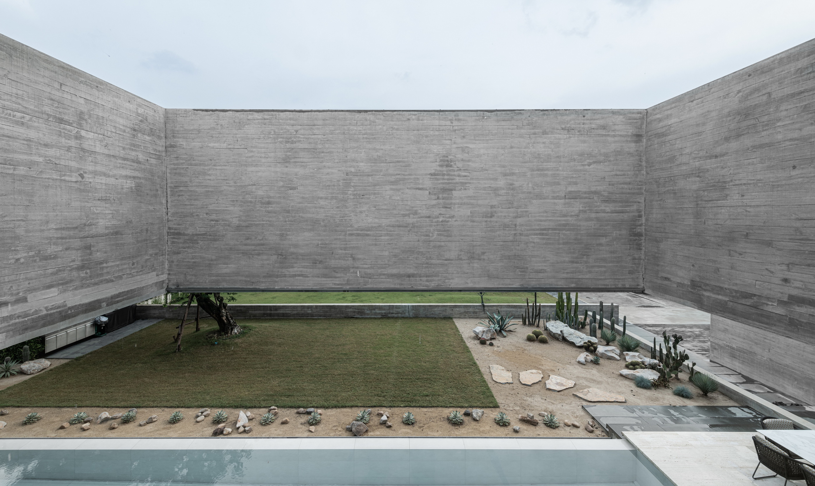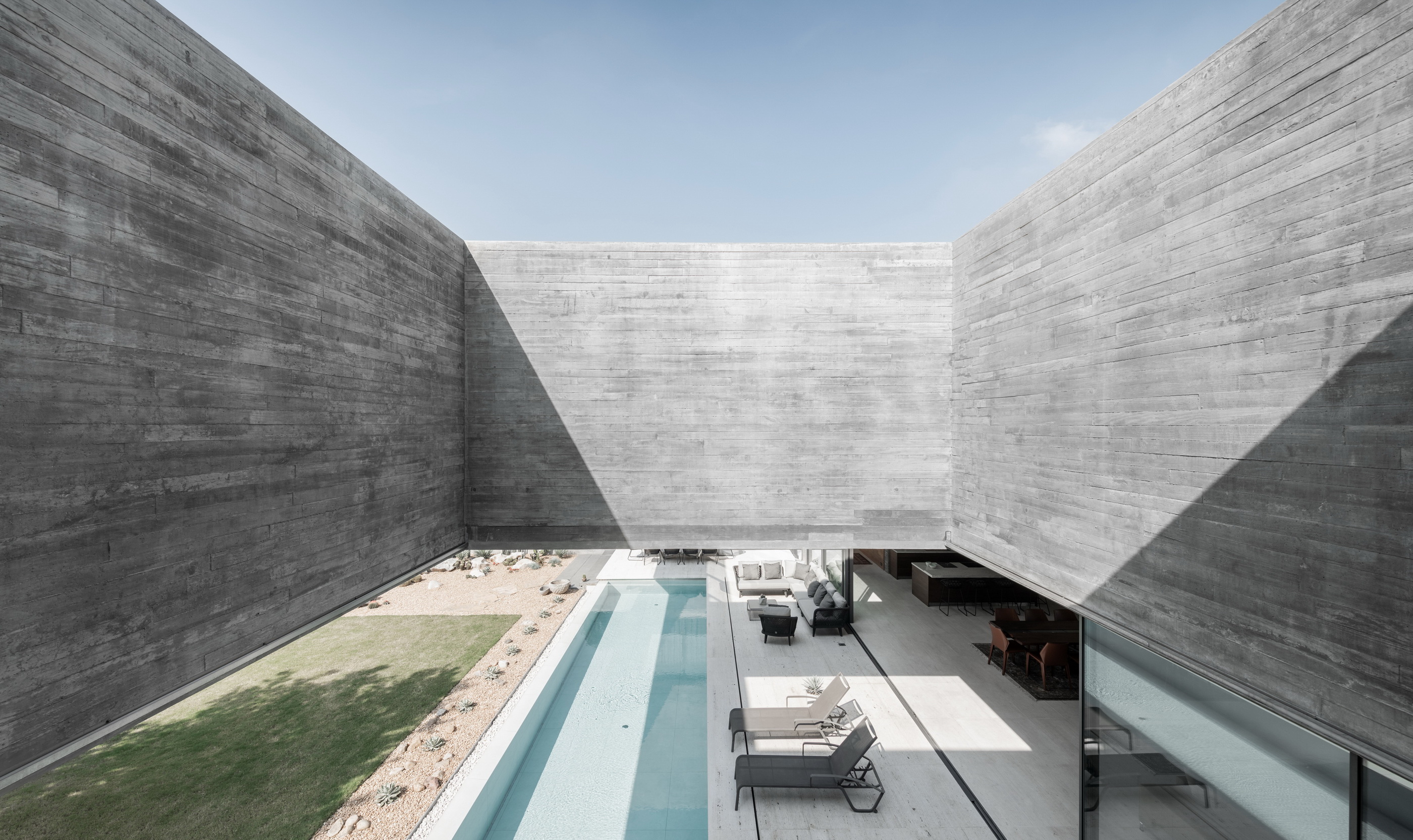 While providing visual barrier towards the surrounding neighborhood, the cast-concrete planes also act as a buffer, providing sound barrier from the public road directly adjacent to the site. Divided into two levels, the semi-public living quarter on the ground floor compose of various thresholds that blur the lines between garden-pool-living and interior and exterior spaces, while the upper level consists of private quarters for its residents. Expressing the internal program and function, the planes divide each living quarter to maintain privacy and give distinction to each bounded space. Contrarily, the 37 m. long-span cantilevered plane on the second-floor act not only as the main façade of the residence, but a consistent ‘backdrop’ that tie each of the quarters together.