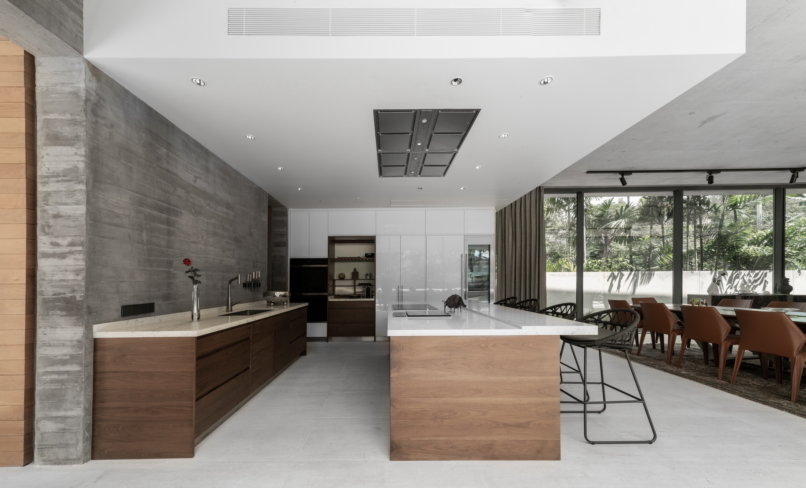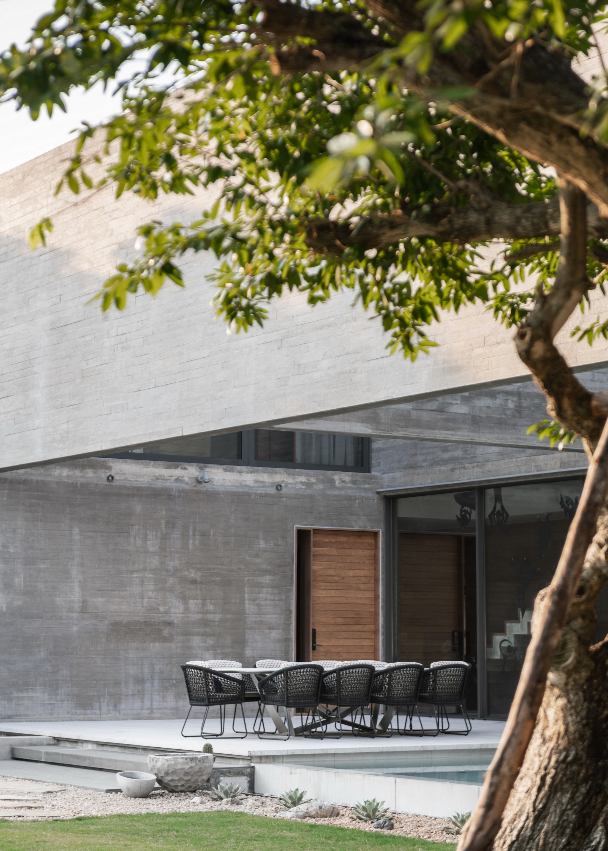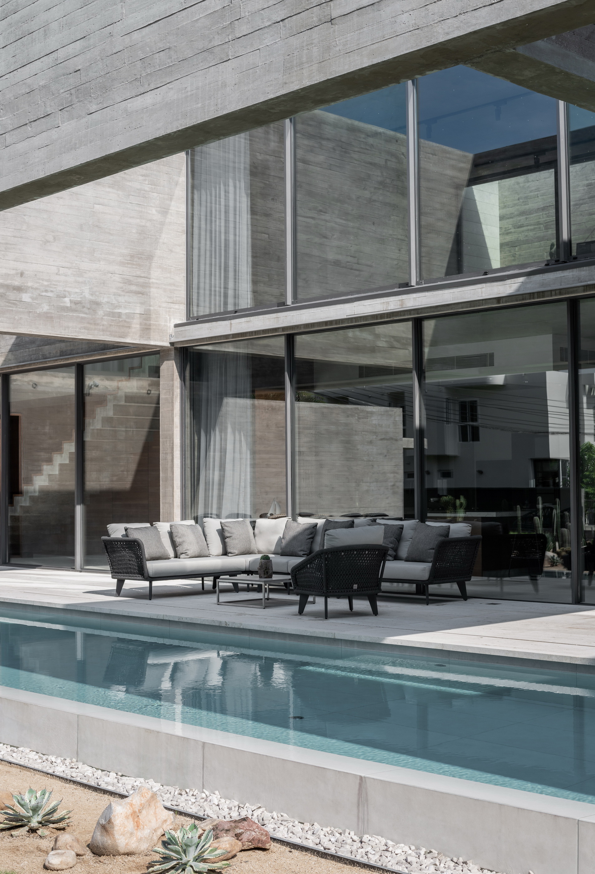 Casa de Alisa is a two-story residence located in Nonthaburi, Thailand. Concrete, in its material and structural capacity, is the founding concept of this project. The spaces within are conceived purely by structural concrete walls that frame and contain the interiority. These planes form an architecture that shelter the living spaces from the surrounding context, while framing the ‘chosen’ nature and containing privacy within. Within, the sense of austerity is enhanced as these planes bond the concrete, water and garden below, and sky above together.