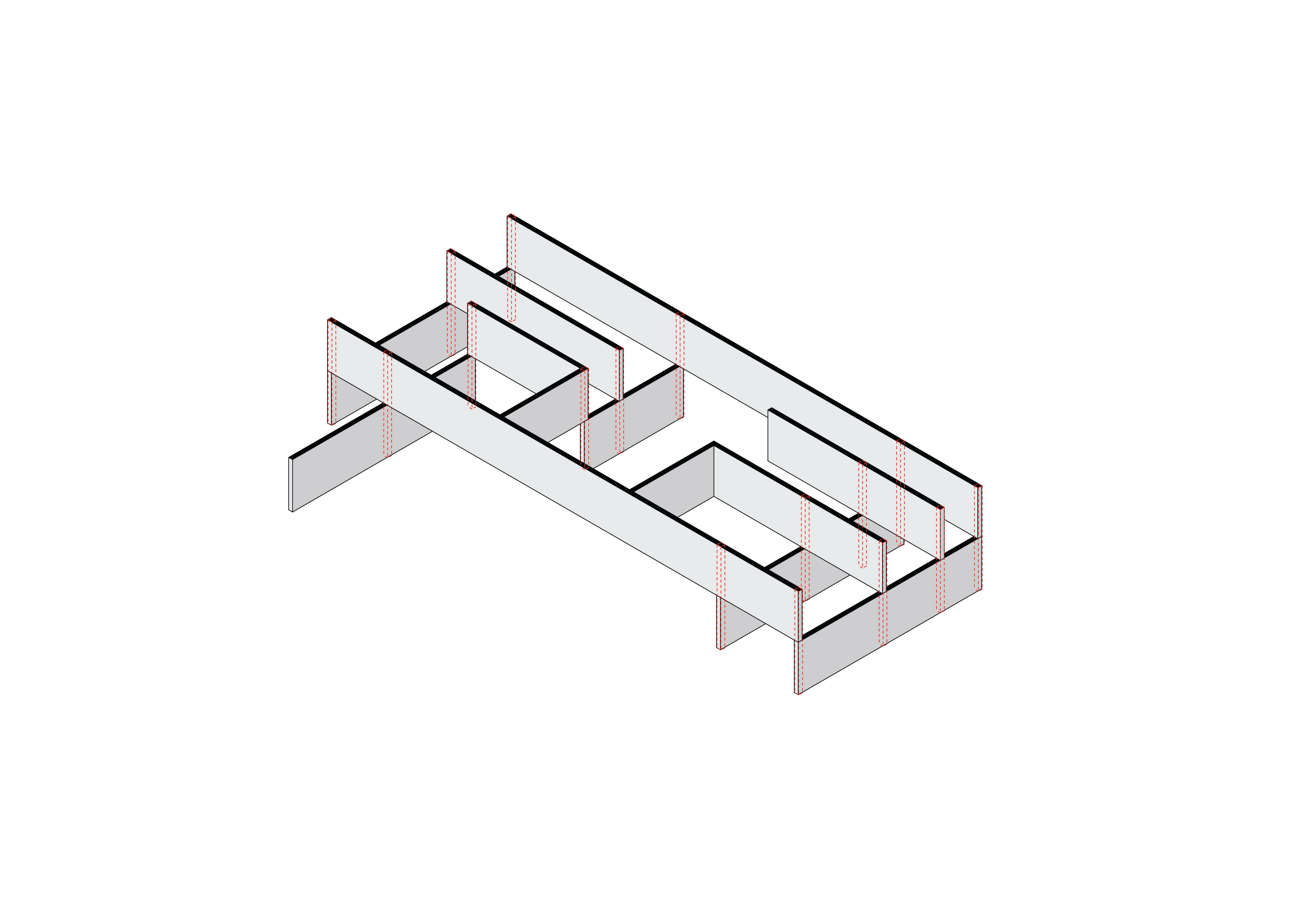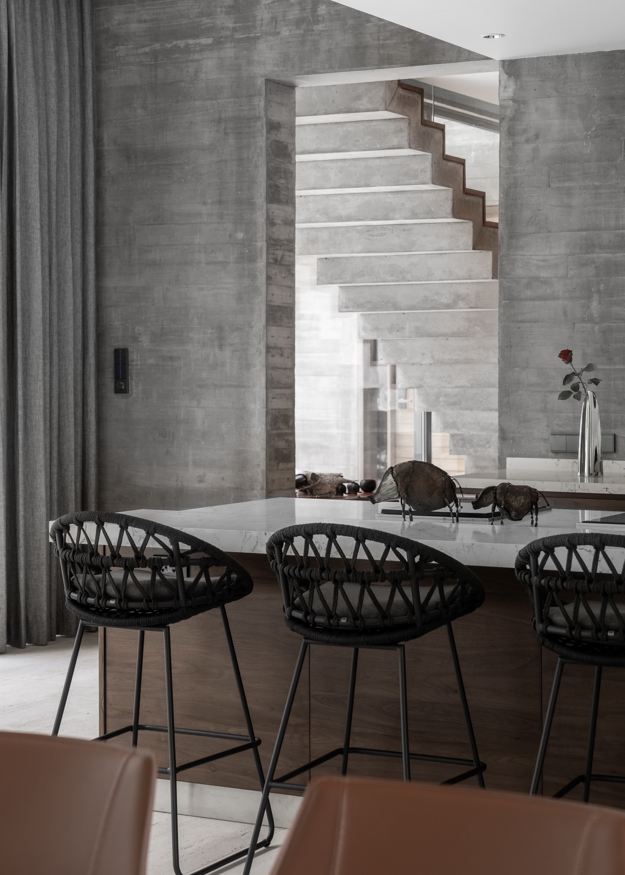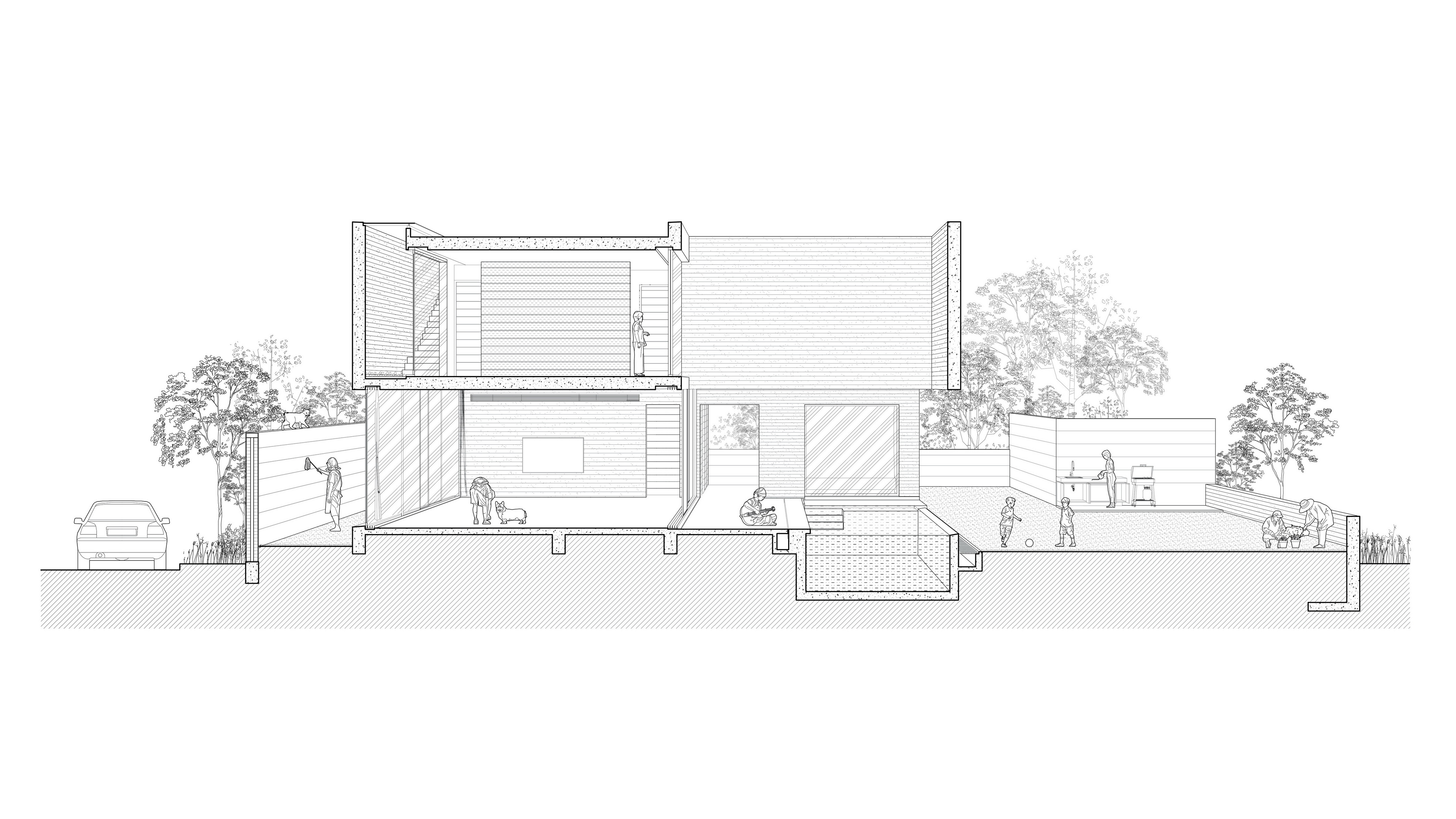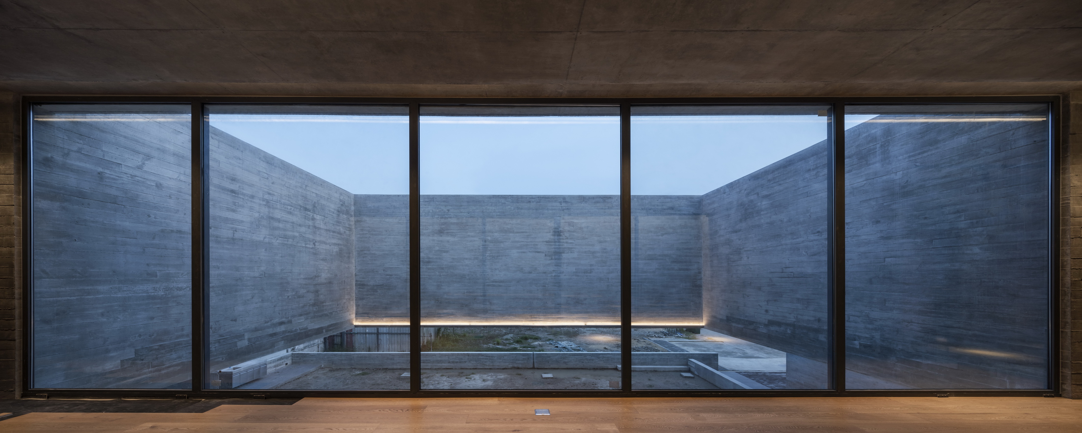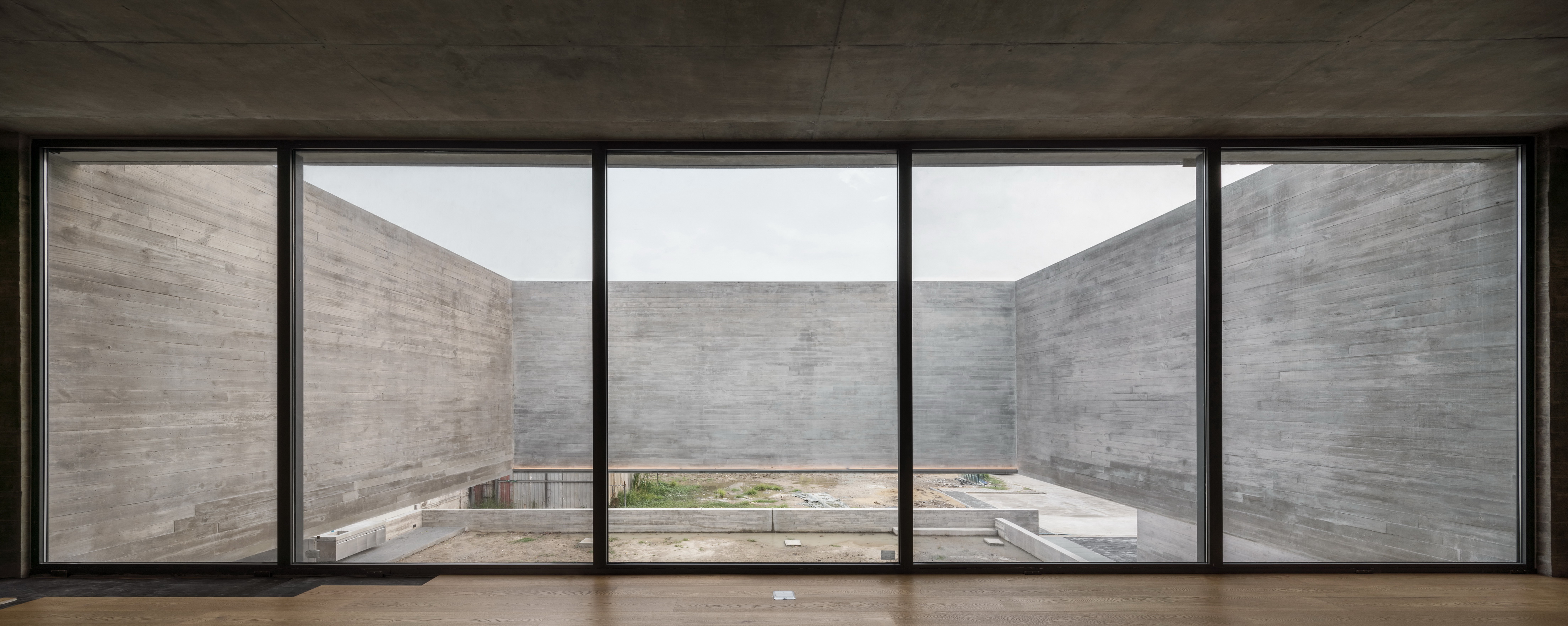 The materiality of exposed concrete is utilized in all its aspects: the wood framework leaves an imprint of its grain on the concrete as a permanent reminder of the construction process, while its texture is enhanced by lightwells and skylights. Casted on site, various experiments on formwork and texture were carried out to establish the fundamental material and character of the residence. The concrete planes on the ground level sit perpendicular to the site, while the walls on the second floor intersect at the opposite axis. The point of intersection between these two opposite planes provide the main structural system throughout the project. This simple structural composition allows for the architecture to be reduced to its absolute minimum, whilst providing efficient construction and assembly time. The result is an architecture that is somewhat monolithic in its exterior, as its concrete slabs appear to be levitating from the ground, while containing a sense of place and home within.