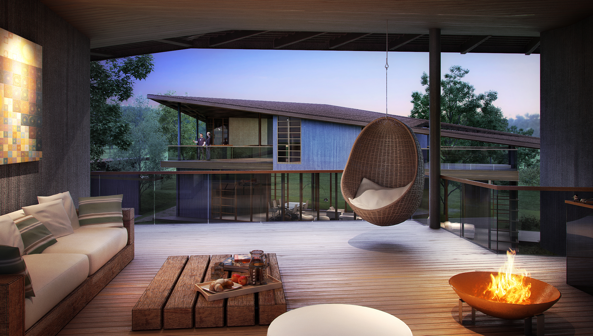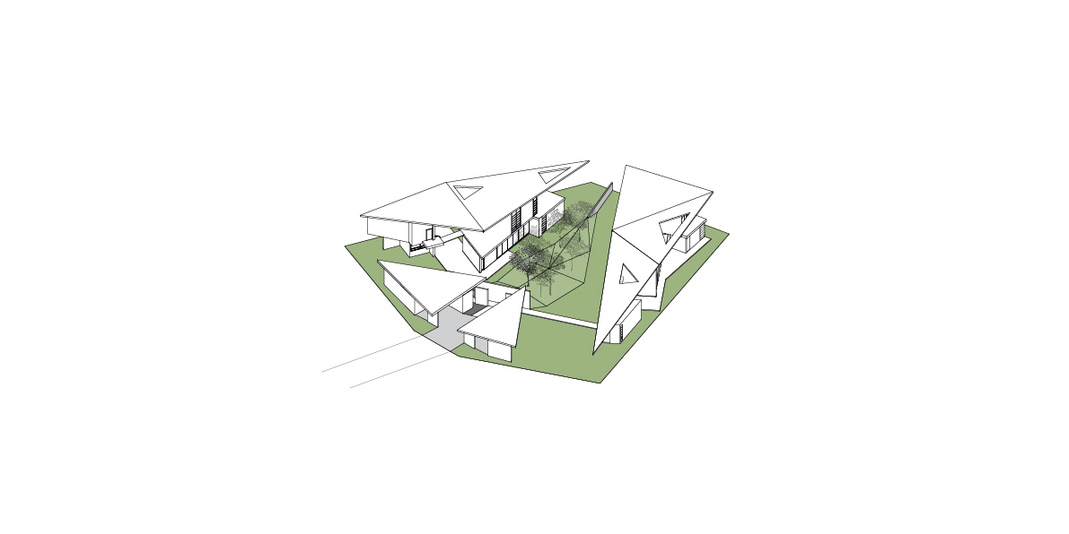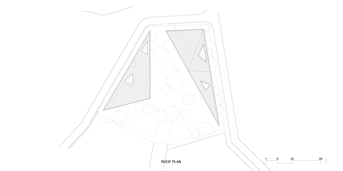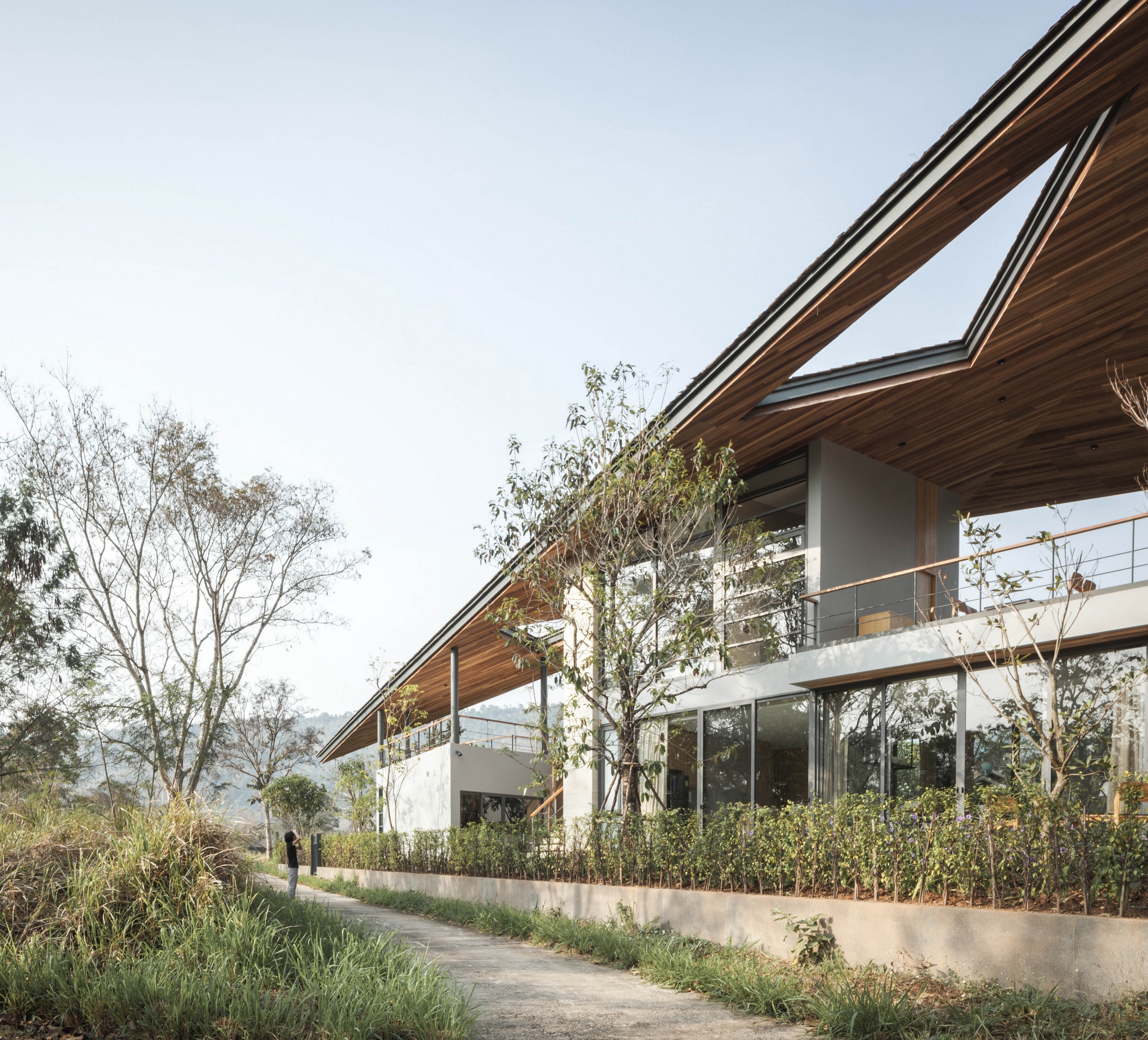 The triangular shaped roof becomes the character of the project; hovering above the masses, it gives coherence to the scattered forms and visually connect the programs. While its form resembles surrounding mountains, the roof feature triangular voids that create a lighter, more open feeling to the plane that appears to be gliding, hence the name Gliding Villa. Outdoor terraces below this expansive canopy become lively places for family gatherings; a space to talk, drink and eat together. This type of space is evident in traditional Thai homes, where terraced areas have various informal functions or are utilized as gathering space. We re-interpret such concepts with design conventions to integrate the architecture culturally, as well as formally, into the environment.