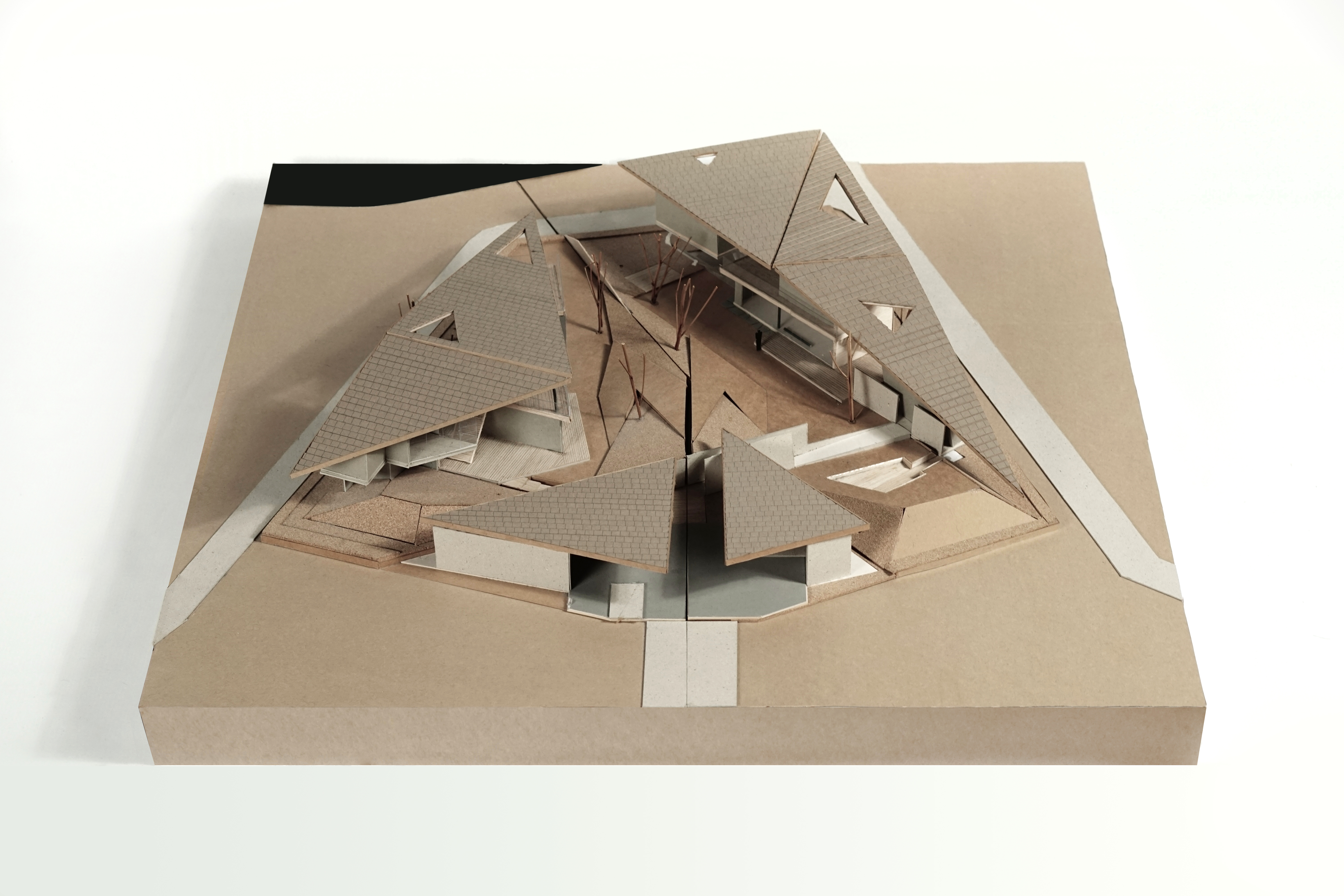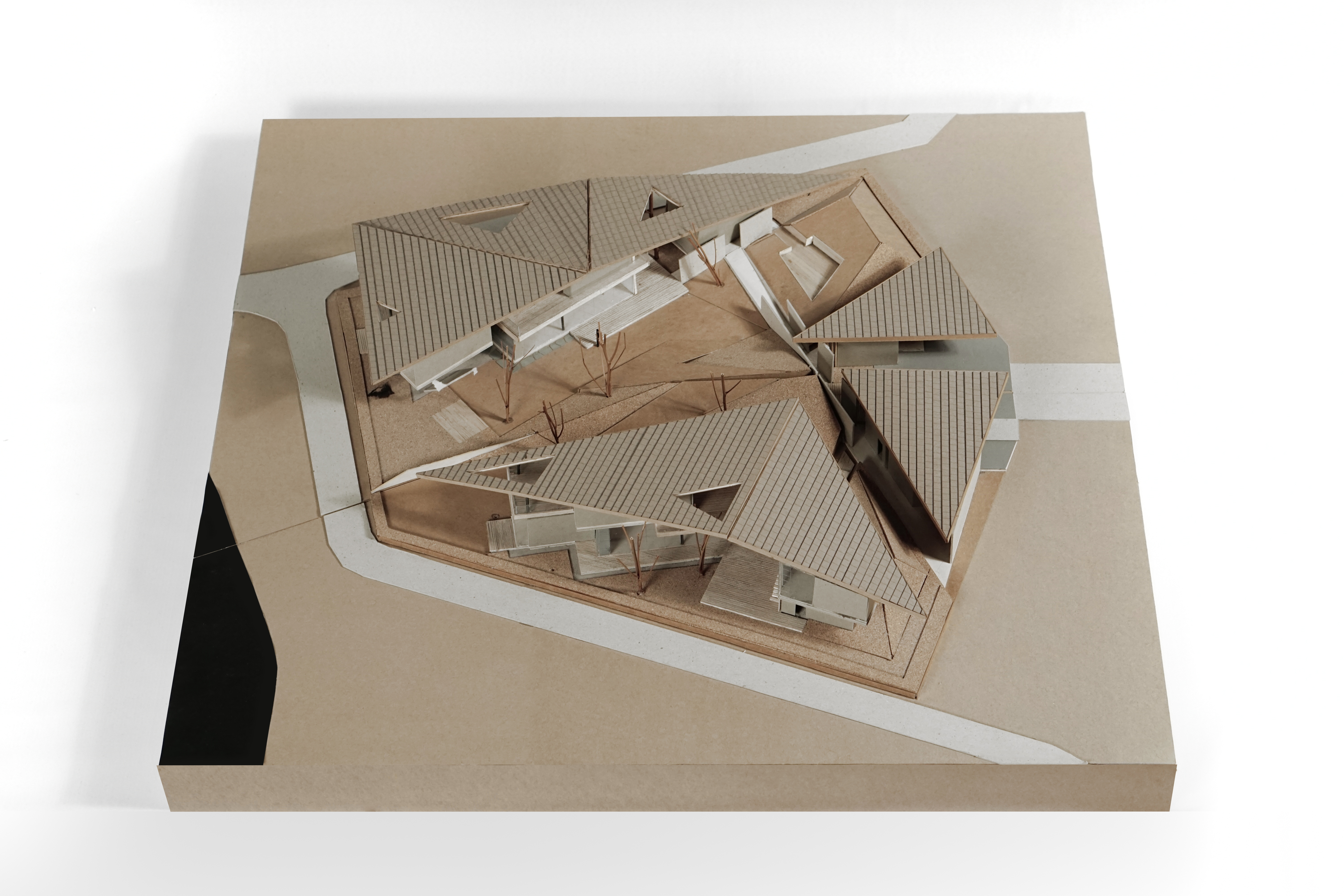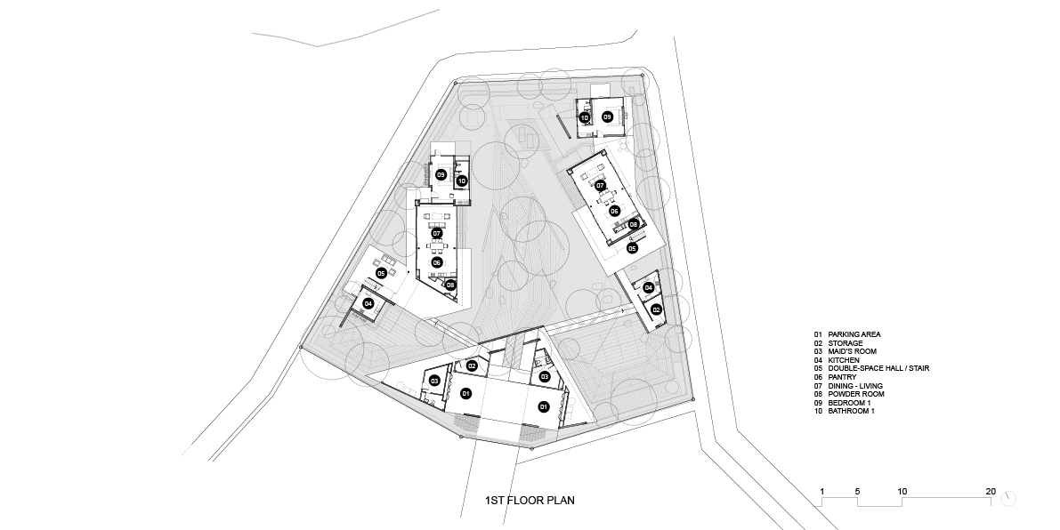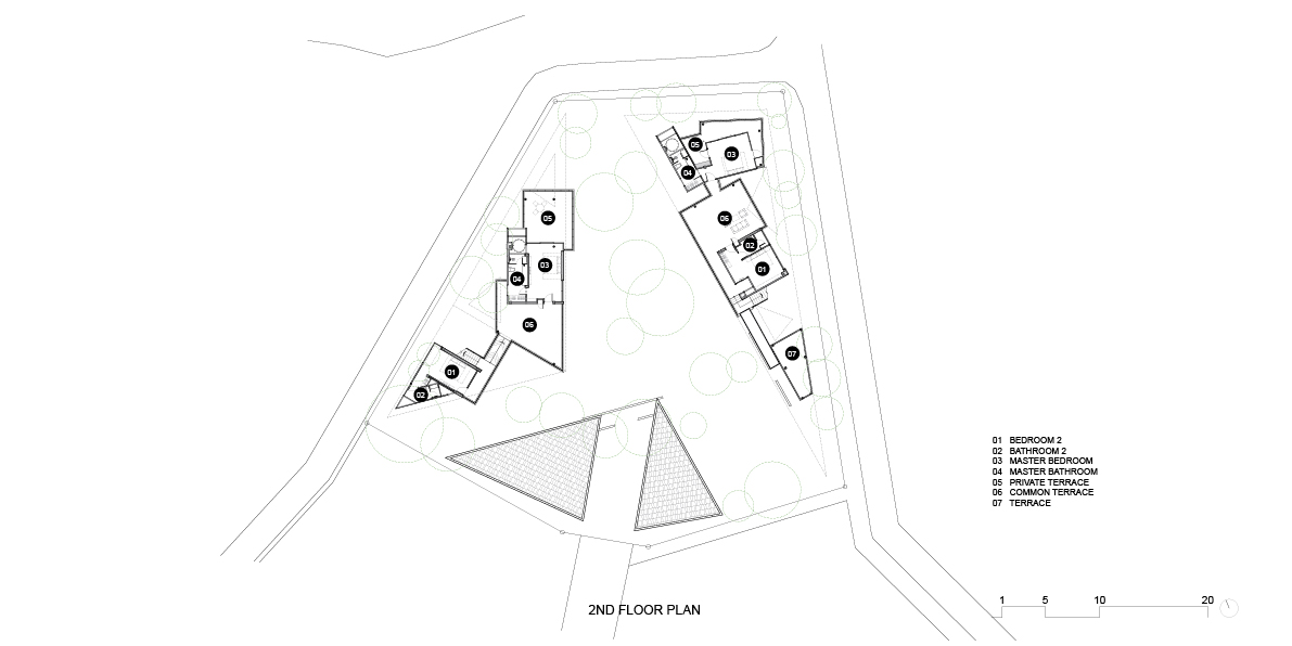 The triangular shaped roof becomes the character of the project; hovering above the masses, it gives coherence to the scattered forms and visually connect the programs. While its form resembles surrounding mountains, the roof feature triangular voids that create a lighter, more open feeling to the plane that appears to be gliding, hence the name Gliding Villa. Outdoor terraces below this expansive canopy become lively places for family gatherings; a space to talk, drink and eat together. This type of space is evident in traditional Thai homes, where terraced areas have various informal functions or are utilized as gathering space. We re-interpret such concepts with design conventions to integrate the architecture culturally, as well as formally, into the environment.