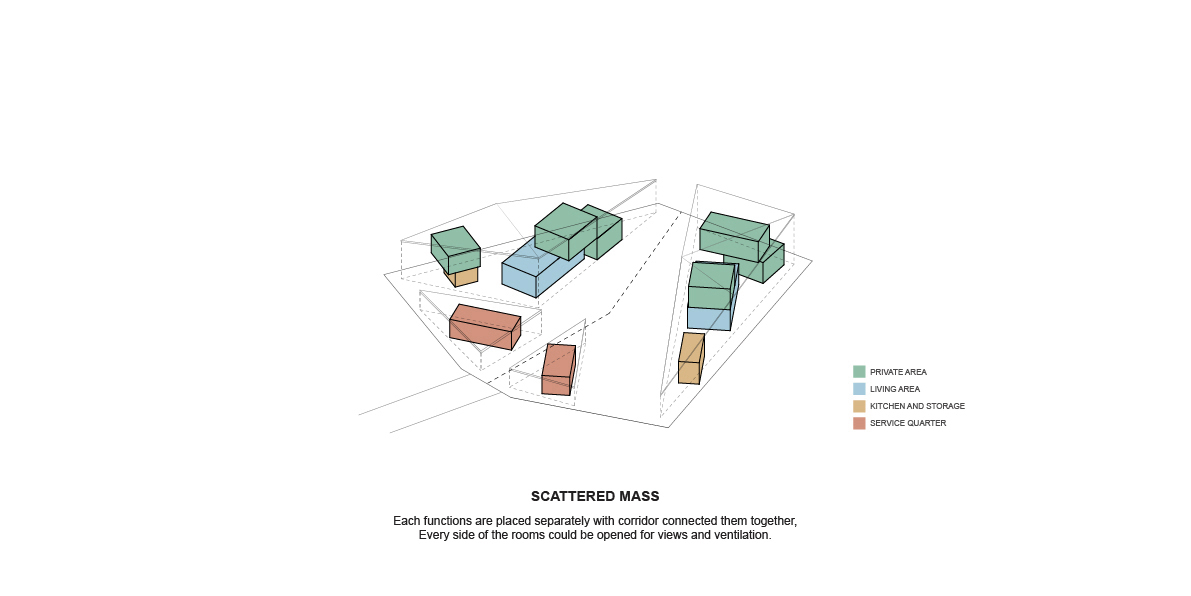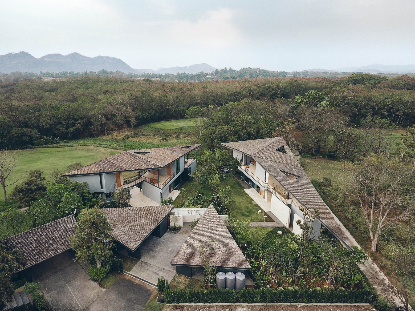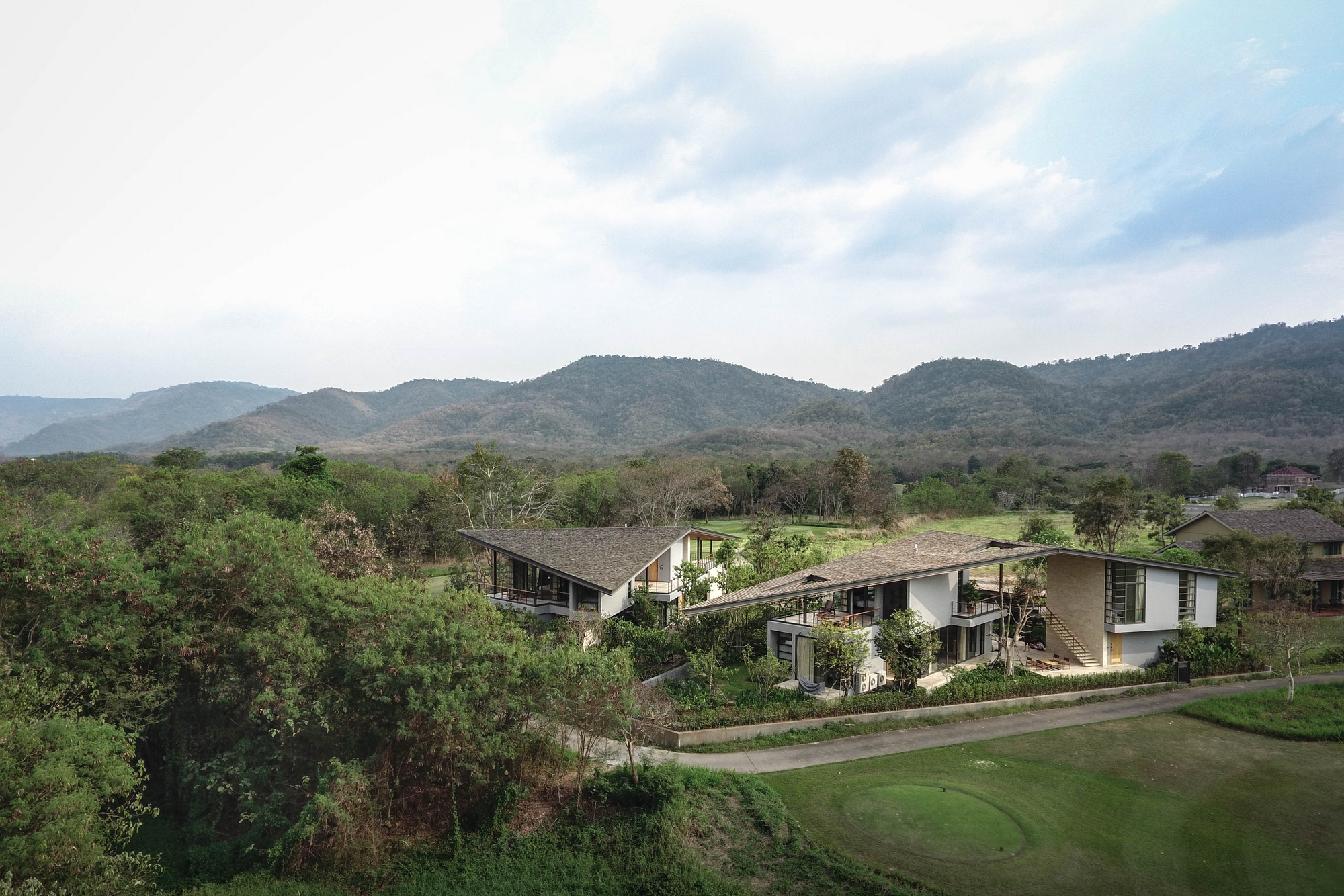 In an attempt to create a unique typology of a vacation home, Gliding Villa integrate principles of Thai beliefs, i.e. Feng Shui, with site context and modern design fundaments. Located at the end of a dead-end road, the site offers scenic views of the surrounding mountains. While owners were hesitant to purchase the plot due to its dead-end location, this superstitiously negative condition is resolved by dividing the site and program into two projects, leaving the area facing the dead-end as an open courtyard; a shared landscape between the living functions distributed along the site boundary. Because Feng Shui determine auspicious settings by referencing local features such as bodies of water and terrain, integrating such beliefs with natural ventilation allowed us to create a sustainable project that provide comfortable living conditions.