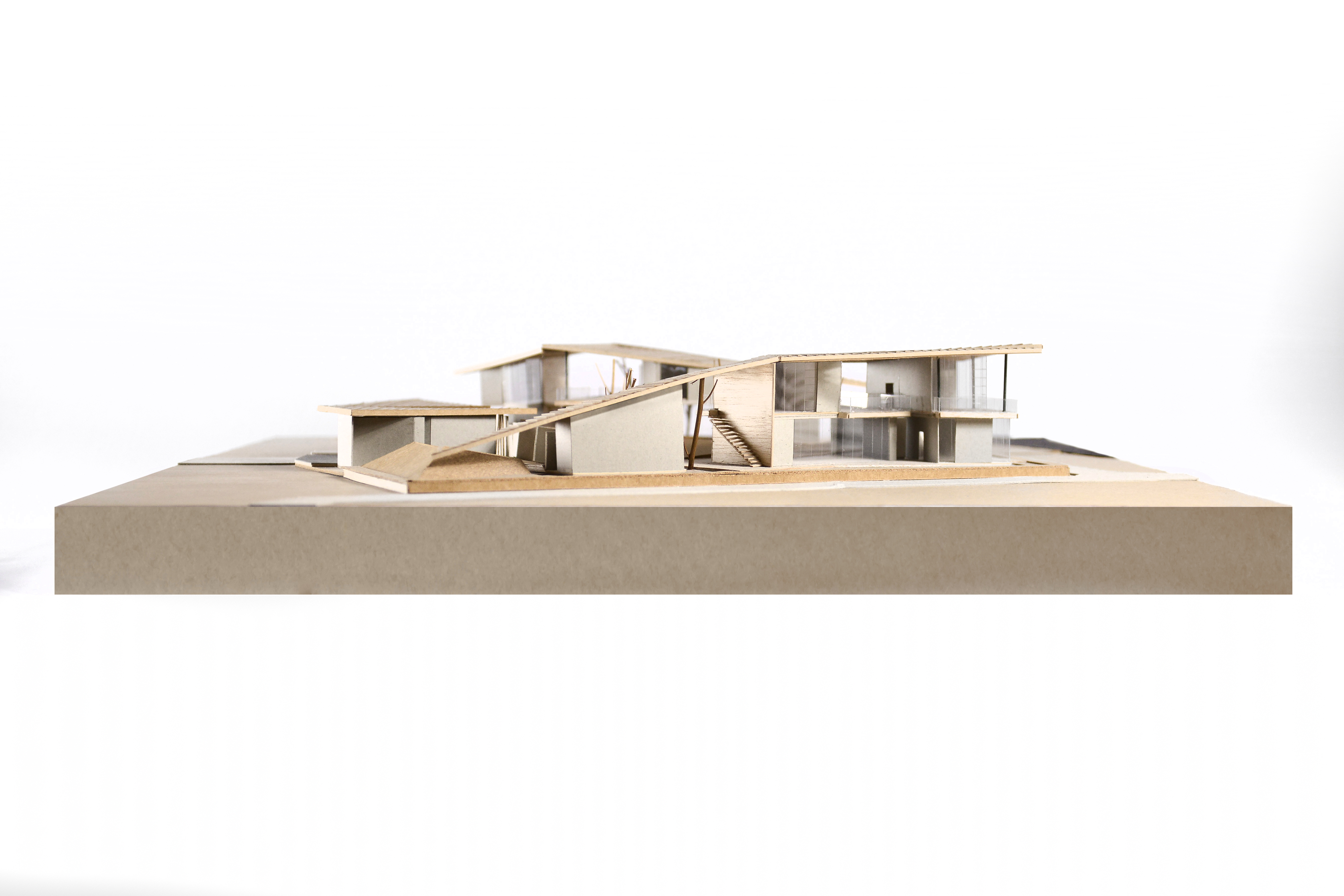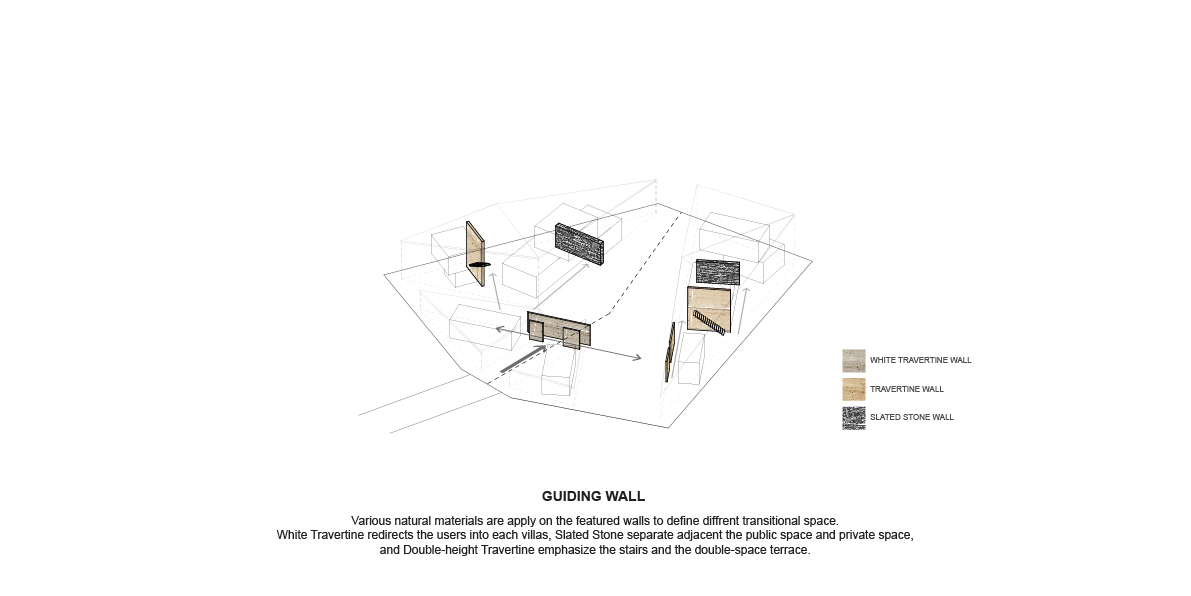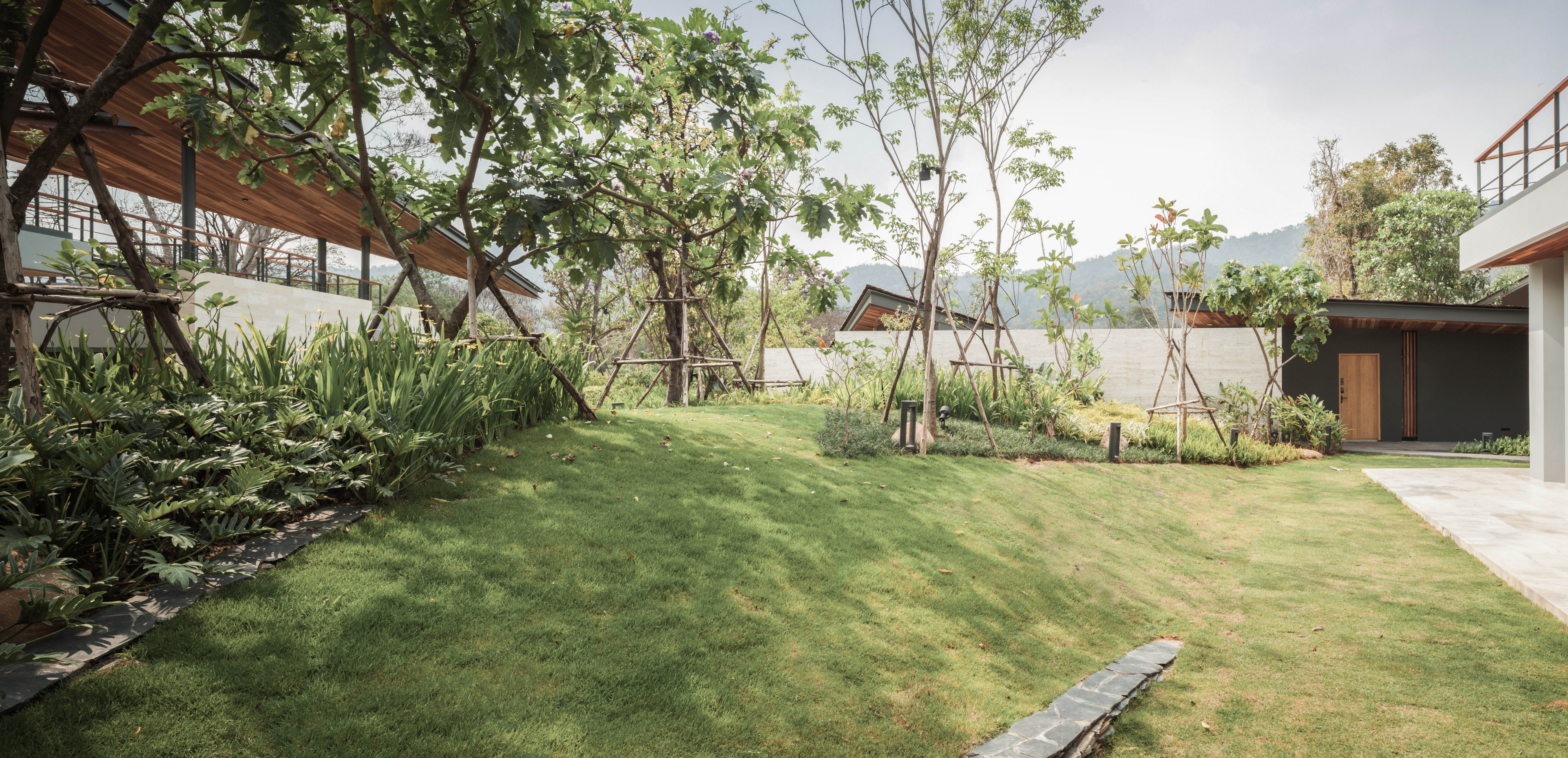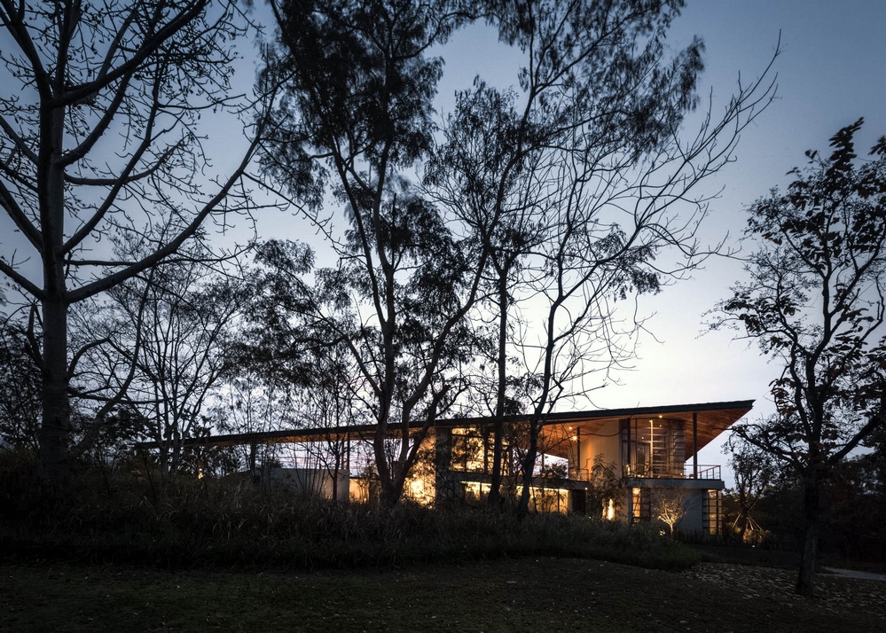 In an attempt to create a unique typology of a vacation home, Gliding Villa integrate principles of Thai beliefs, i.e. Feng Shui, with site context and modern design fundaments. Located at the end of a dead-end road, the site offers scenic views of the surrounding mountains. While owners were hesitant to purchase the plot due to its dead-end location, this superstitiously negative condition is resolved by dividing the site and program into two projects, leaving the area facing the dead-end as an open courtyard; a shared landscape between the living functions distributed along the site boundary. Because Feng Shui determine auspicious settings by referencing local features such as bodies of water and terrain, integrating such beliefs with natural ventilation allowed us to create a sustainable project that provide comfortable living conditions.