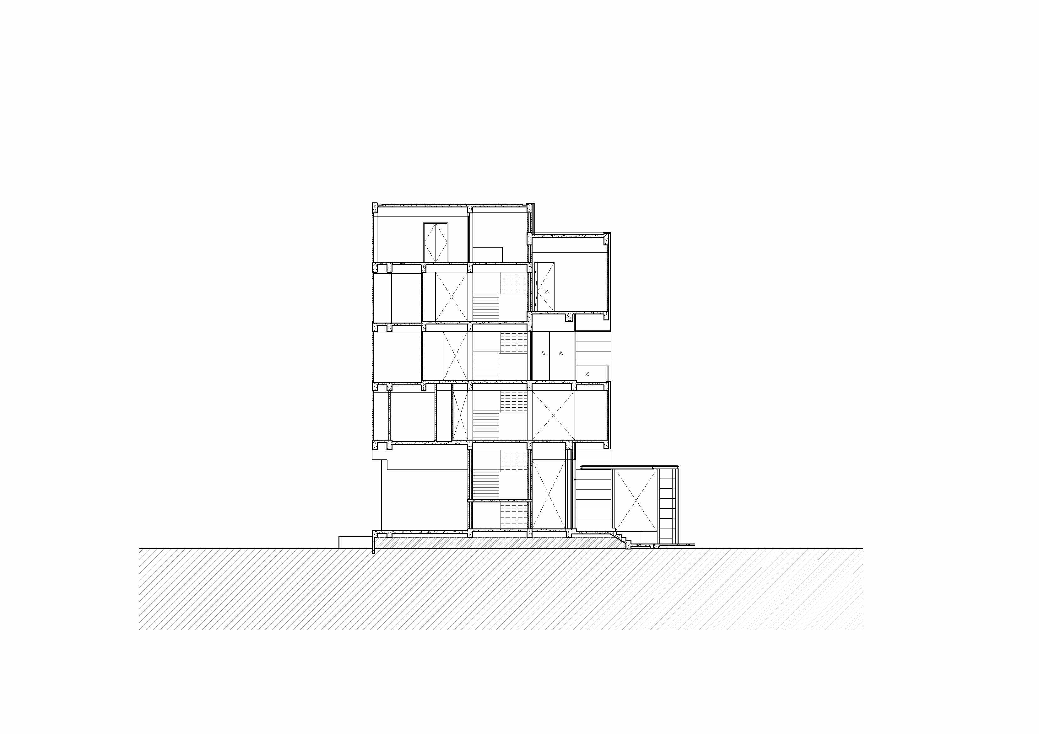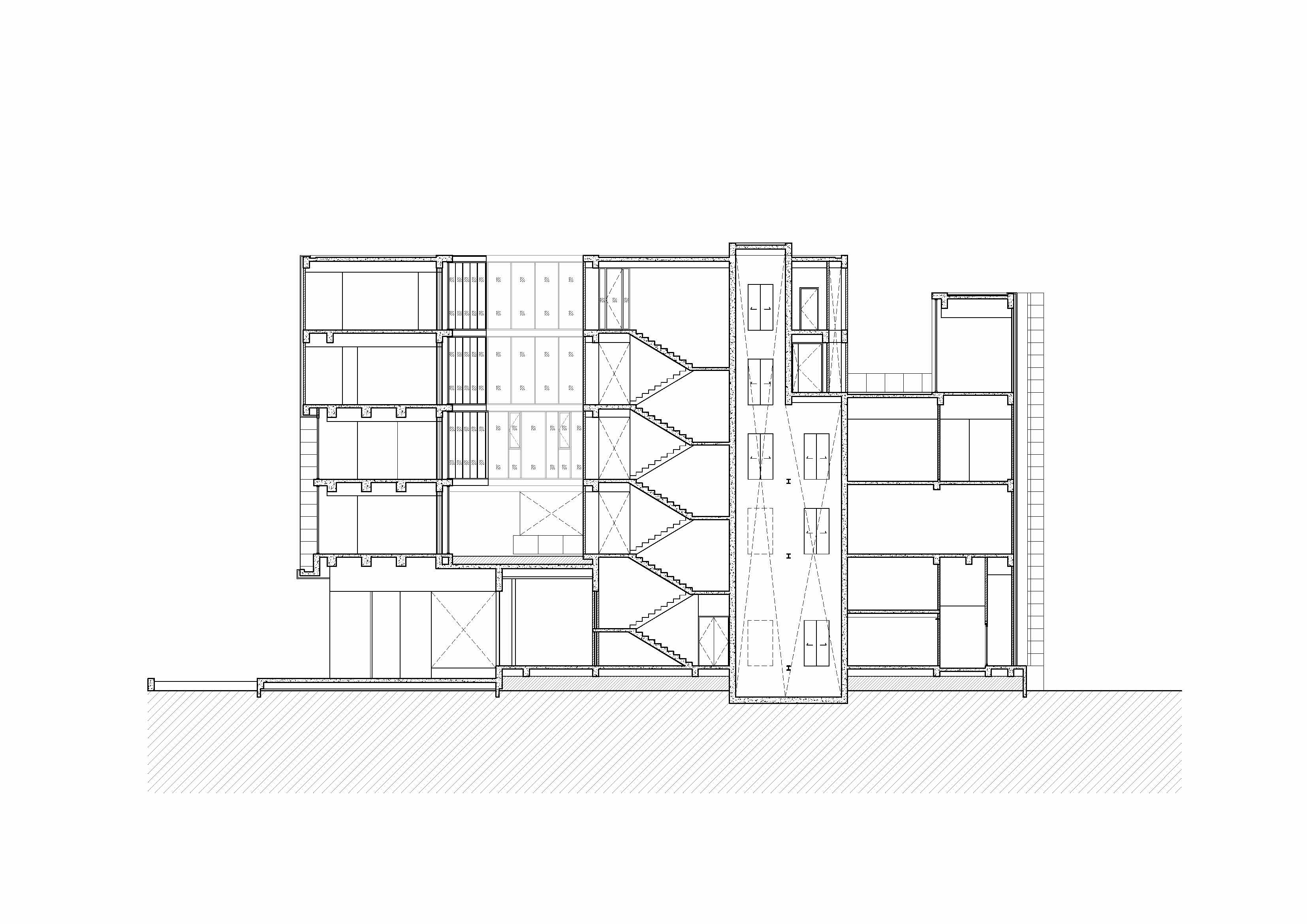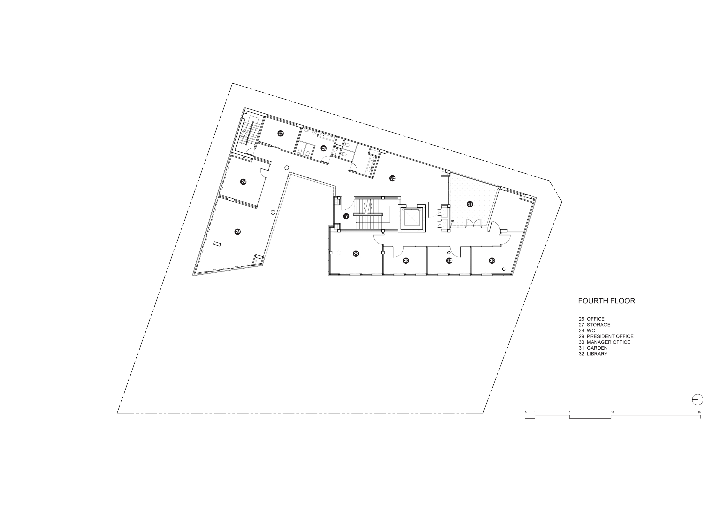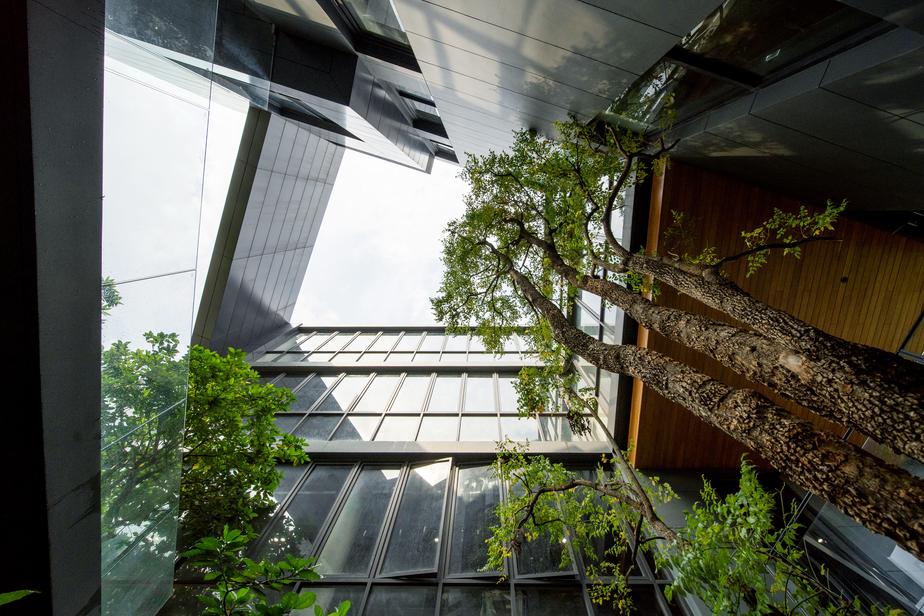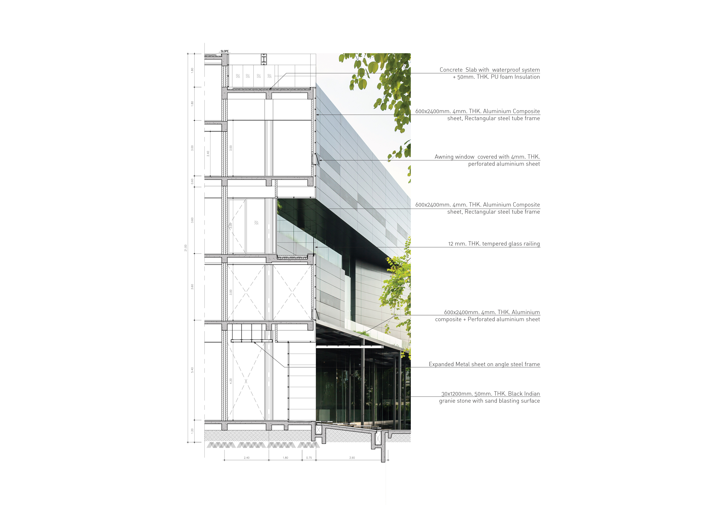 With weather conditions of the West-facing site, the front façade was designed to be impermeable to block harsh sun rays, utilizing aluminum panels to clad the entirety of the mass not only to give the building a prominent modern impression, but also in its detail of perforations and openings that work to create self-shading and enable natural ventilation. The angular turns interlock the mass to create an open void within the middle of this largely dense mass. This central void enables some greenery and nature to exist within the various programs as they face inwards towards this internal court that allows light and wind to filter through, providing a space of nature in the heart of the building. Other green pockets are added within the building, namely small courtyards on the second and fourth floors that connect to the Gallery, Innovative Space and Workshop area, in aim of giving a better quality of work-life for the employees and main users of the building.