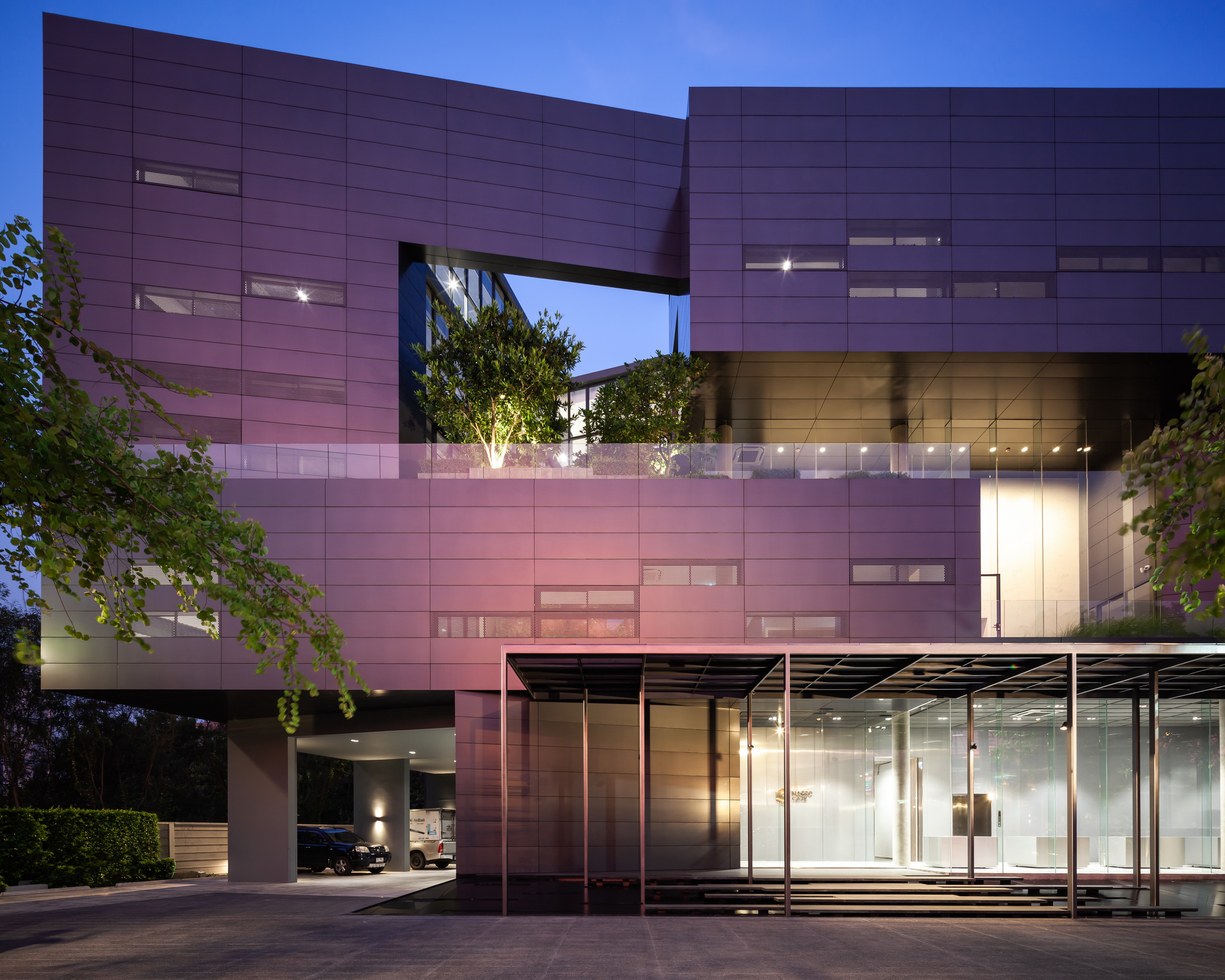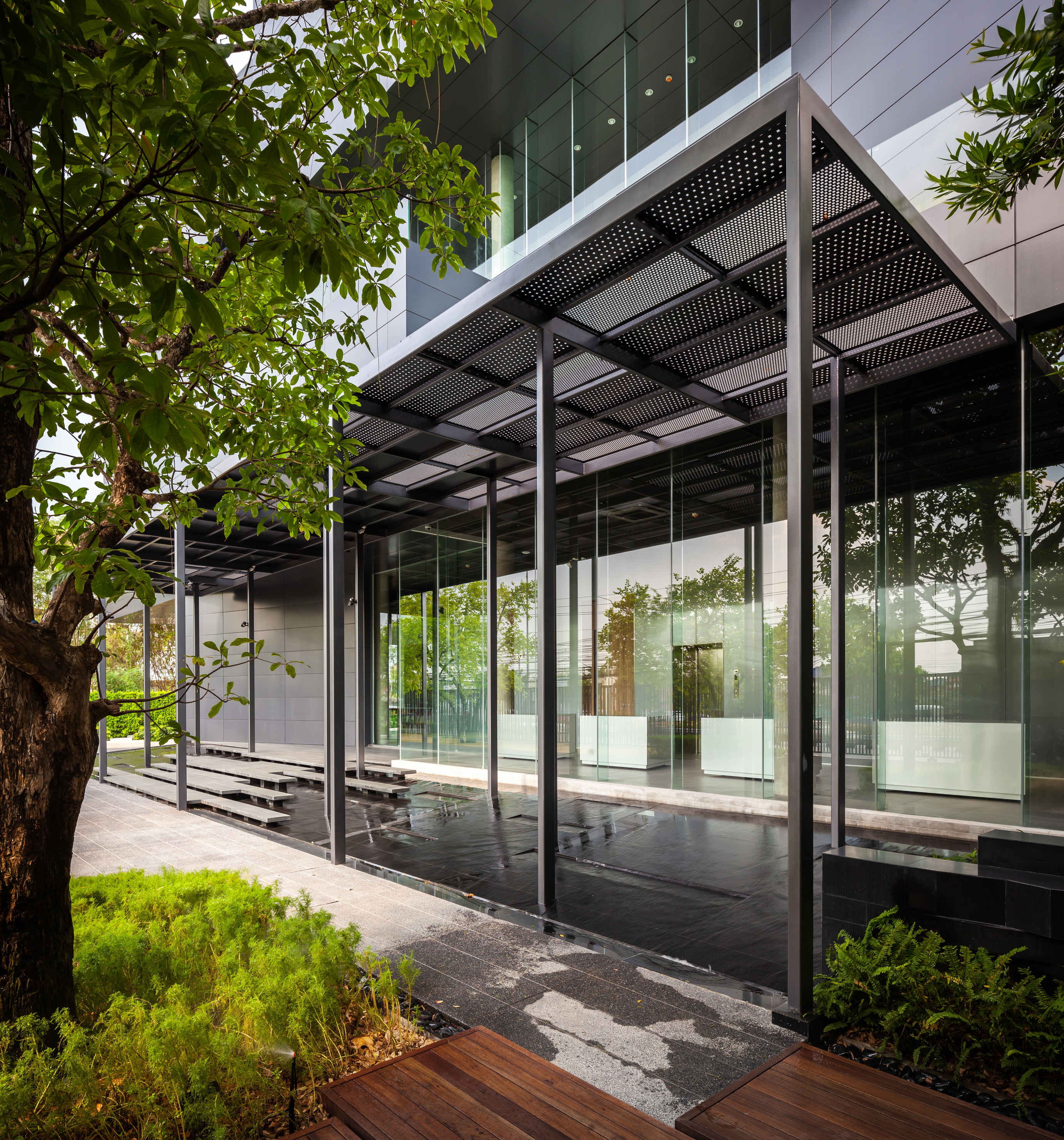The design of the approach and entrance of the building includes a reflecting pond that uses the same pattern as the façade panels but shift and tilt slightly to create subtle effects when the water and light filter through. The narrow bridge across the reflecting pond, along with columns that are arranged to mimic tree trunks within the forest and the perforated pattern canopy that filters subtle light through gives the entrance an ambience that is resembling nature and yet, in distinctly modern materials and environment. In the evening, the patterned canopy cast shadows onto the showroom, creating a digital translation of the natural tree canopy; a feature experience for the visitors of MacroCare.