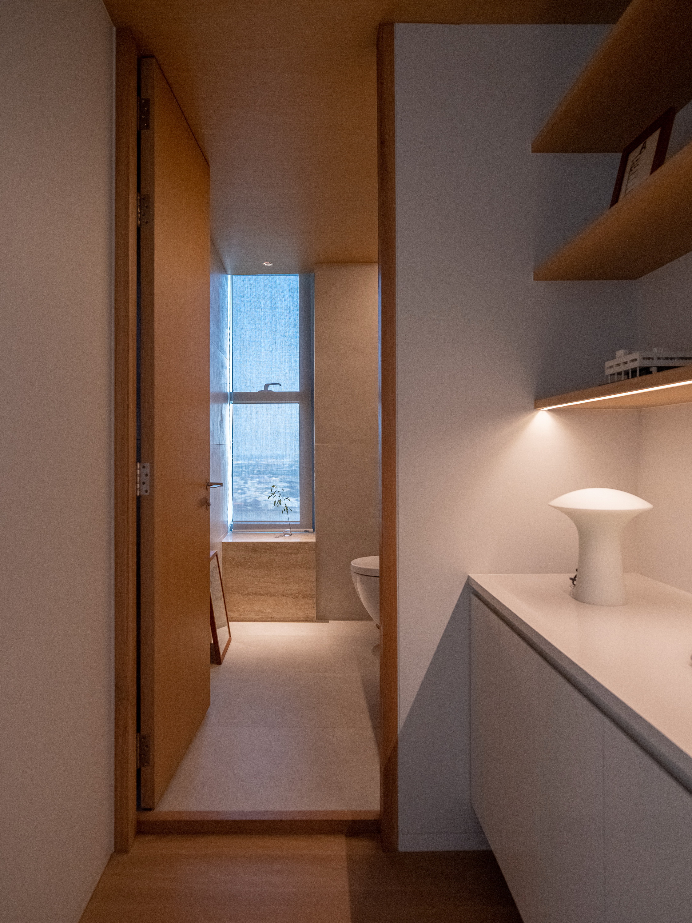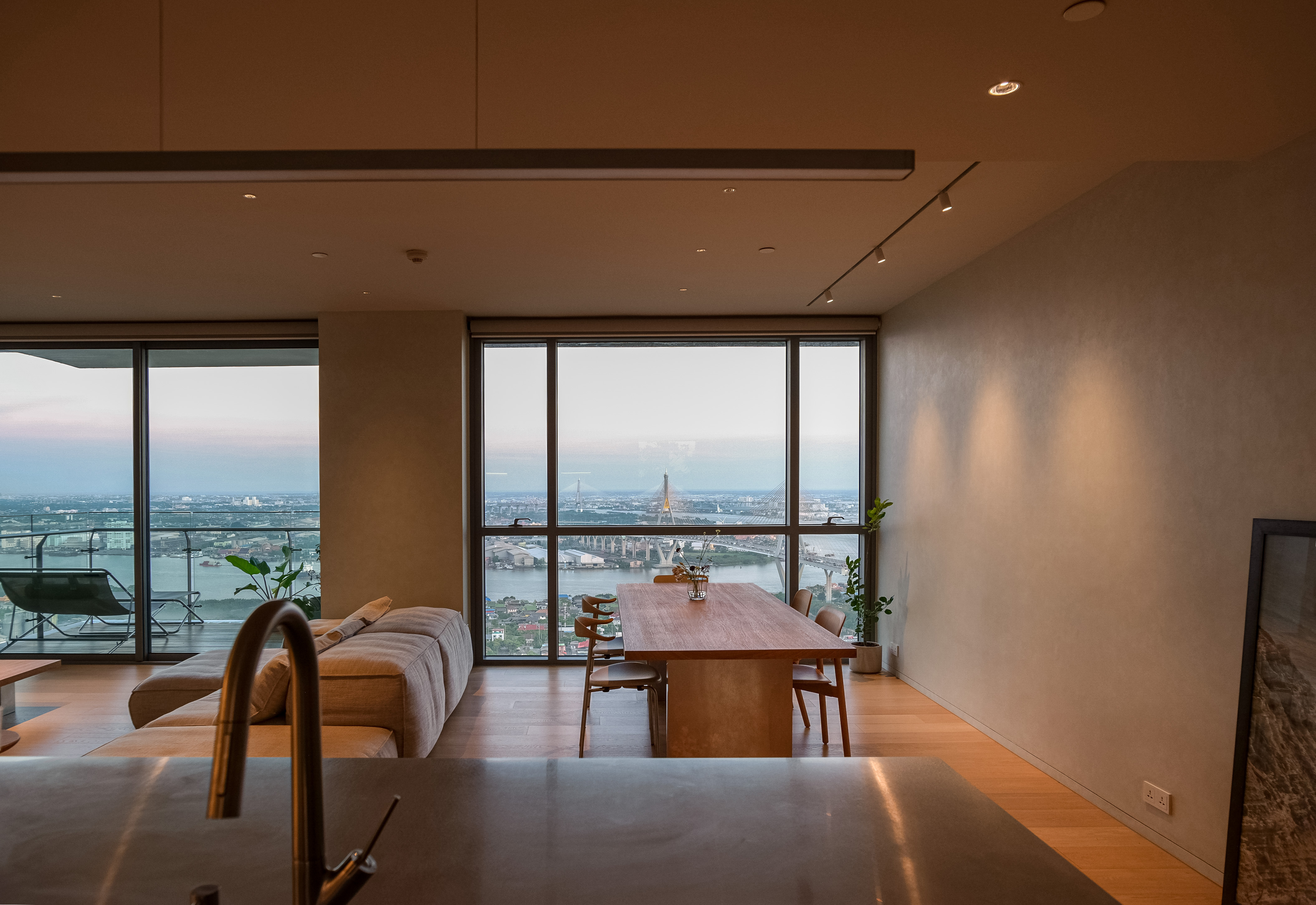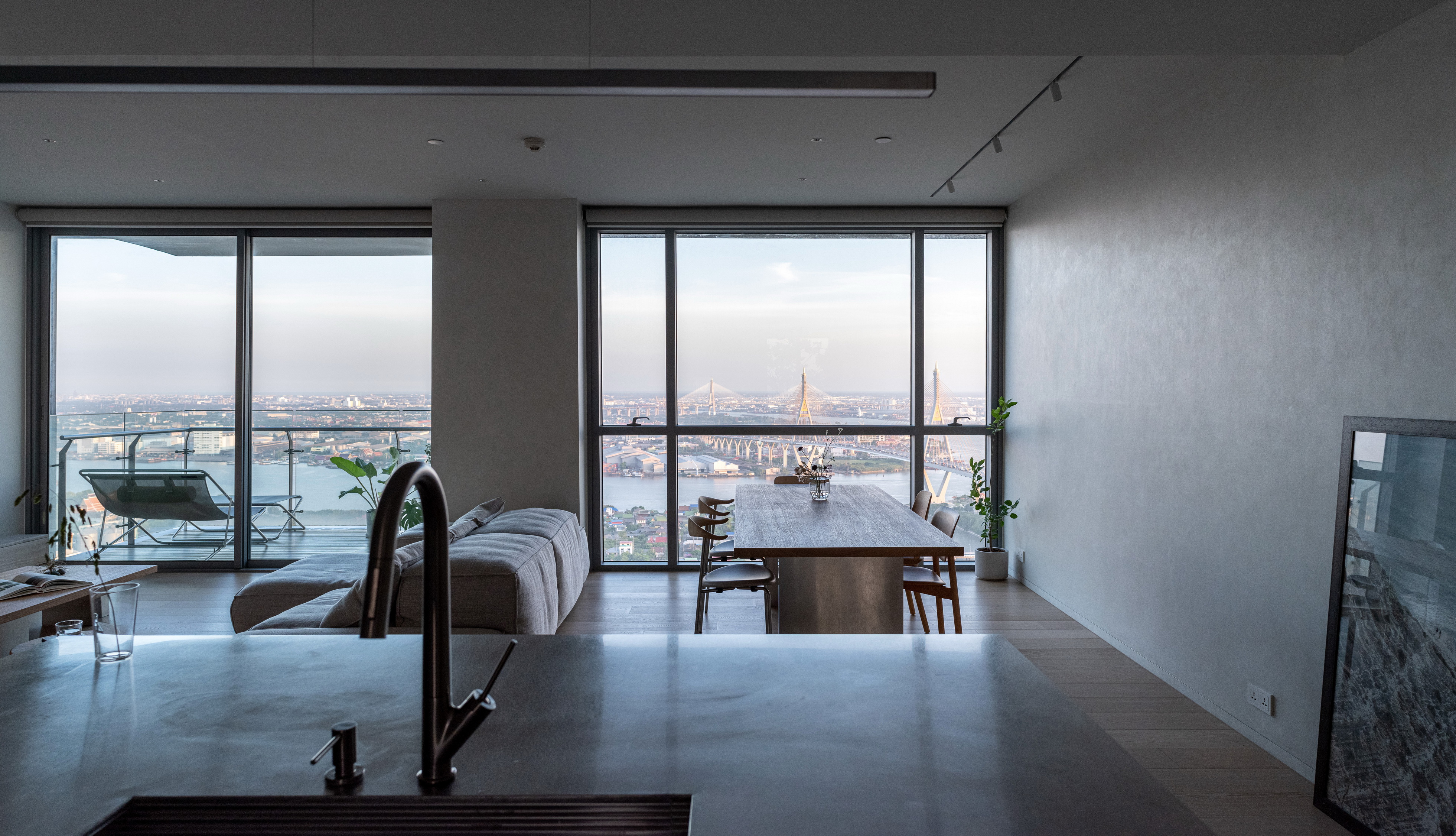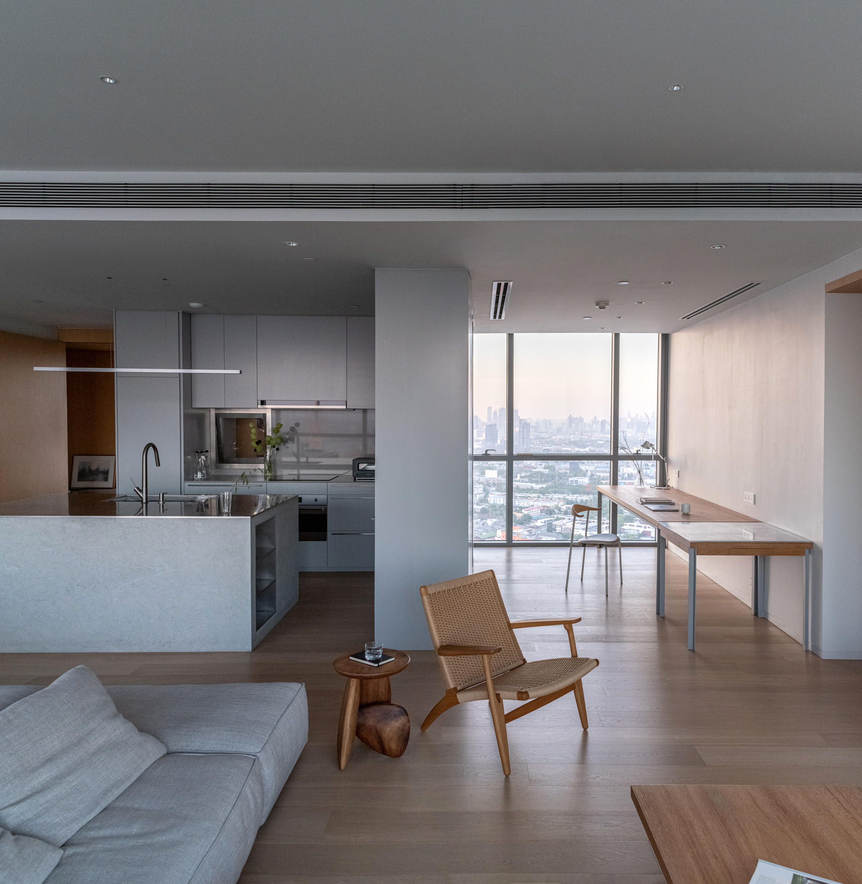 This condominium unit renovation project strategically spotlights the surrounding landscape as the prominent element of the living experience. The transformation process begins with reconfiguring the internal unit’s boundaries by removing internal walls and facilitating cross-ventilation in each room. This reconfiguration consolidates the living, dining, kitchen, and workspace areas into a single, spacious room, fostering a versatile living environment where residents can appreciate views of both the river and city simultaneously.