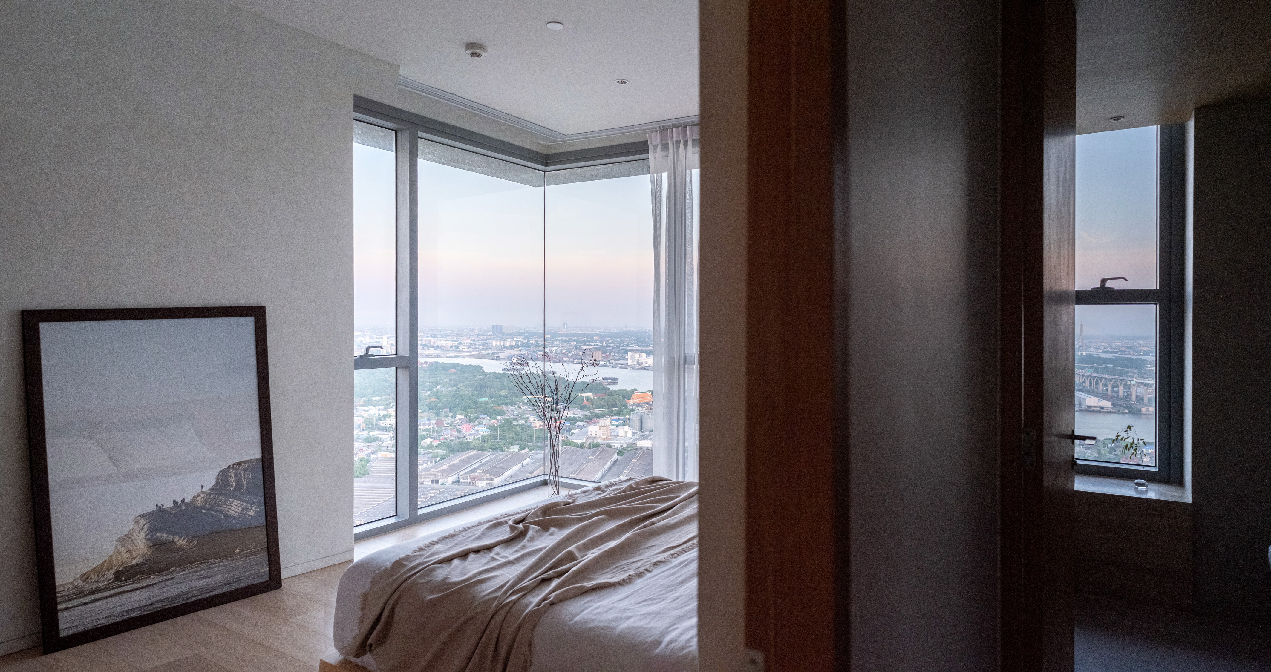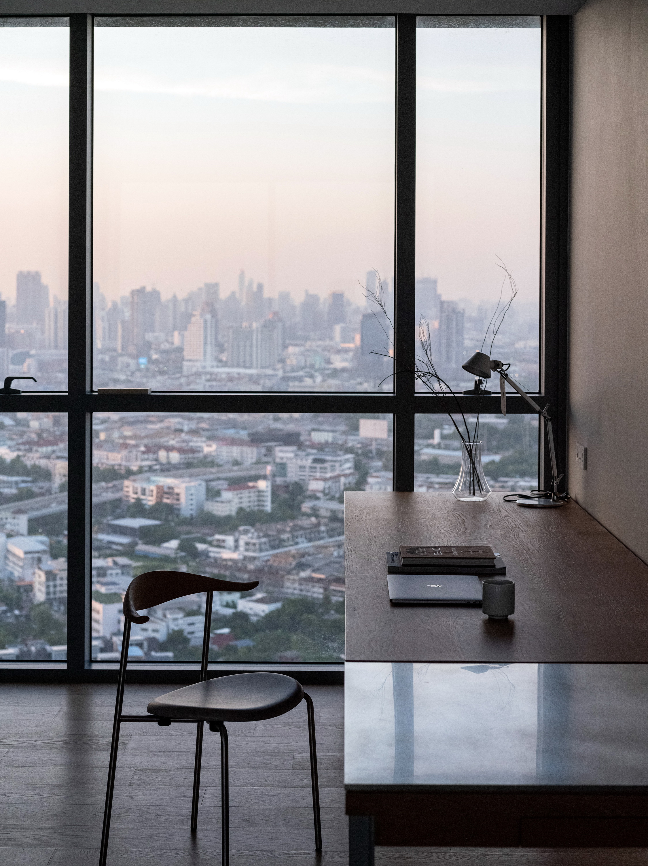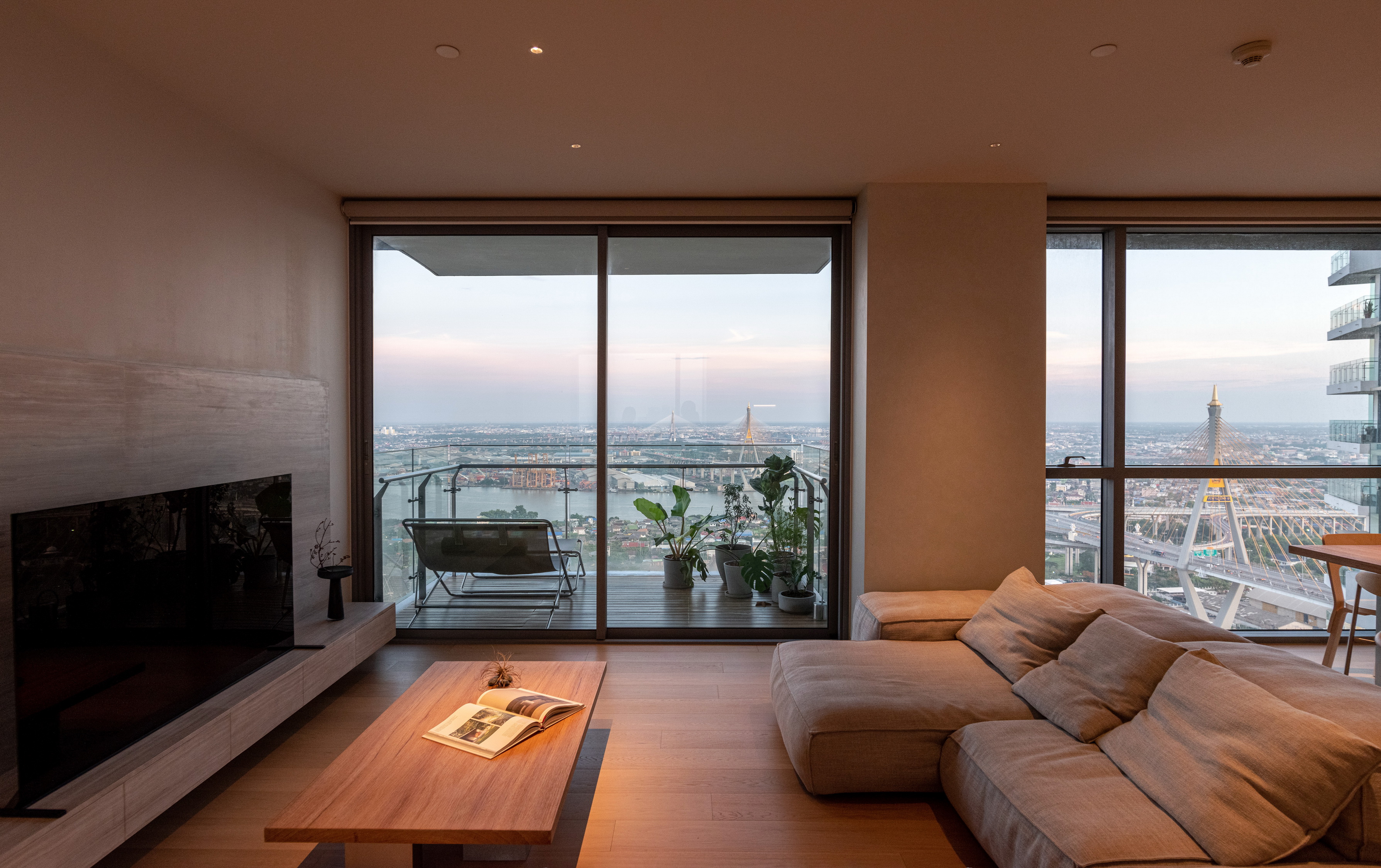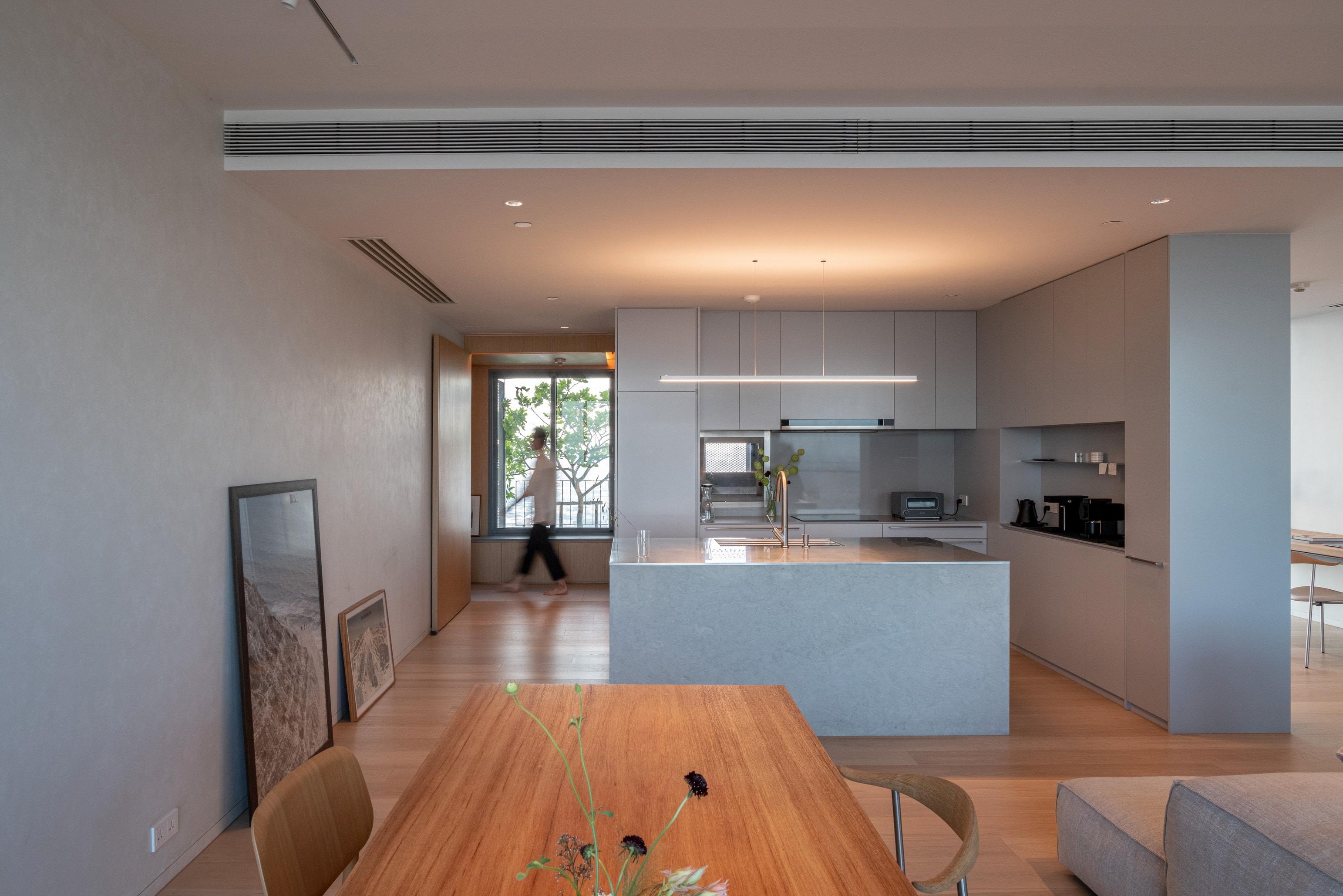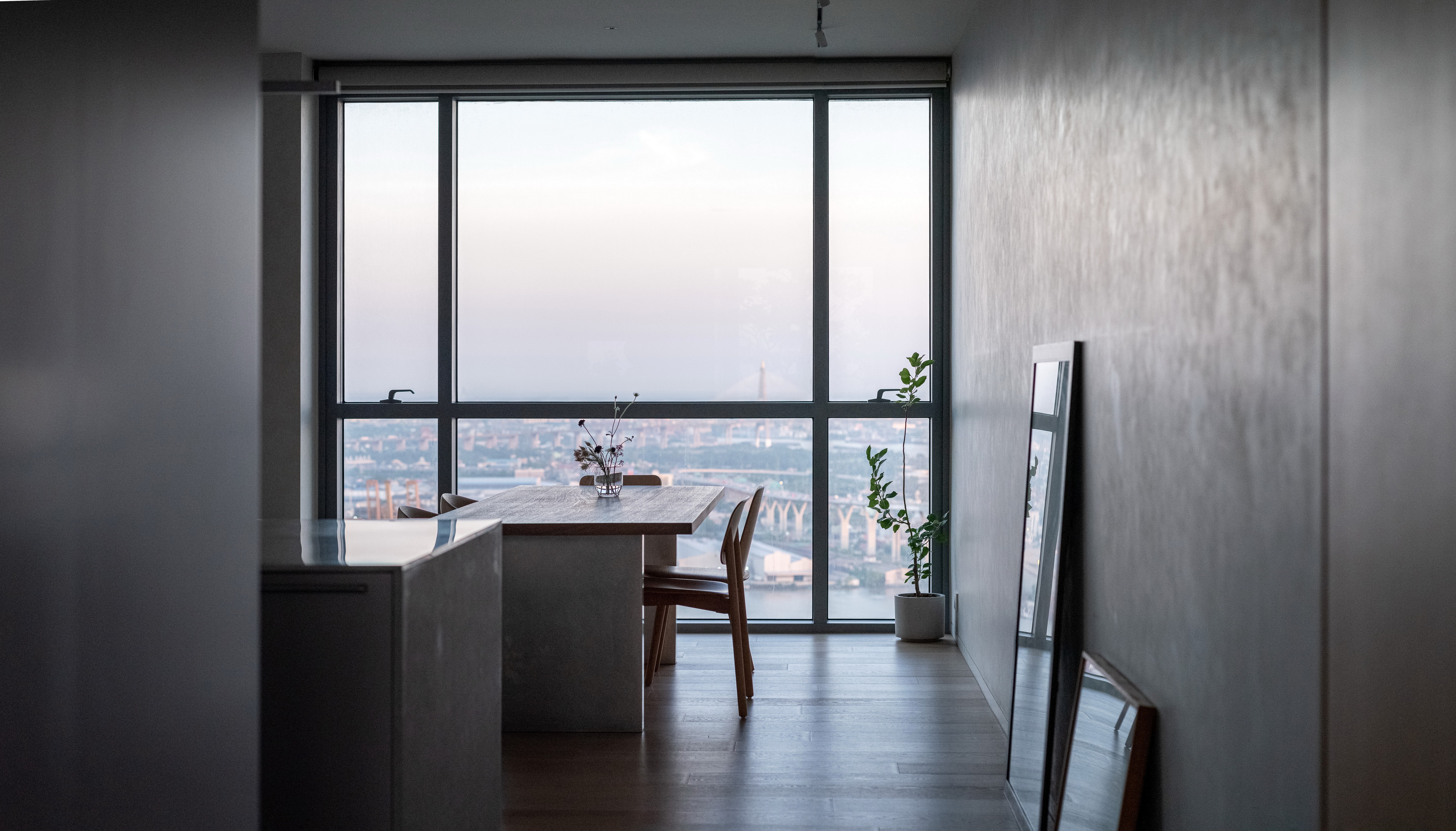 This condominium unit renovation project strategically spotlights the surrounding landscape as the prominent element of the living experience. The transformation process begins with reconfiguring the internal unit’s boundaries by removing internal walls and facilitating cross-ventilation in each room. This reconfiguration consolidates the living, dining, kitchen, and workspace areas into a single, spacious room, fostering a versatile living environment where residents can appreciate views of both the river and city simultaneously.