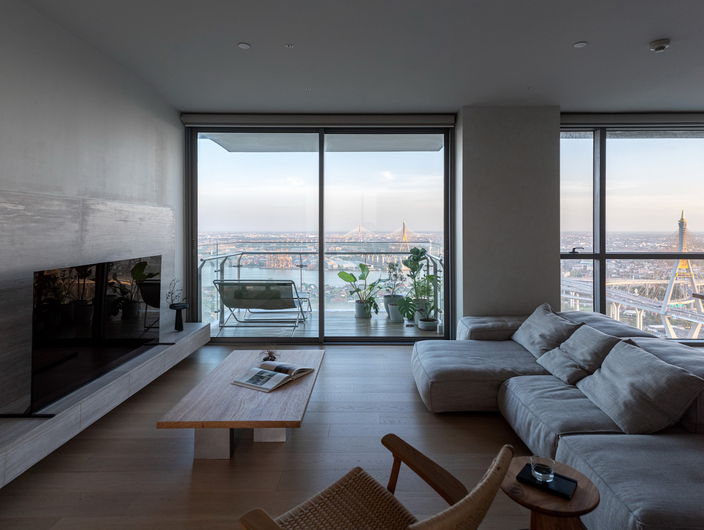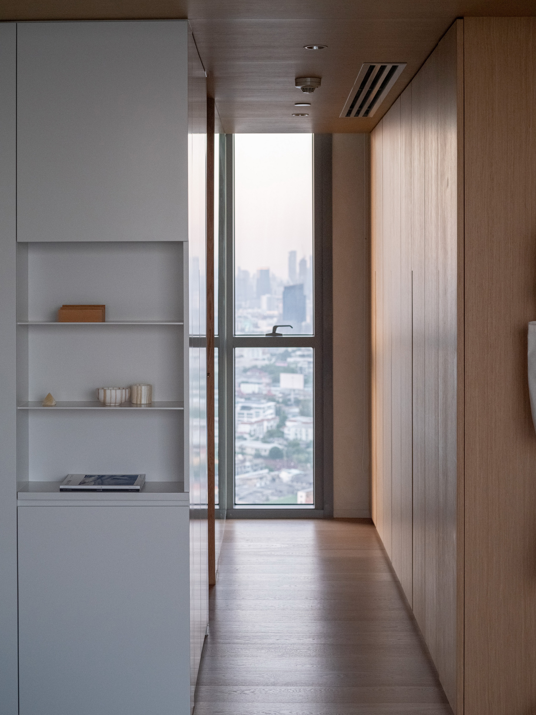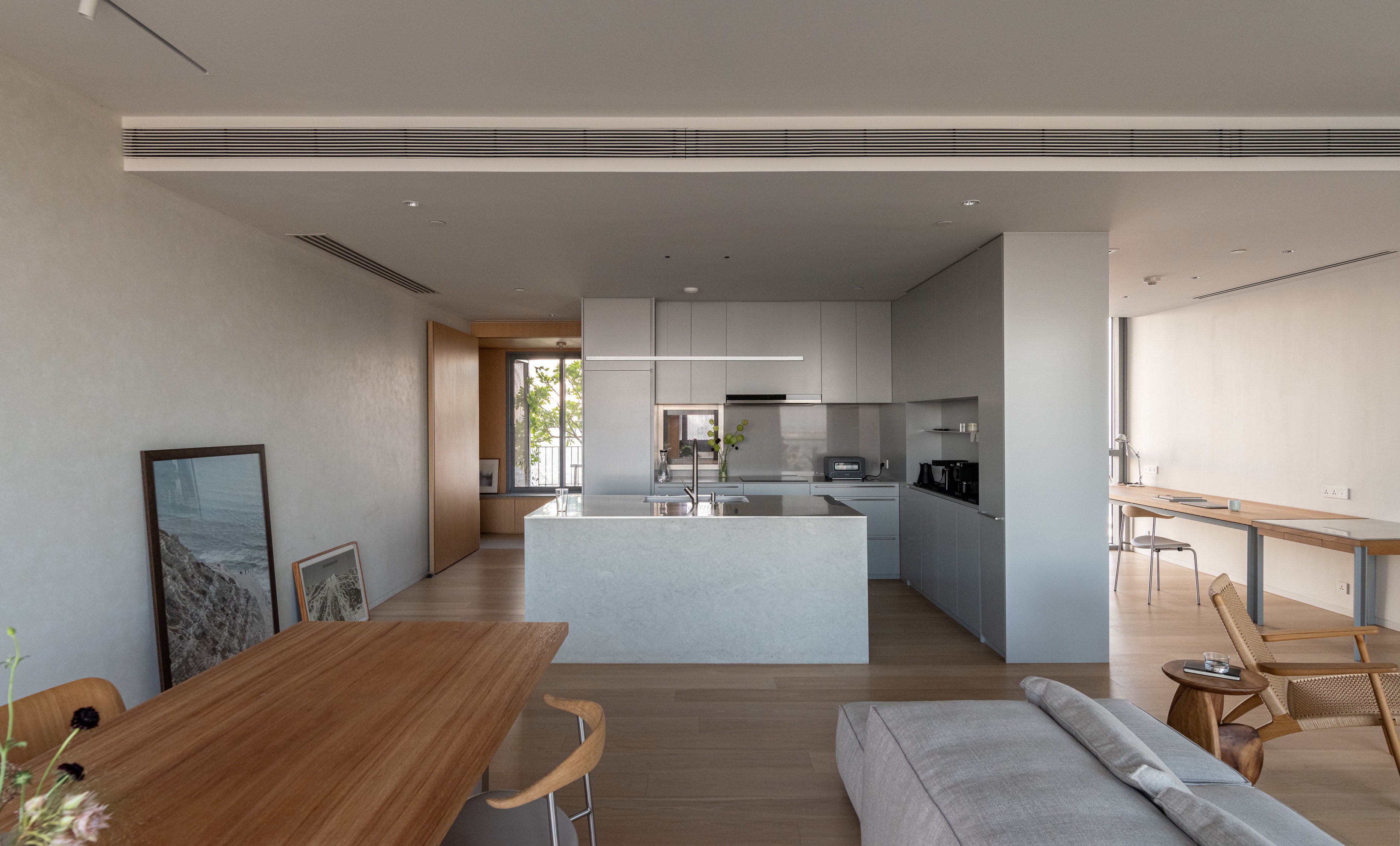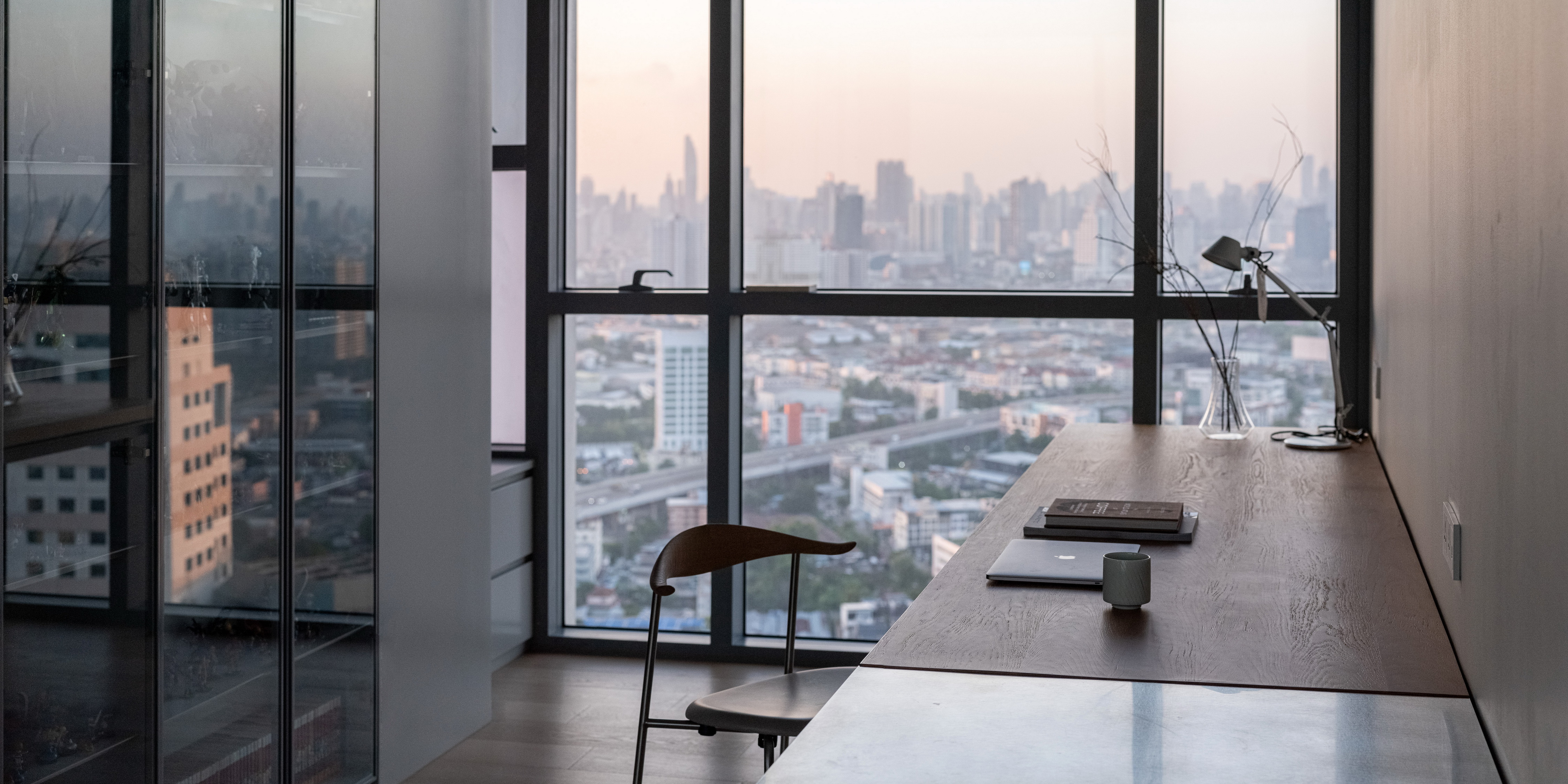 This condominium unit renovation project strategically spotlights the surrounding landscape as the prominent element of the living experience. The transformation process begins with reconfiguring the internal unit’s boundaries by removing internal walls and facilitating cross-ventilation in each room. This reconfiguration consolidates the living, dining, kitchen, and workspace areas into a single, spacious room, fostering a versatile living environment where residents can appreciate views of both the river and city simultaneously.
