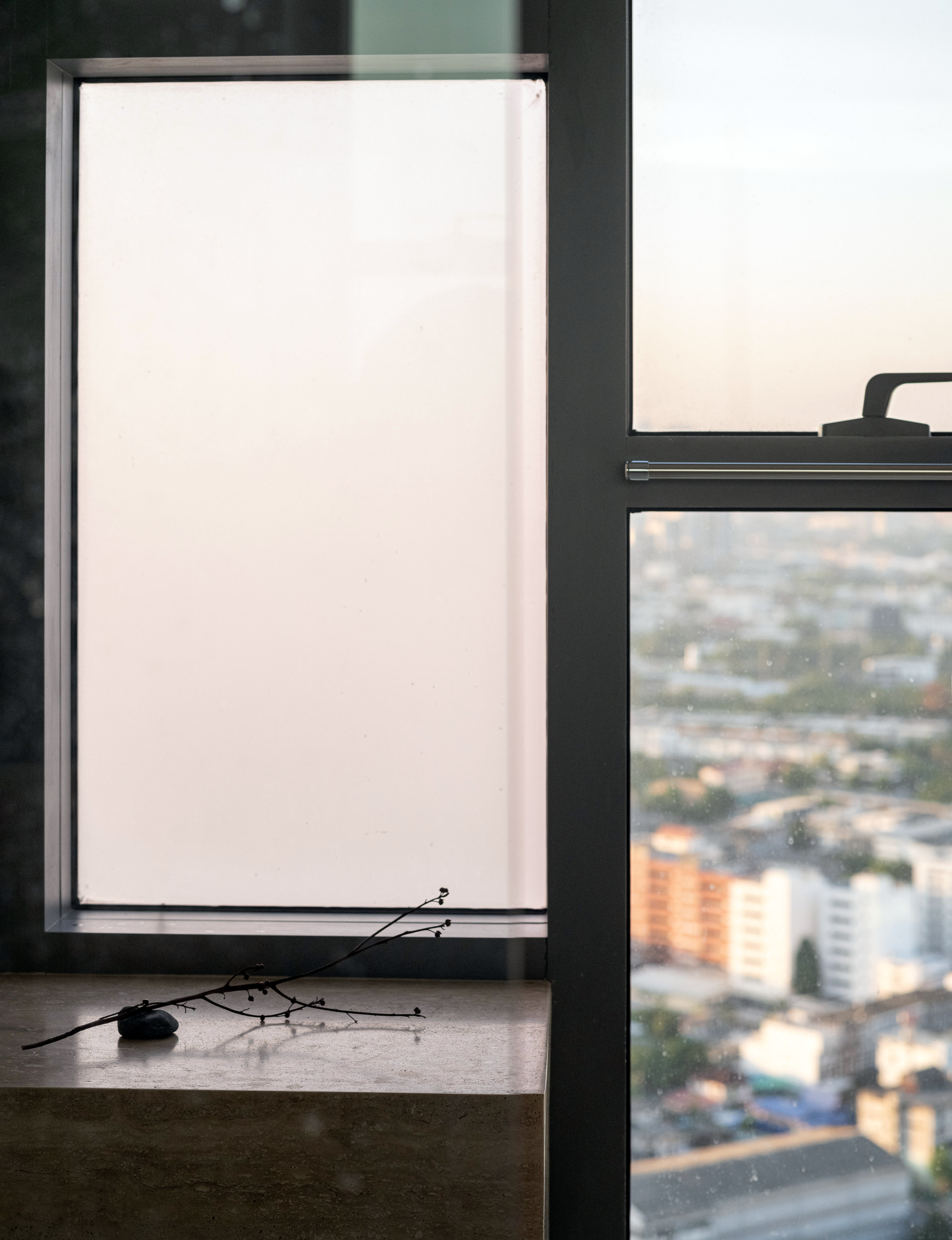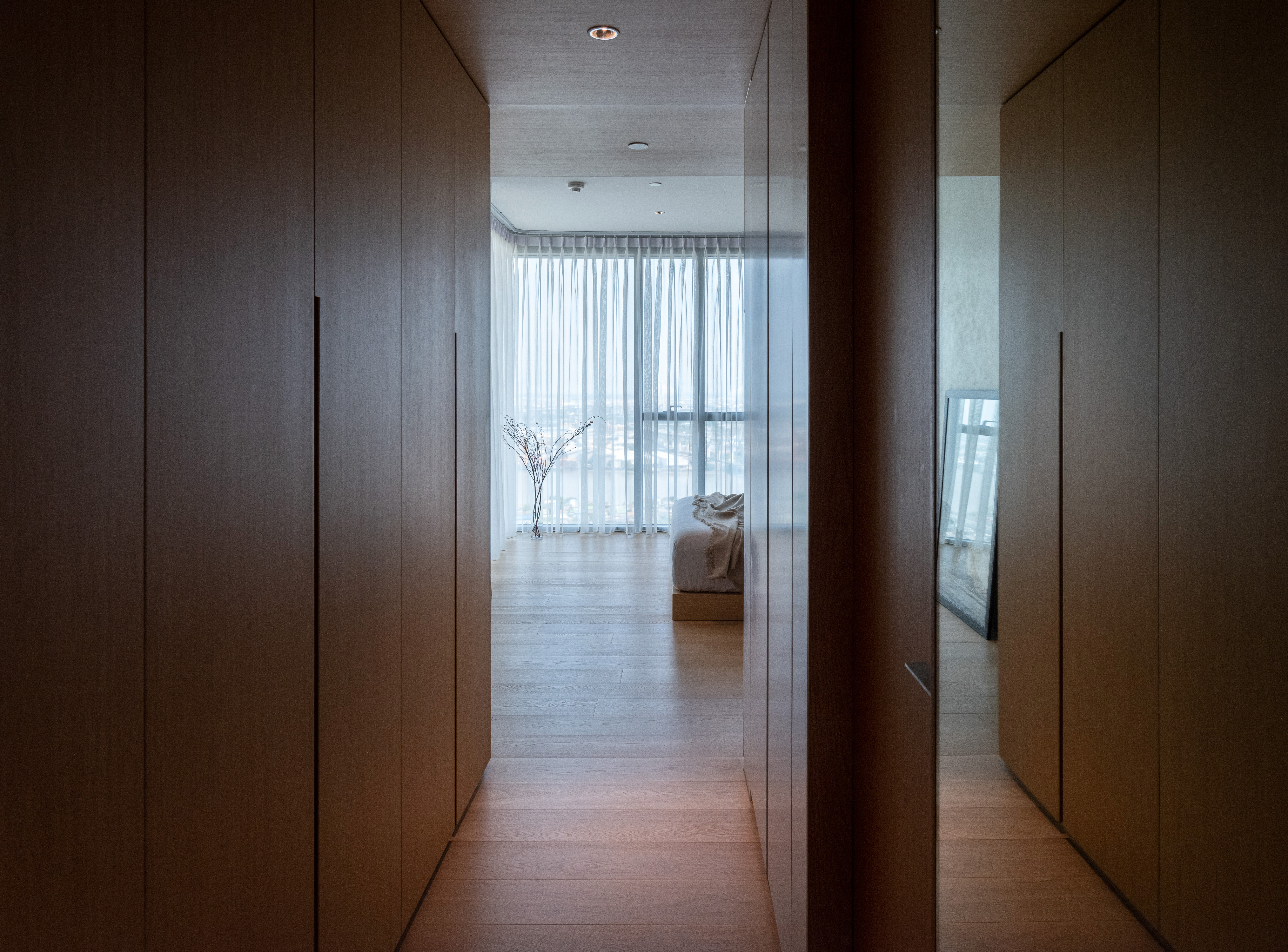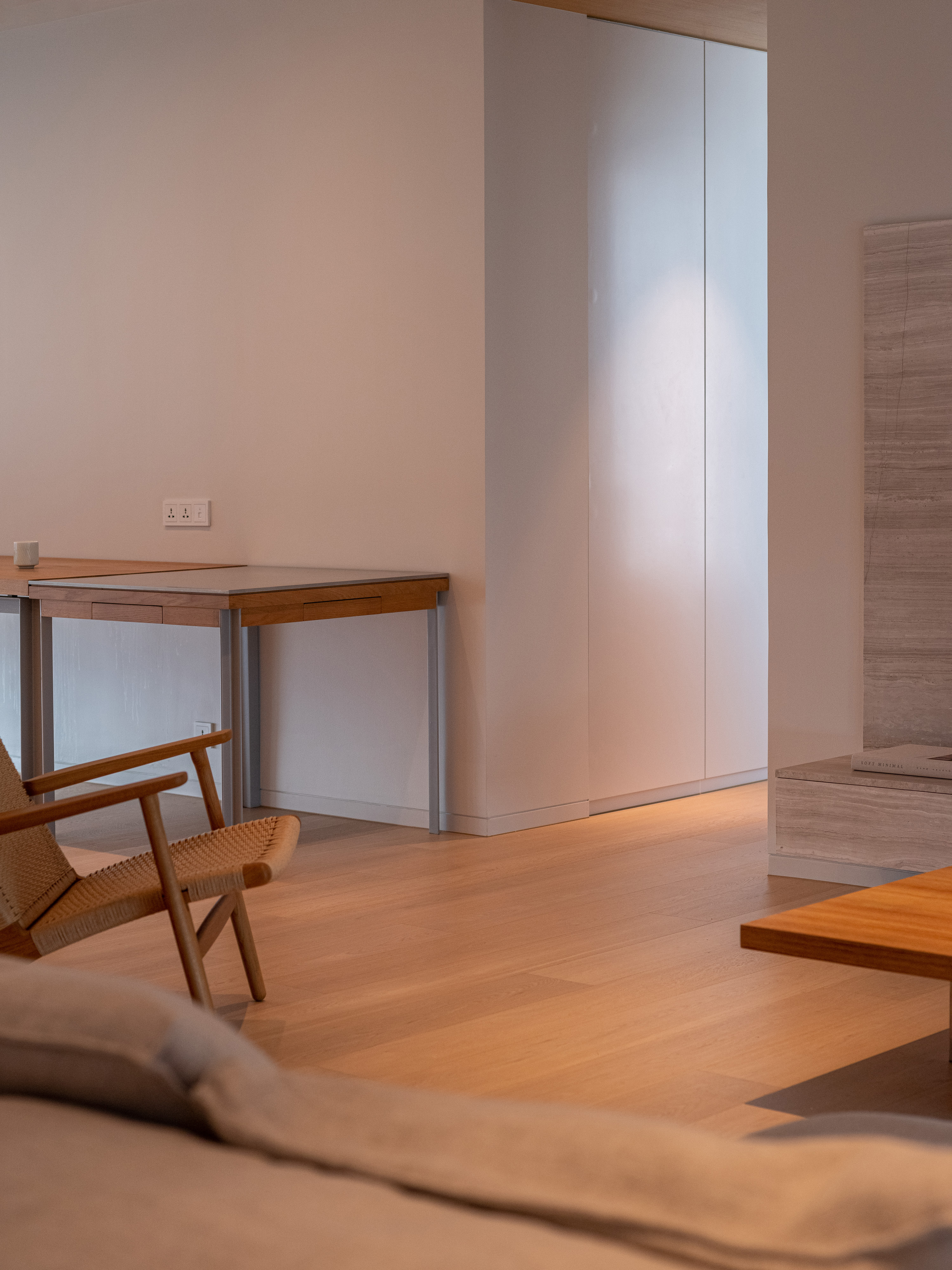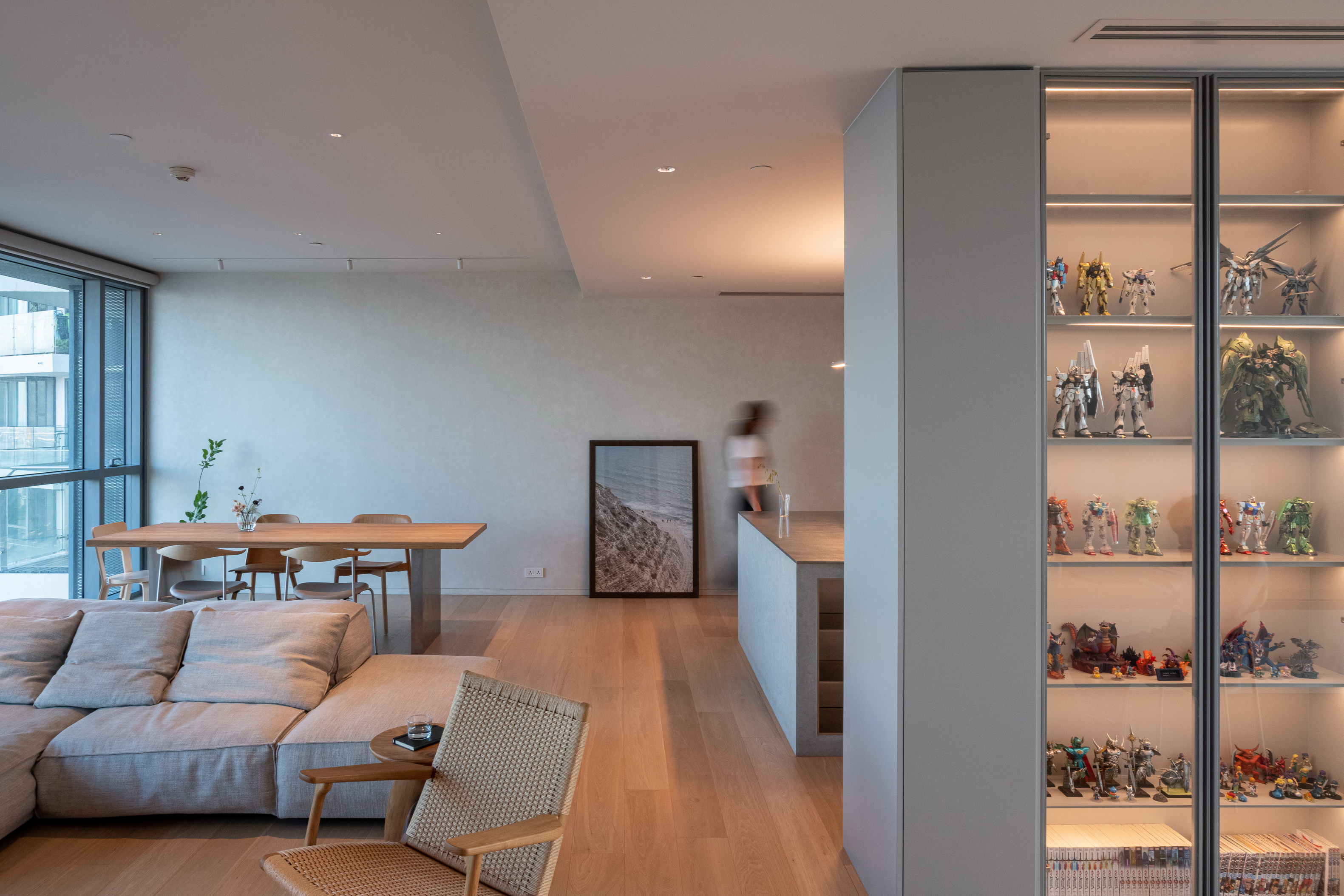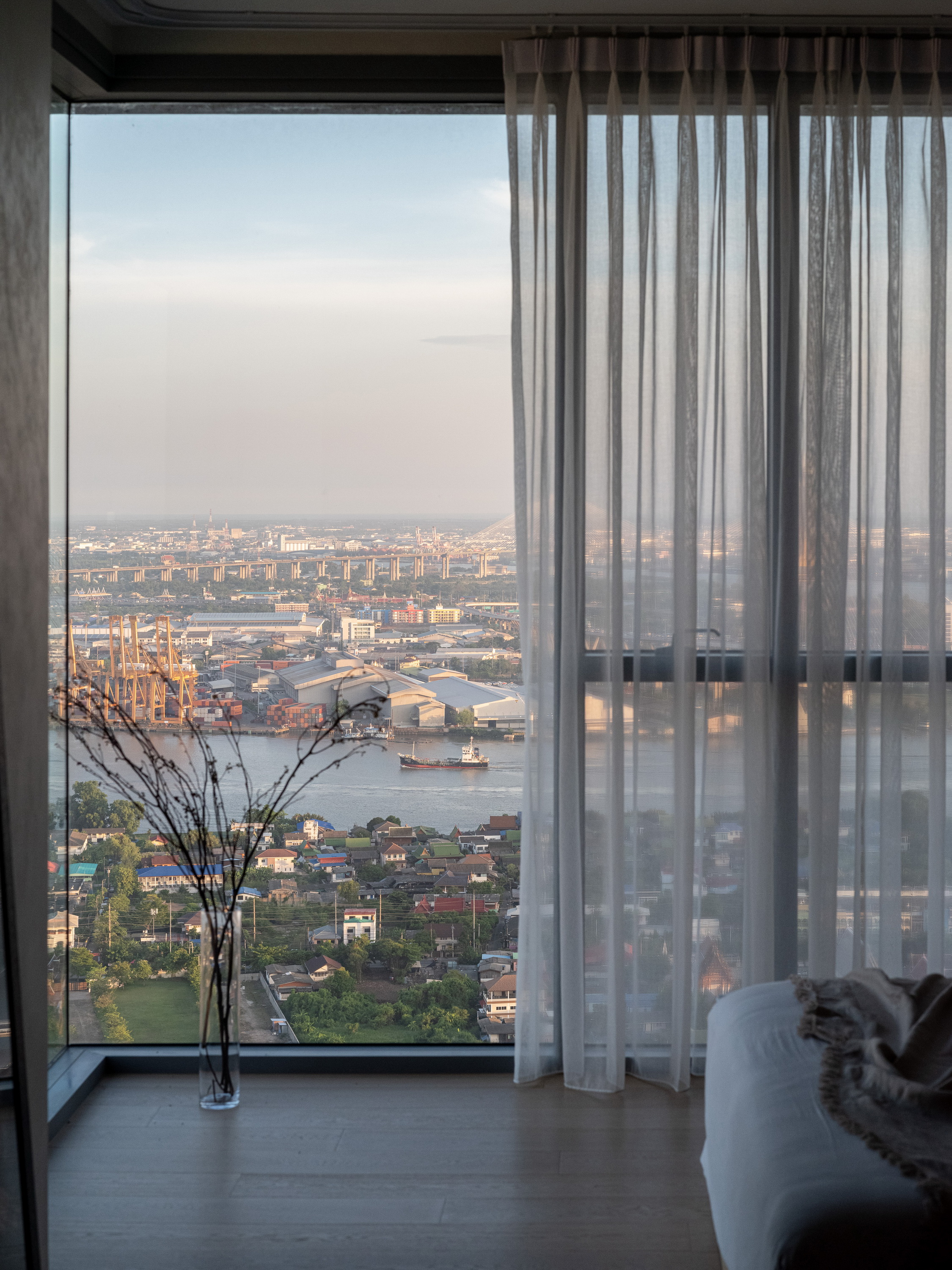 This condominium unit renovation project strategically spotlights the surrounding landscape as the prominent element of the living experience. The transformation process begins with reconfiguring the internal unit’s boundaries by removing internal walls and facilitating cross-ventilation in each room. This reconfiguration consolidates the living, dining, kitchen, and workspace areas into a single, spacious room, fostering a versatile living environment where residents can appreciate views of both the river and city simultaneously.