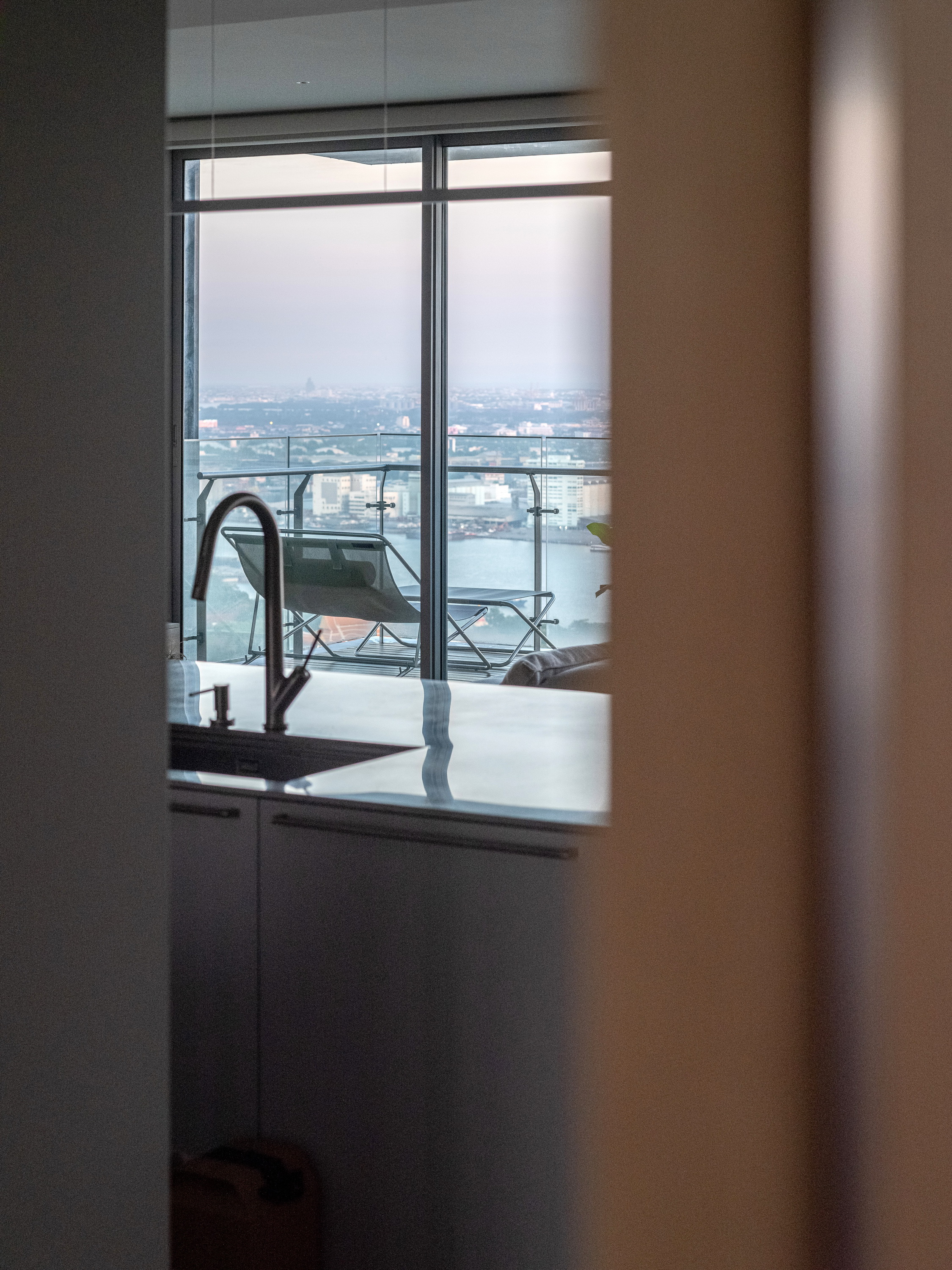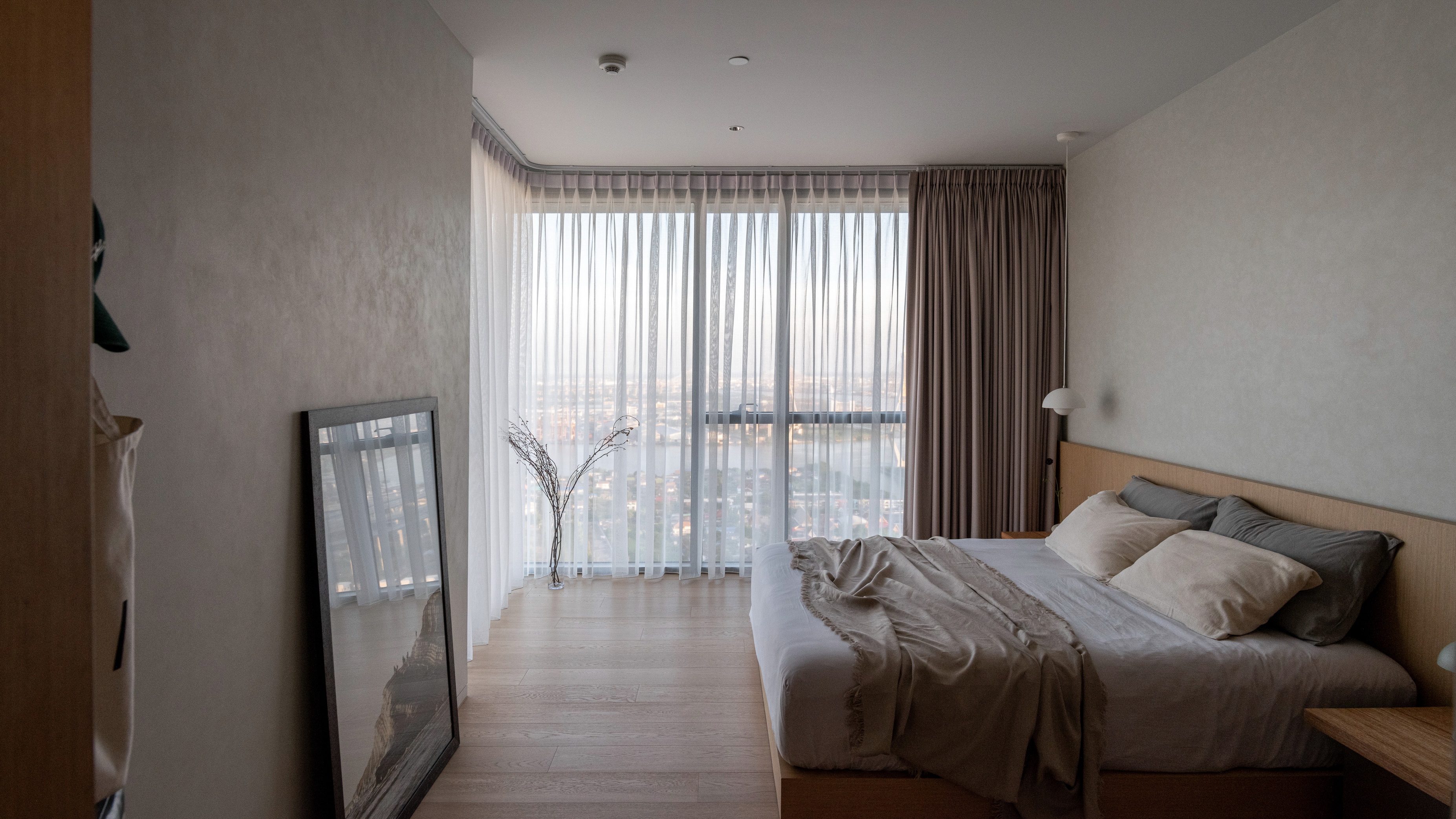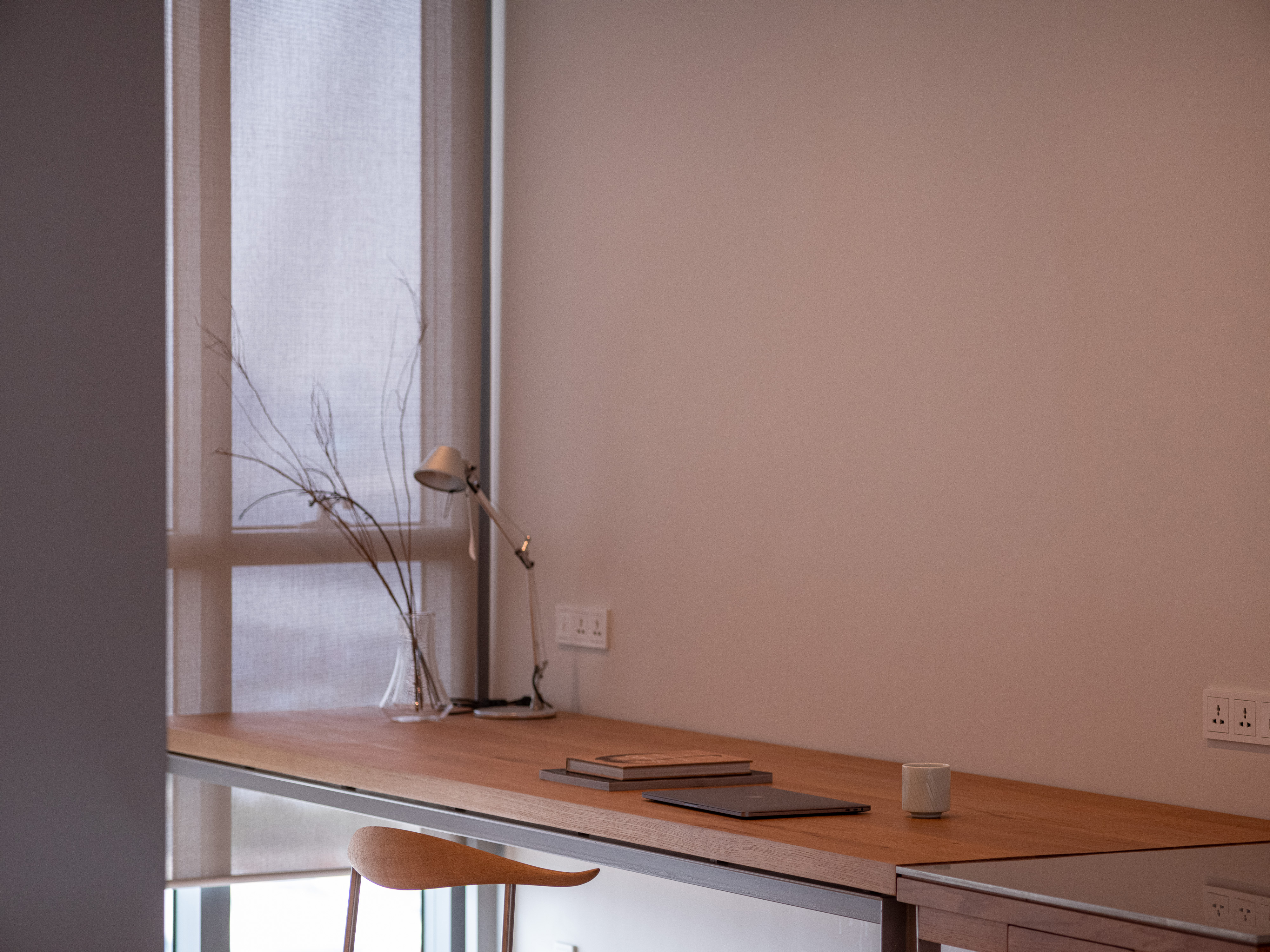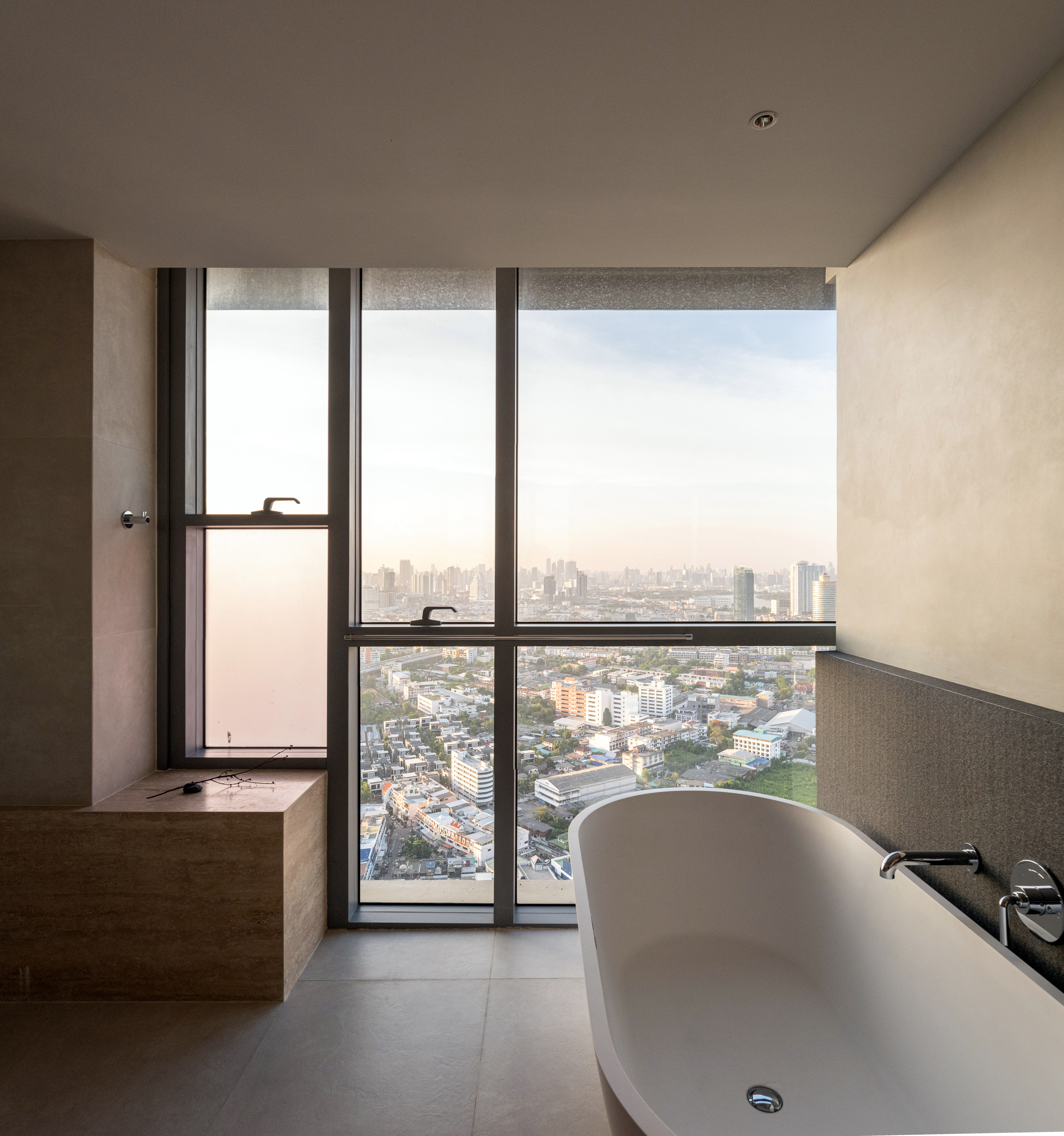 This condominium unit renovation project strategically spotlights the surrounding landscape as the prominent element of the living experience. The transformation process begins with reconfiguring the internal unit’s boundaries by removing internal walls and facilitating cross-ventilation in each room. This reconfiguration consolidates the living, dining, kitchen, and workspace areas into a single, spacious room, fostering a versatile living environment where residents can appreciate views of both the river and city simultaneously.