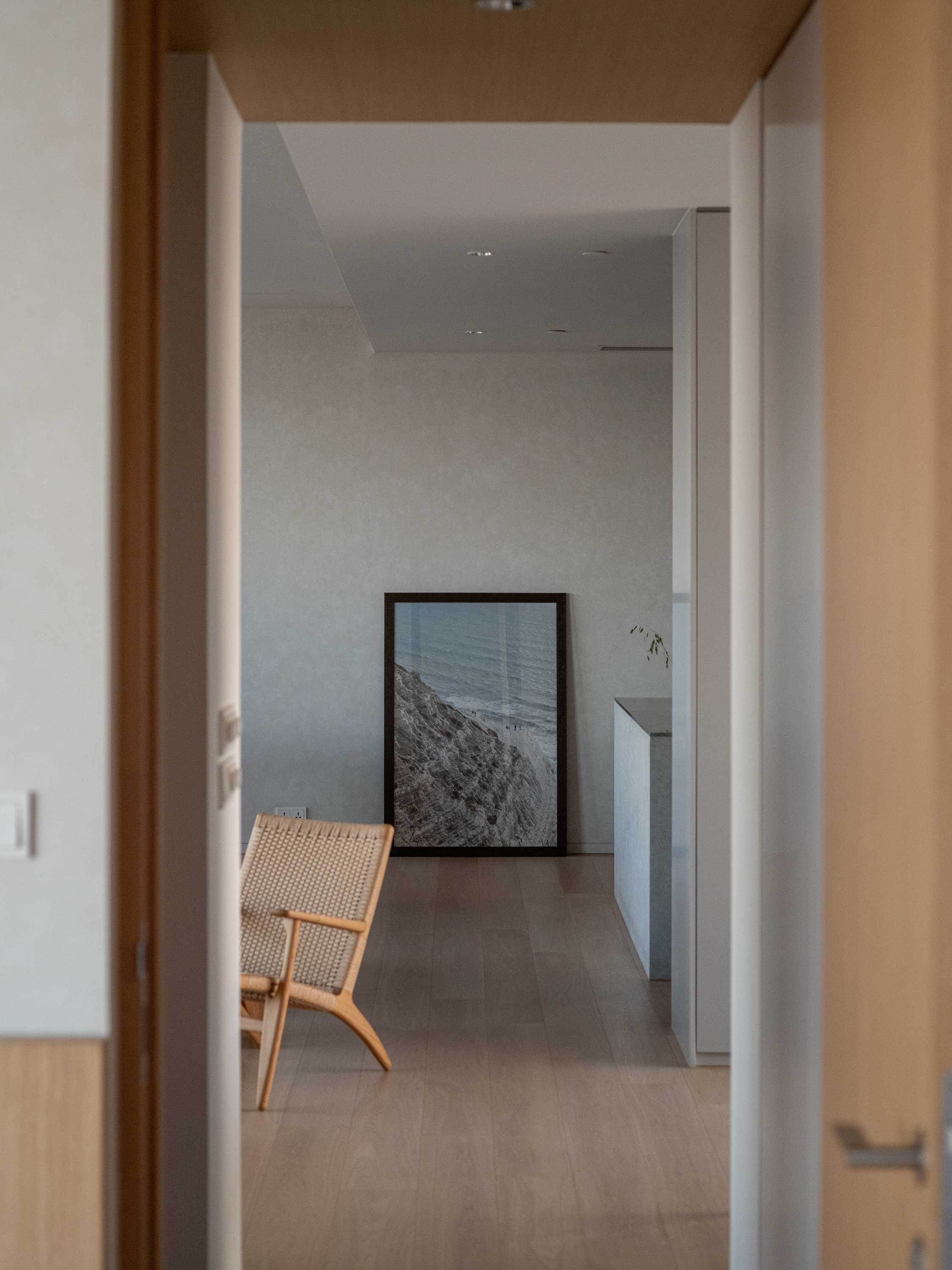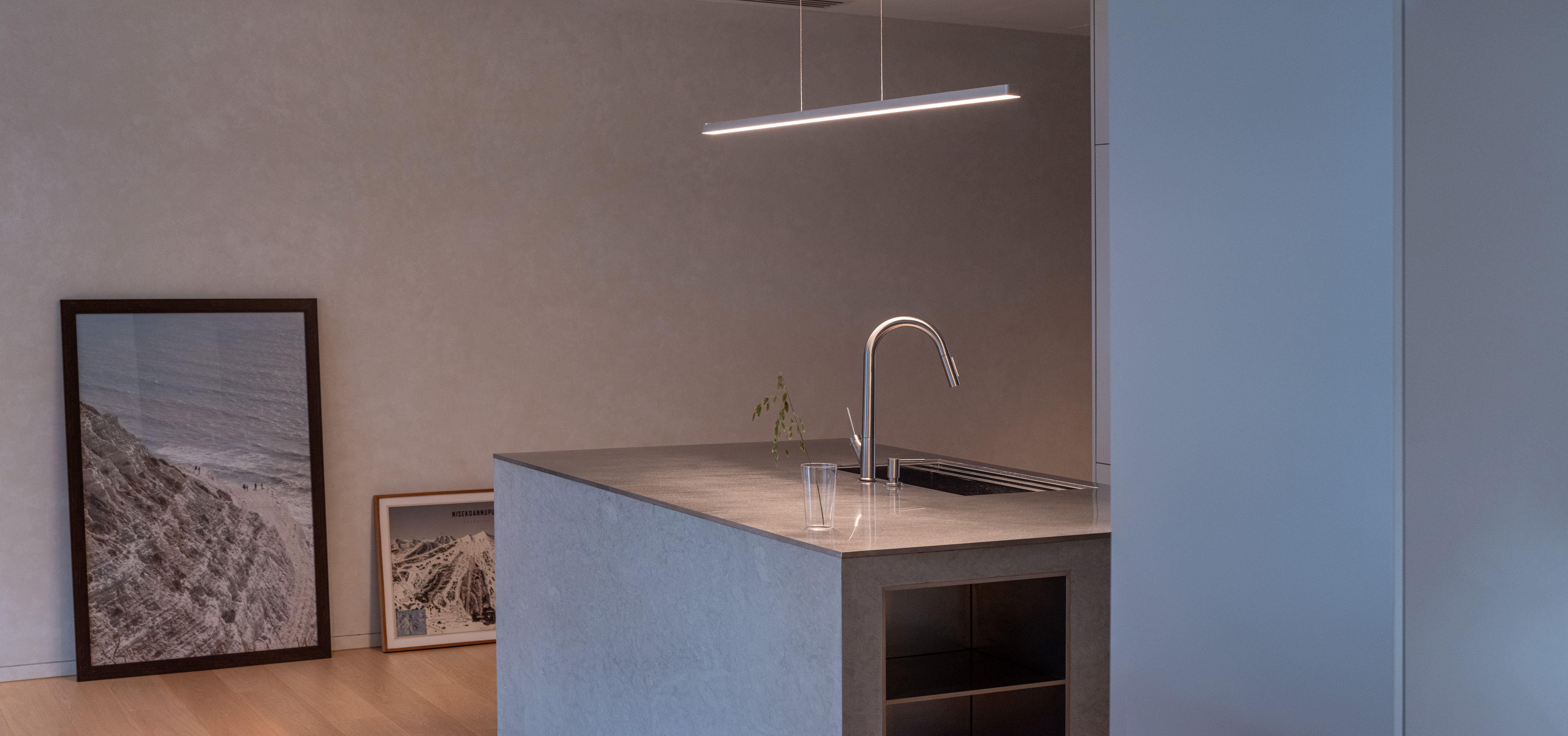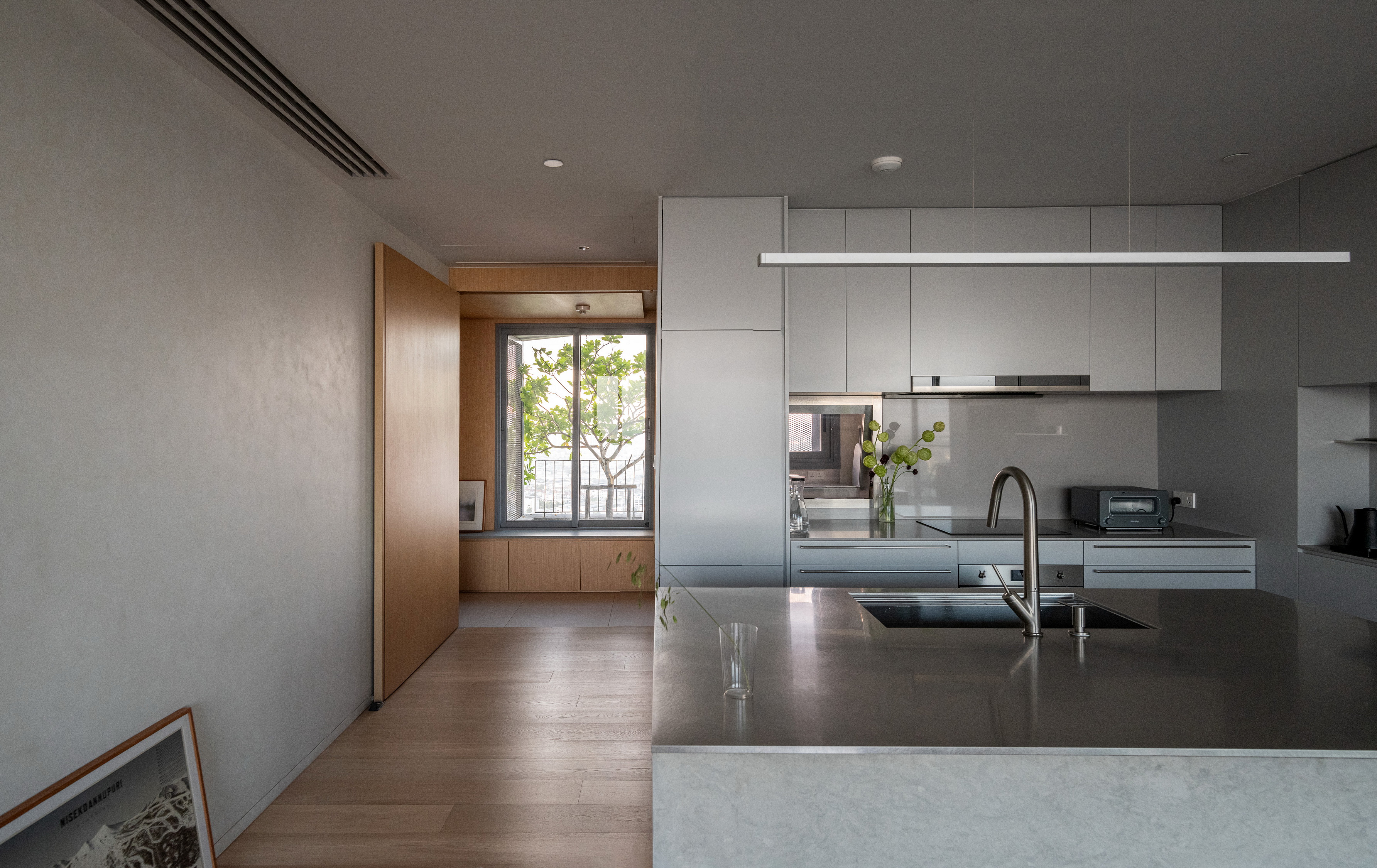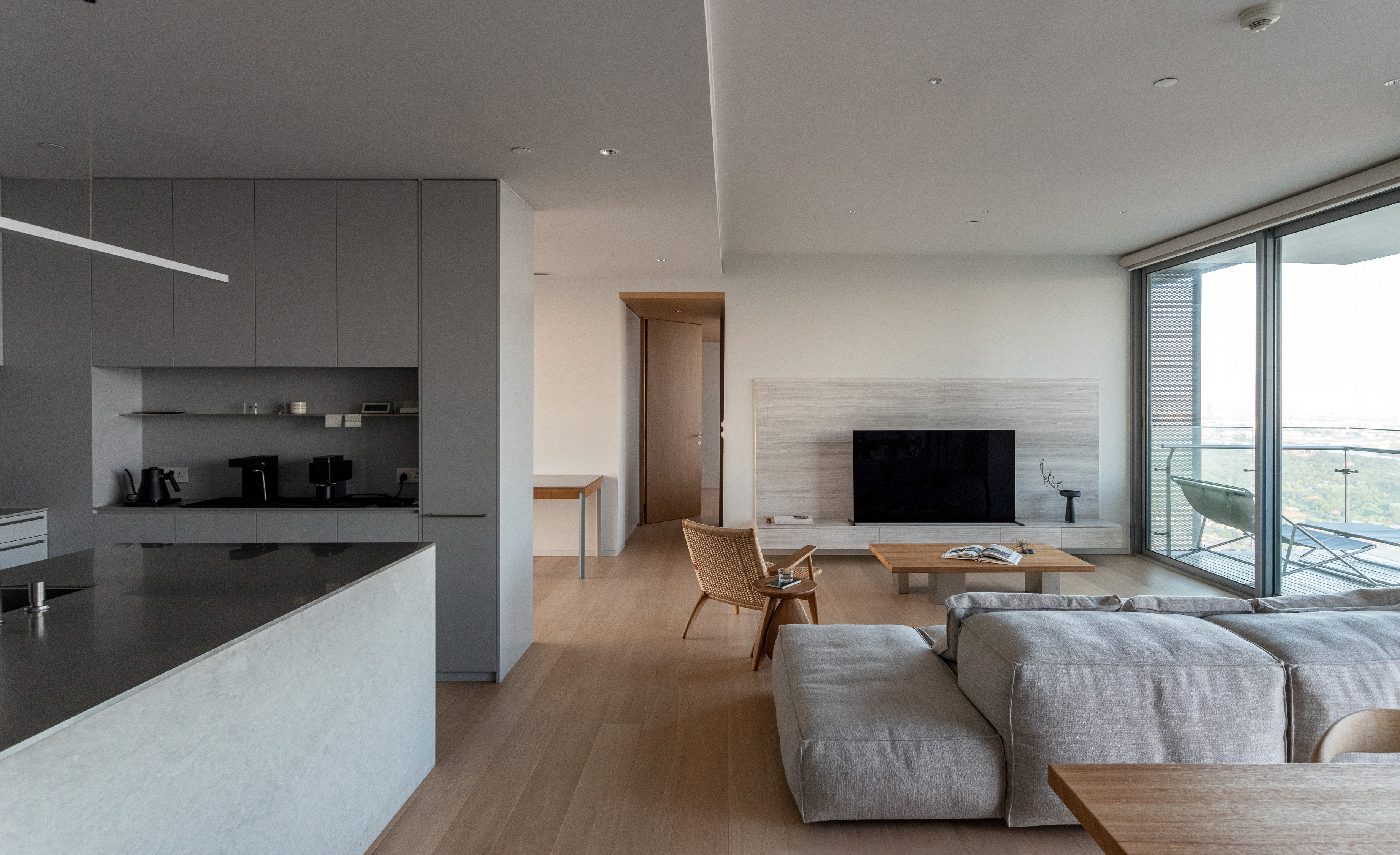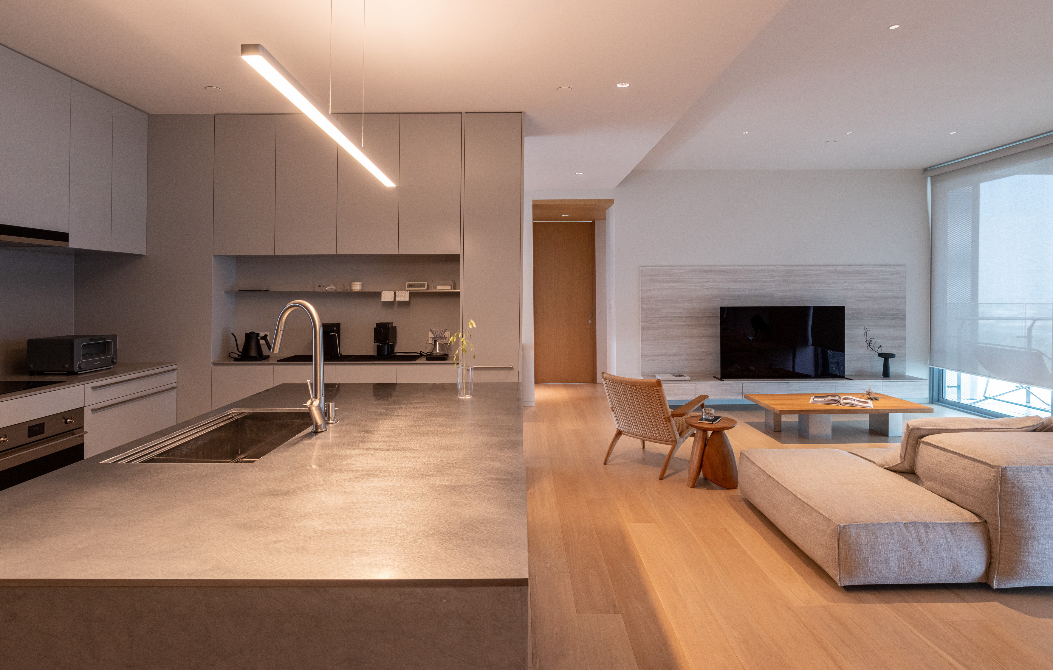 Internally, the design serves as a canvas for the picturesque outdoor vistas, employing muted tones of gray and soft beige. The entryway welcomes occupants with veneer wood accents, instilling a cozy ambiance. In the kitchen, a limestone countertop harmonizes with a sizable stainless-steel slab, stylishly blending different textured materials in gray hues. Large-format materials are intentionally selected elsewhere to maintain a clean aesthetic, such as the teak-wood table atop stainless-steel legs and the expansive stone panels framing the television, drawing all attention towards the captivating outdoor scenery.