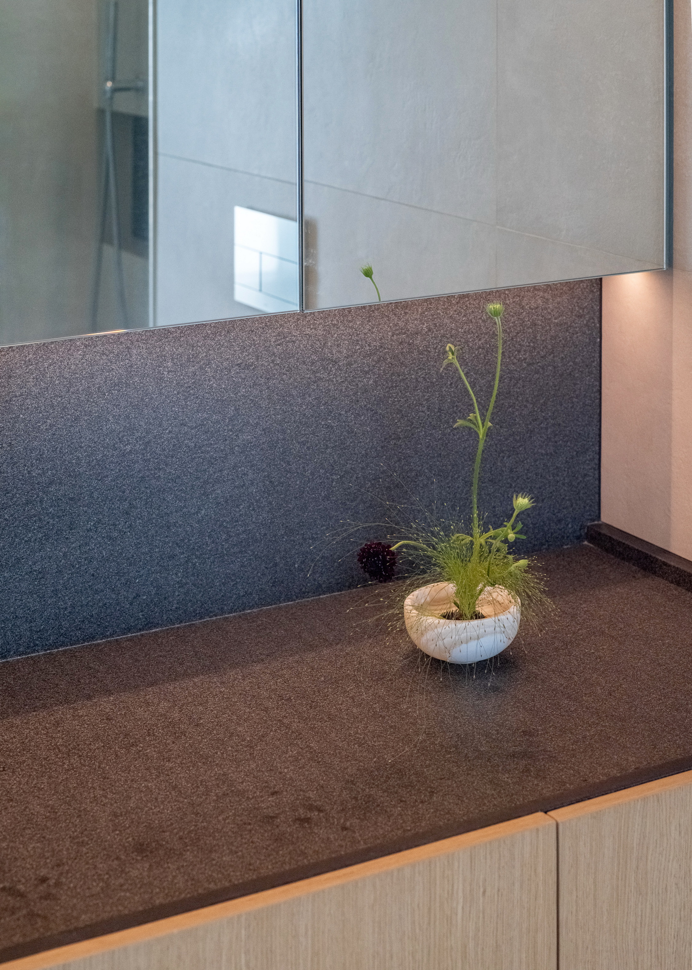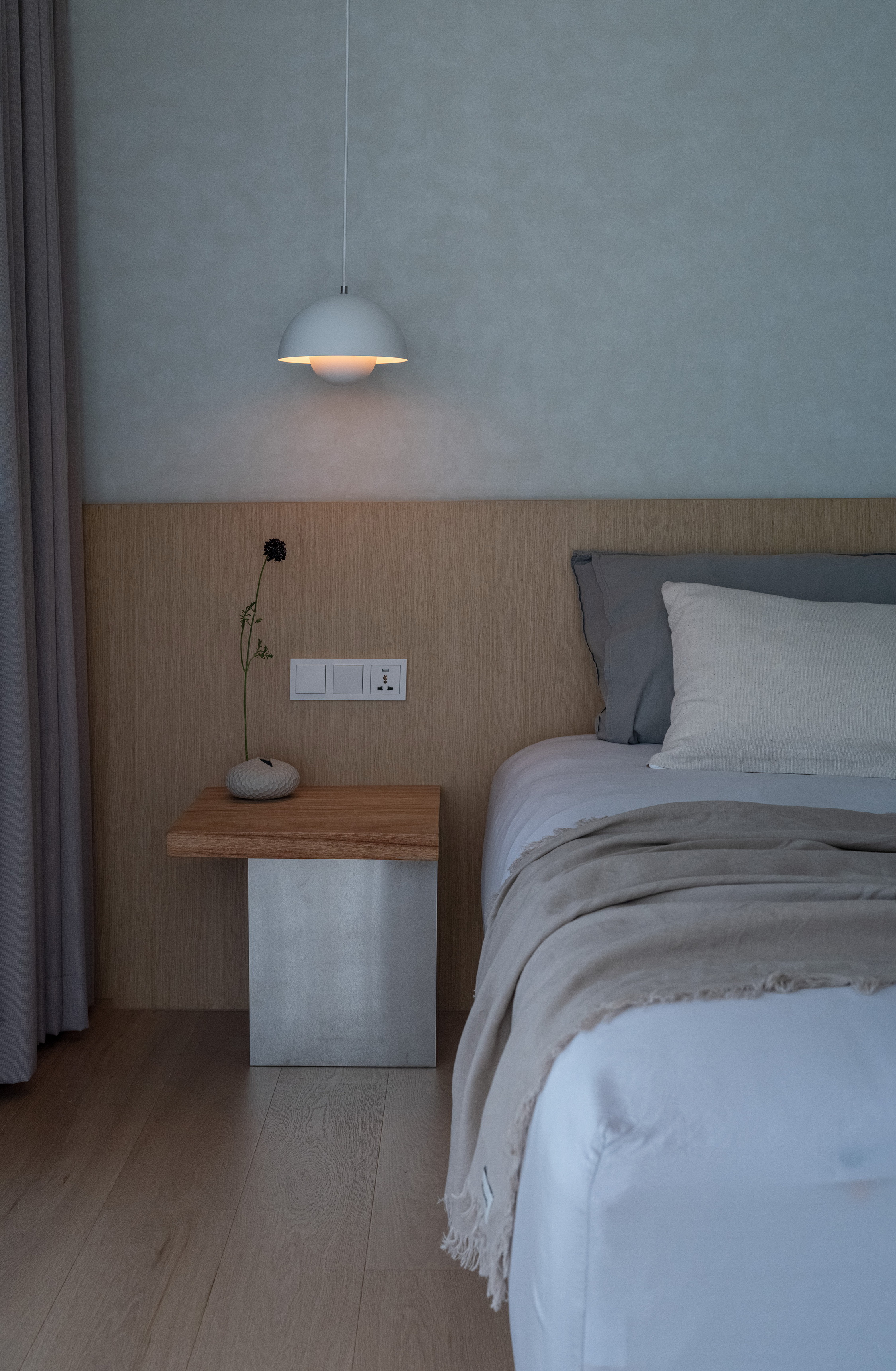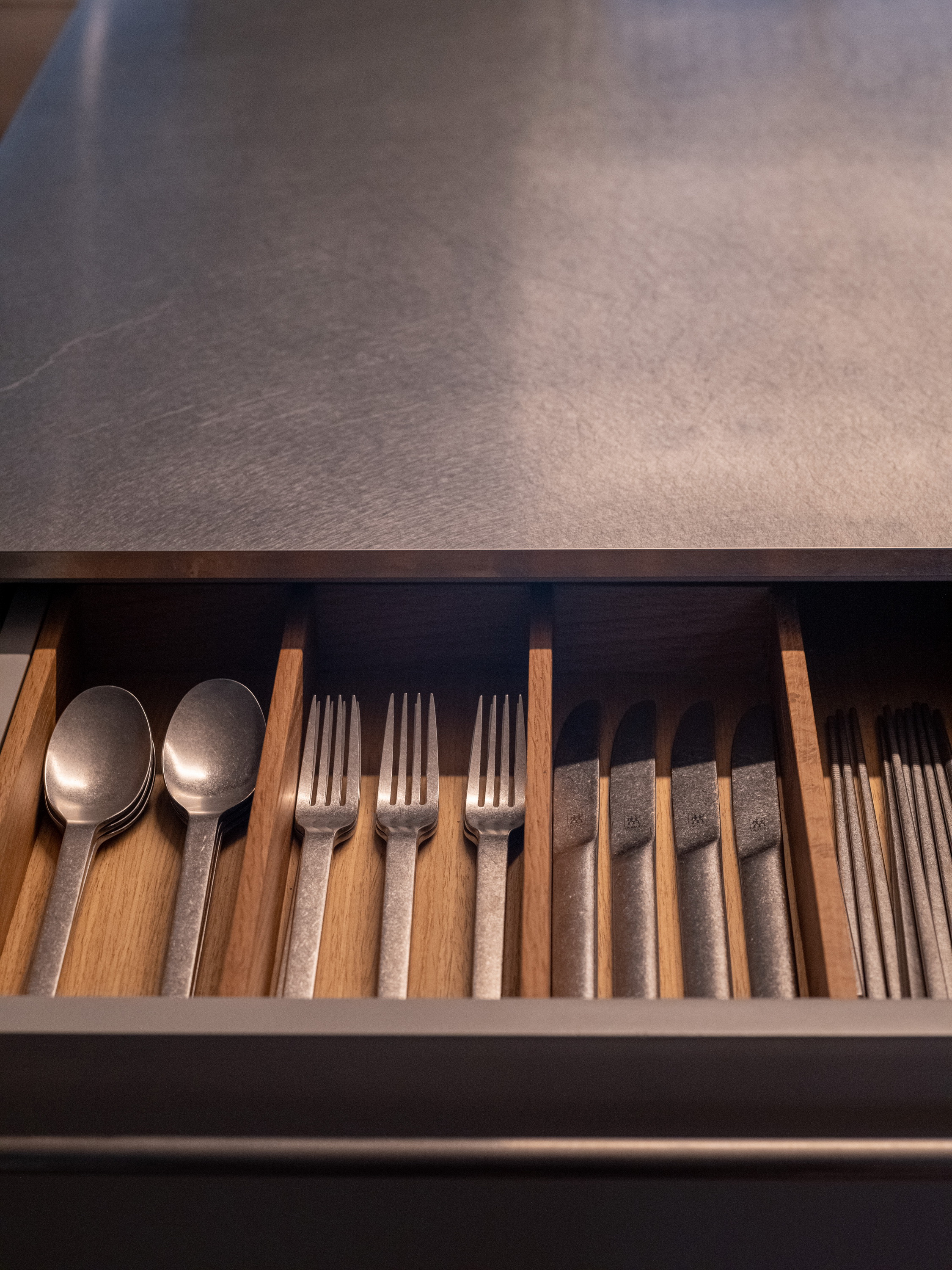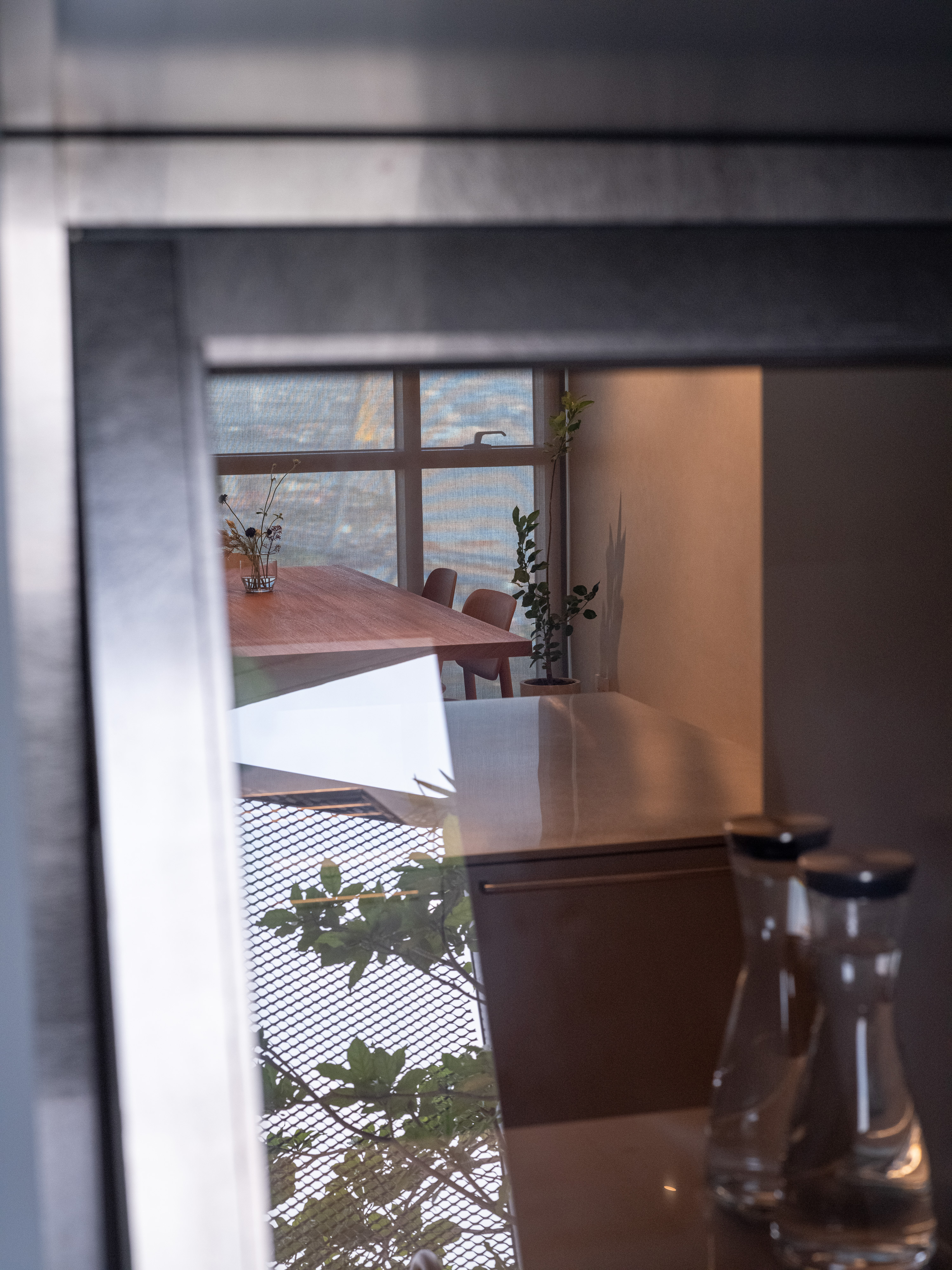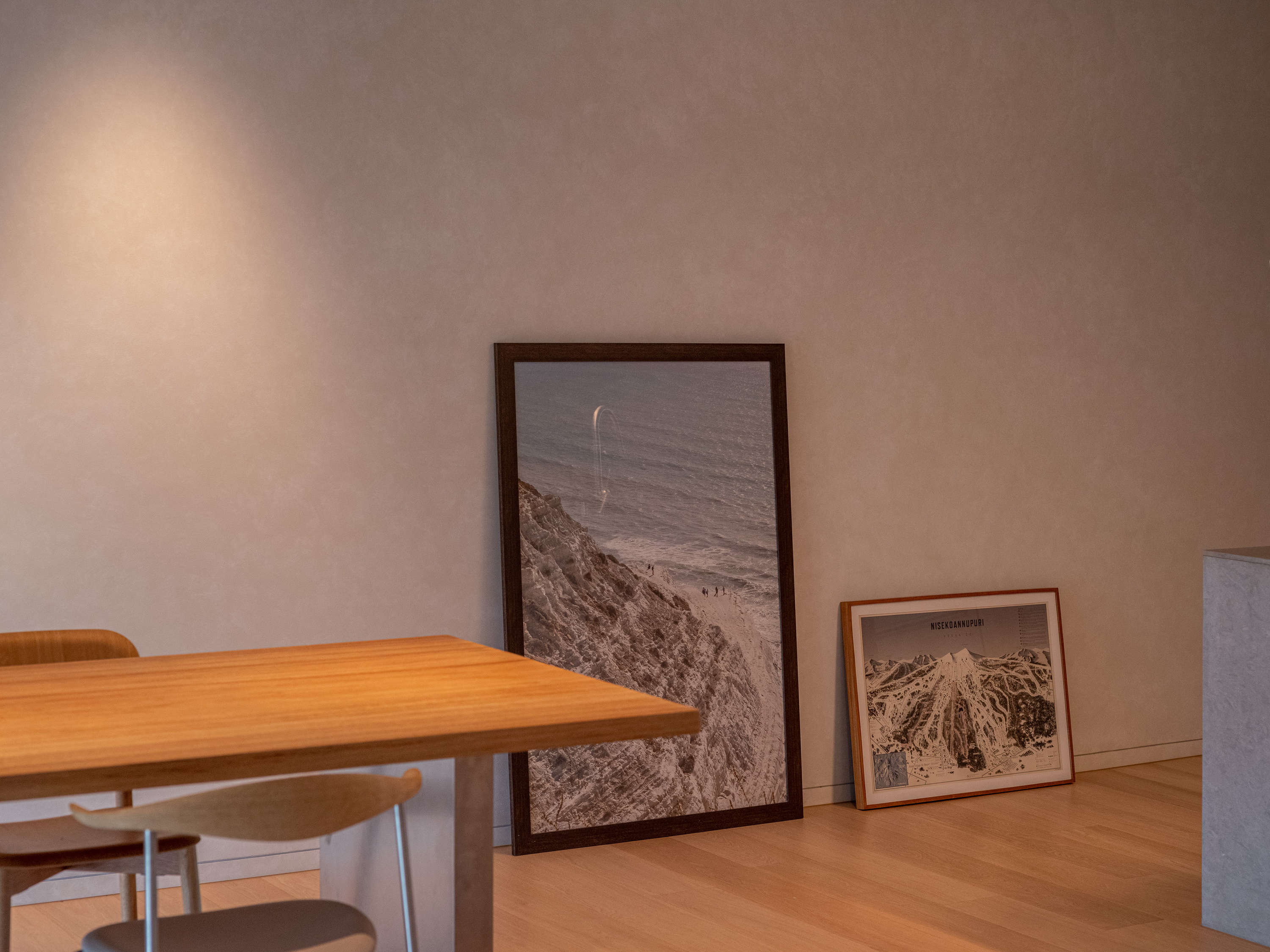 Internally, the design serves as a canvas for the picturesque outdoor vistas, employing muted tones of gray and soft beige. The entryway welcomes occupants with veneer wood accents, instilling a cozy ambiance. In the kitchen, a limestone countertop harmonizes with a sizable stainless-steel slab, stylishly blending different textured materials in gray hues. Large-format materials are intentionally selected elsewhere to maintain a clean aesthetic, such as the teak-wood table atop stainless-steel legs and the expansive stone panels framing the television, drawing all attention towards the captivating outdoor scenery.