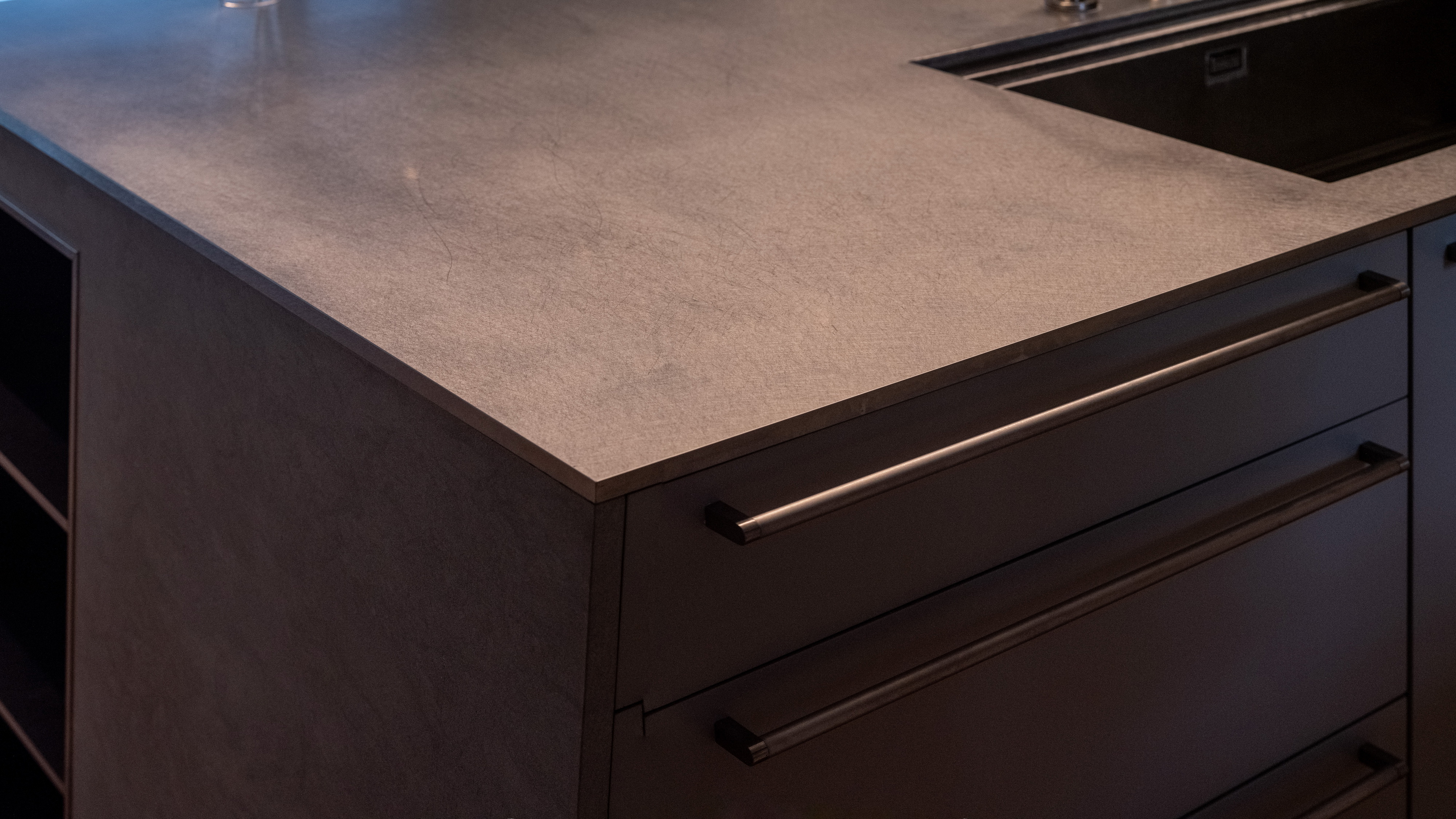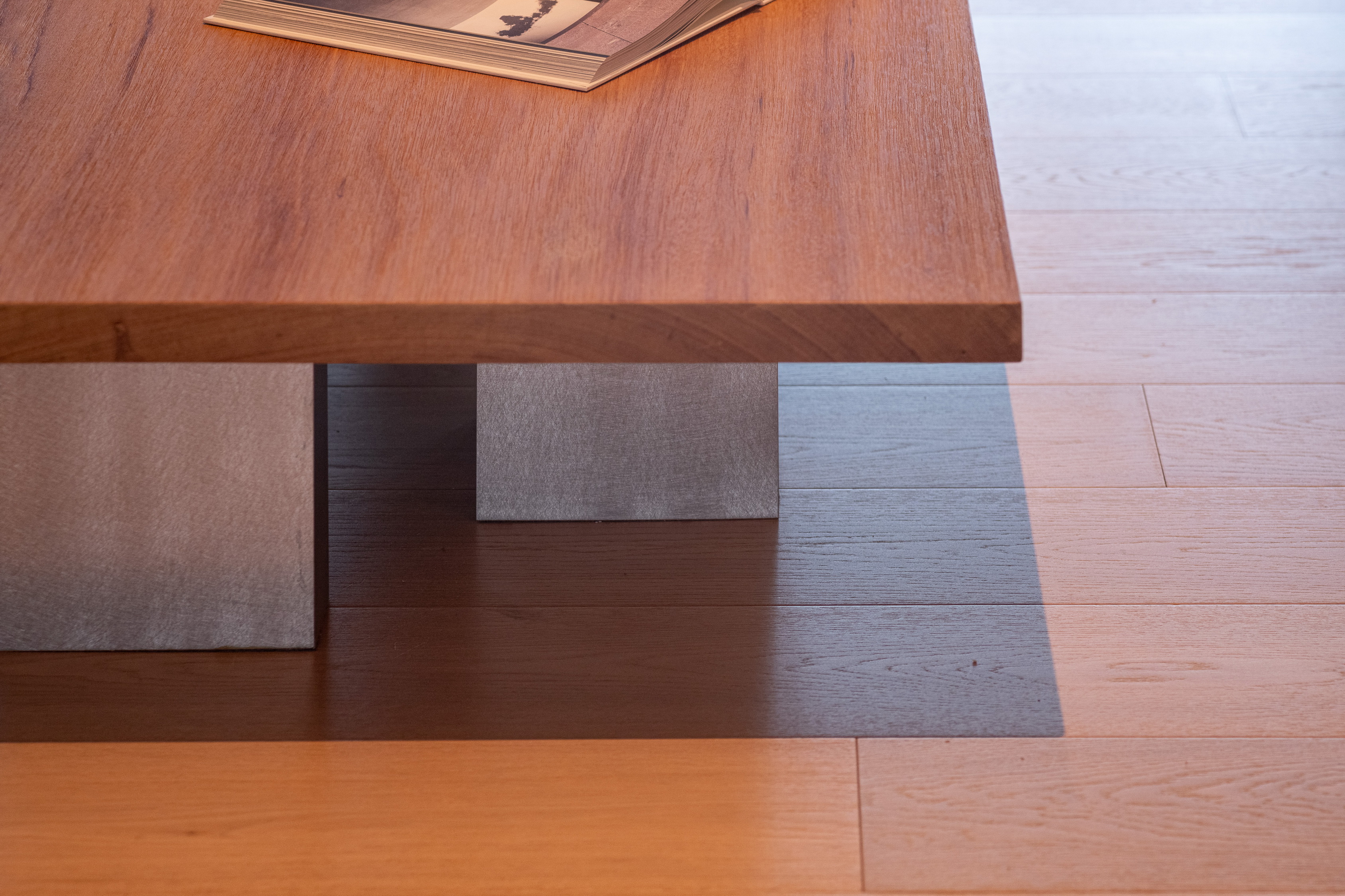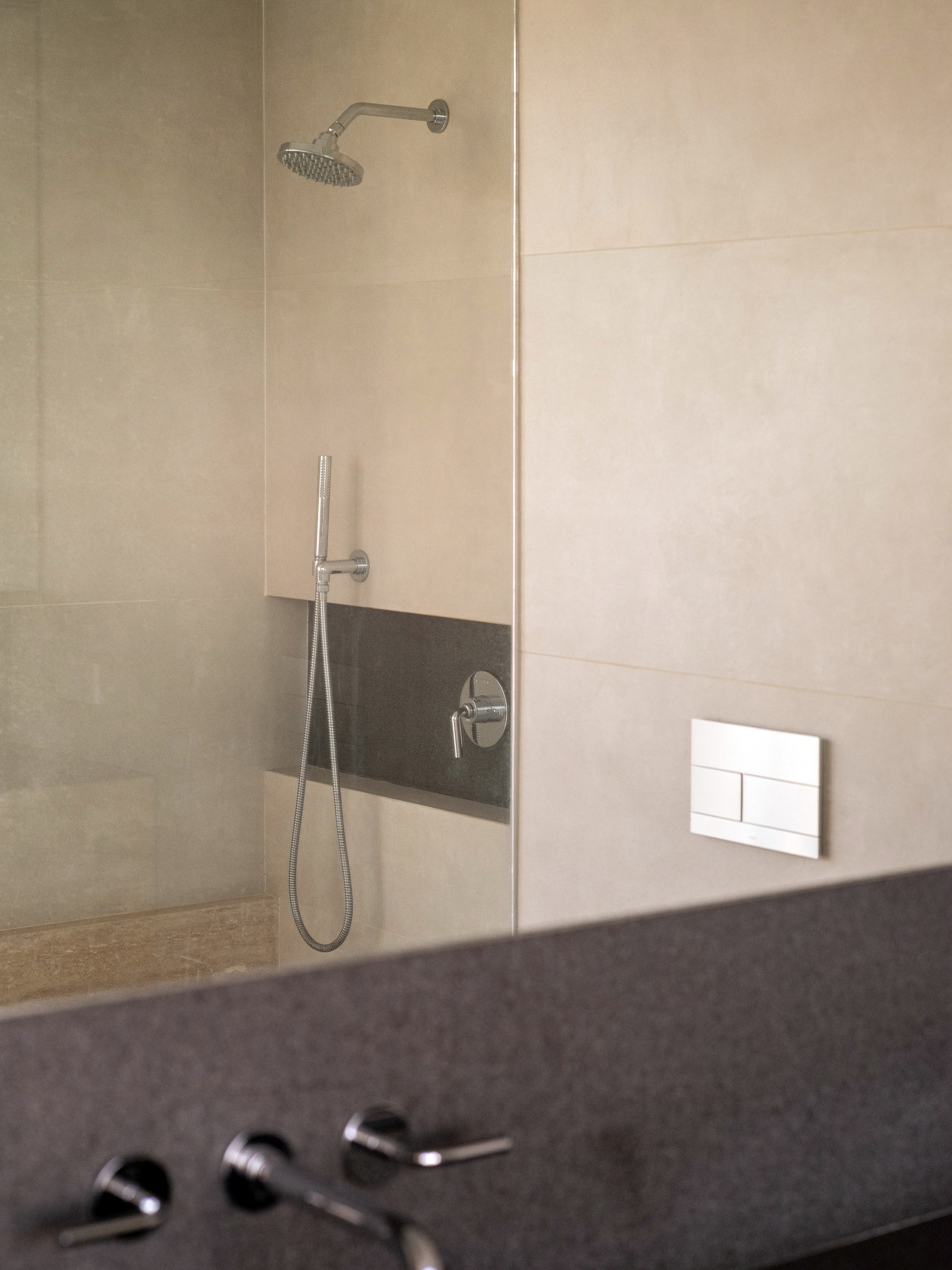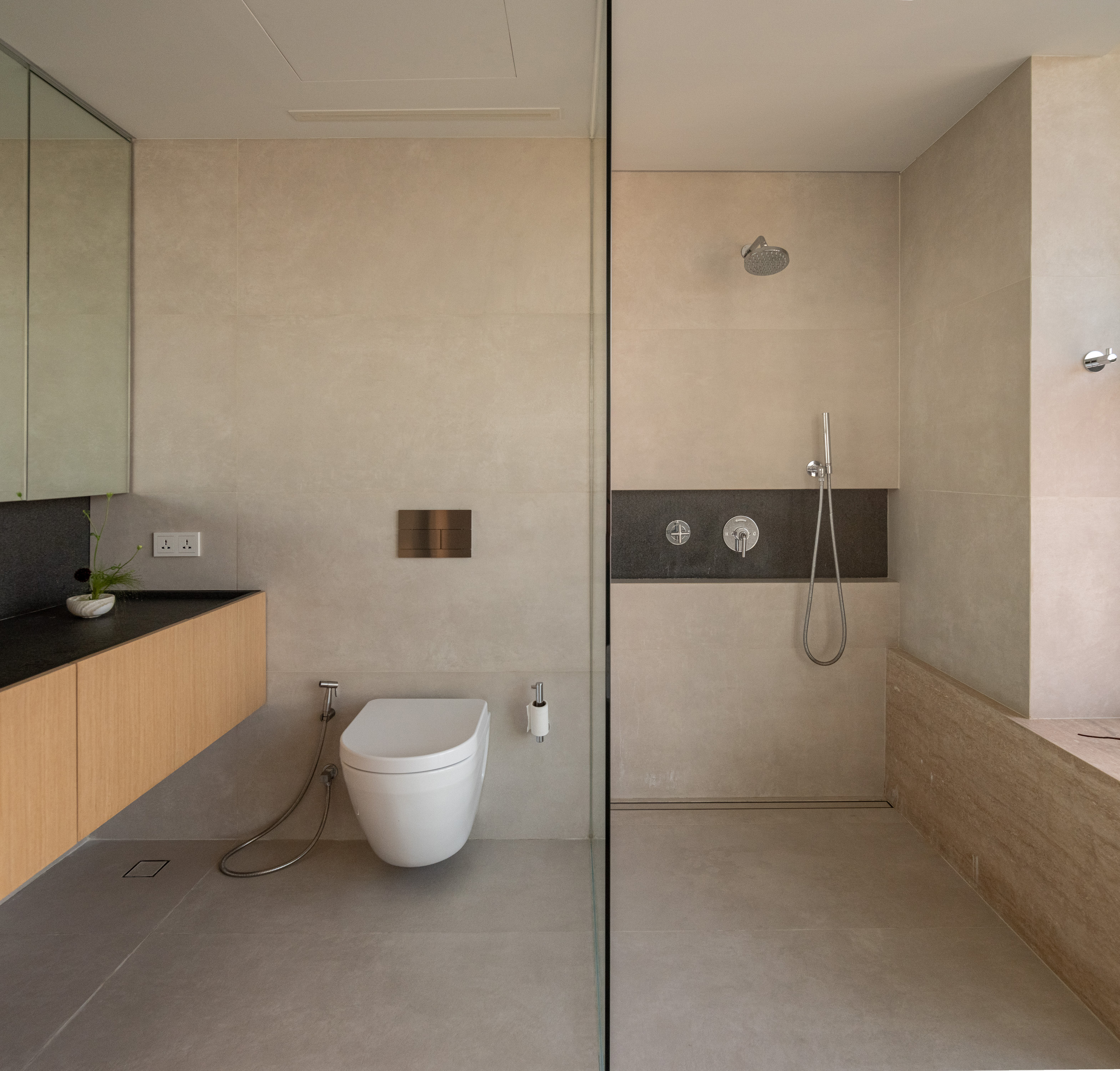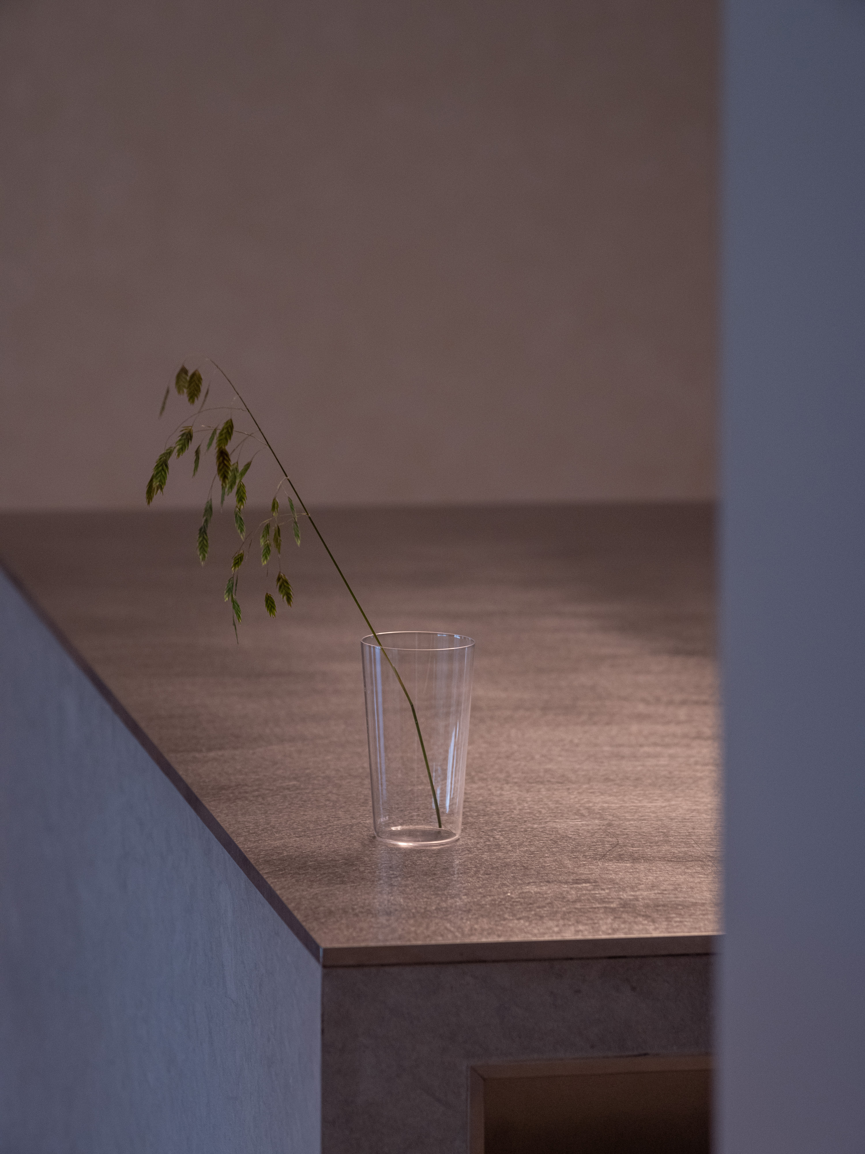 Internally, the design serves as a canvas for the picturesque outdoor vistas, employing muted tones of gray and soft beige. The entryway welcomes occupants with veneer wood accents, instilling a cozy ambiance. In the kitchen, a limestone countertop harmonizes with a sizable stainless-steel slab, stylishly blending different textured materials in gray hues. Large-format materials are intentionally selected elsewhere to maintain a clean aesthetic, such as the teak-wood table atop stainless-steel legs and the expansive stone panels framing the television, drawing all attention towards the captivating outdoor scenery.