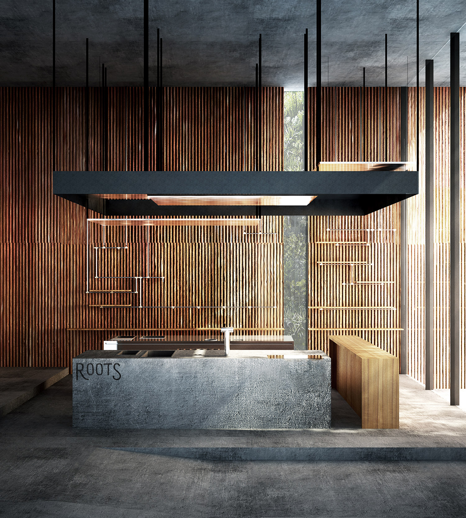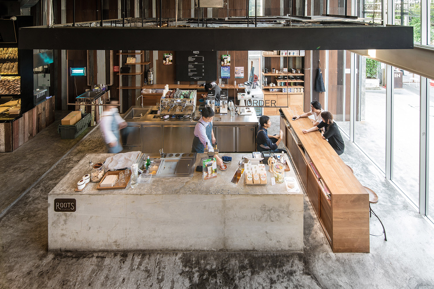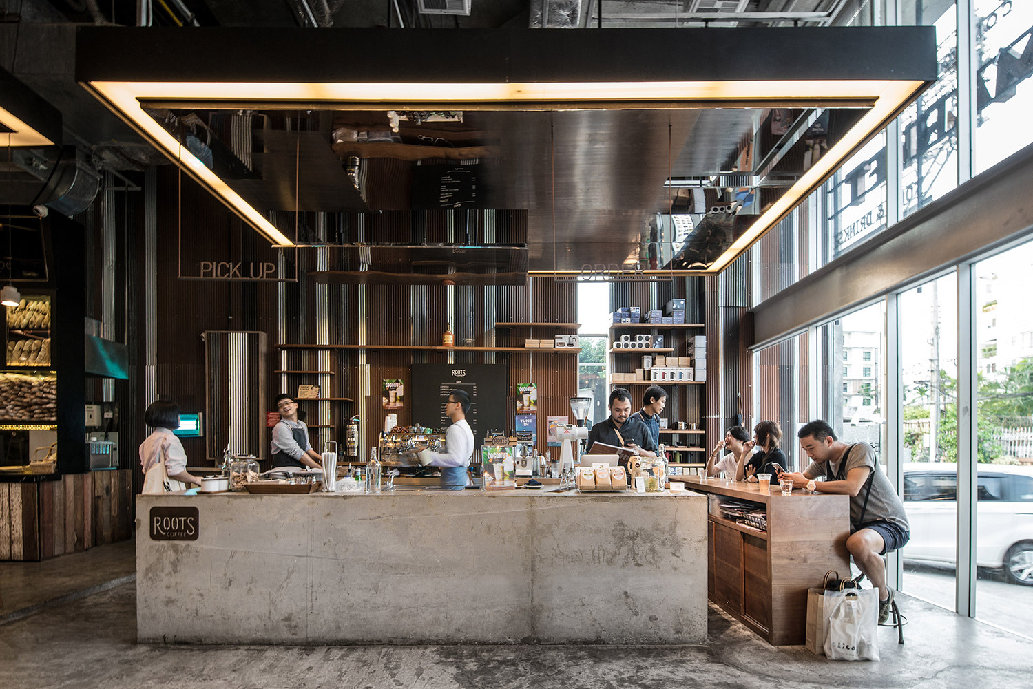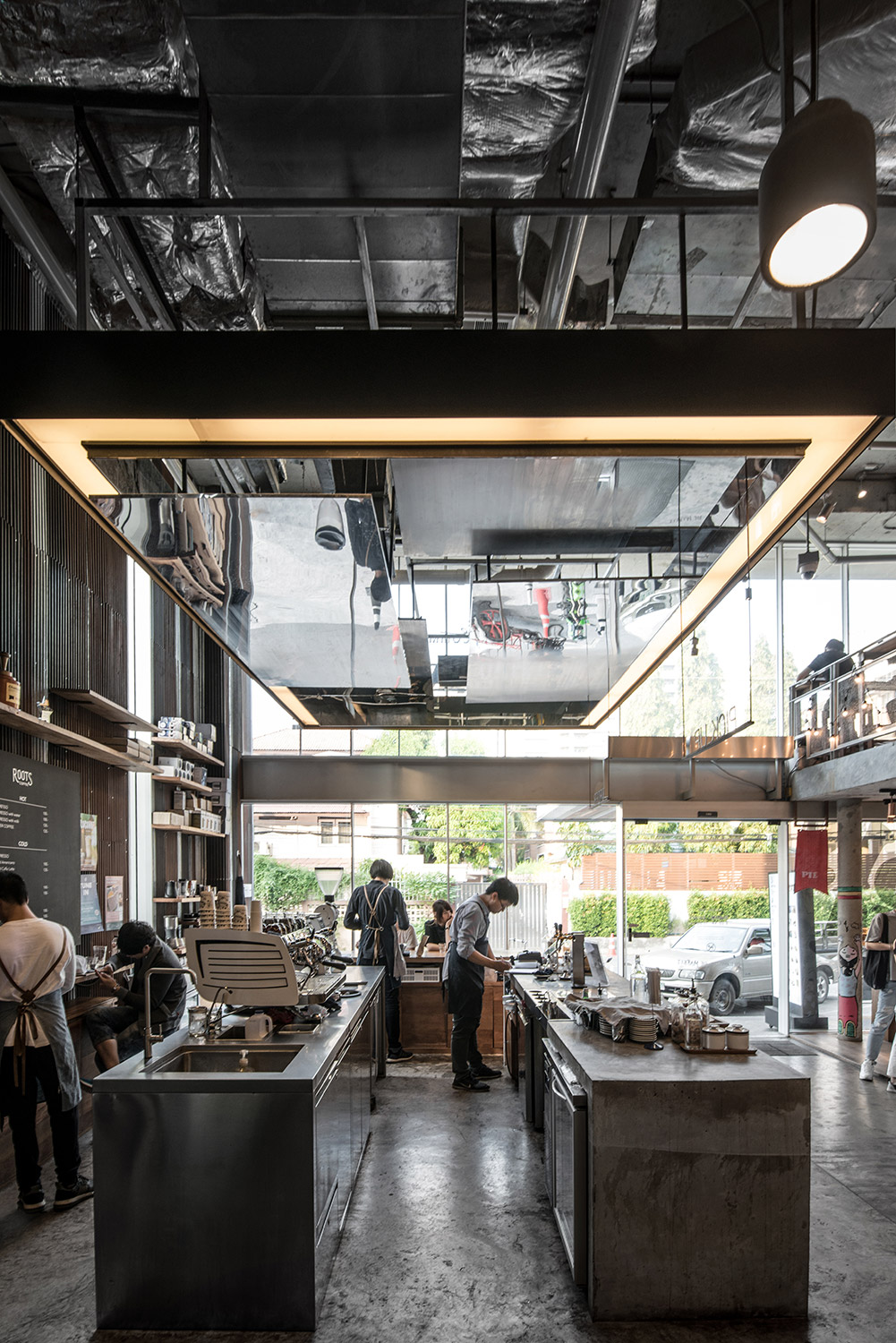 ROOTS began as a coffee roaster and a small weekend café with a special passion in selecting, roasting, and supply coffee beans for cafes and coffee enthusiast. As they expand to open their first full scale cafe at The COMMONS, the team at ROOTS Coffee Roaster wants to share with the customers the complete coffee experience, not only the taste of coffee, but also how each cup was meticulously brewed. The three counters: Cold Brew Bar, Slow/Interaction Bar and Espresso Bar, are designed to use different finishing material, in respond to serve each of their own unique functions. The customer could occupy around every counter while sharing an intimate face-time observing baristas and be involved through the coffee making process. Moreover, stainless steel panels hanging from above acts like a mirror, reflecting the movements and gestures of the barista, allowing the customers to observe them from every angle.
