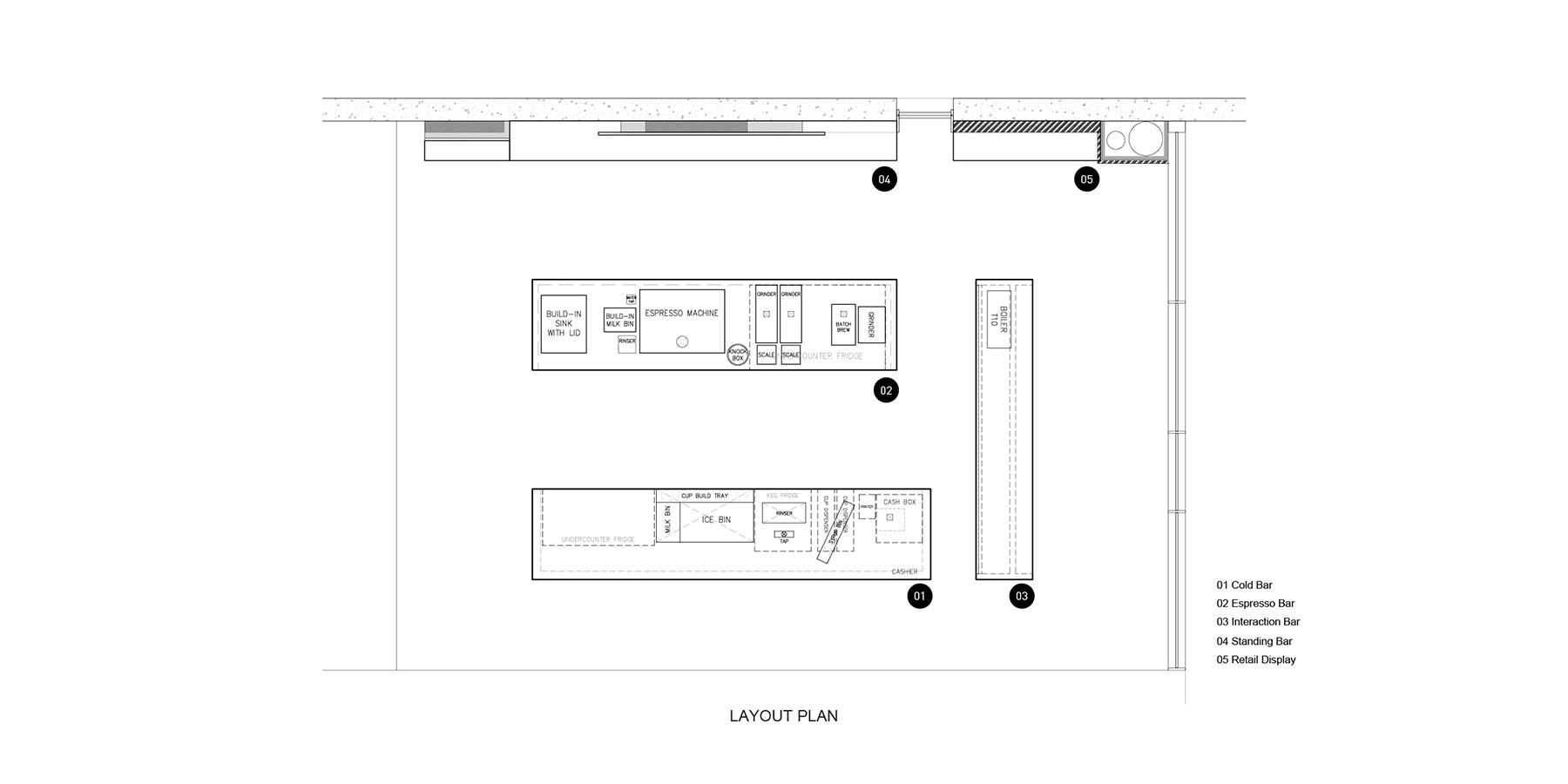 To differentiate three counters each with a unique look and function, different finishing and material are selected to best suits each bar’s usage; Polished concrete Cold Bar is easy for maintenance, stainless steel counter of heavily used Hot Bar, and the warm and calm wooden Slow/Interaction Bar.