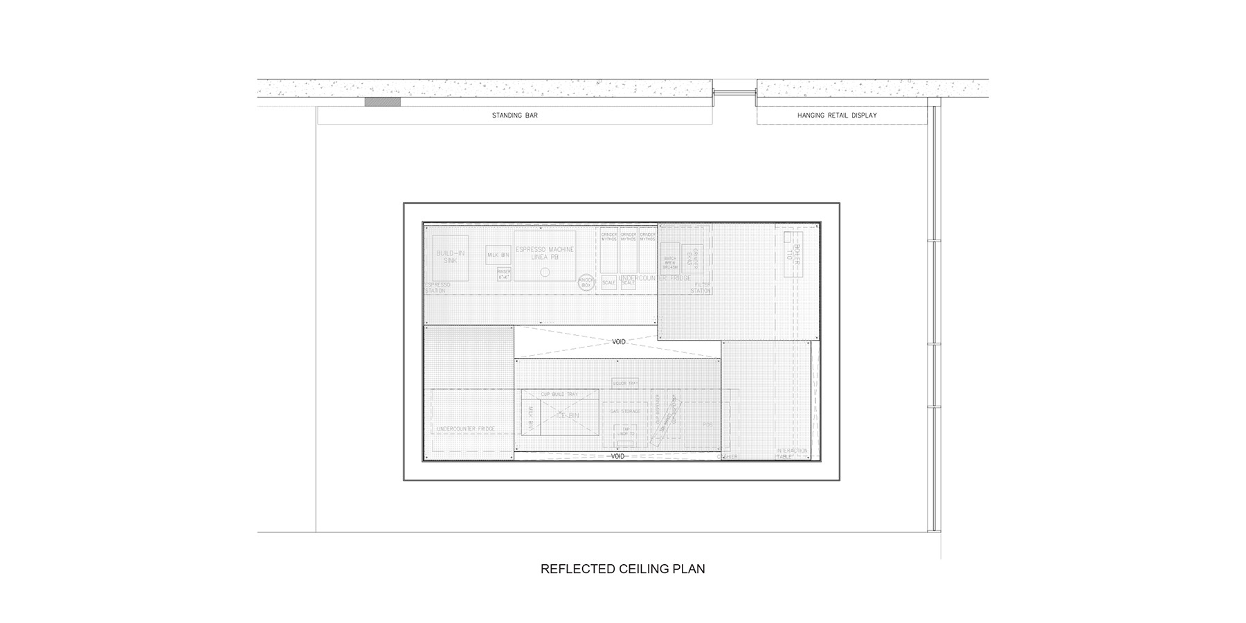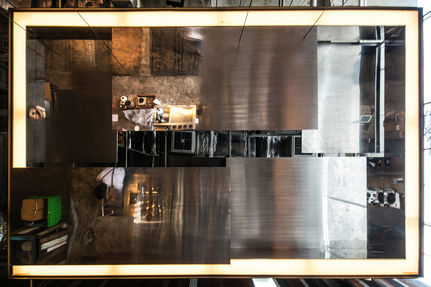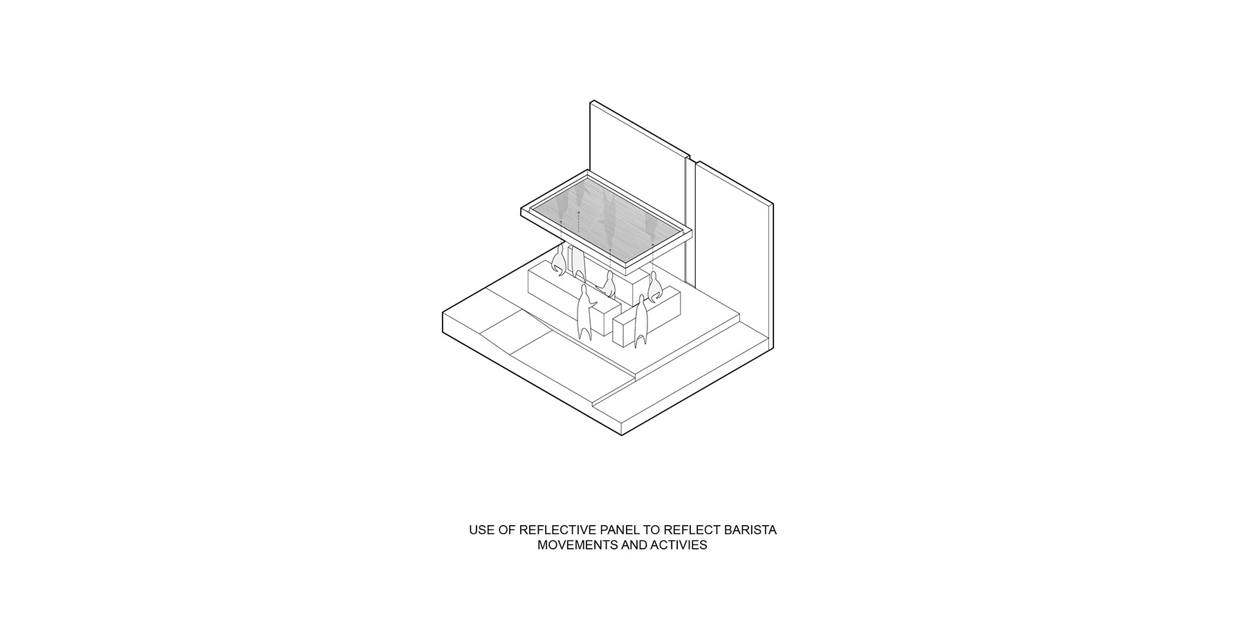 The reflective panel hanging from the ceiling gives the customers the ability to observe the barista from a top view. Most of the stainless steel panels are brushed, with selected parts left reflective so the reflection could better focus on baristas’ work process. By doing so, not only could the customers interact observing the baristas’ movement face-to-face, but also see the coffee making process from an unconventional viewpoint.