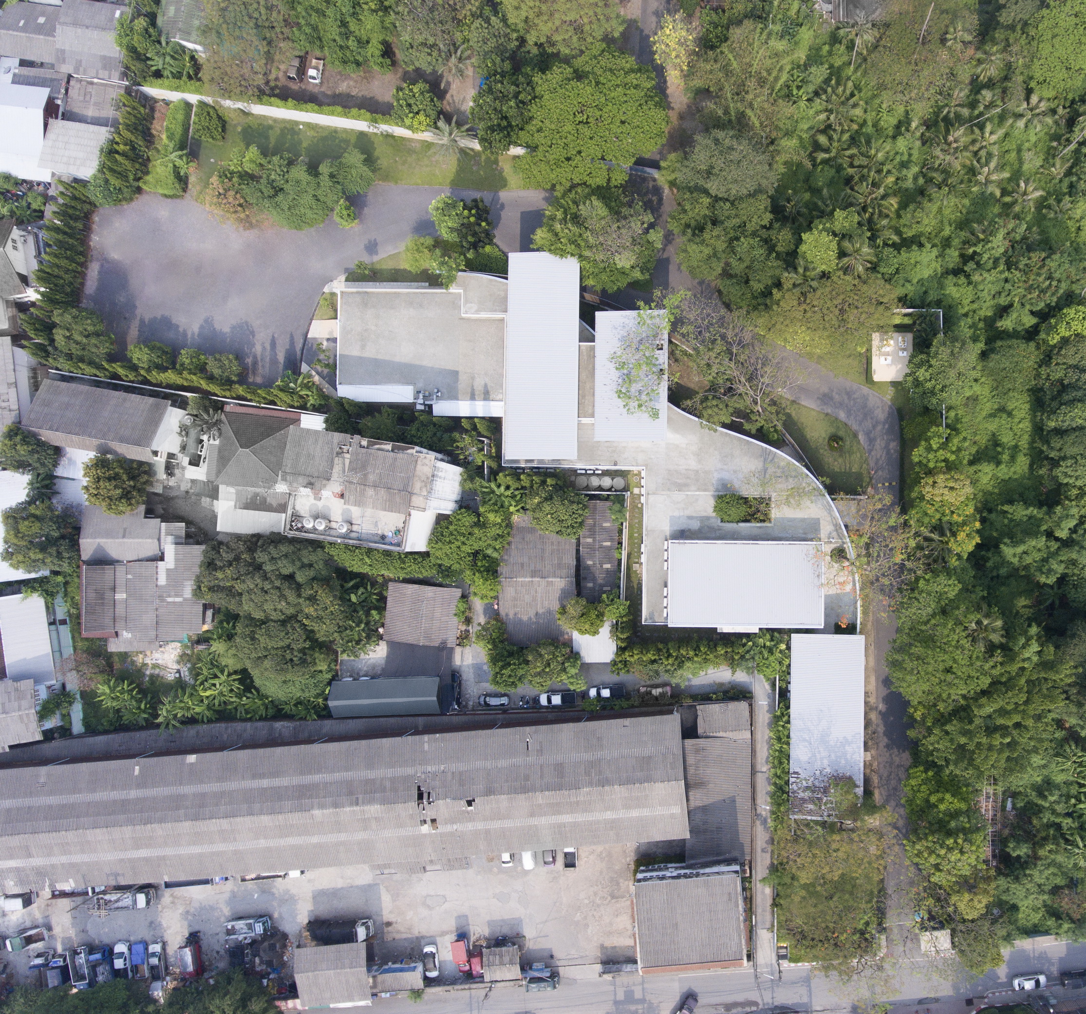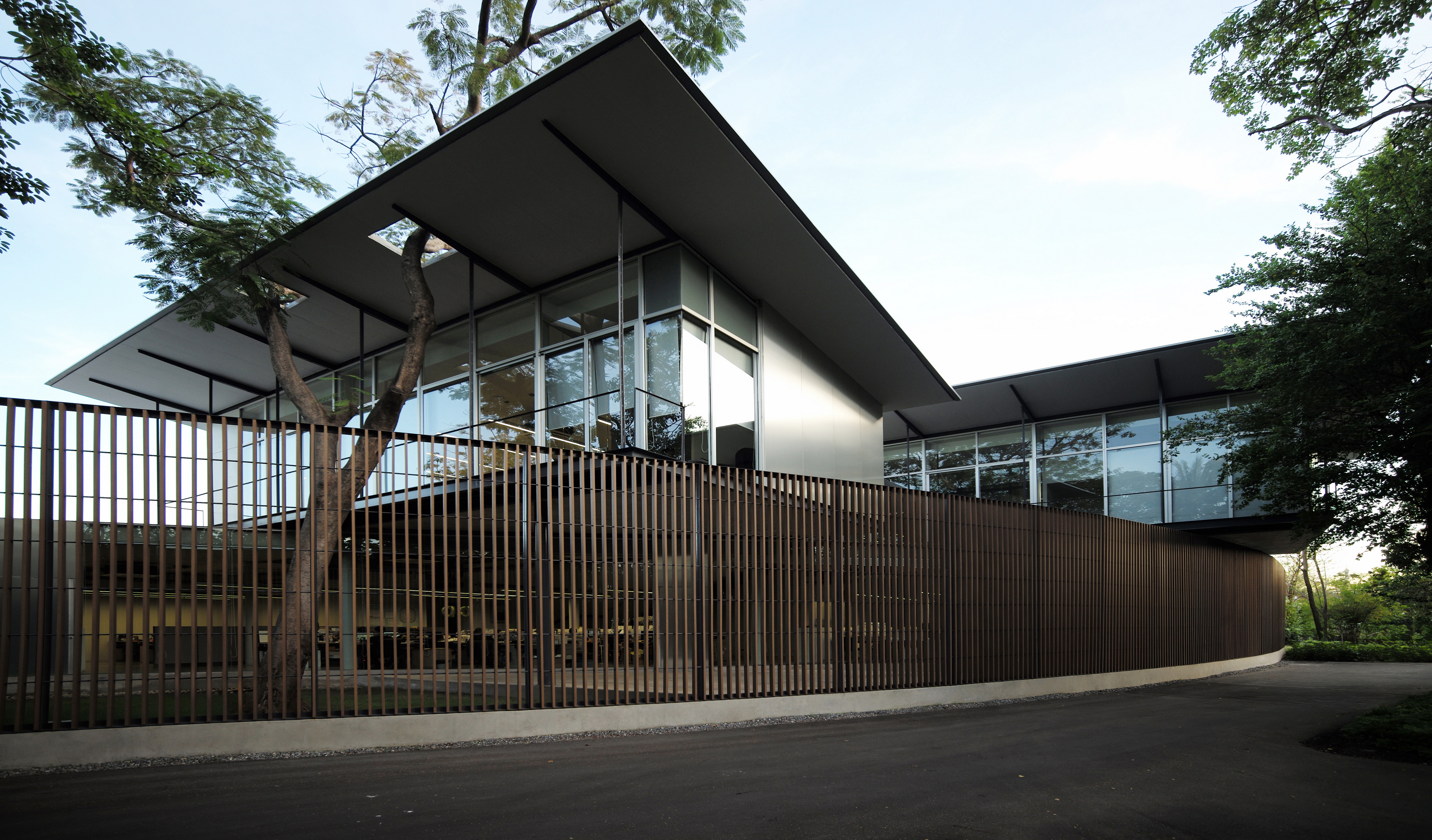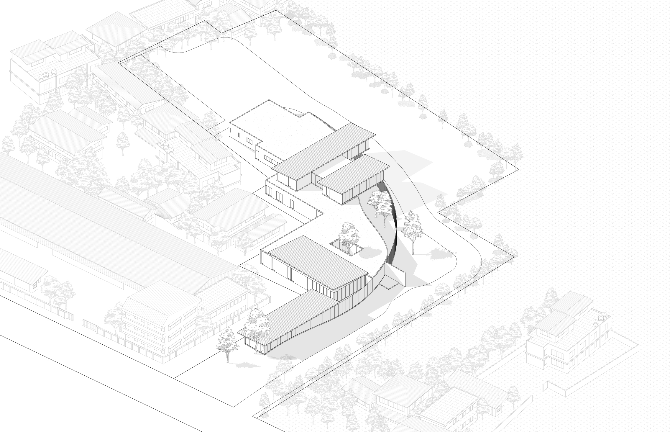 Both the café and watch clinic is placed at the smaller front entrance for the ease of access by  visitors while the offices are located further into the larger open spaces towards the back. Due to the shape of the site, the placement of programs had become a compact and continuous strip on one side maintaining the openness and views from the private road on the other. The walls of the entrance leading to each main function such as the watch café and the offices are casted in concrete, acting as both a guide and an axis towards the interiors. Therefore, the curve facade sweeps through the site, creating a smooth entrance sequence to all functions of the site. The negative spaces between the curve façade and the mass of the program within it became open private courtyards for the office and boundaries for large trees that were preserved.