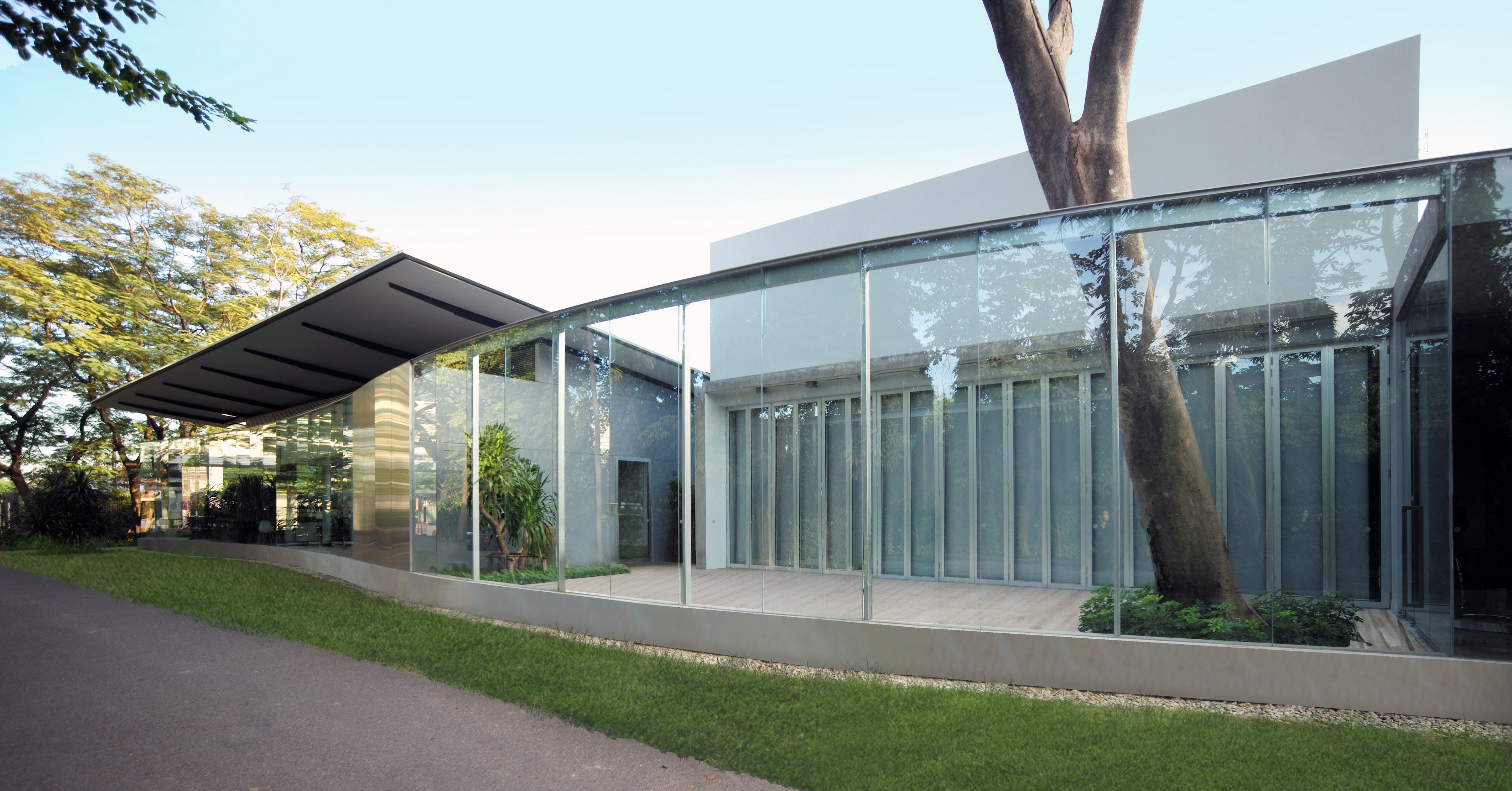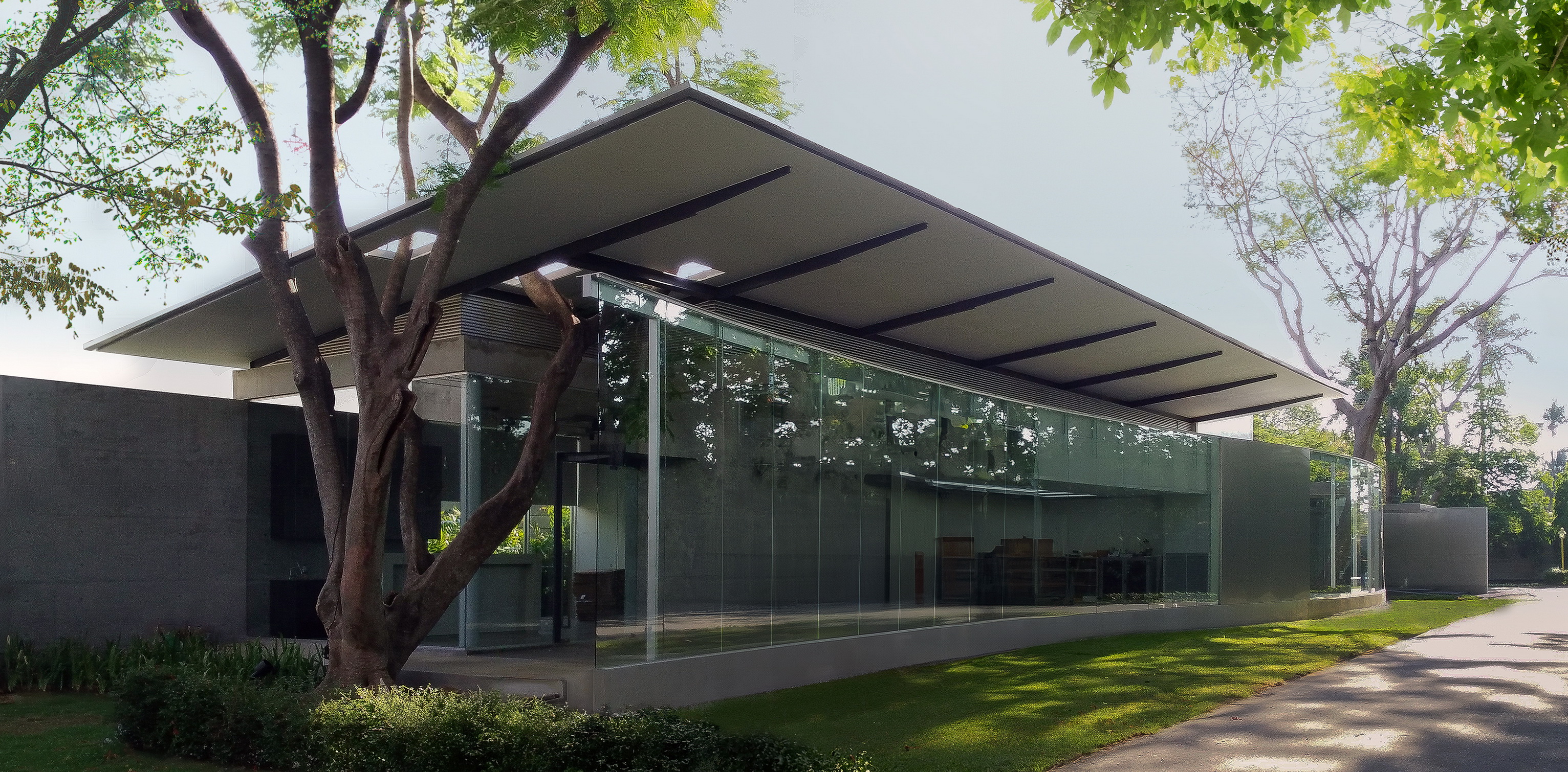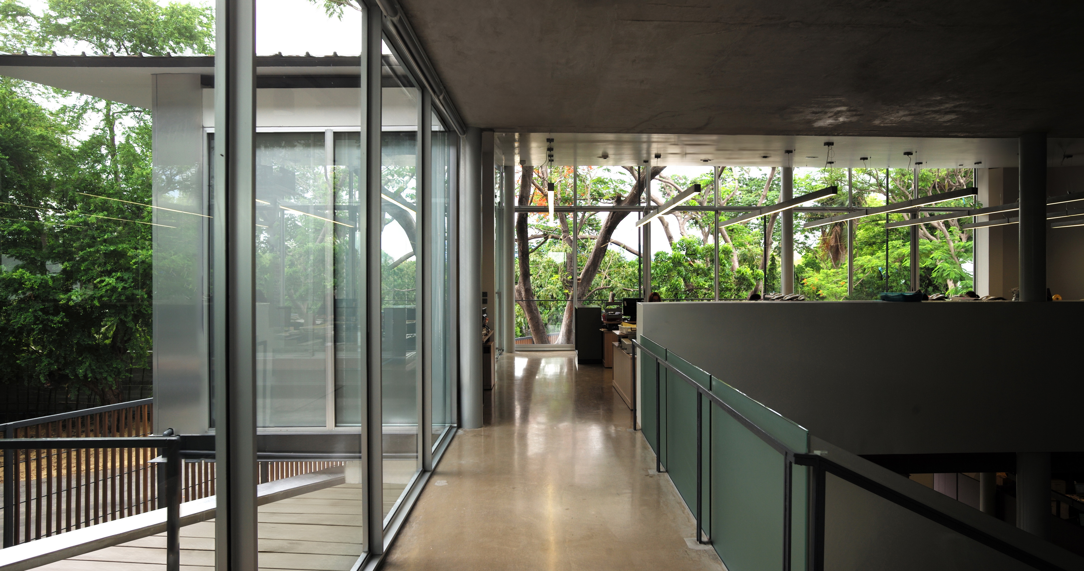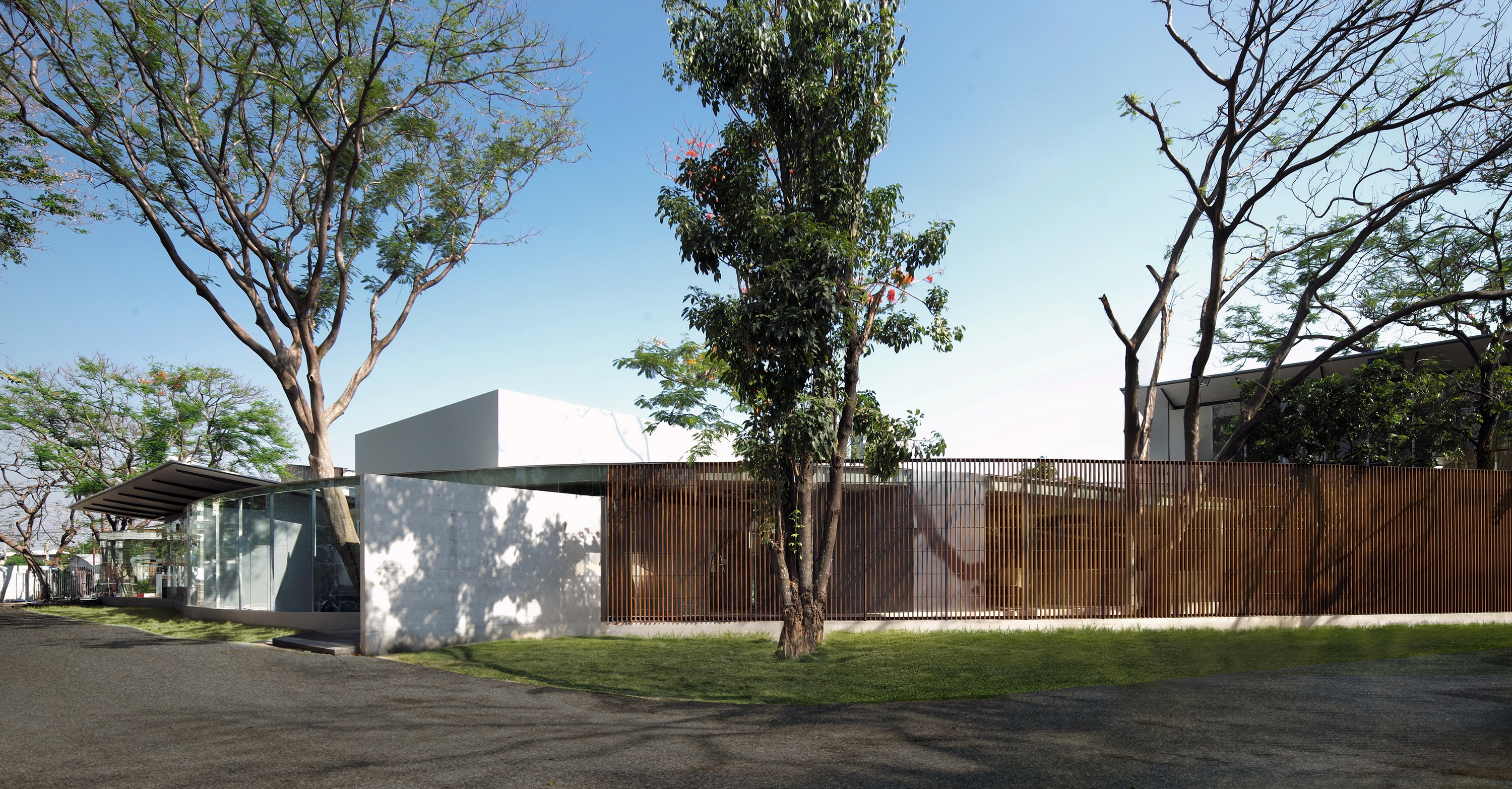 Both the café and watch clinic is placed at the smaller front entrance for the ease of access by  visitors while the offices are located further into the larger open spaces towards the back. Due to the shape of the site, the placement of programs had become a compact and continuous strip on one side maintaining the openness and views from the private road on the other. The walls of the entrance leading to each main function such as the watch café and the offices are casted in concrete, acting as both a guide and an axis towards the interiors. Therefore, the curve facade sweeps through the site, creating a smooth entrance sequence to all functions of the site. The negative spaces between the curve façade and the mass of the program within it became open private courtyards for the office and boundaries for large trees that were preserved.