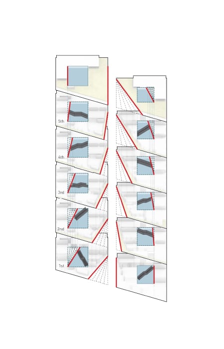 111 proposes a unique working environment integrating concepts of inspiration, collaboration, wellness and community within the office typology. In accordance with building regulations and zoning restrictions, the built area of the 20,000 square meters is bisected into two buildings with a spacious outdoor public plaza between the two masses. With its sheared form and a slash-cut that seemingly opens and separates the volumes into two, the plaza is sheltered by the 20-meter cantilevered mass that provides shade to this public multi-functional gathering space.