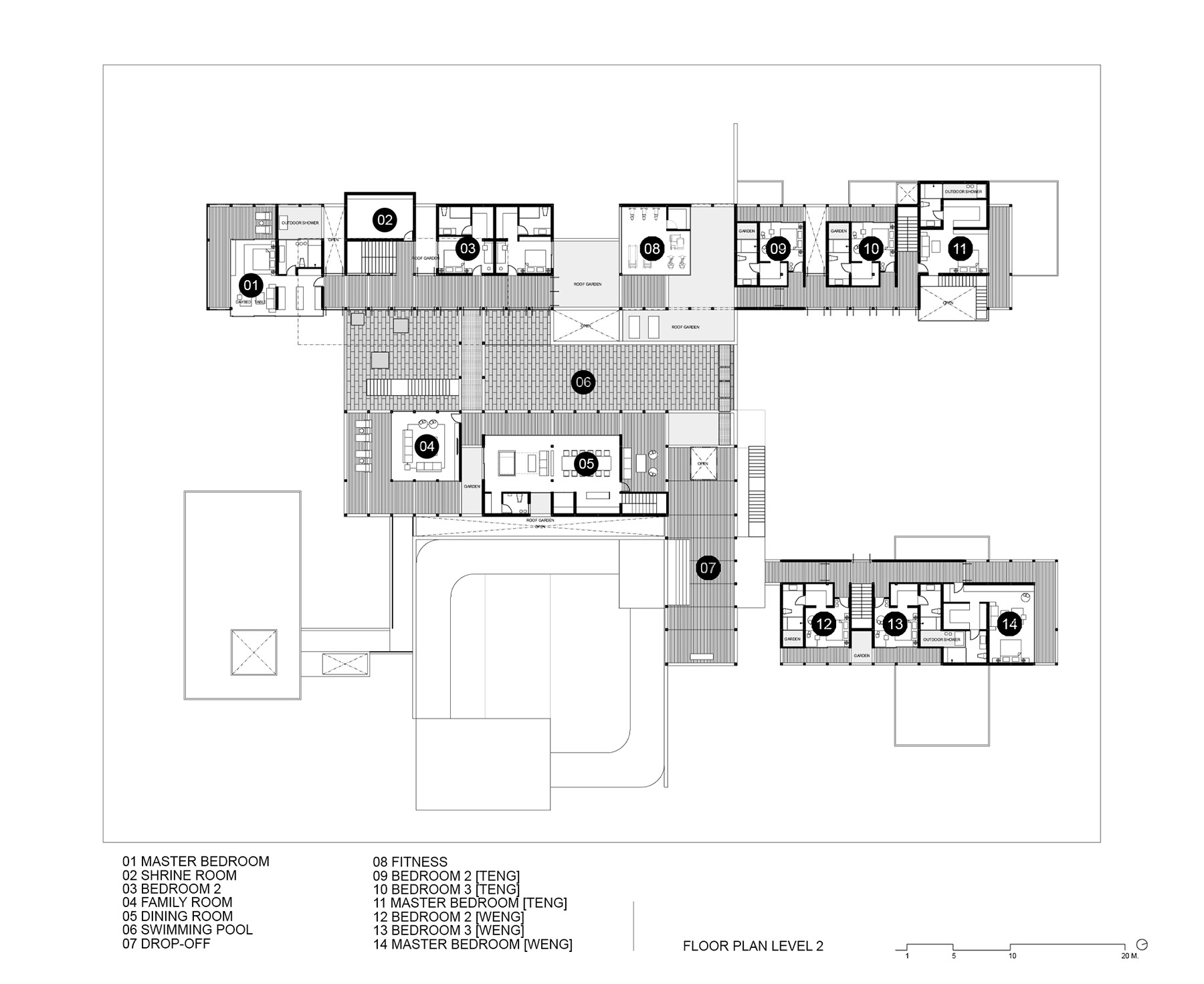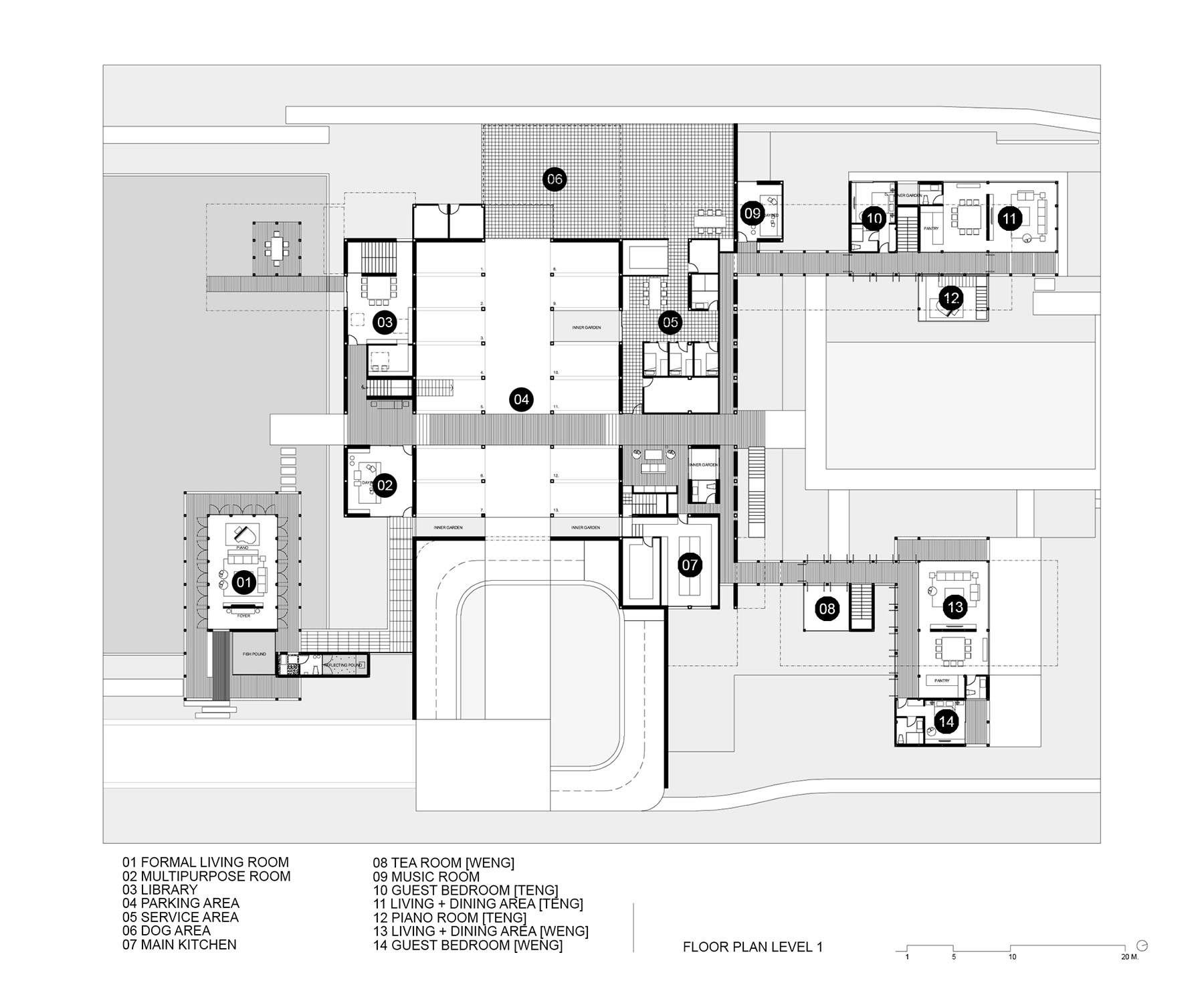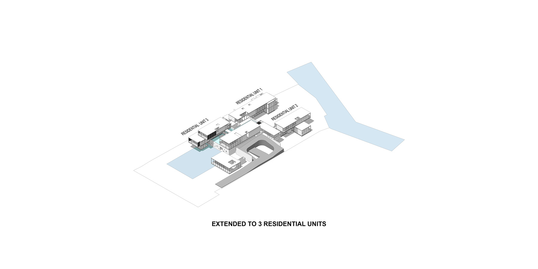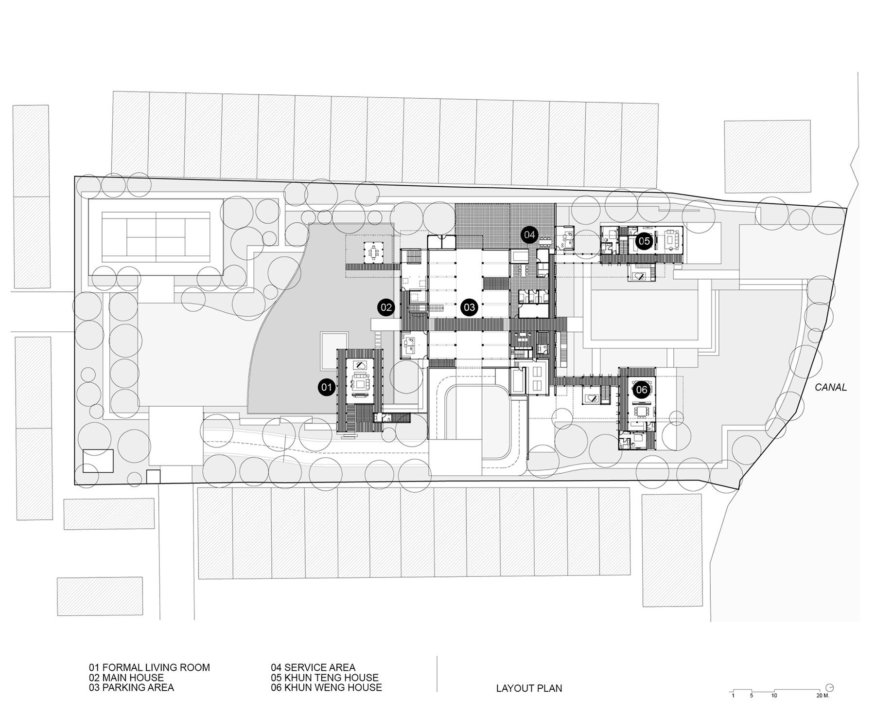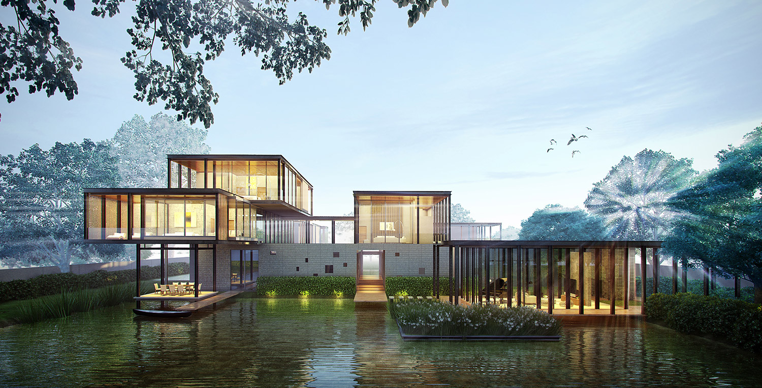 The compound house of three families is sited beside the canal of the Ratchapruek section of Bangkok. The project was designed as a steel skeleton structure that houses and frames several complex functions and spaces together in five pavilions, where two at the back are for sons’ expanded families. Three main pavilions; one for entry and living spaces, one residence, and one guest house, appear to push upward from the parking and service functions below. Two sheets of water; swimming pool above and reflecting pond below, create a floating expression of the pavilions.