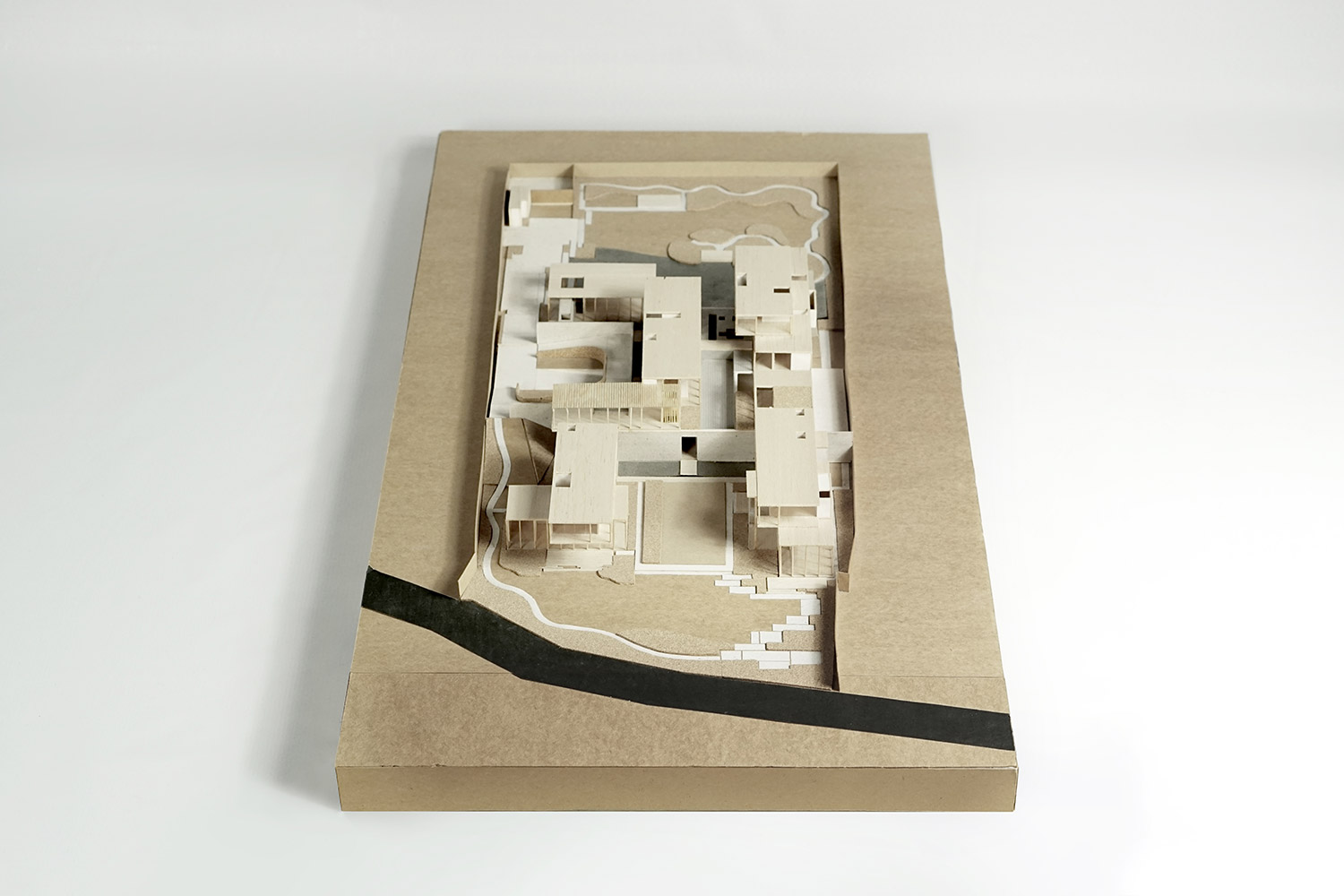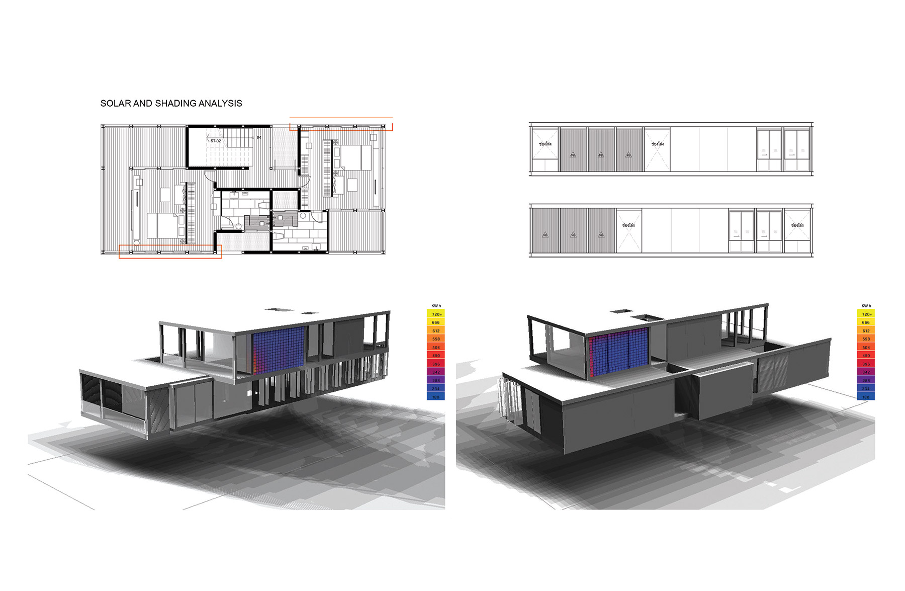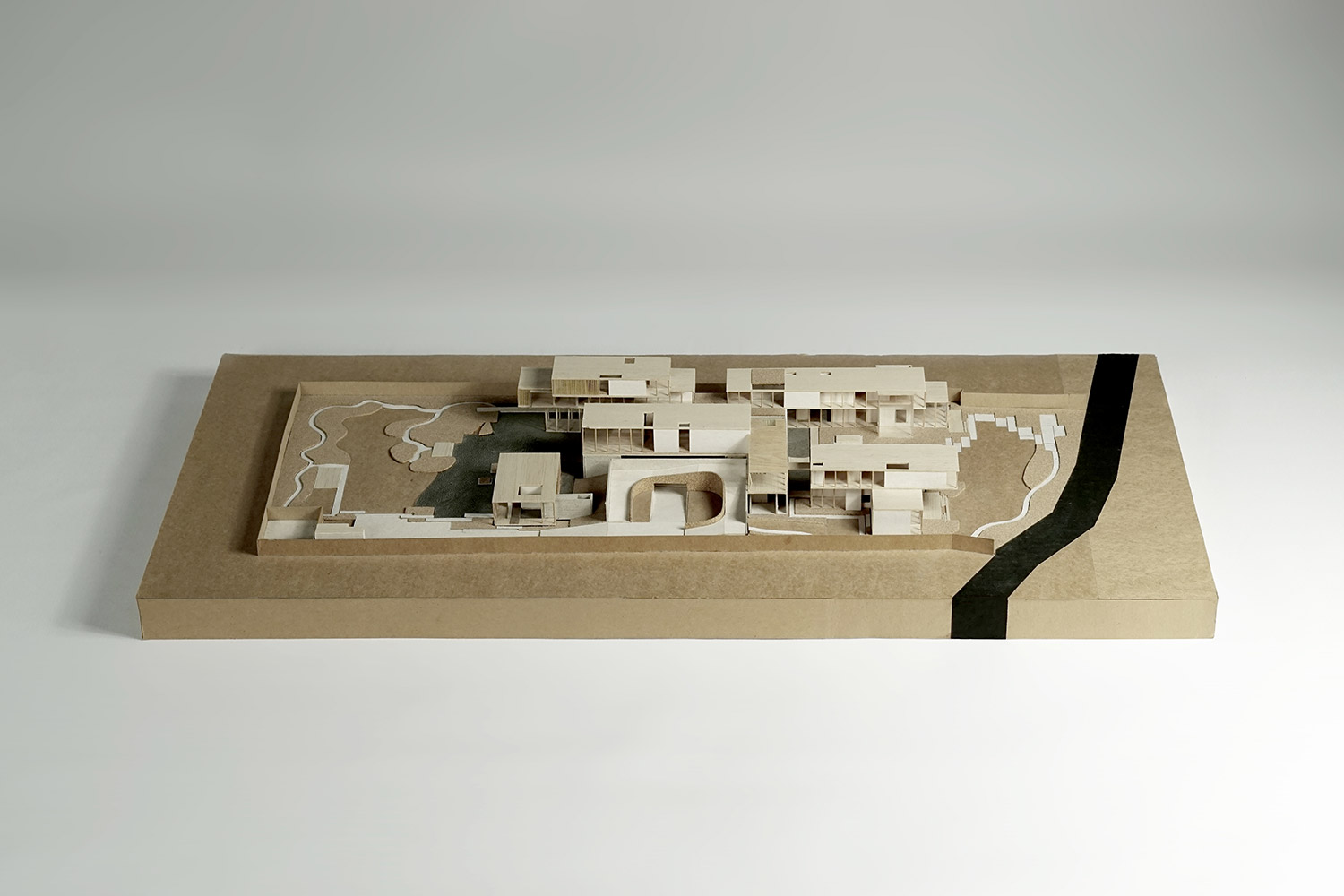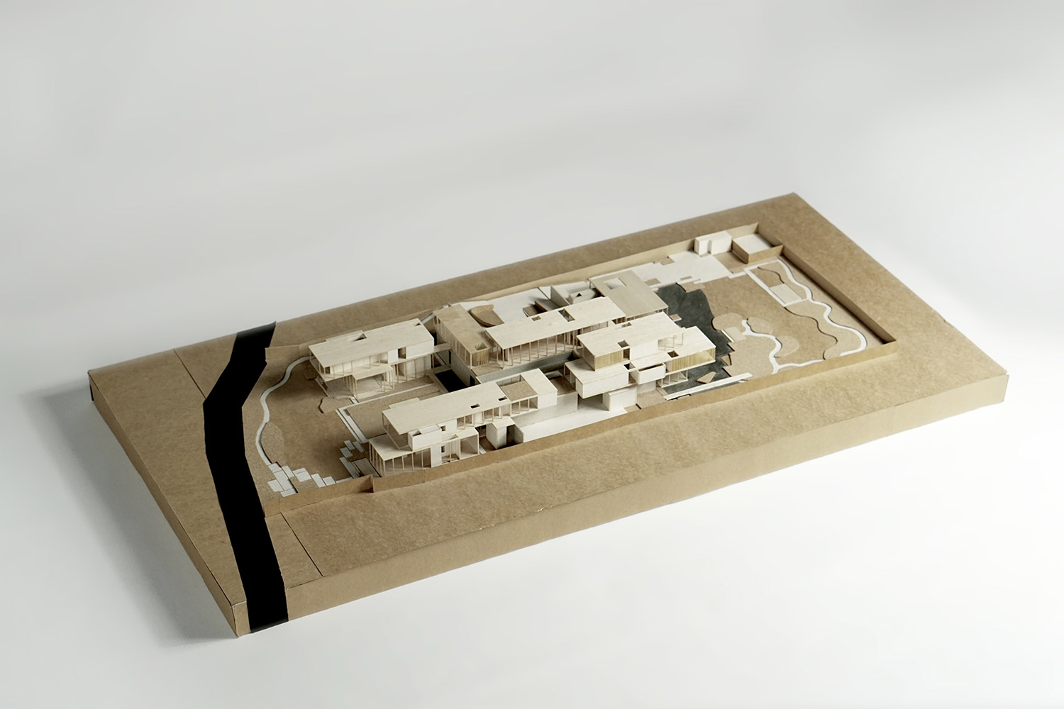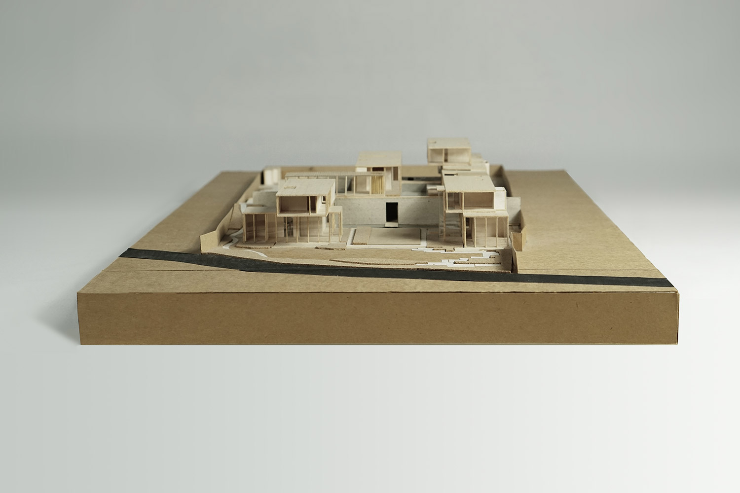 The compound house of three families is sited beside the canal of the Ratchapruek section of Bangkok. The project was designed as a steel skeleton structure that houses and frames several complex functions and spaces together in five pavilions, where two at the back are for sons’ expanded families. Three main pavilions; one for entry and living spaces, one residence, and one guest house, appear to push upward from the parking and service functions below. Two sheets of water; swimming pool above and reflecting pond below, create a floating expression of the pavilions.