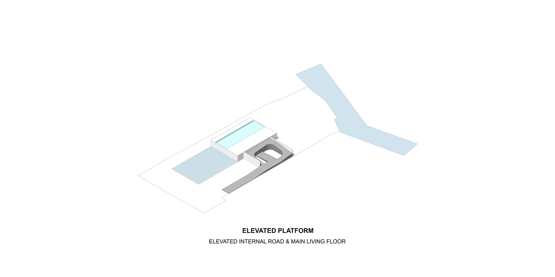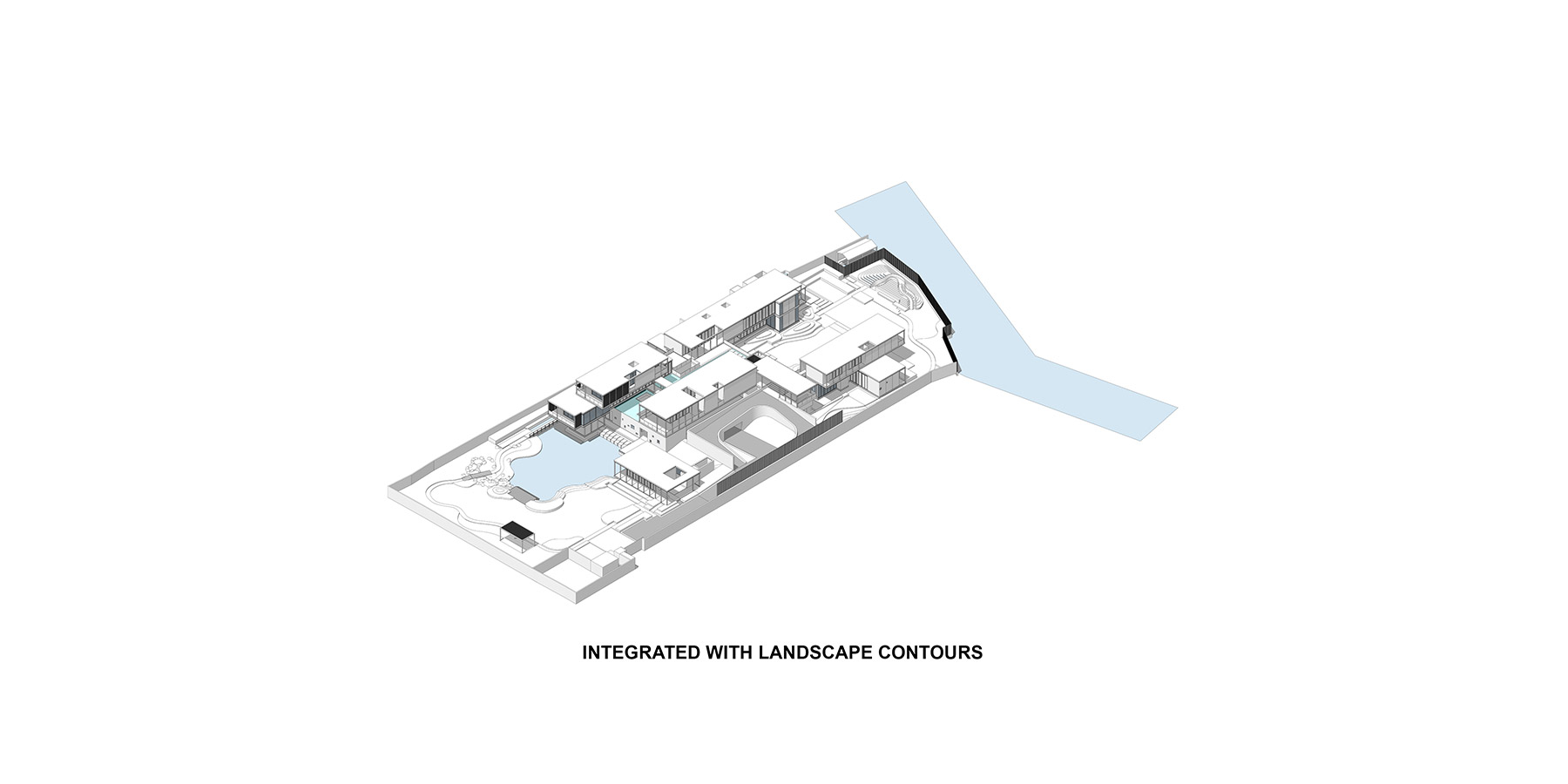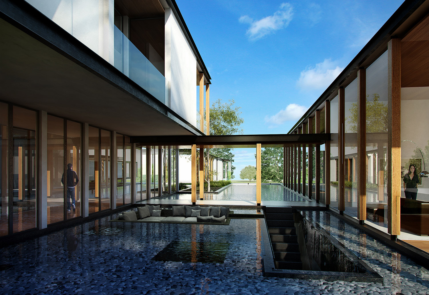 Views from within the living spaces are framed by the swimming pool, which is bracketed by two wings of the buildings that run perpendicular to the skylight strips. In the base of the swimming pool, strips of glass lenses bring dappled light to the white plaster walls and granite floor of the lobby entrance below.