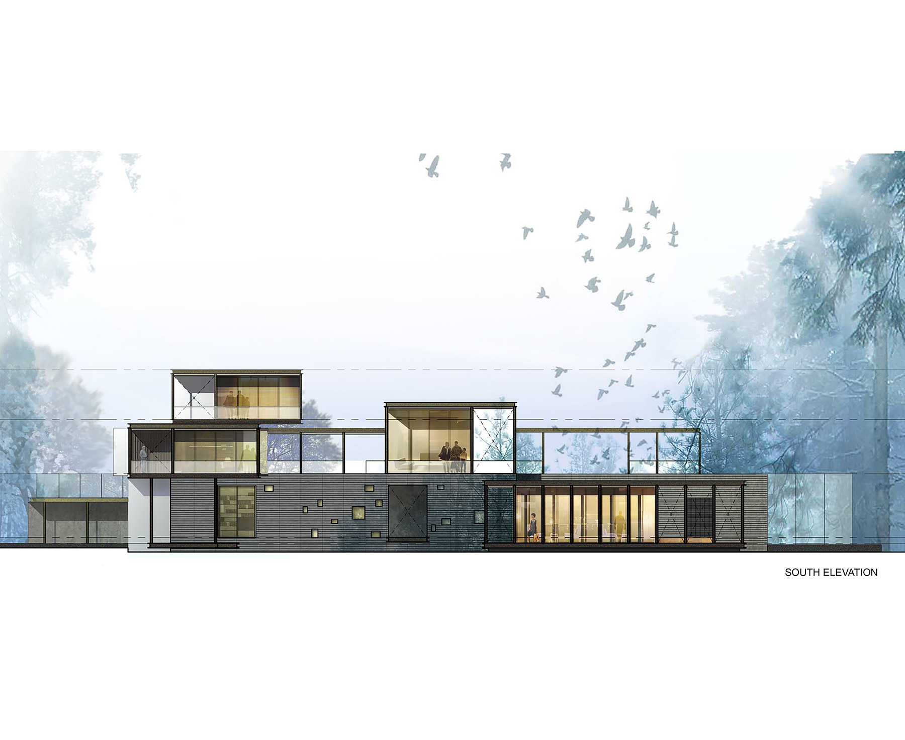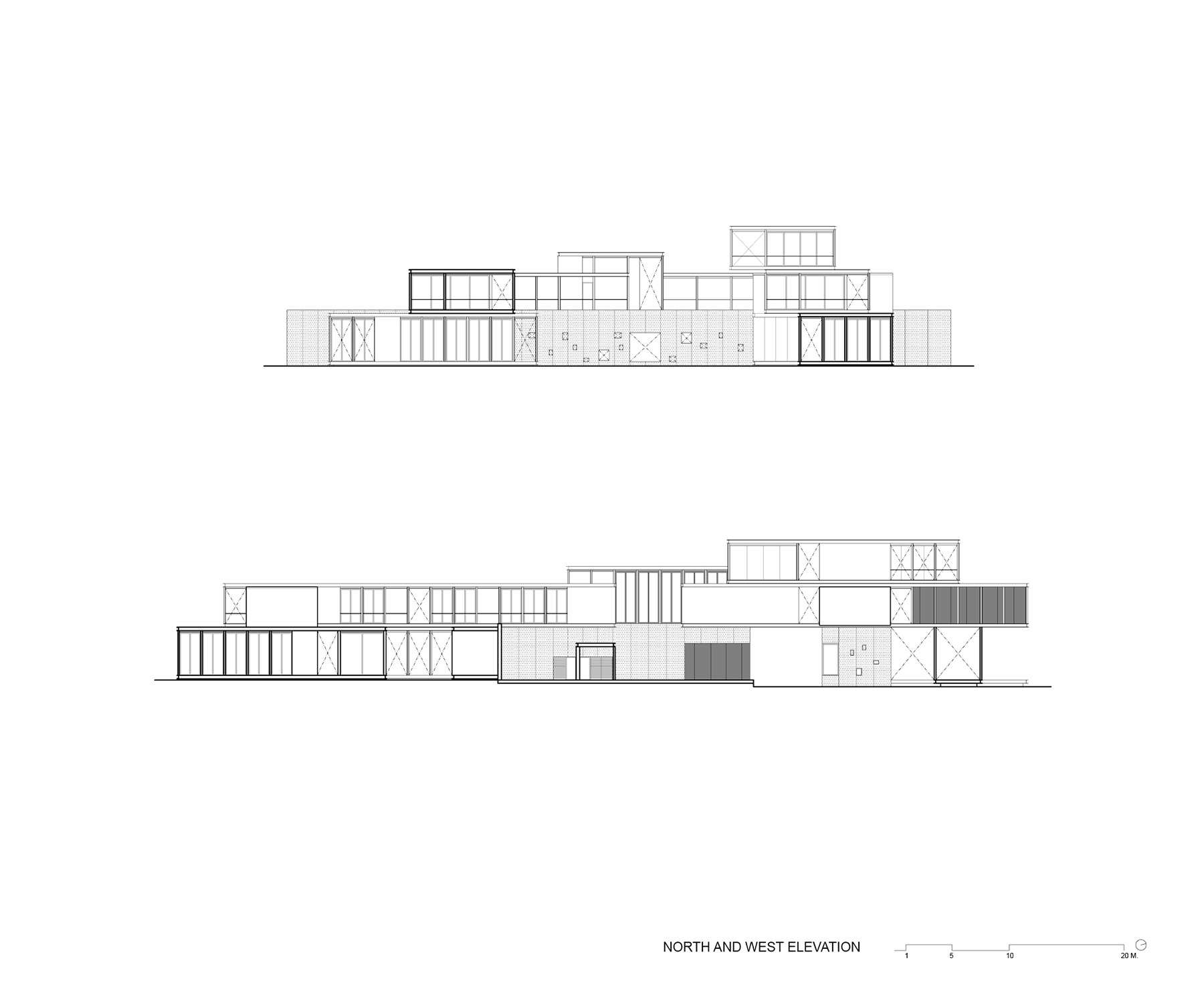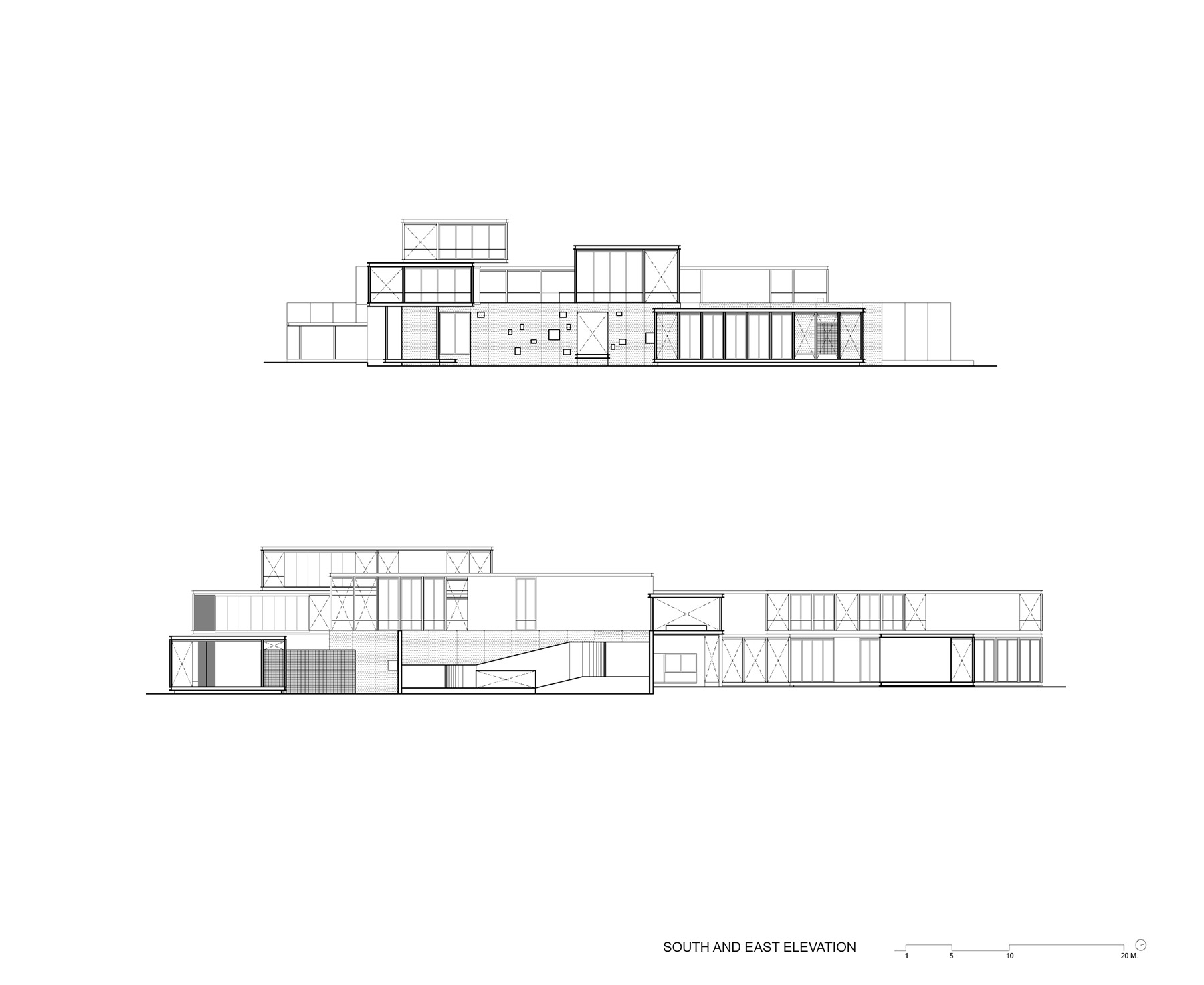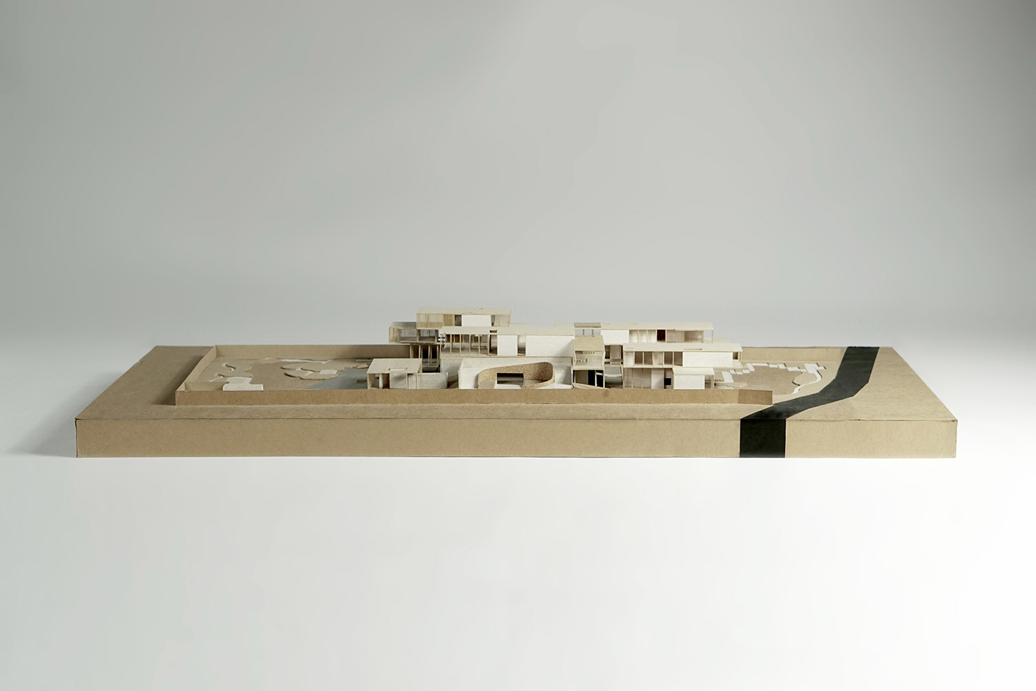 Views from within the living spaces are framed by the swimming pool, which is bracketed by two wings of the buildings that run perpendicular to the skylight strips. In the base of the swimming pool, strips of glass lenses bring dappled light to the white plaster walls and granite floor of the lobby entrance below.