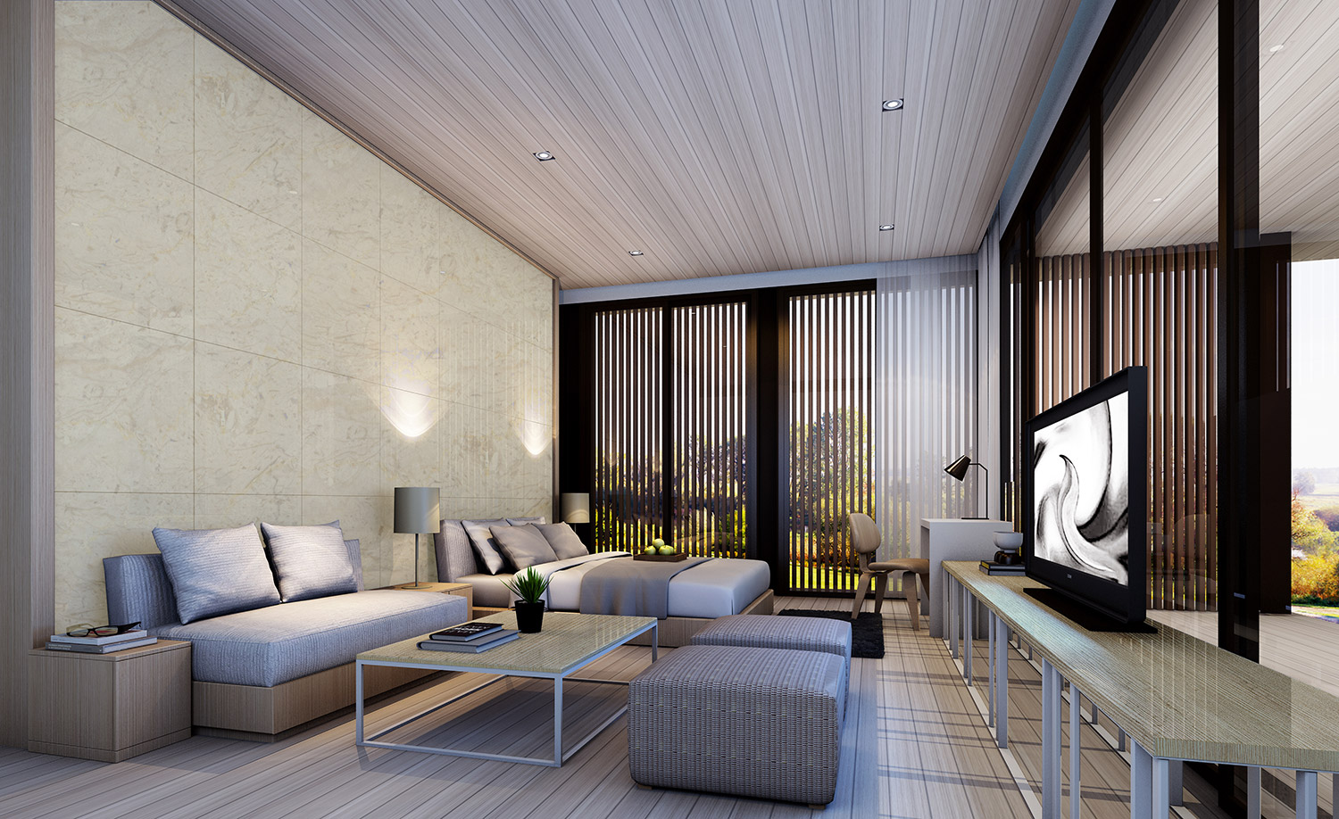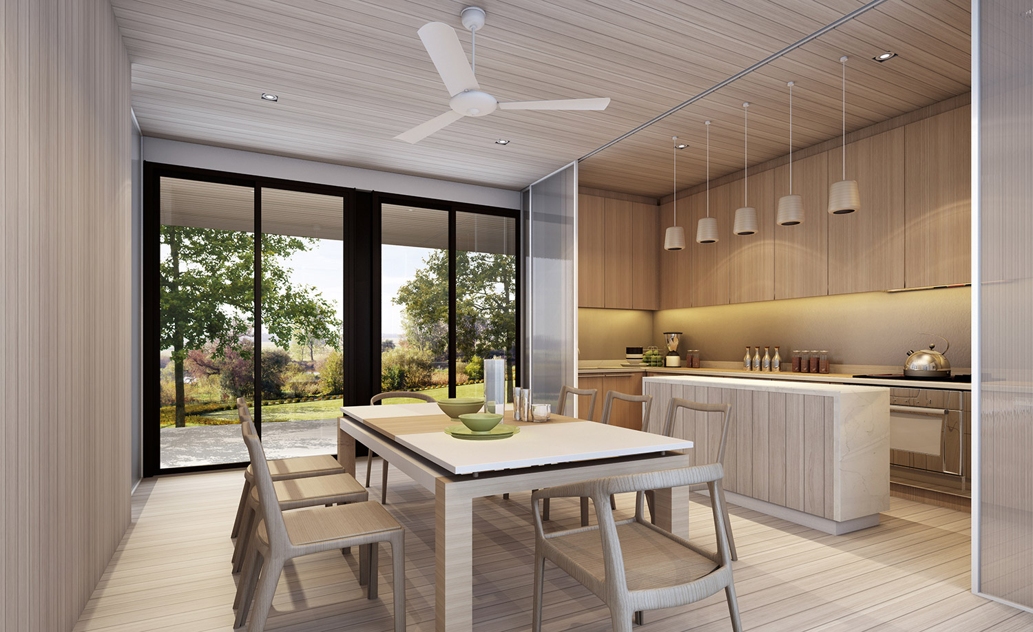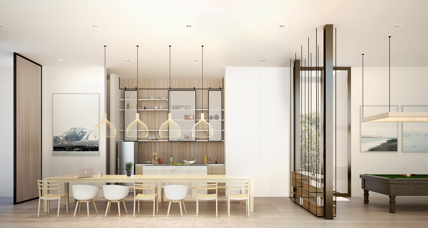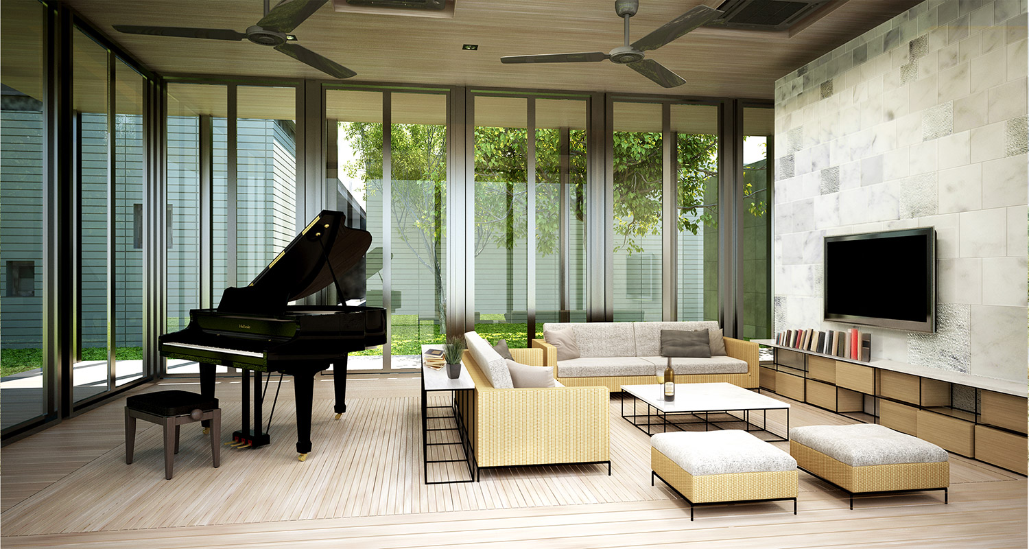To enhance the expansive nature of the villas, sleek steel columns are positioned every 2.5 meters around the perimeter, allowing the space inside to be completely column-less, as the colonnade gives the appearance of being vertical louvers rather than solid structure.