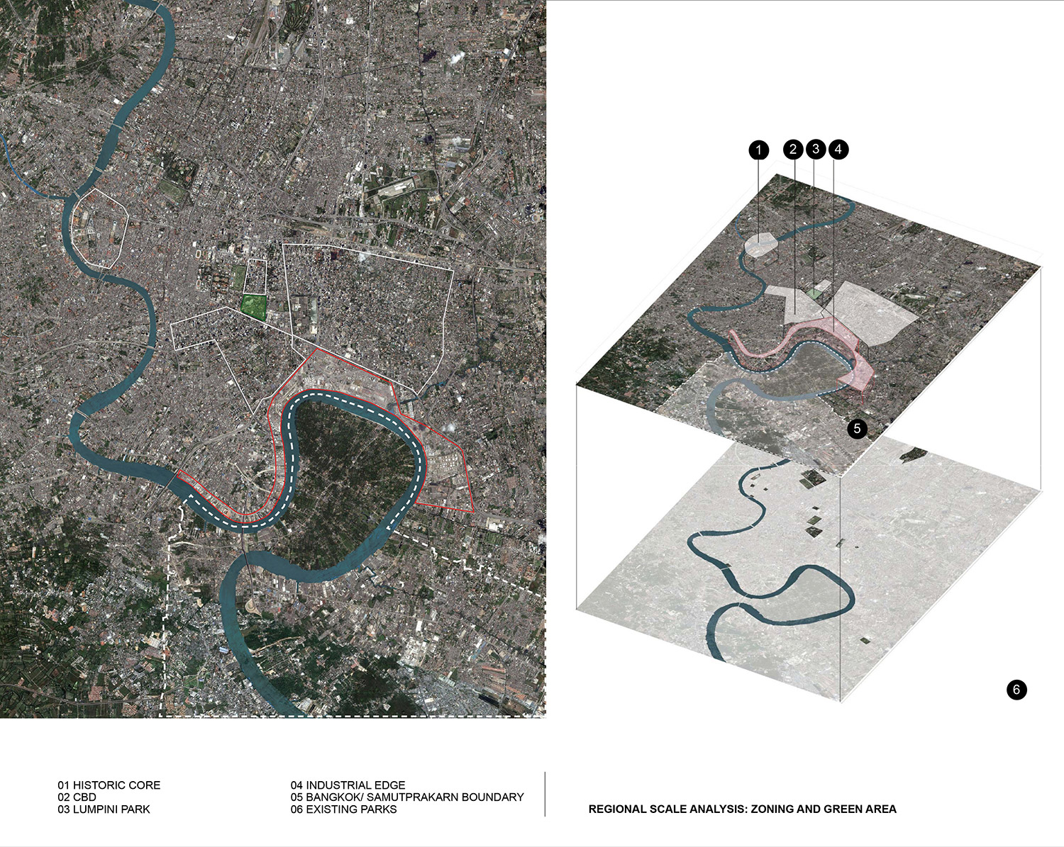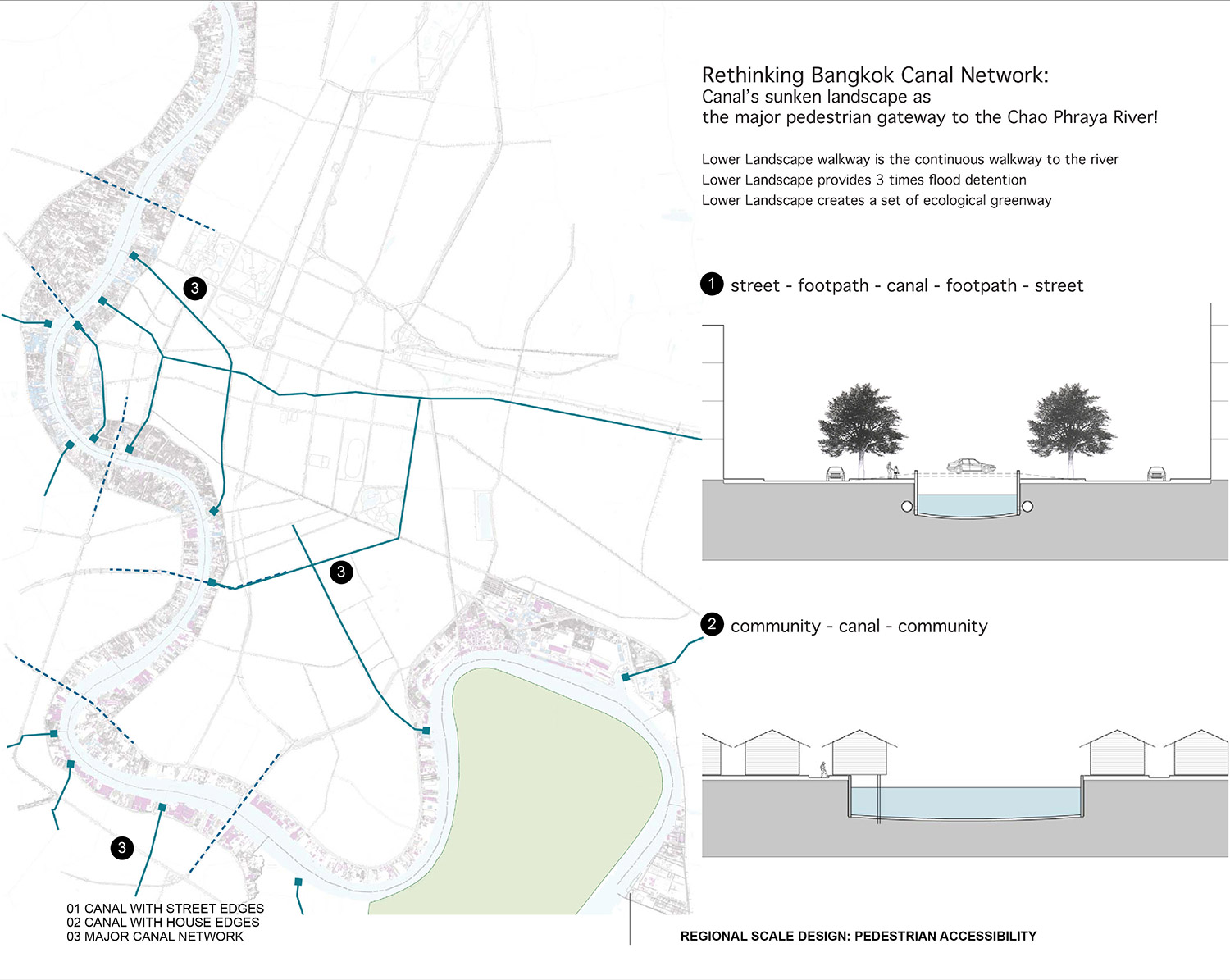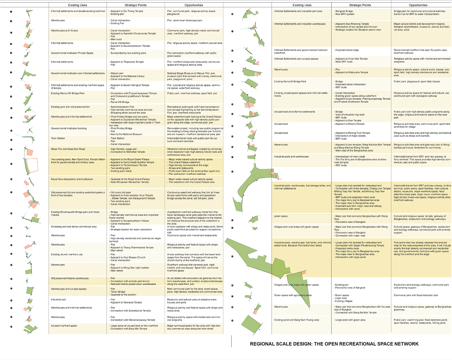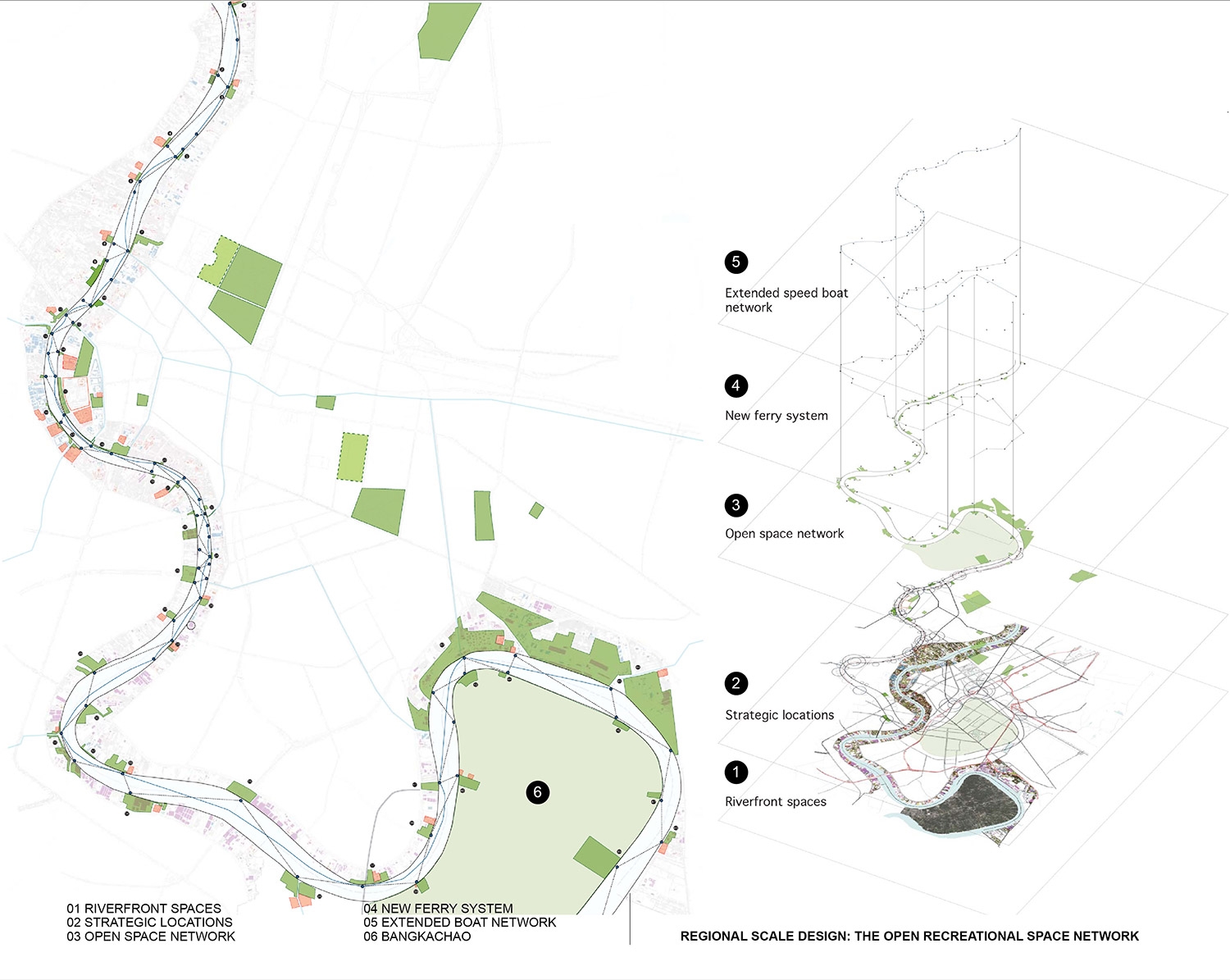 Physically and historically, Bangkok has been shaped by its relationship to the Chao Phraya River and its waterfront. With the advent of industrialization, the focus shifted to the establishment and consolidation of manmade infrastructures such as roads and highways, leaving the waterfronts as large areas of underused land, deteriorated ports, warehouses, and informal settlements. The diminishing public exposure and access to the Chao Phraya River means it is quickly losing its historic role as a valuable asset and resource for the capital. This project proposes the establishment of a green network along the Chao Phraya River by opening up and developing selected underused areas, and connecting them with the new systematic water transportation.