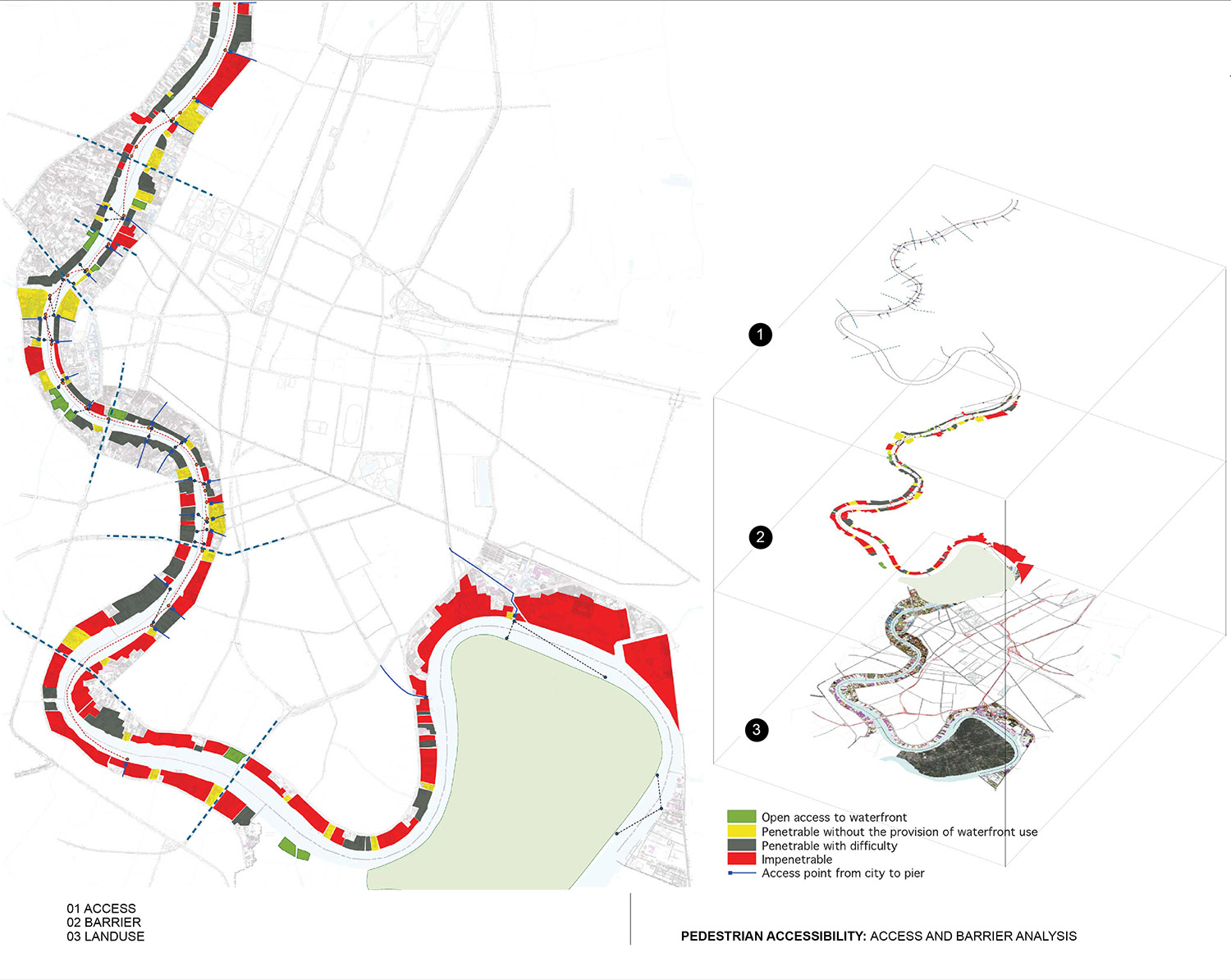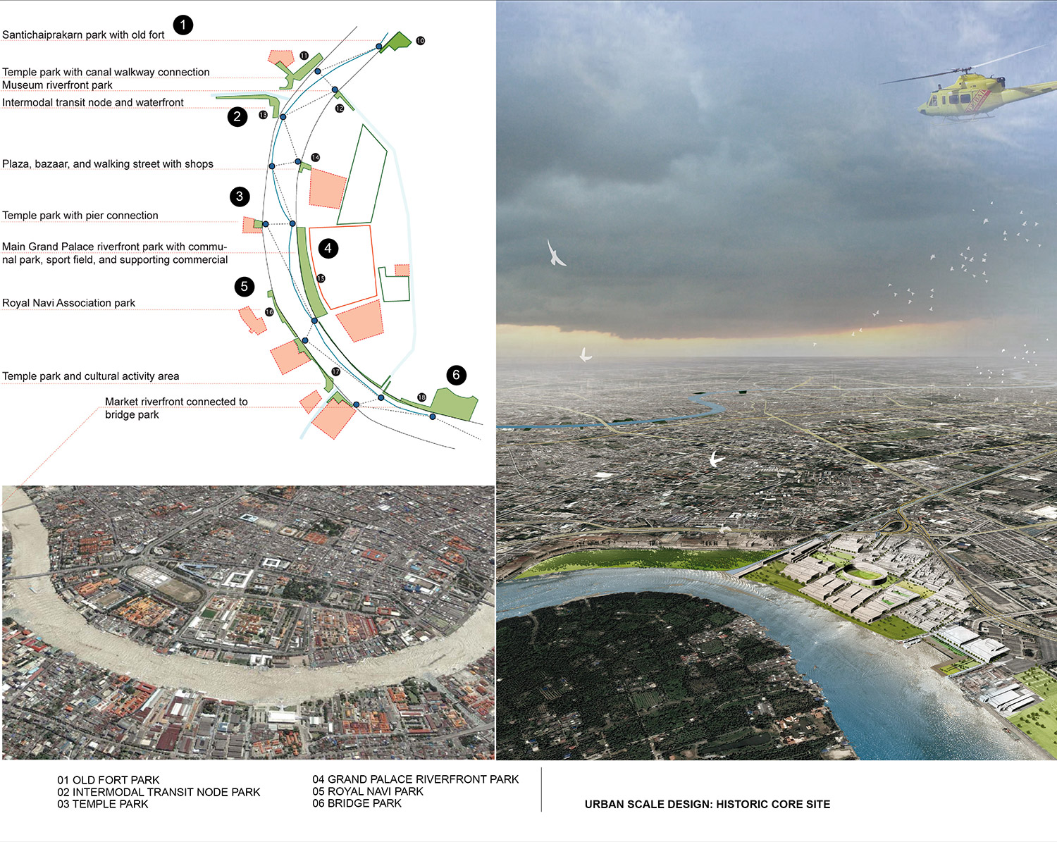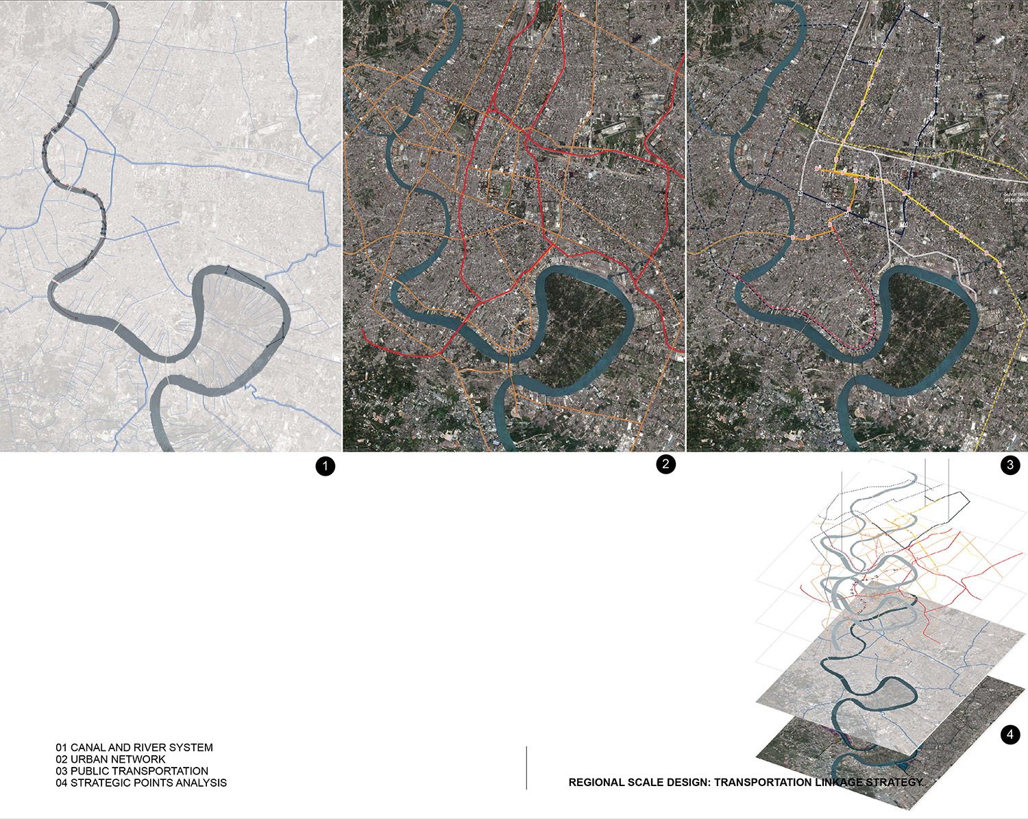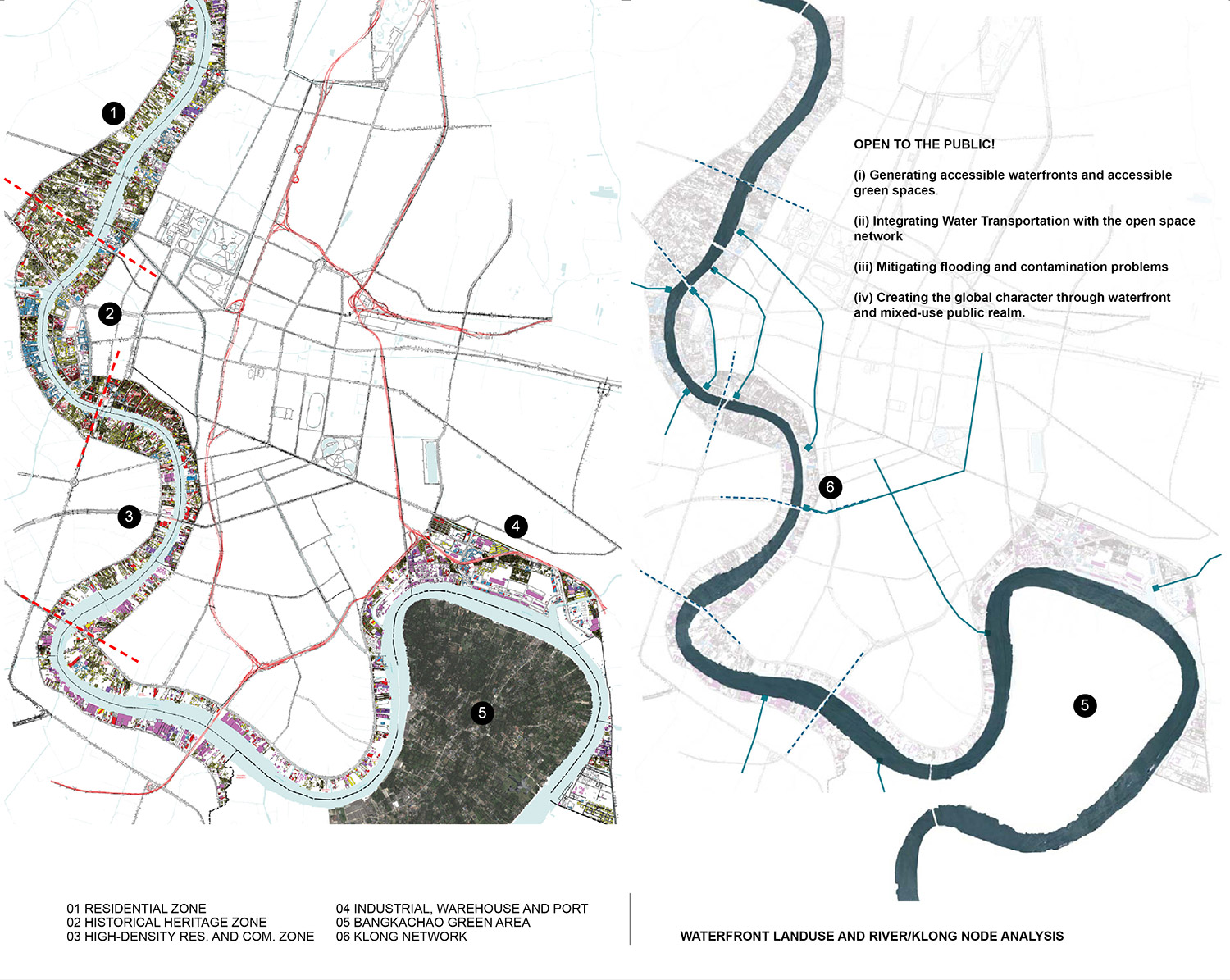 Physically and historically, Bangkok has been shaped by its relationship to the Chao Phraya River and its waterfront. With the advent of industrialization, the focus shifted to the establishment and consolidation of manmade infrastructures such as roads and highways, leaving the waterfronts as large areas of underused land, deteriorated ports, warehouses, and informal settlements. The diminishing public exposure and access to the Chao Phraya River means it is quickly losing its historic role as a valuable asset and resource for the capital. This project proposes the establishment of a green network along the Chao Phraya River by opening up and developing selected underused areas, and connecting them with the new systematic water transportation.