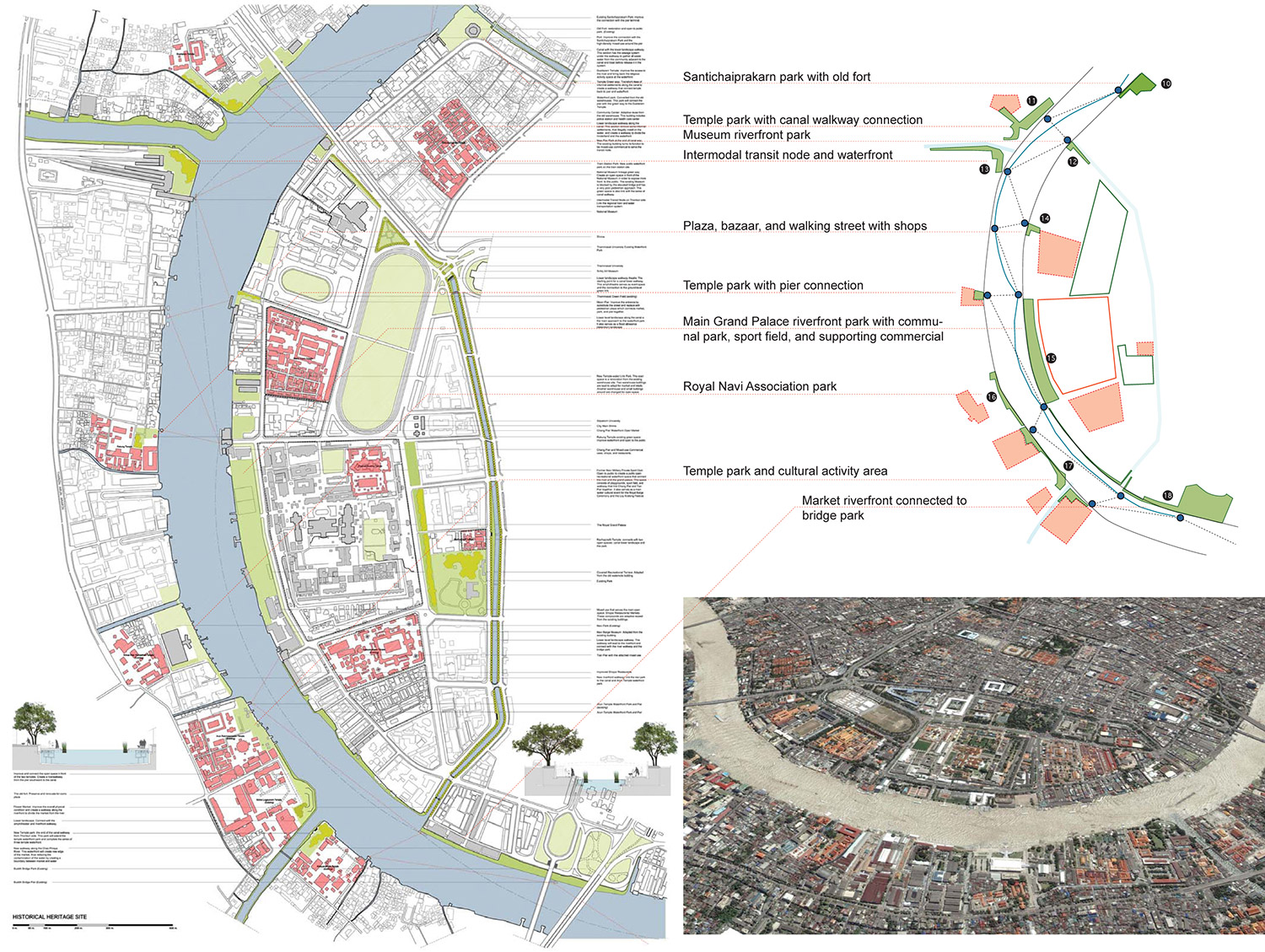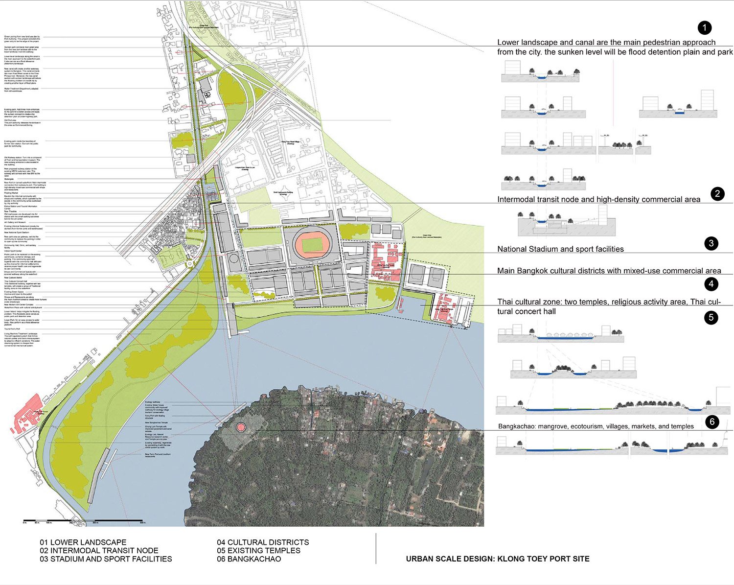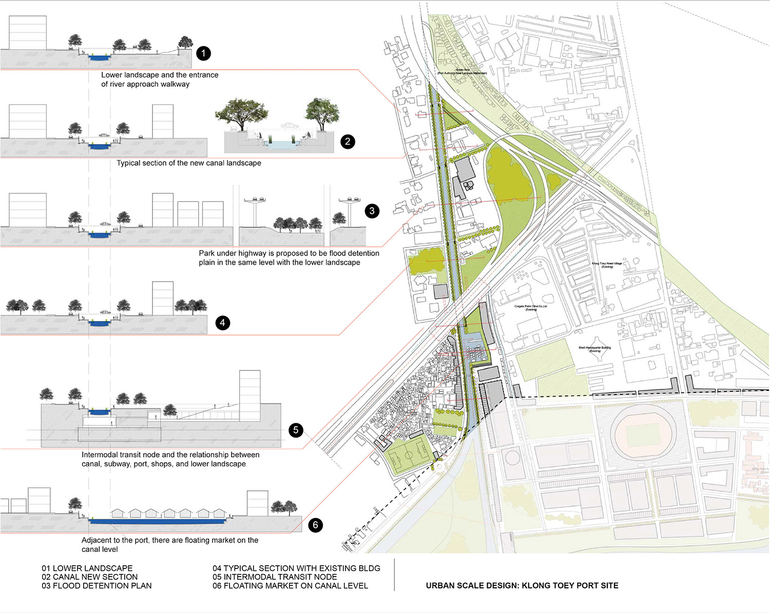 At the urban scale, a series of open recreational spaces is created through the redevelopment of unused or underused areas along the river. These urban scale developments vary from site to site according to their characteristics and surroundings. On the site scale, the proposal redesigns the canal section which offers not only the continuous pedestrian access to the river but also the flood detention and water treatment system. This canal section, in turn, forms pedestrian walkway network following the existing canals from the inner city to the riverfront. Two high priority zones, the Klong Toey Port and historic core site, have been studied for the possibility of detailed implementation. Many urban design issues have been incorporated at the small scale, such as the management of infrastructure landscape in the city, the redevelopment strategy for informal settlements, the section of intermodal transit nodes between subway stations and ferry piers, and the balance between the cultural spaces and historic buildings.