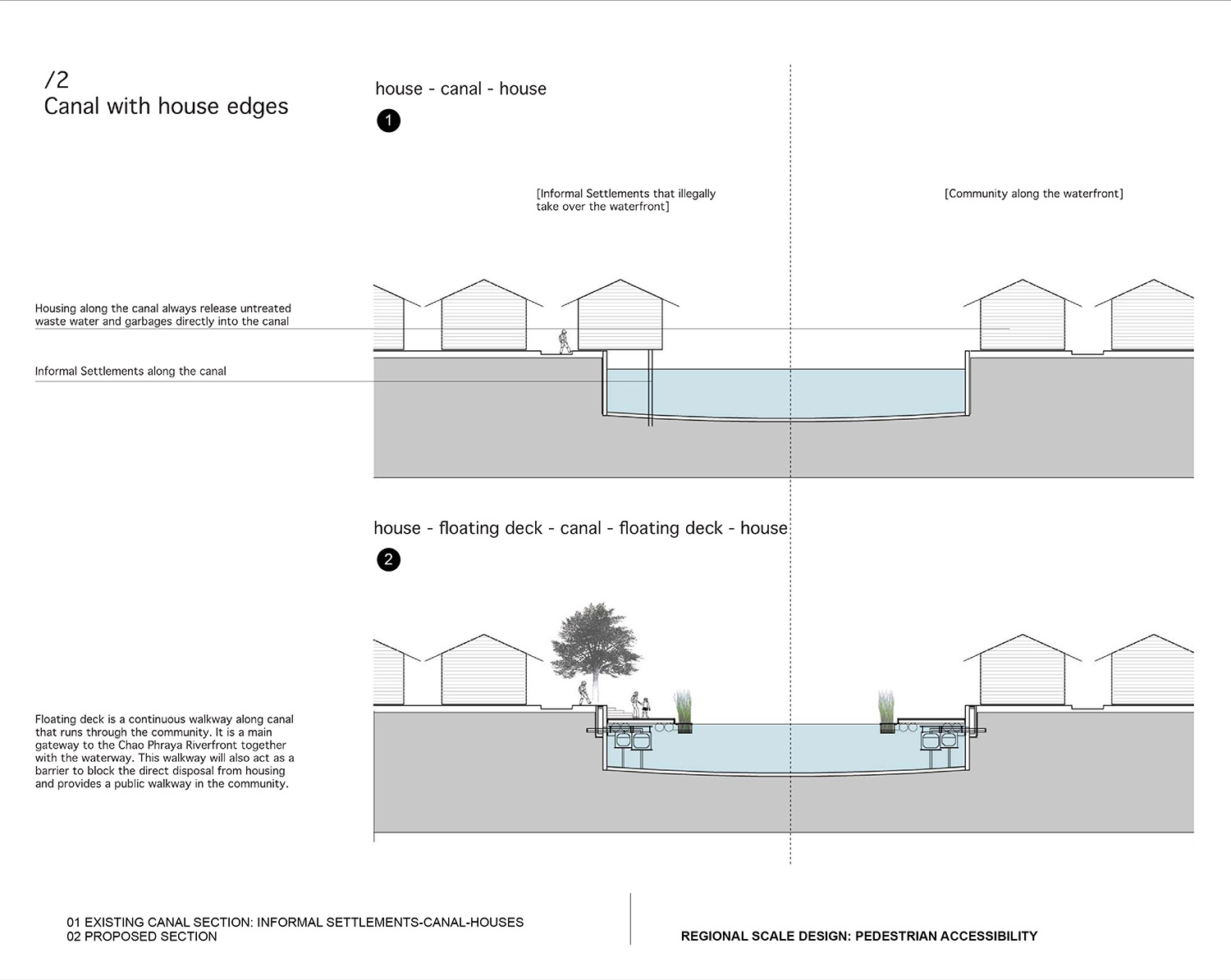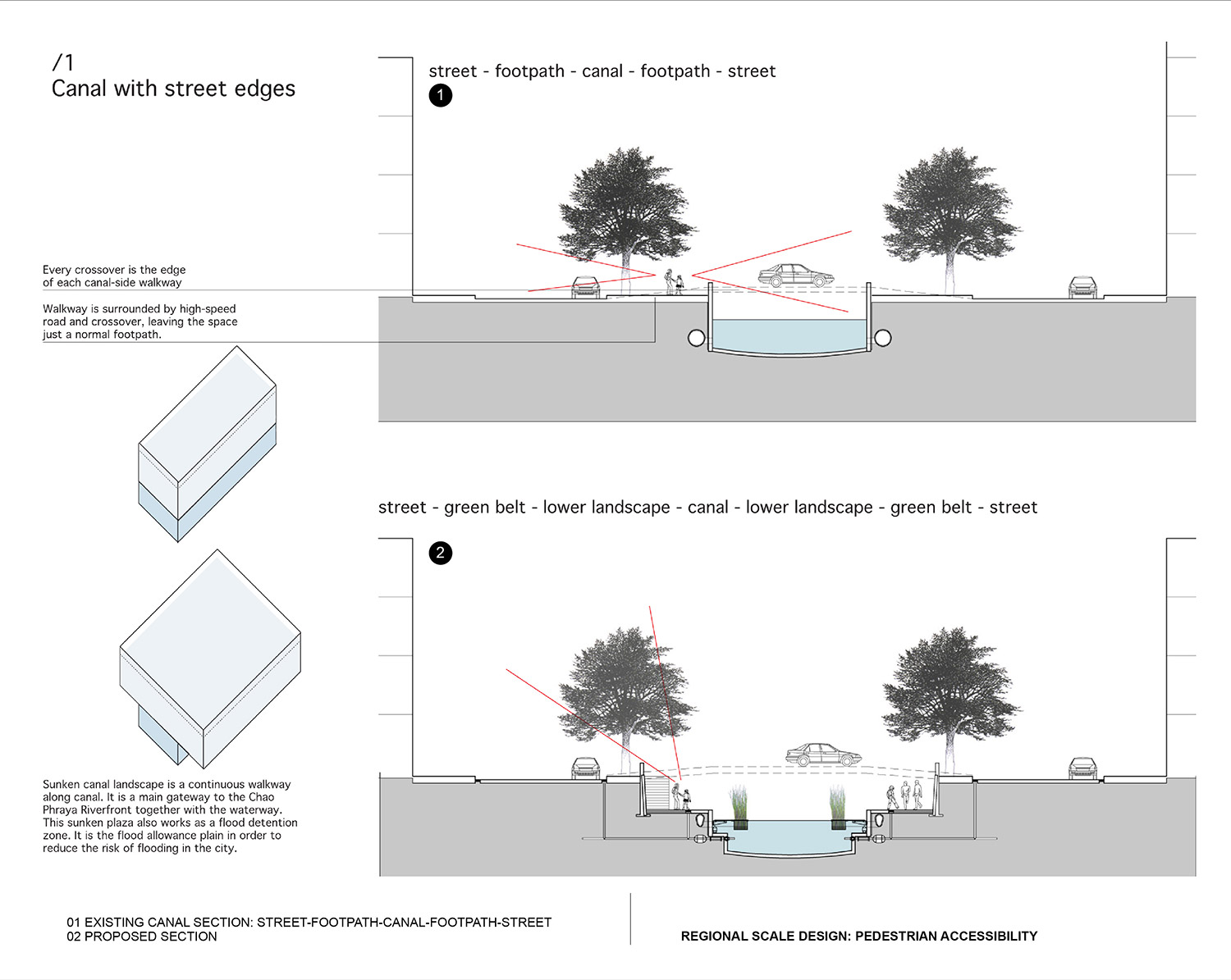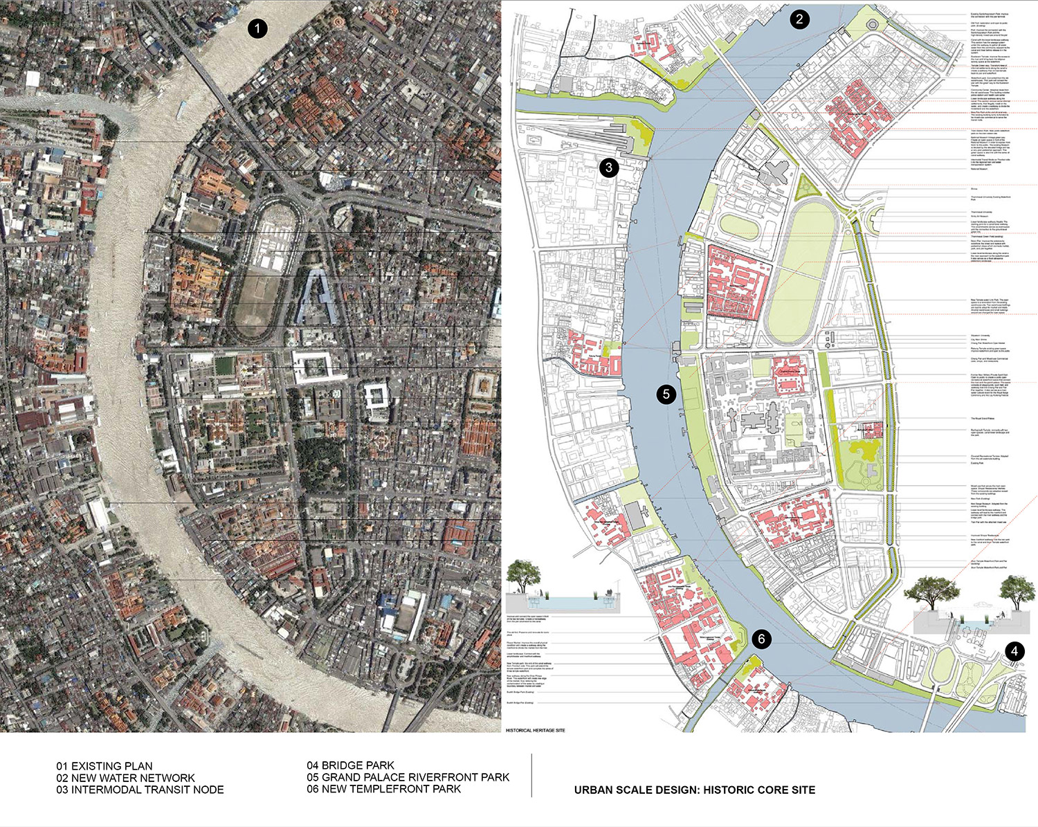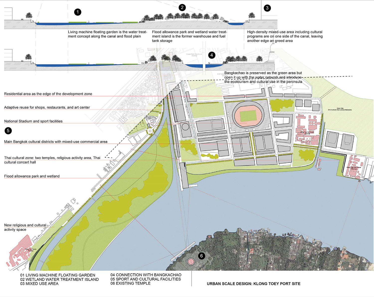 At the urban scale, a series of open recreational spaces is created through the redevelopment of unused or underused areas along the river. These urban scale developments vary from site to site according to their characteristics and surroundings. On the site scale, the proposal redesigns the canal section which offers not only the continuous pedestrian access to the river but also the flood detention and water treatment system. This canal section, in turn, forms pedestrian walkway network following the existing canals from the inner city to the riverfront. Two high priority zones, the Klong Toey Port and historic core site, have been studied for the possibility of detailed implementation. Many urban design issues have been incorporated at the small scale, such as the management of infrastructure landscape in the city, the redevelopment strategy for informal settlements, the section of intermodal transit nodes between subway stations and ferry piers, and the balance between the cultural spaces and historic buildings.