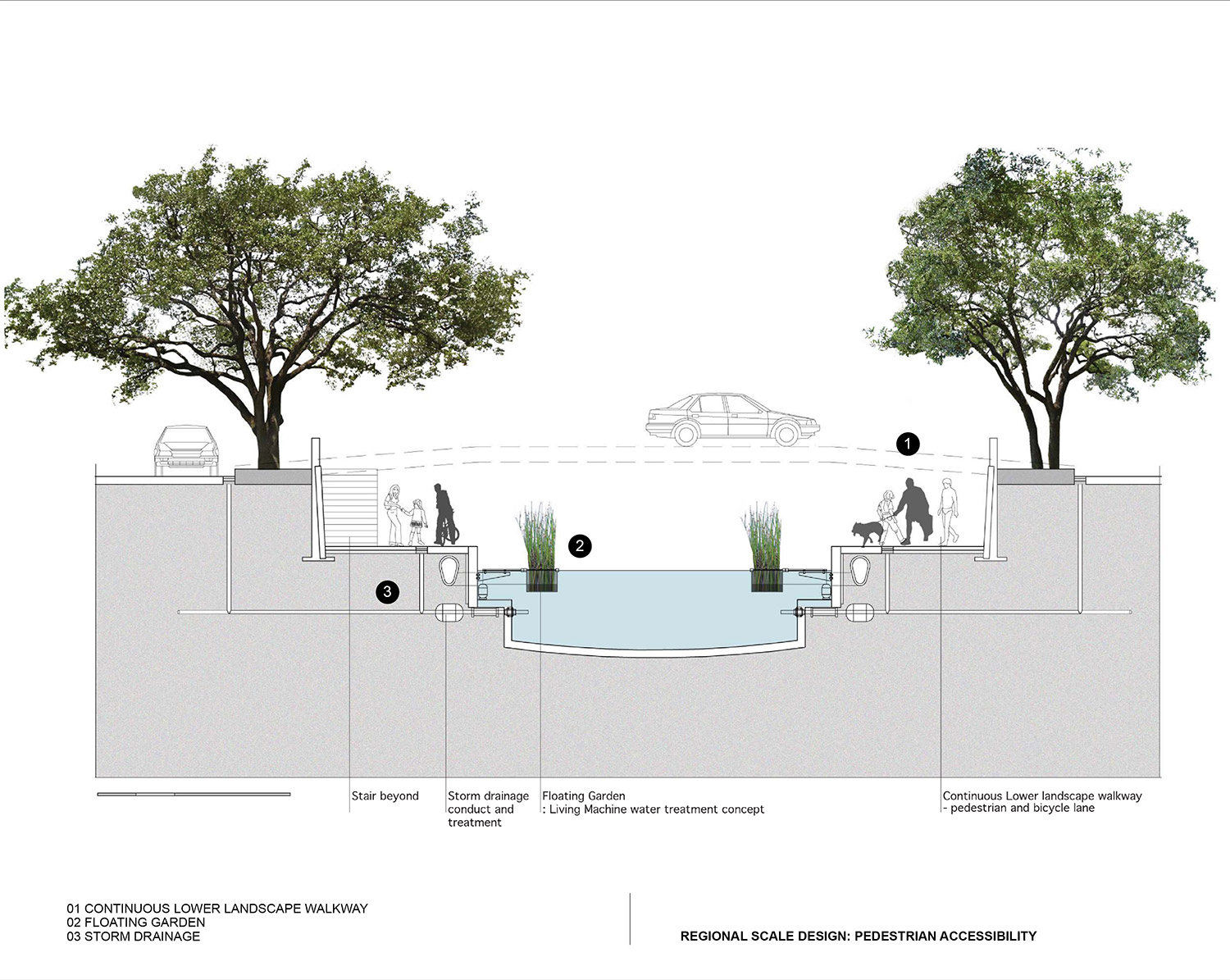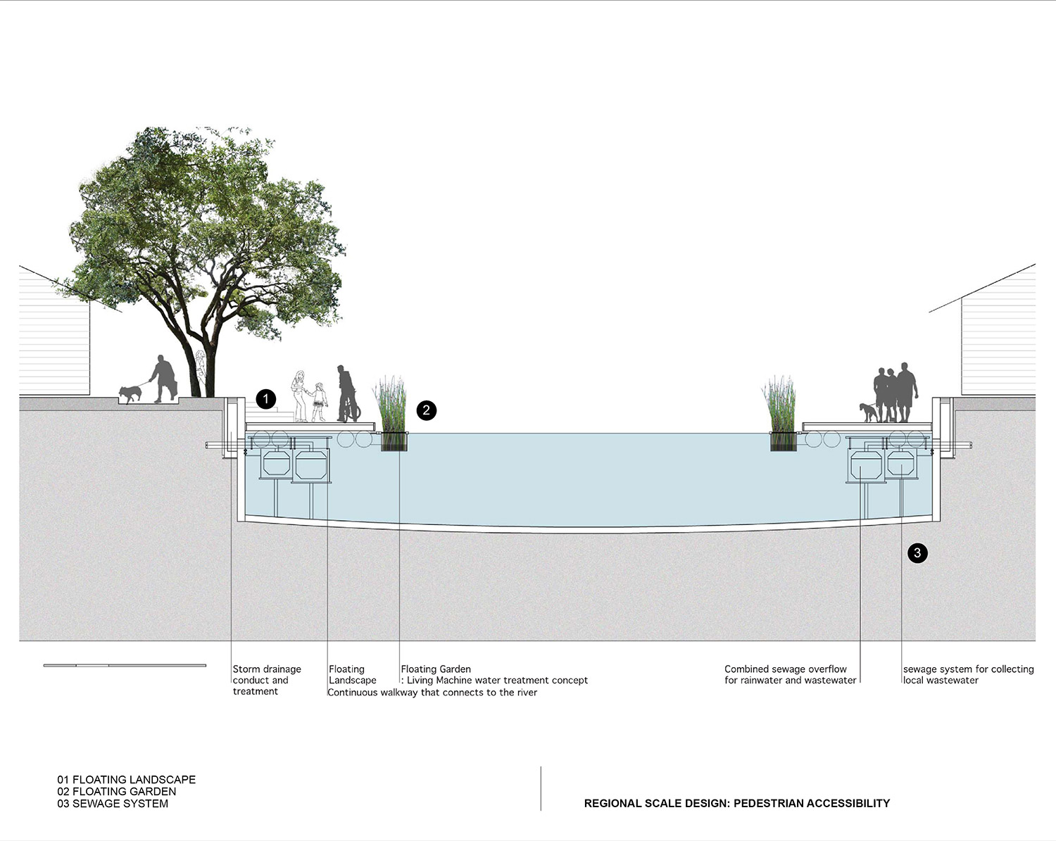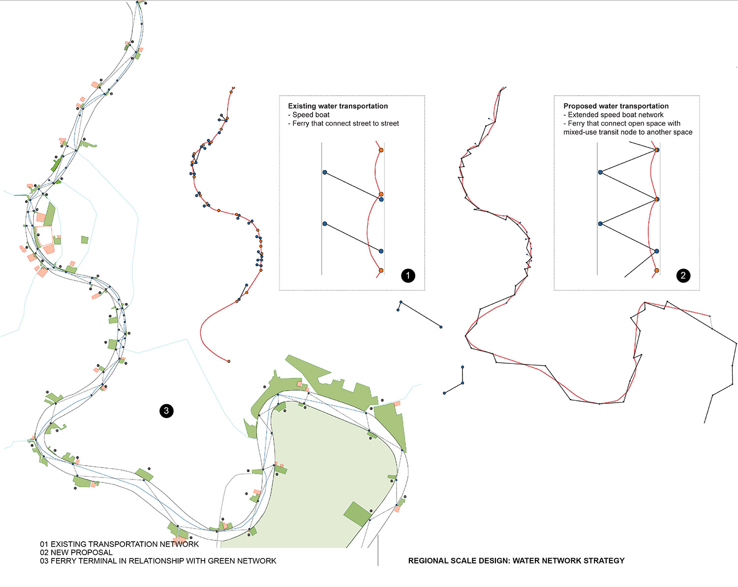 This proposal involves a comprehensive range of projects at different scales. At the regional scale, it proposes the readjustment of the water transportation system by creating a completed network of ferry terminals to accommodate the extended express boat routes. The water network will not only connect the streets on both riversides, but also link the open recreational network that consists of the activity space and high-density multi-use transit node. Moreover, this new water network will also be connected to the existing inland public transportation, thus highlighting the major transit nodes as communal destinations.