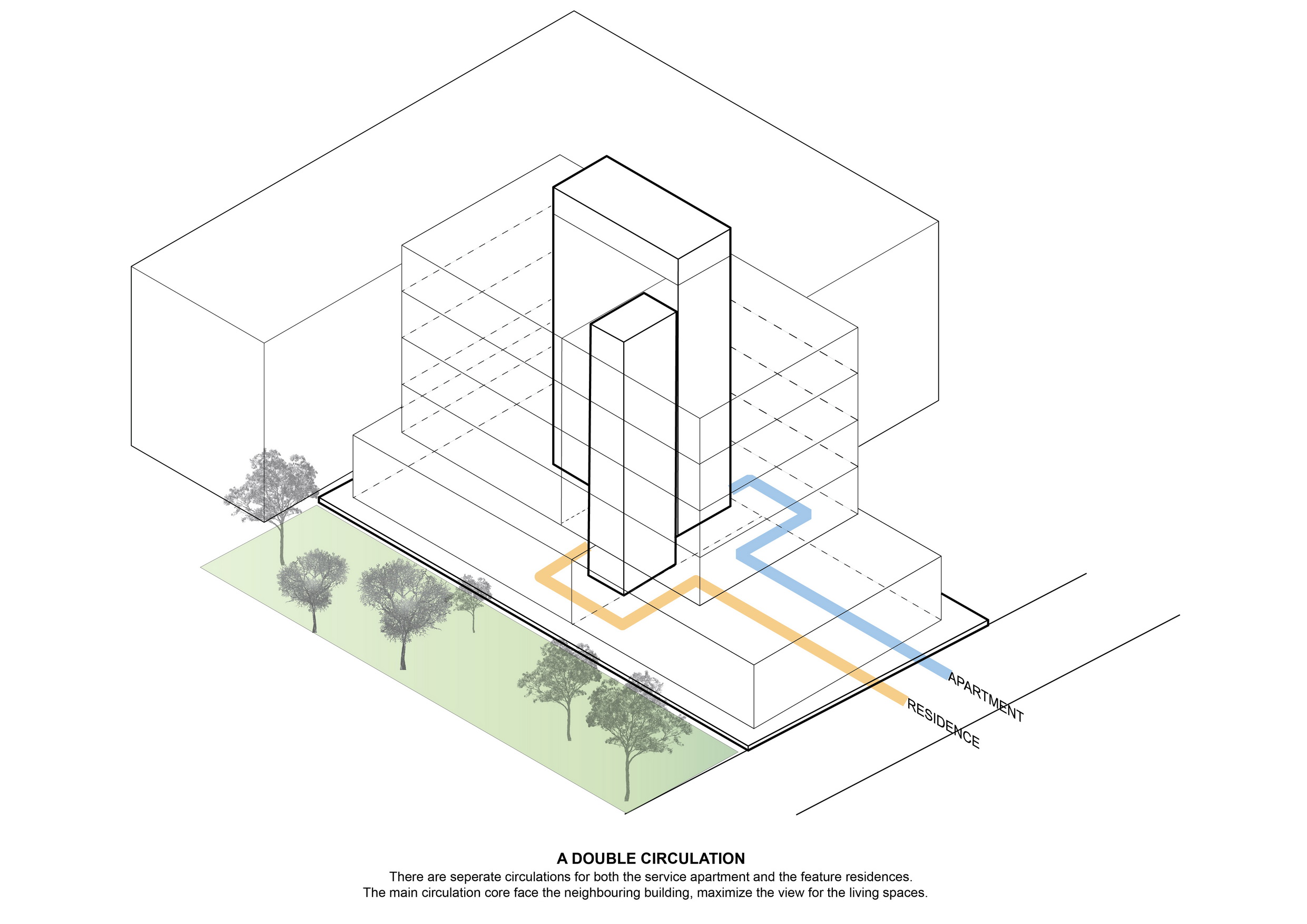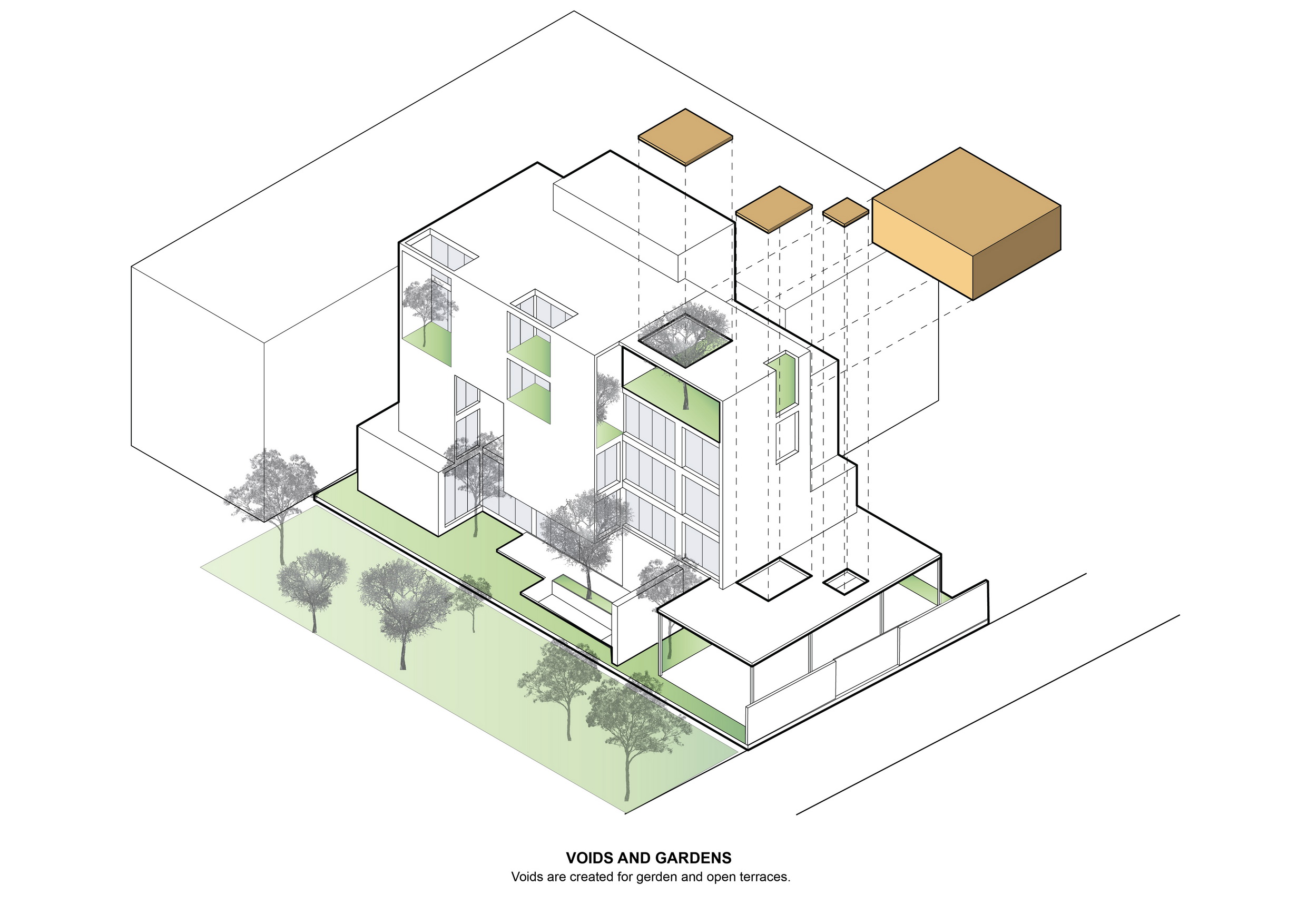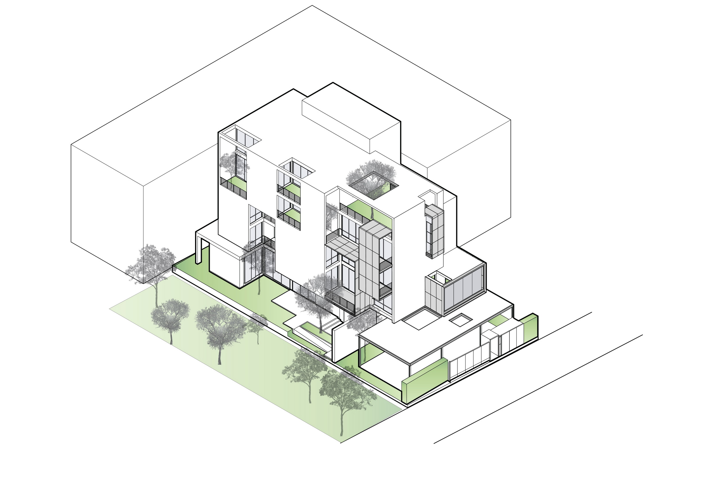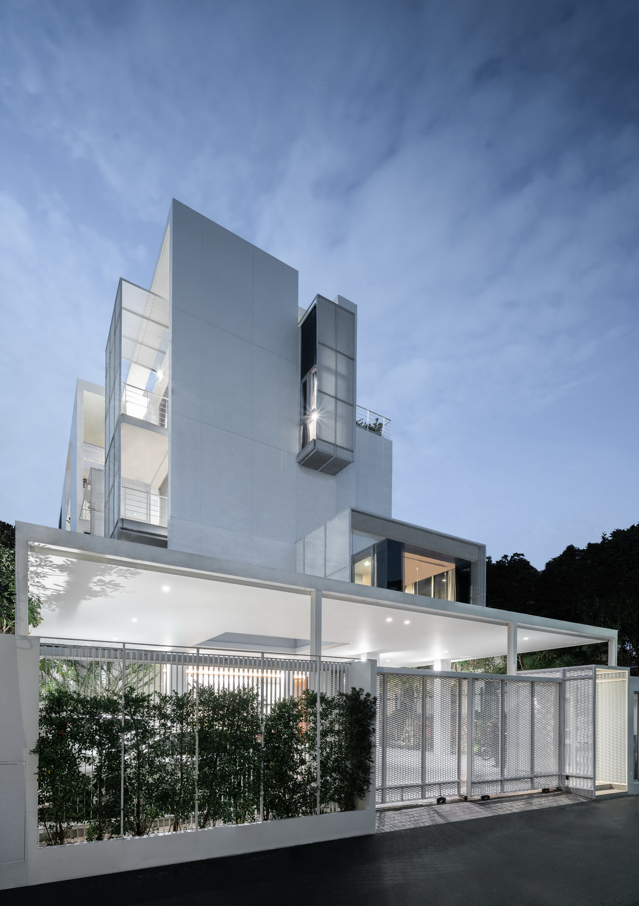 The simplified massing and subtraction provide openings for terraces, natural ventilation, and daylighting to connect the residents to nature. While its diverse application generates differing spatial outcomes, this architectural language of mass subtraction results in an overall cohesive form. Small voids are subtracted from the mass that houses service apartment units while keeping the architectural envelope intact as it protects that building from solar heat gain generated by intense sun rays facing West. A vertical void stretching the entirety of the interior to the exterior roofline allows for stack ventilation to bring about natural cooling. For the private residence, large portions of the mass are removed to provide optimal views. This void is replaced by transitional spaces that function both as exterior terraces and shading. An envelope of expanded aluminum cladding provides shading, ventilation and a prominent façade feature for the front elevation.