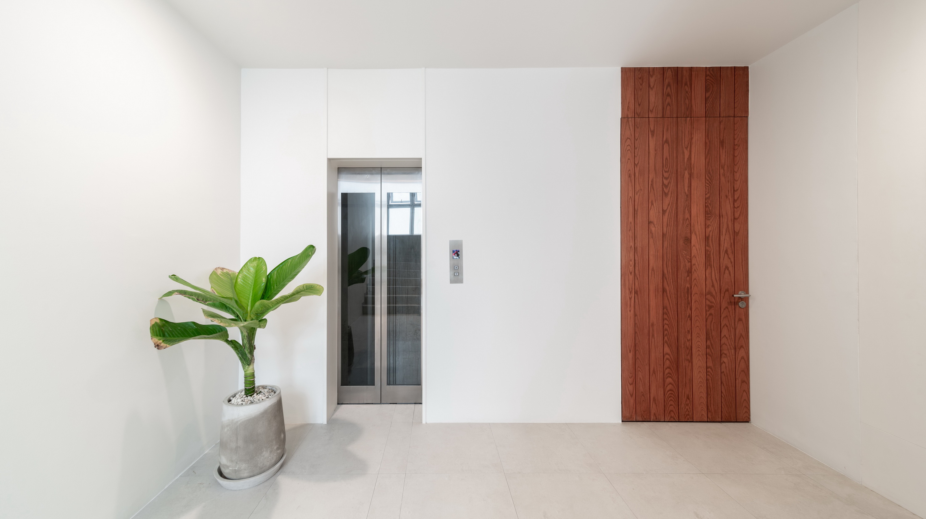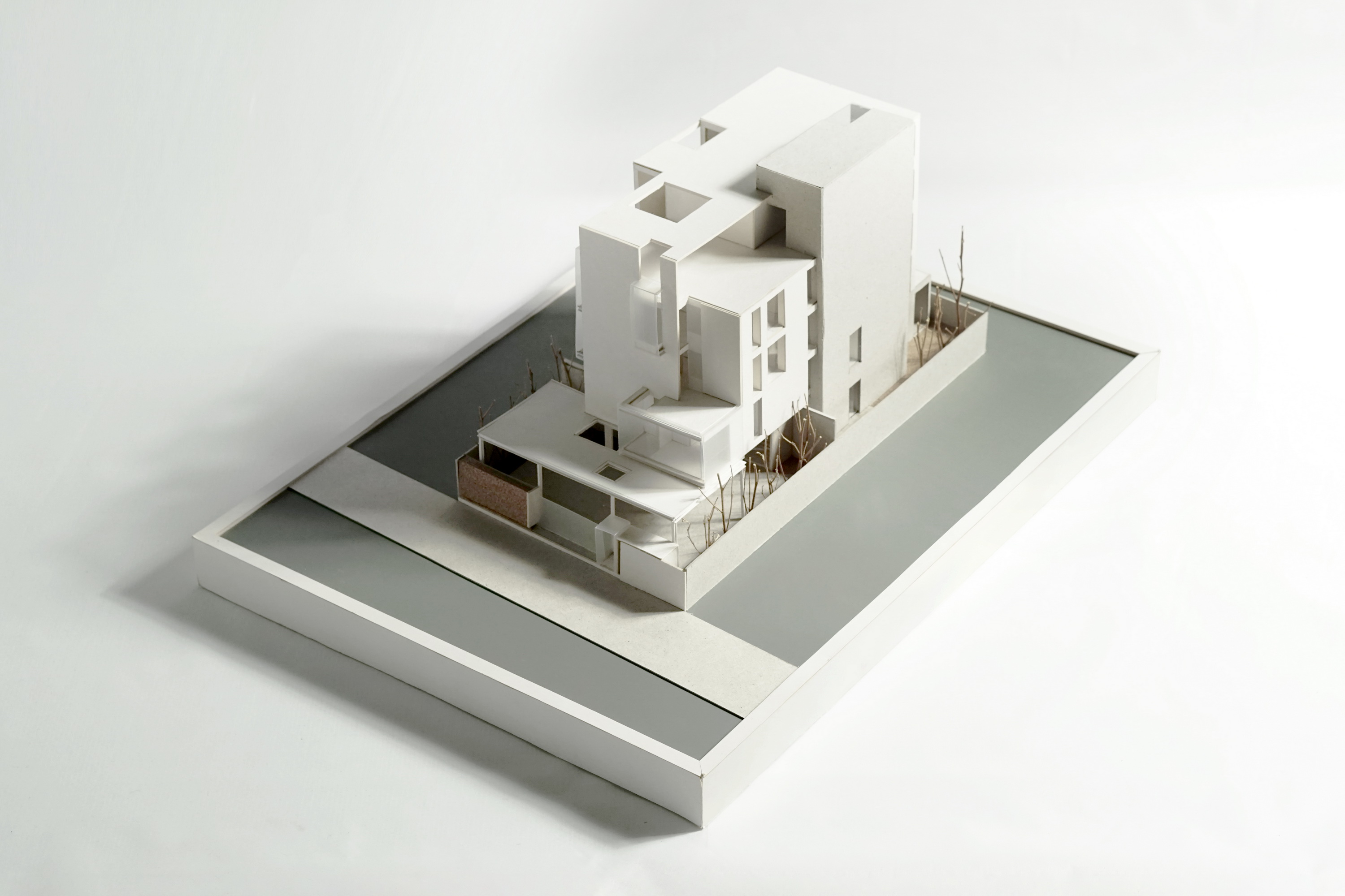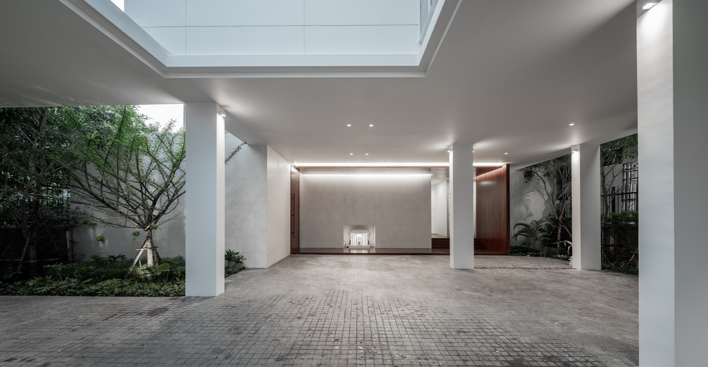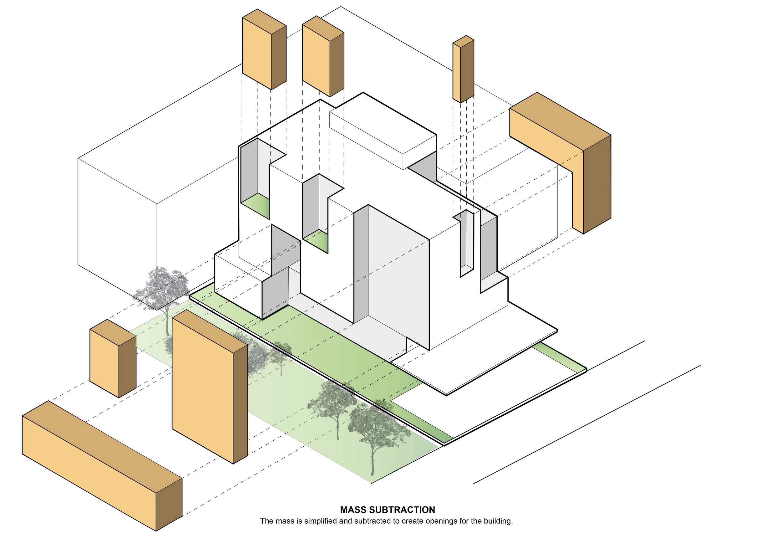 The simplified massing and subtraction provide openings for terraces, natural ventilation, and daylighting to connect the residents to nature. While its diverse application generates differing spatial outcomes, this architectural language of mass subtraction results in an overall cohesive form. Small voids are subtracted from the mass that houses service apartment units while keeping the architectural envelope intact as it protects that building from solar heat gain generated by intense sun rays facing West. A vertical void stretching the entirety of the interior to the exterior roofline allows for stack ventilation to bring about natural cooling. For the private residence, large portions of the mass are removed to provide optimal views. This void is replaced by transitional spaces that function both as exterior terraces and shading. An envelope of expanded aluminum cladding provides shading, ventilation and a prominent façade feature for the front elevation.