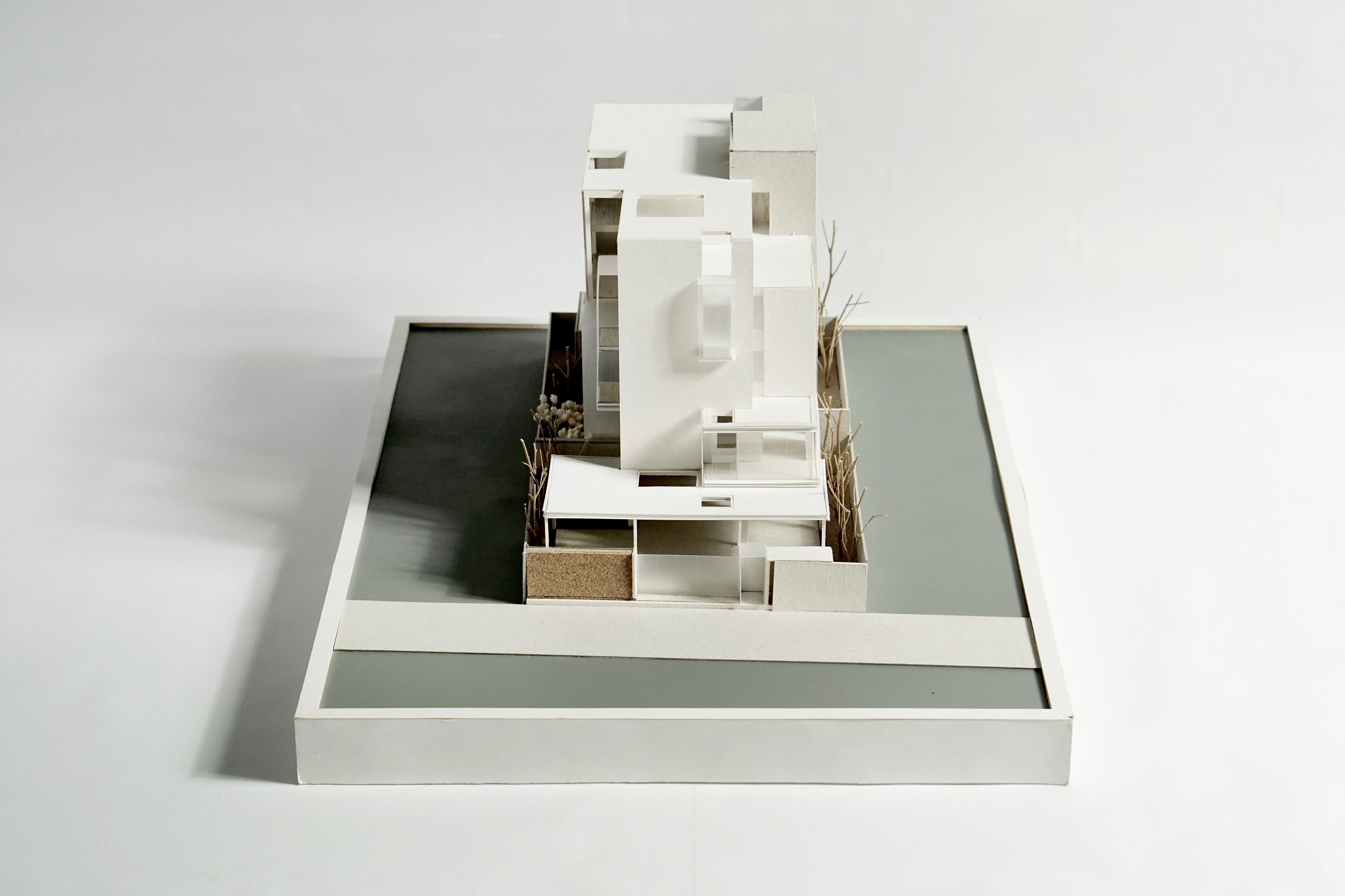 Due to the surrounding context, the overall zoning is strategically organized to provide occupants with the highest amount of privacy whilst maintaining close connection to the natural environment. The private residence is positioned on the ground in proximity to nature. Above, the private residence and service apartments each occupy half of the floor area, with vertical circulation situated through the middle. A common area placed on the roof, accessible by users of both programs, act as a gathering space for various activities and recreation.
