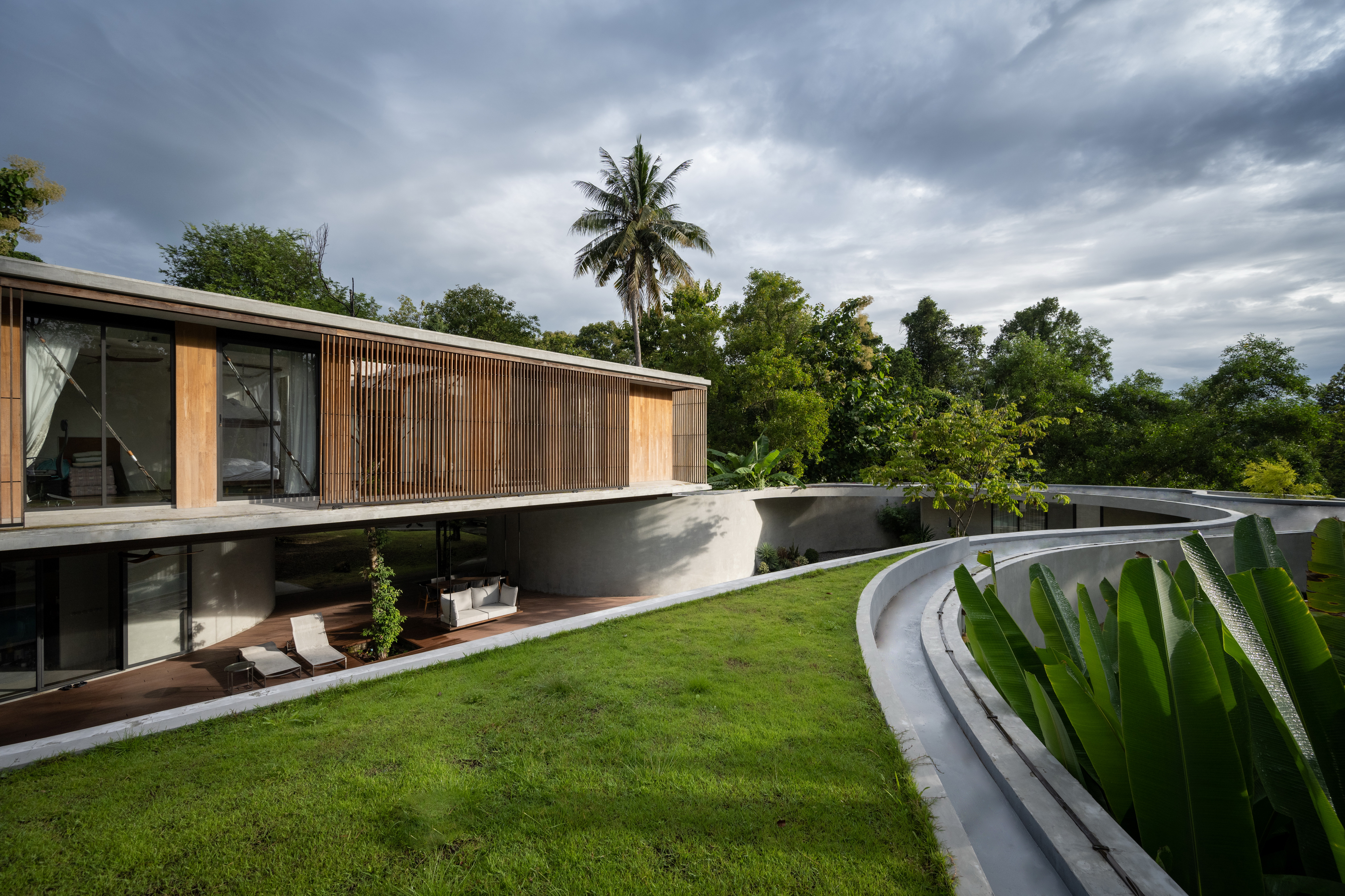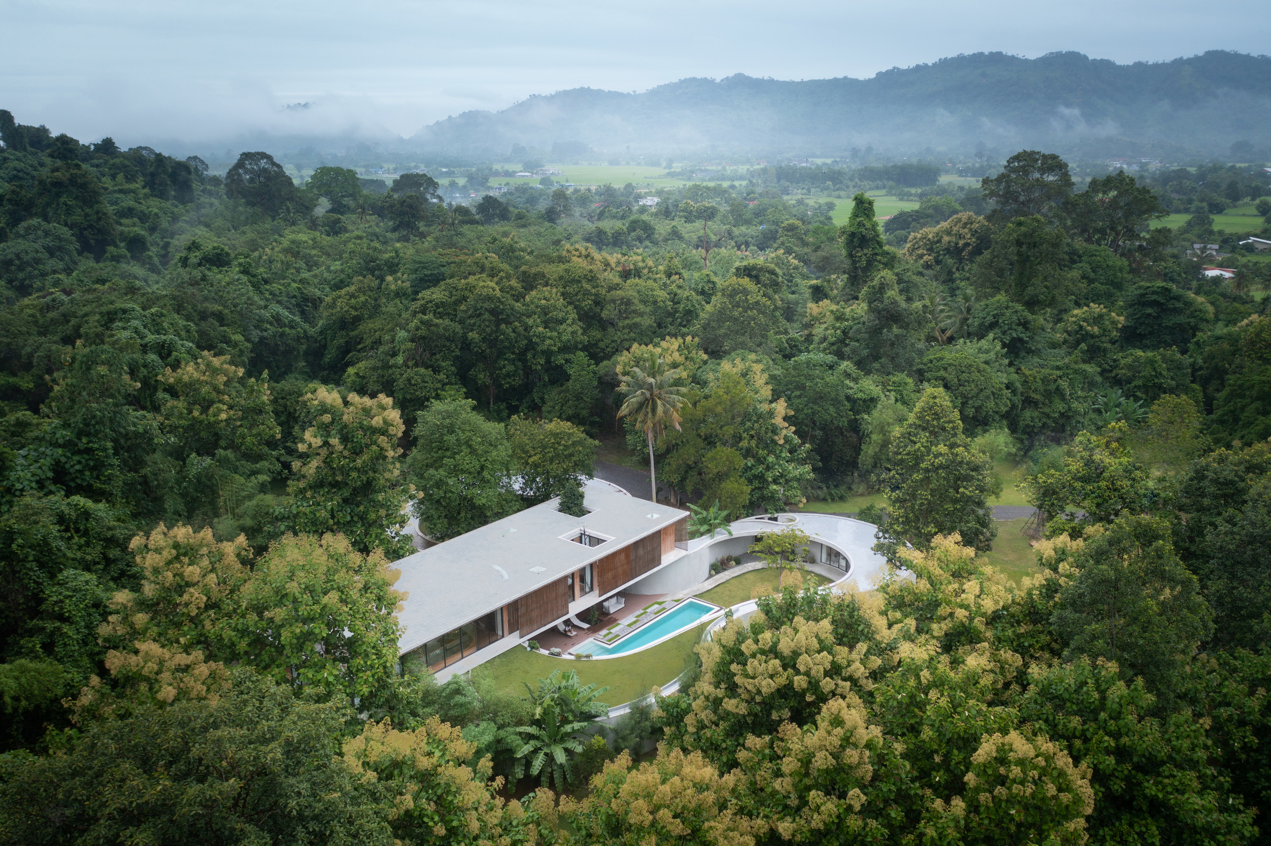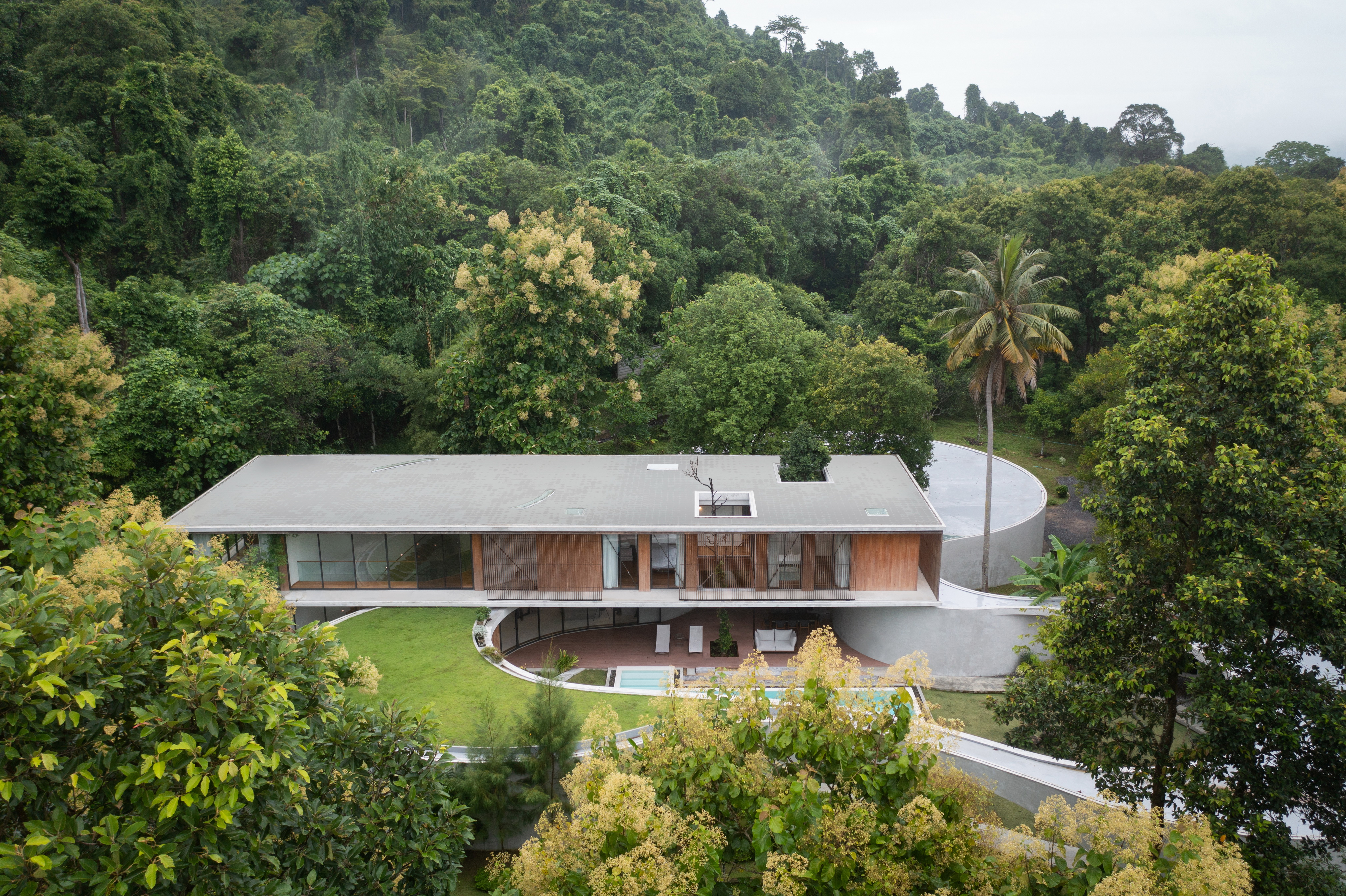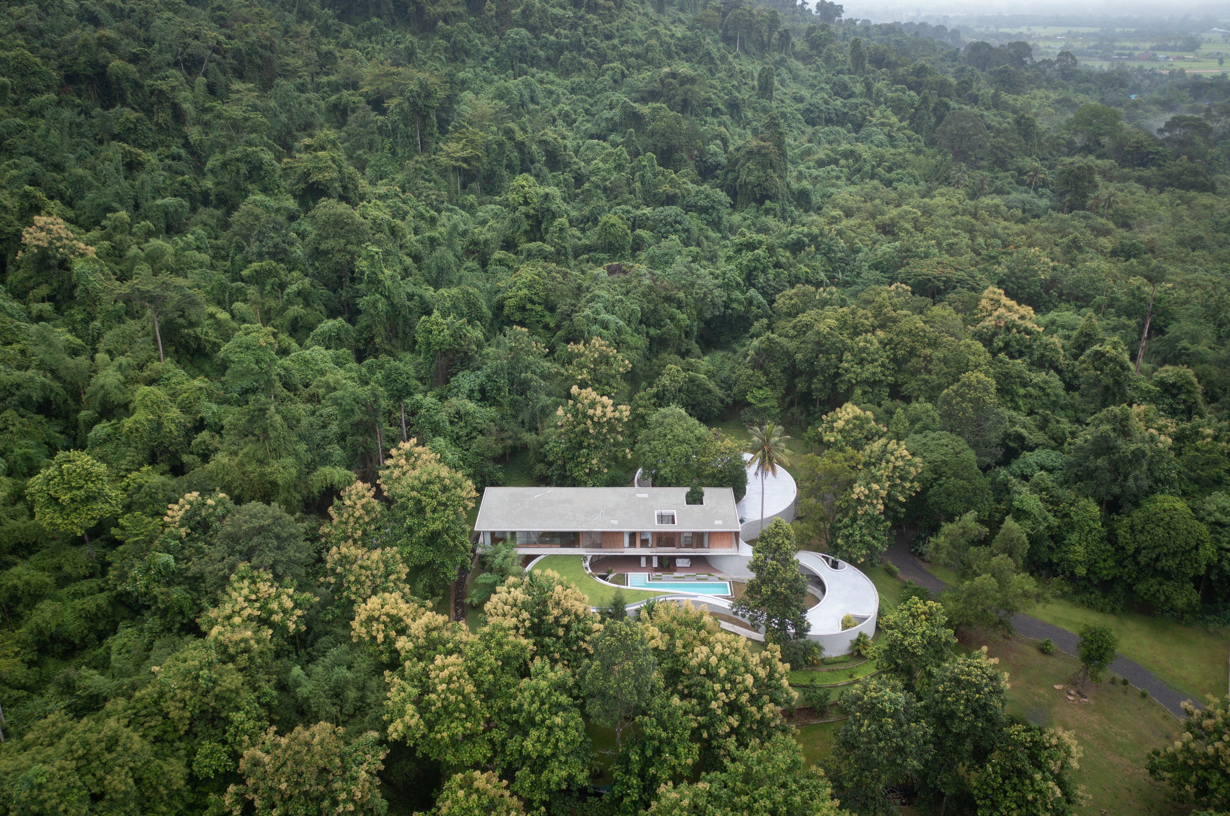 Winding Villa is a vacation home for city dwellers, nestled in the lush landscape of Khao Yai National Park. Located at the border of the natural reserve, the villa sits at the foot of the mountain and share its 20,000 square meter site with a natural animal watering well. In order to cause the least amount of disruption to the natural surroundings, the client and design team decided against the construction of a perimeter fence, opting for a curved geometry that defines only the boundary of the villa. The shape and direction of the curved wall is determined by the location of the existing trees. The winding geometry of the ground floor curves in and out as it avoids or encircles the trees on the site, leaving the trees untouched outside its boundary, or bringing it into the courtyard to become a part of the architecture.