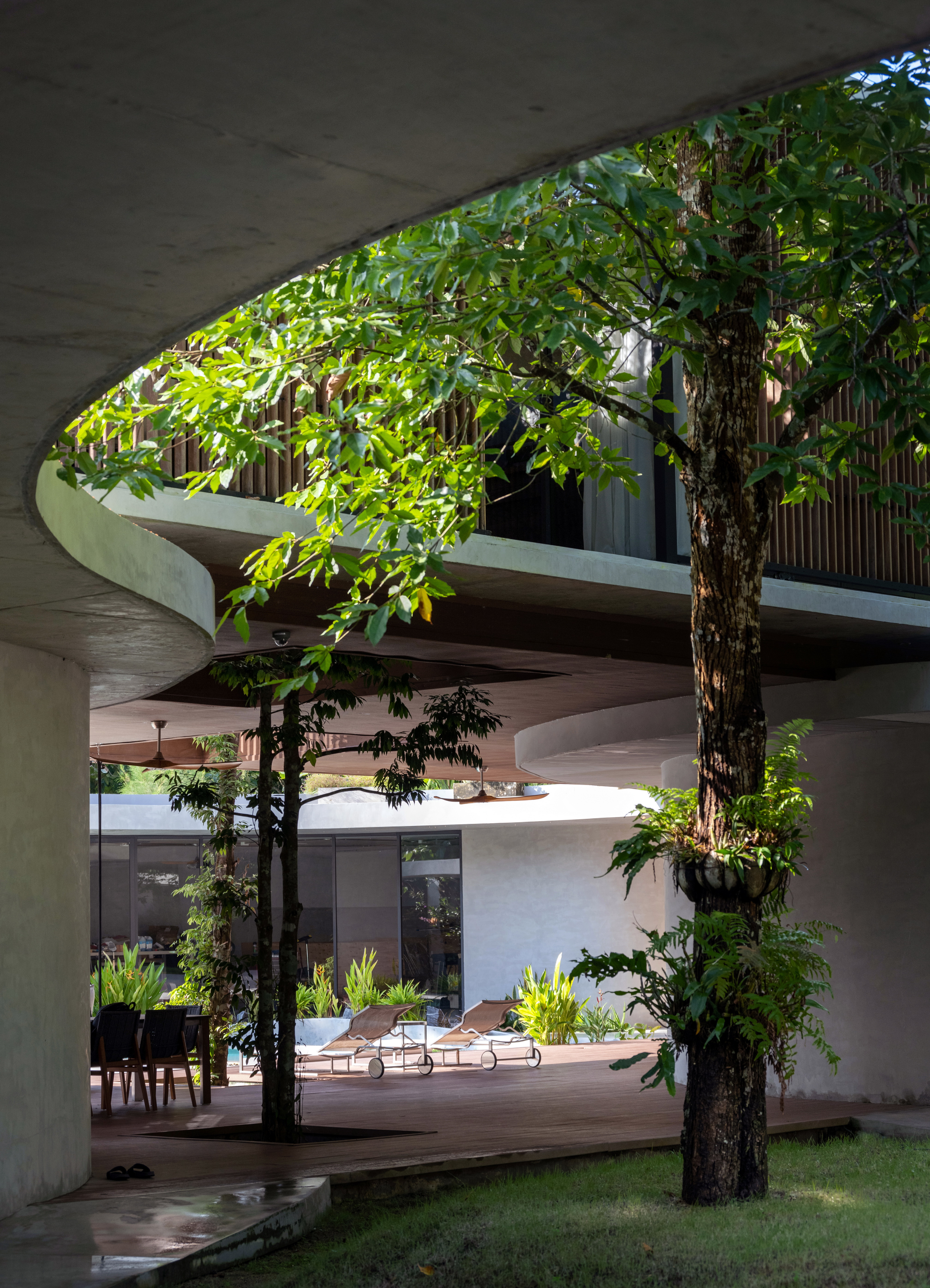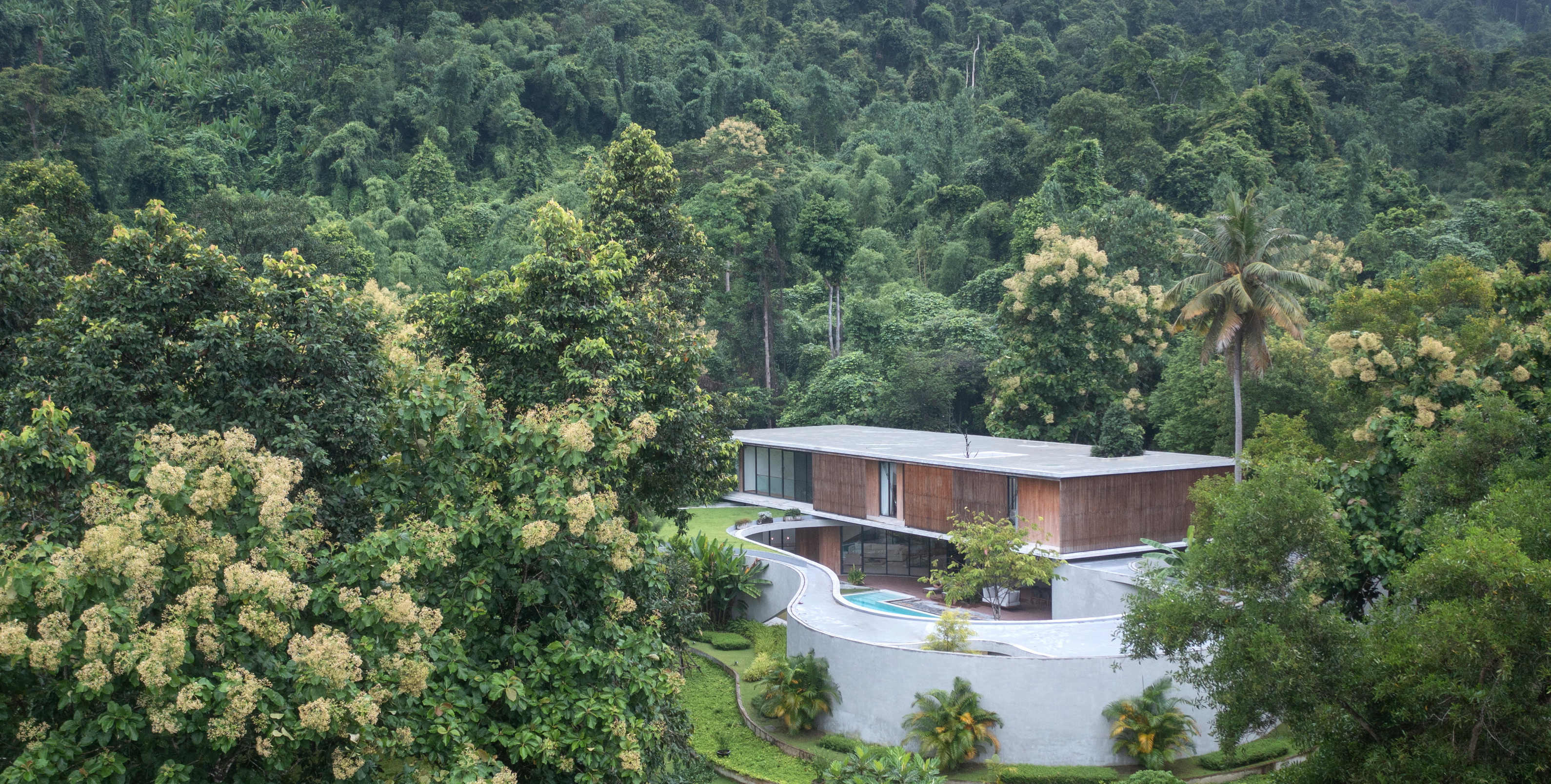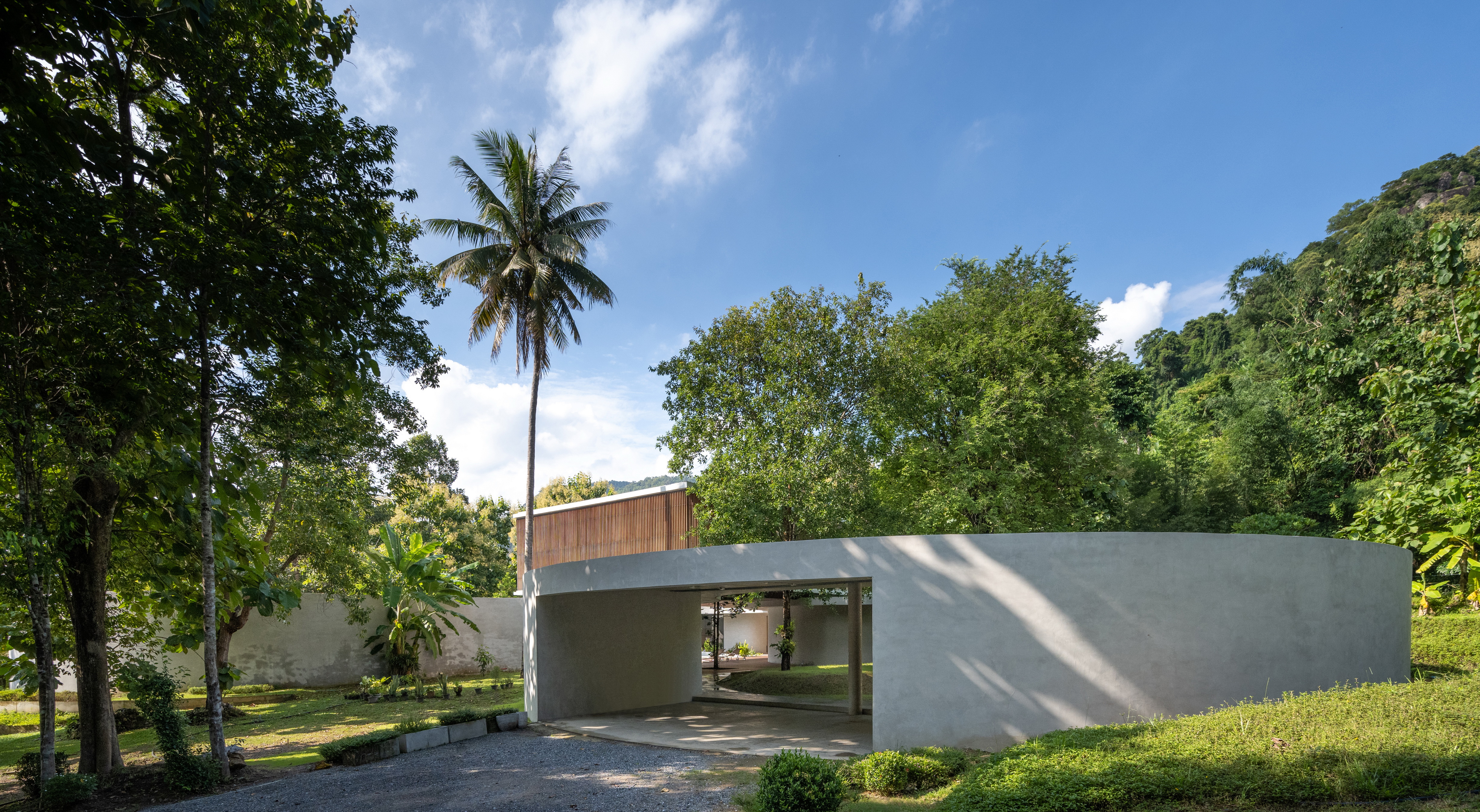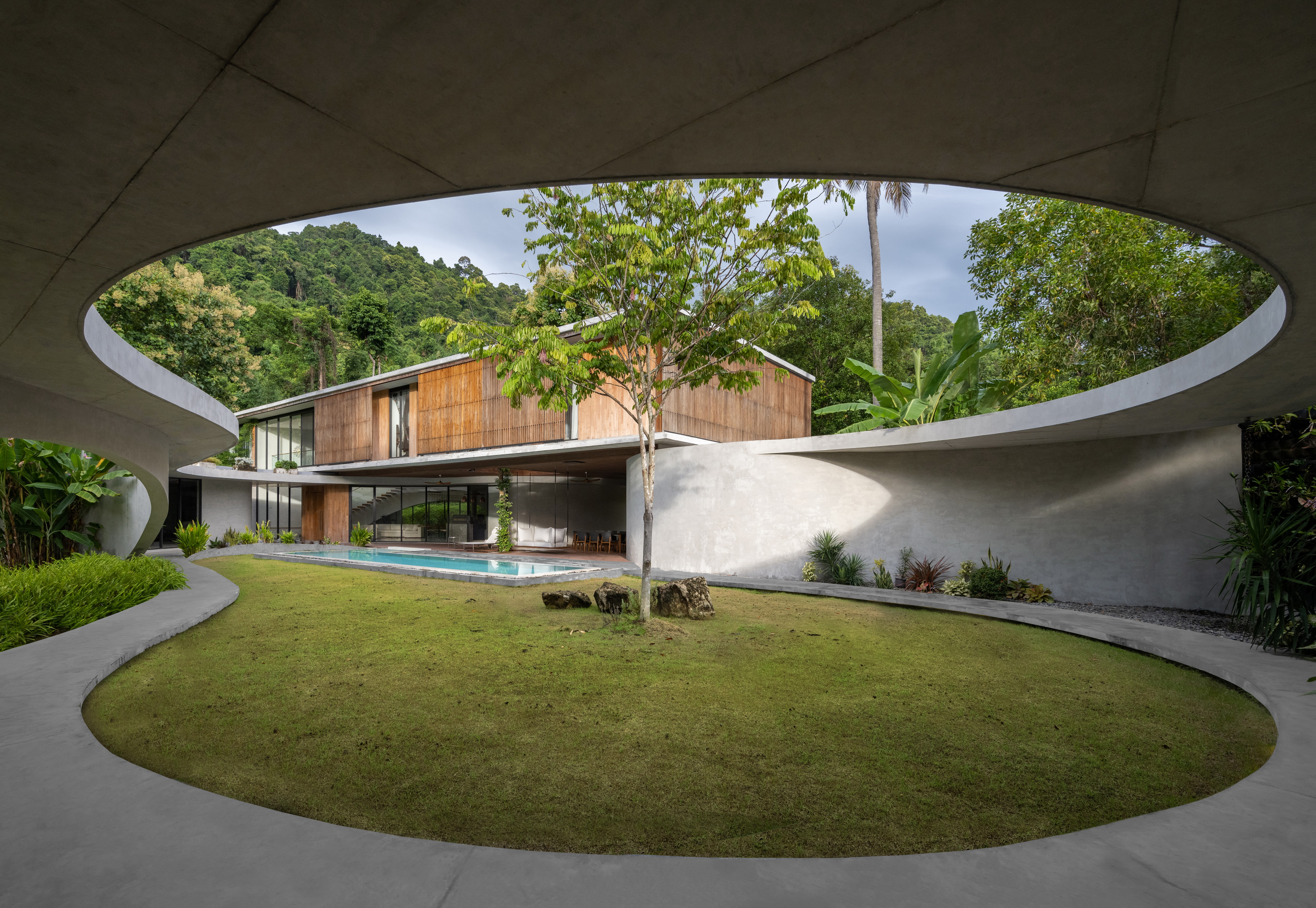 Winding Villa is a vacation home for city dwellers, nestled in the lush landscape of Khao Yai National Park. Located at the border of the natural reserve, the villa sits at the foot of the mountain and share its 20,000 square meter site with a natural animal watering well. In order to cause the least amount of disruption to the natural surroundings, the client and design team decided against the construction of a perimeter fence, opting for a curved geometry that defines only the boundary of the villa. The shape and direction of the curved wall is determined by the location of the existing trees. The winding geometry of the ground floor curves in and out as it avoids or encircles the trees on the site, leaving the trees untouched outside its boundary, or bringing it into the courtyard to become a part of the architecture.