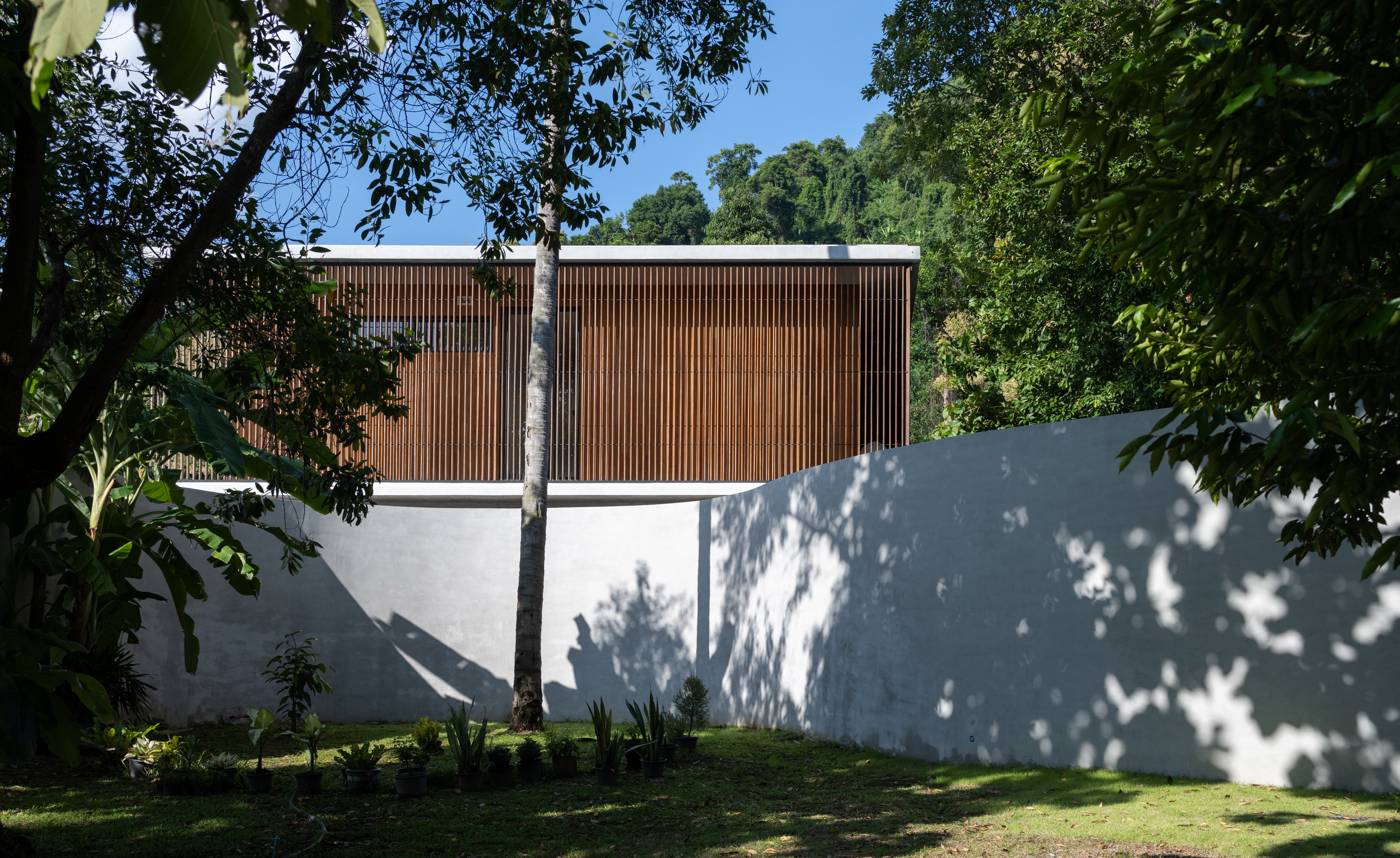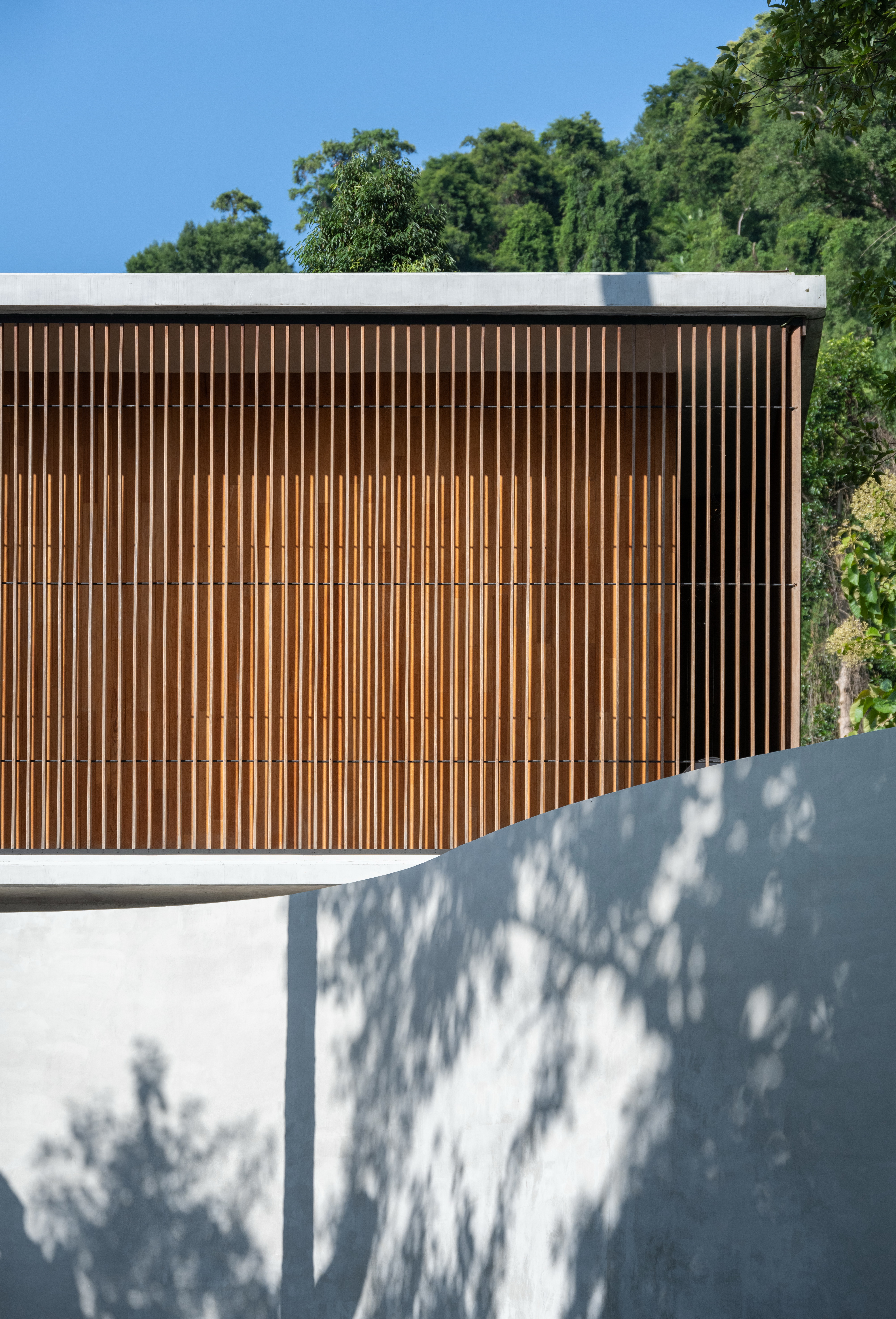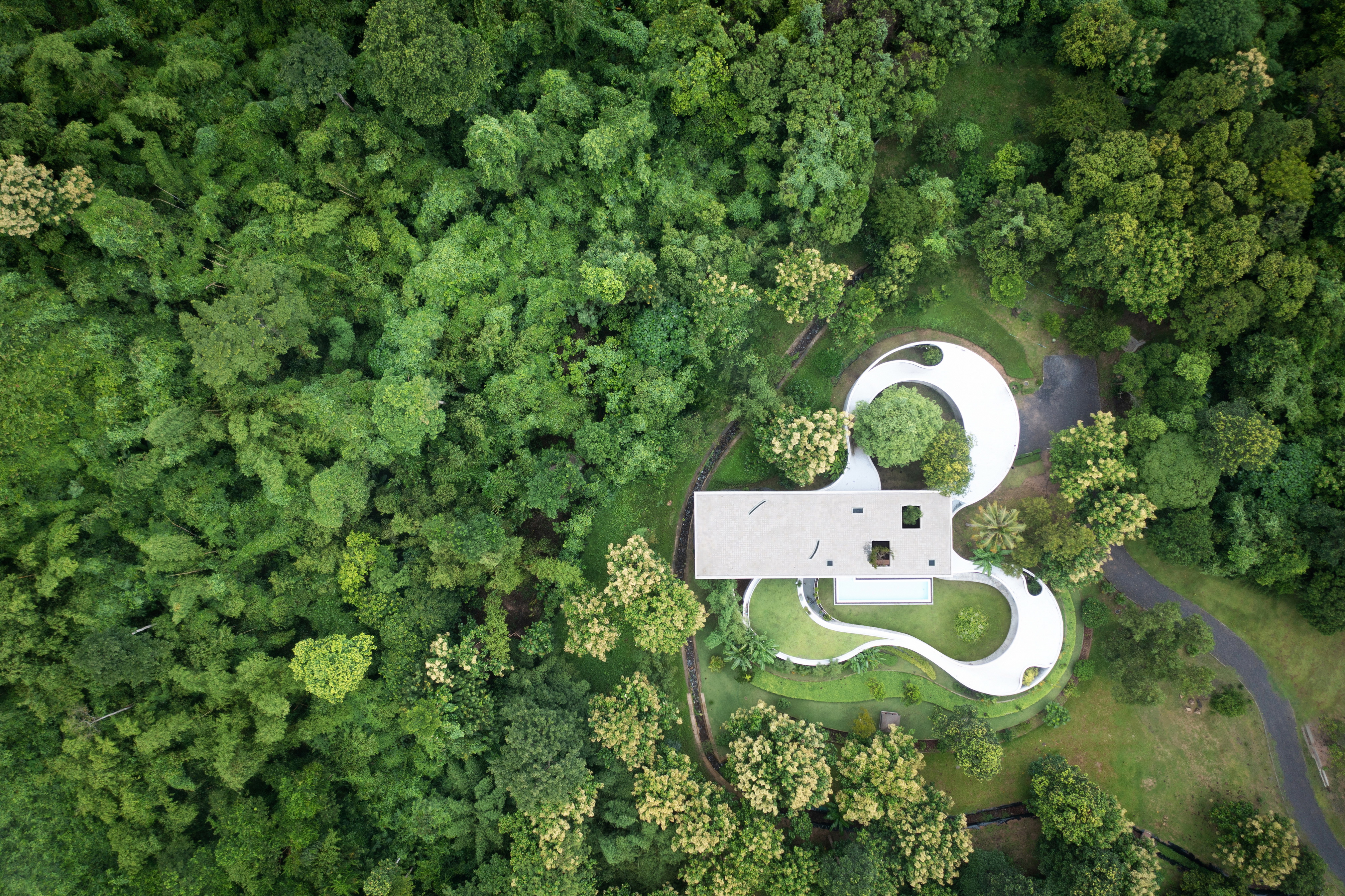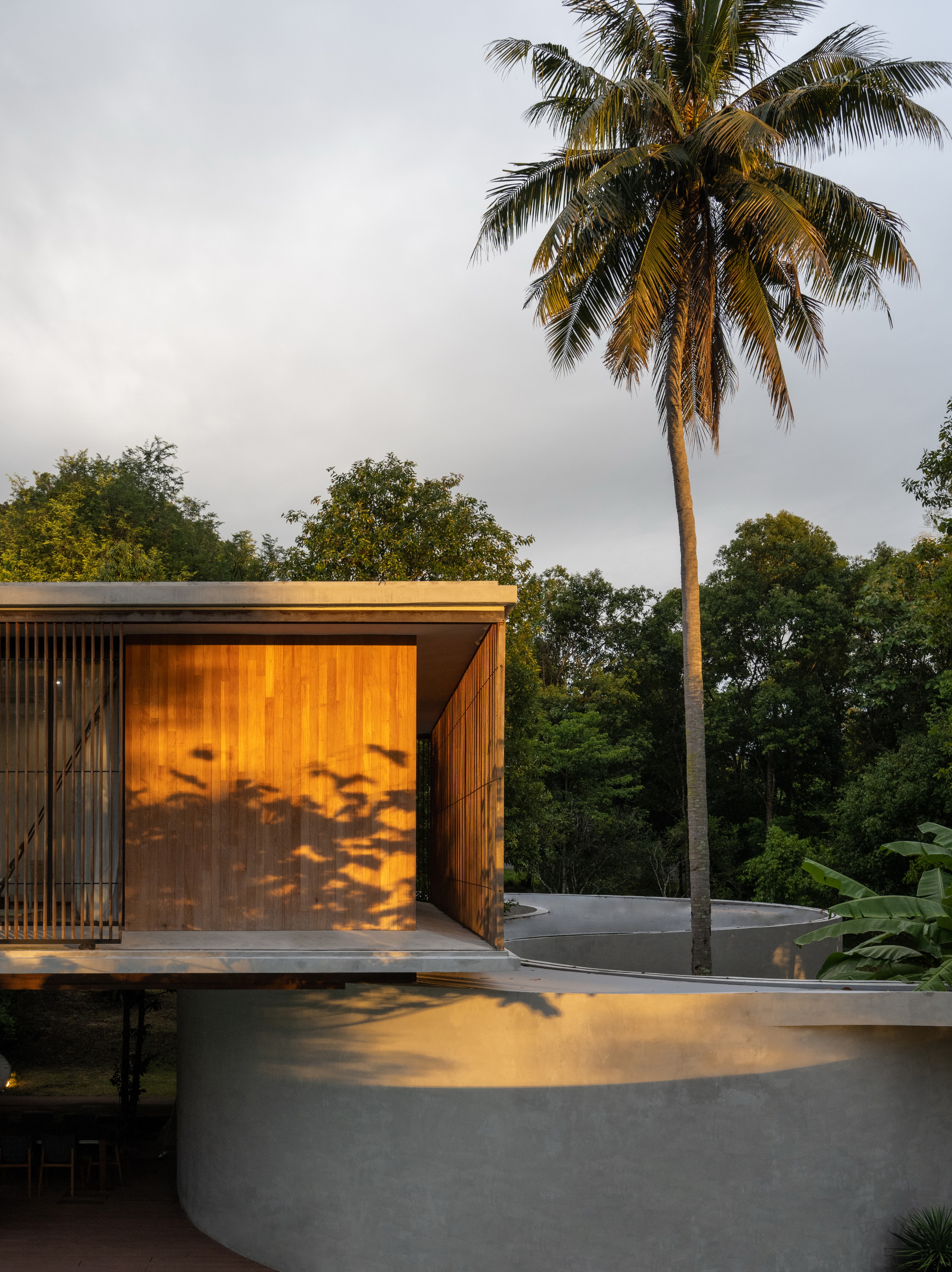 Winding Villa is a vacation home for city dwellers, nestled in the lush landscape of Khao Yai National Park. Located at the border of the natural reserve, the villa sits at the foot of the mountain and share its 20,000 square meter site with a natural animal watering well. In order to cause the least amount of disruption to the natural surroundings, the client and design team decided against the construction of a perimeter fence, opting for a curved geometry that defines only the boundary of the villa. The shape and direction of the curved wall is determined by the location of the existing trees. The winding geometry of the ground floor curves in and out as it avoids or encircles the trees on the site, leaving the trees untouched outside its boundary, or bringing it into the courtyard to become a part of the architecture.
