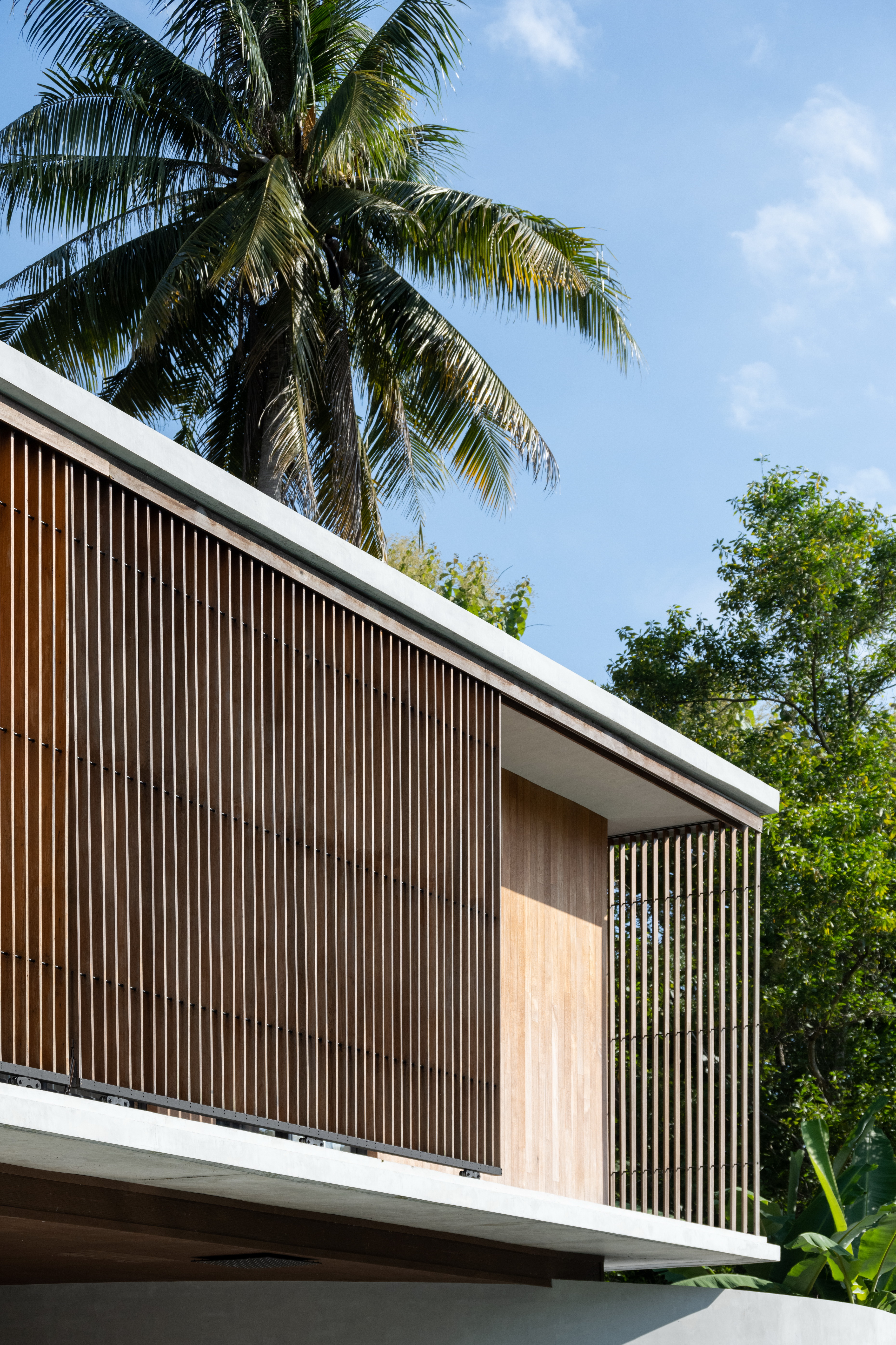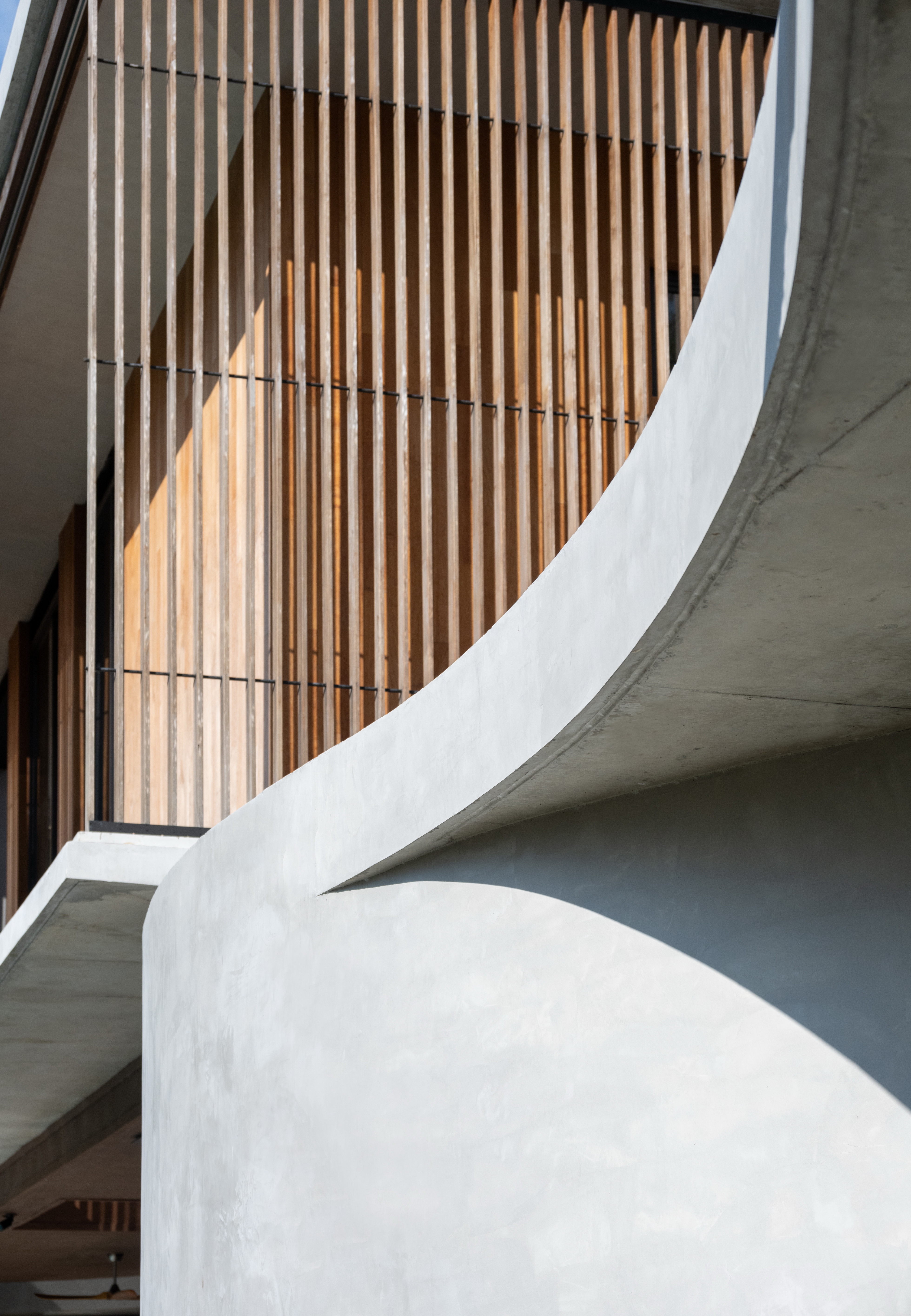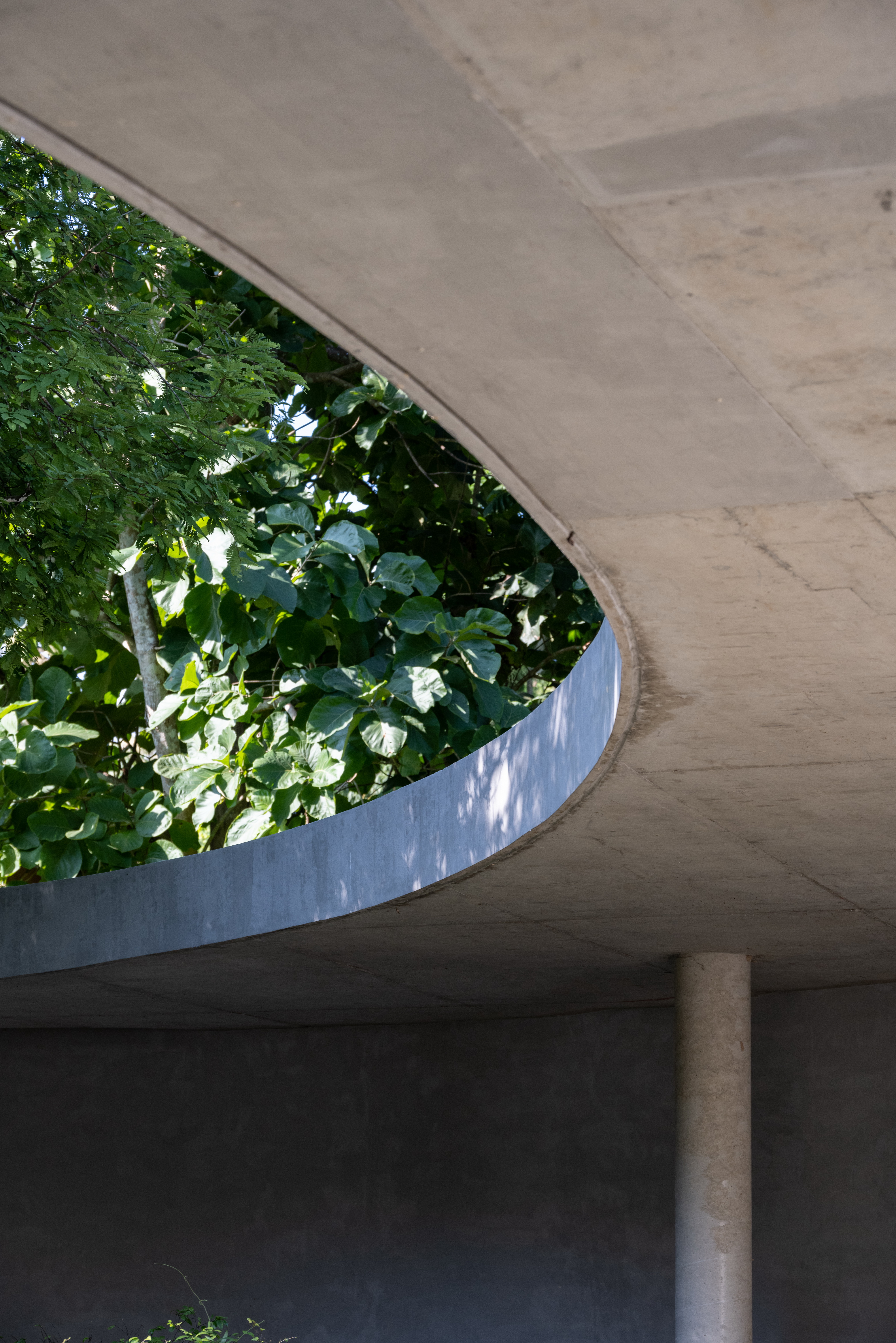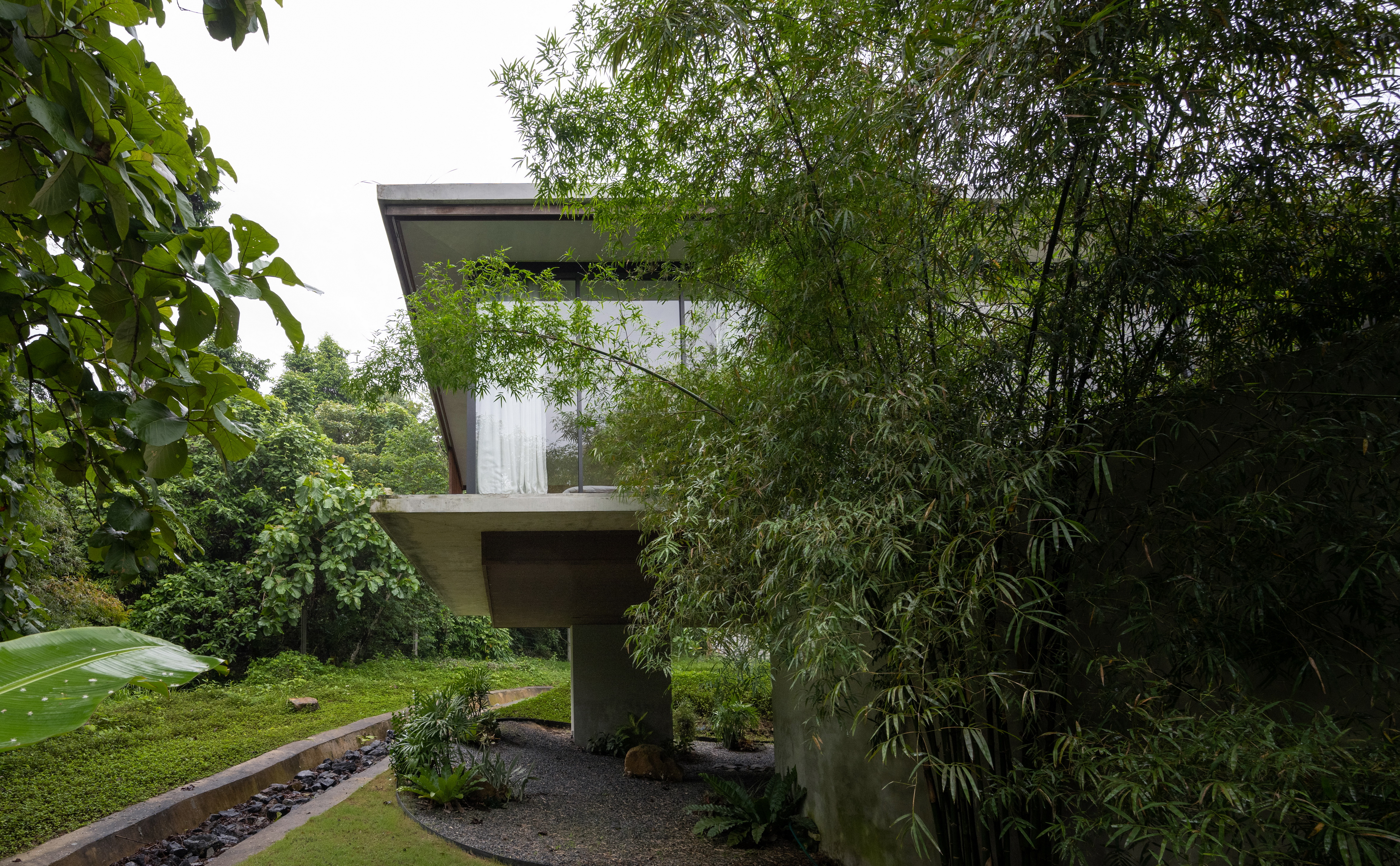 Winding Villa is a vacation home for city dwellers, nestled in the lush landscape of Khao Yai National Park. Located at the border of the natural reserve, the villa sits at the foot of the mountain and share its 20,000 square meter site with a natural animal watering well. In order to cause the least amount of disruption to the natural surroundings, the client and design team decided against the construction of a perimeter fence, opting for a curved geometry that defines only the boundary of the villa. The shape and direction of the curved wall is determined by the location of the existing trees. The winding geometry of the ground floor curves in and out as it avoids or encircles the trees on the site, leaving the trees untouched outside its boundary, or bringing it into the courtyard to become a part of the architecture.