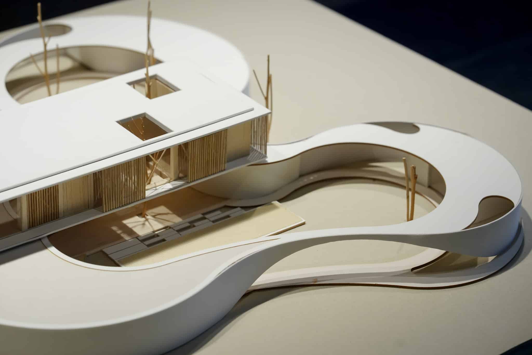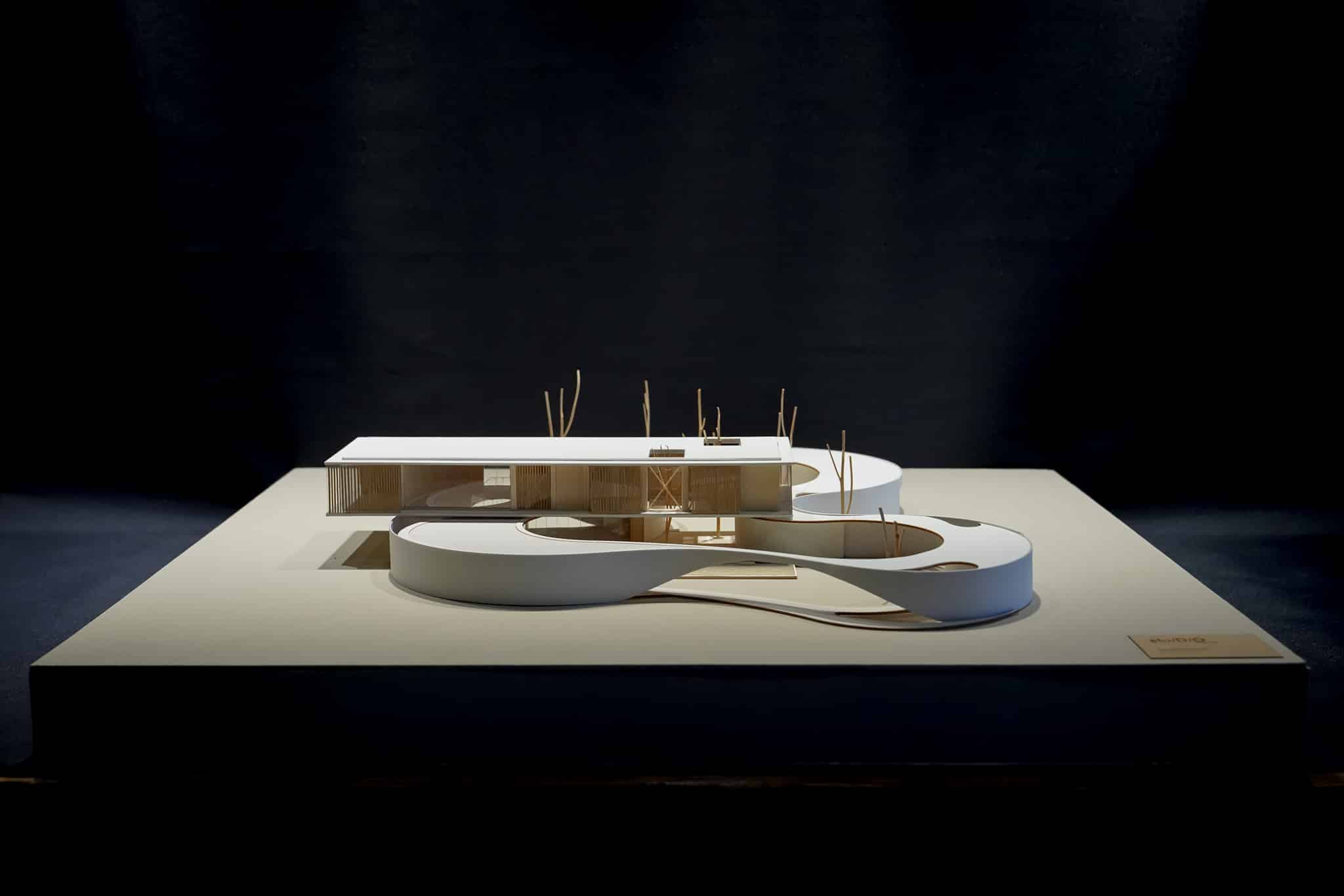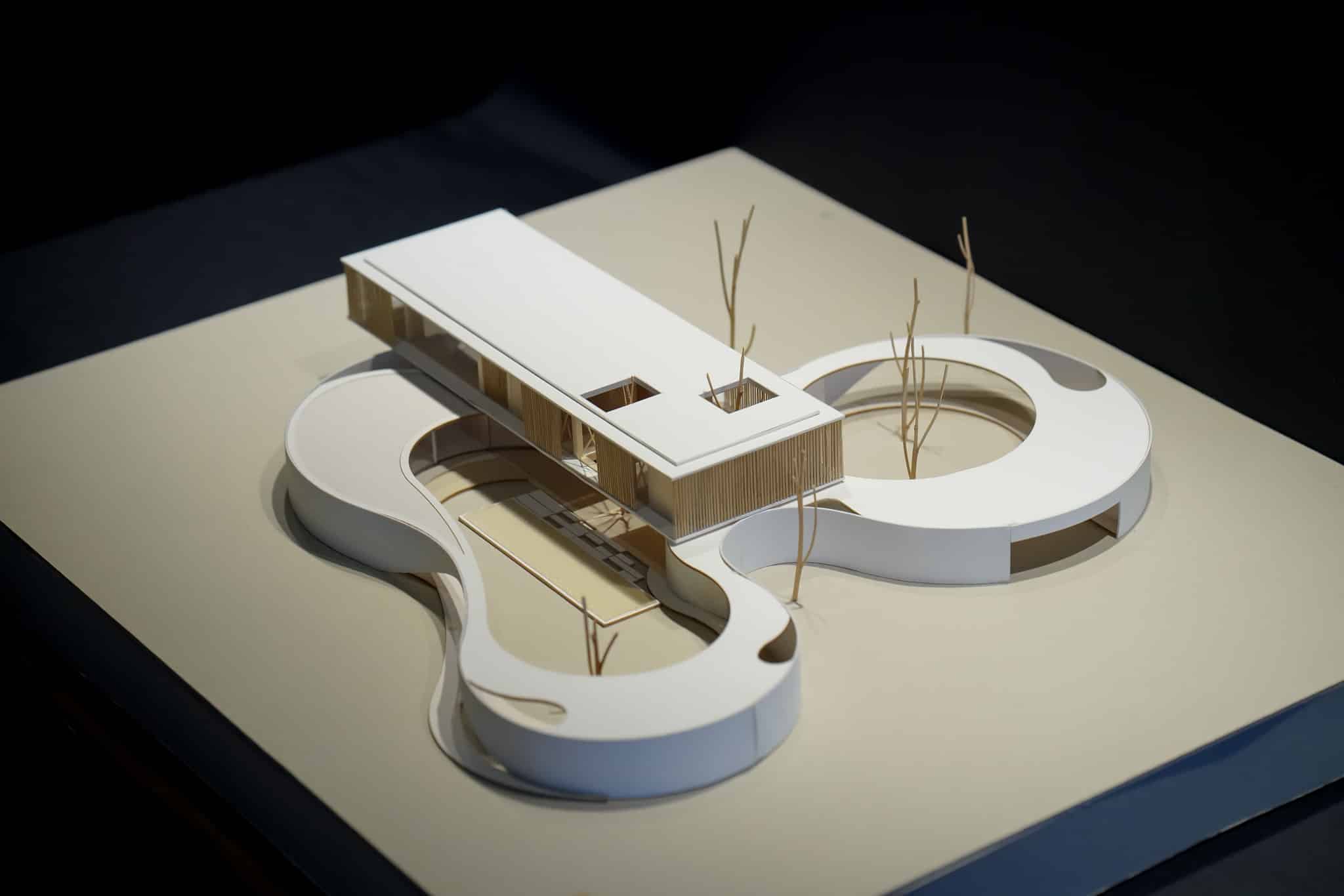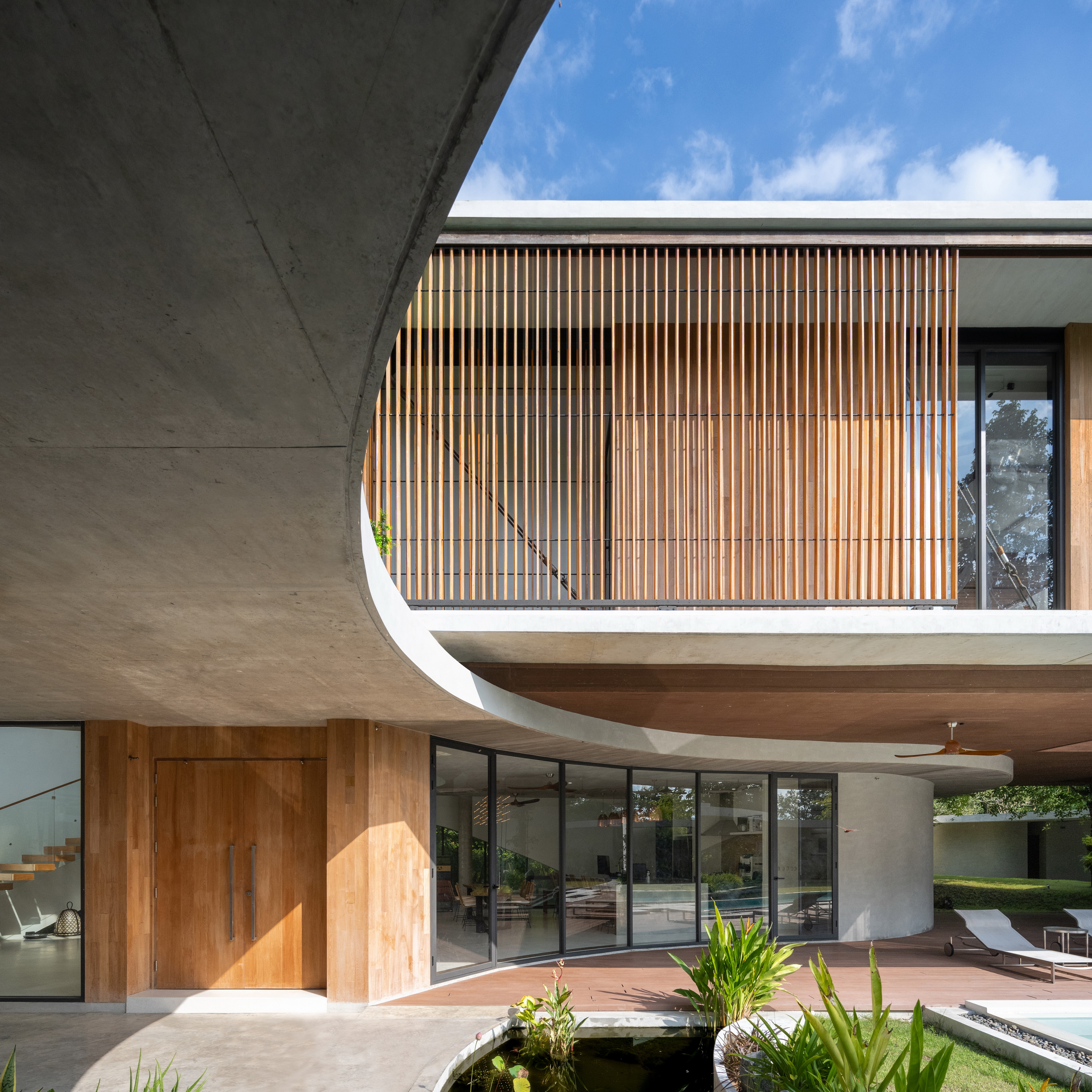 The upper mass containing the sleeping quarters sits above the curving form, overlooking the two courts. Underneath the 20-meter rectangular box placed across the first story’s free form mass, the outdoor pool deck is bounded by a sense of heaviness of the mass above and contained within the organic curve that define an area well suited for relaxation. This sense of being completely open to the exterior nature yet enclosed by the architectural boundaries whether it be in the curving walls or organic shaped ponds surrounding the perimeter, provide a sense of place and feeling of home within this unique site.