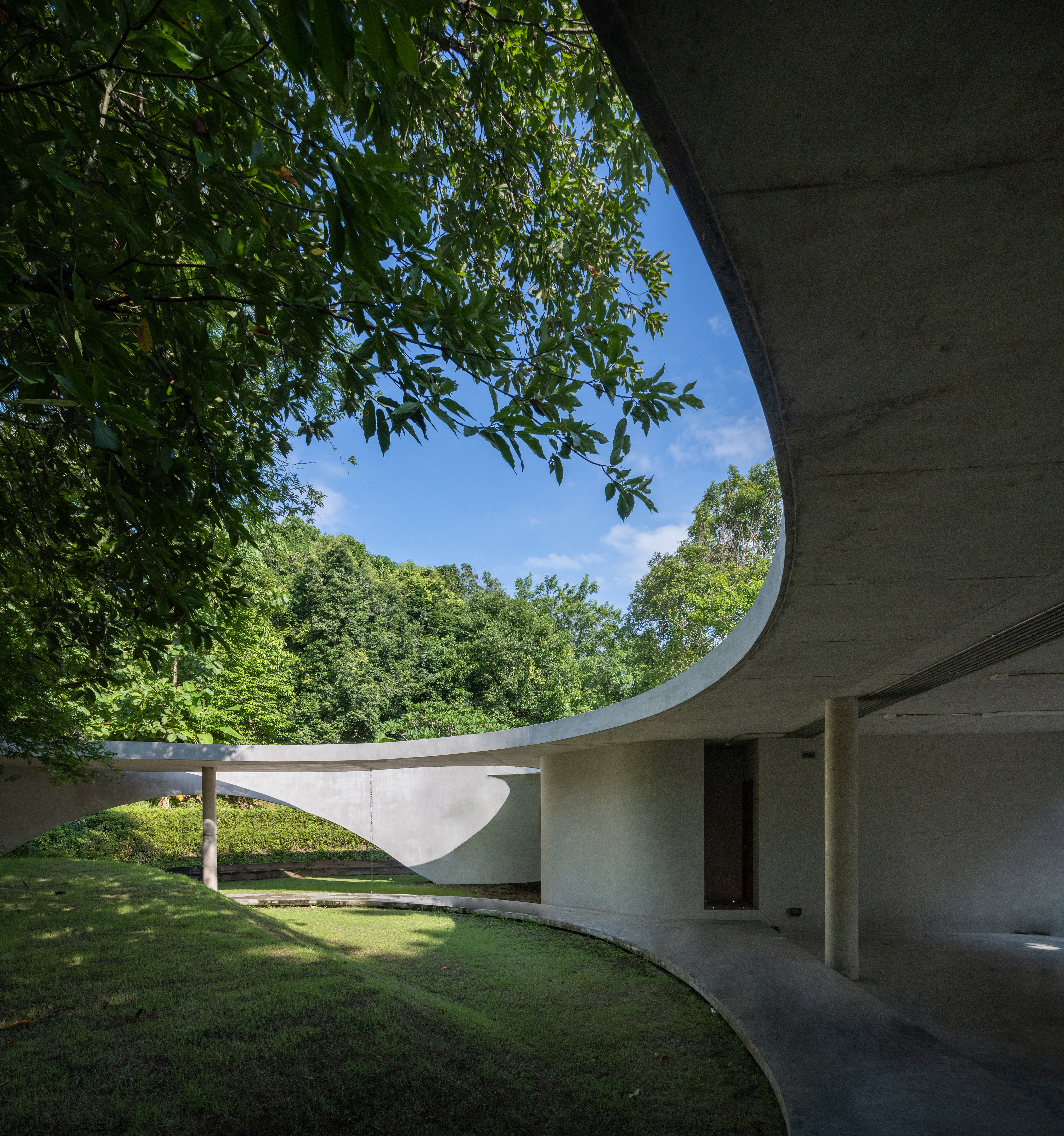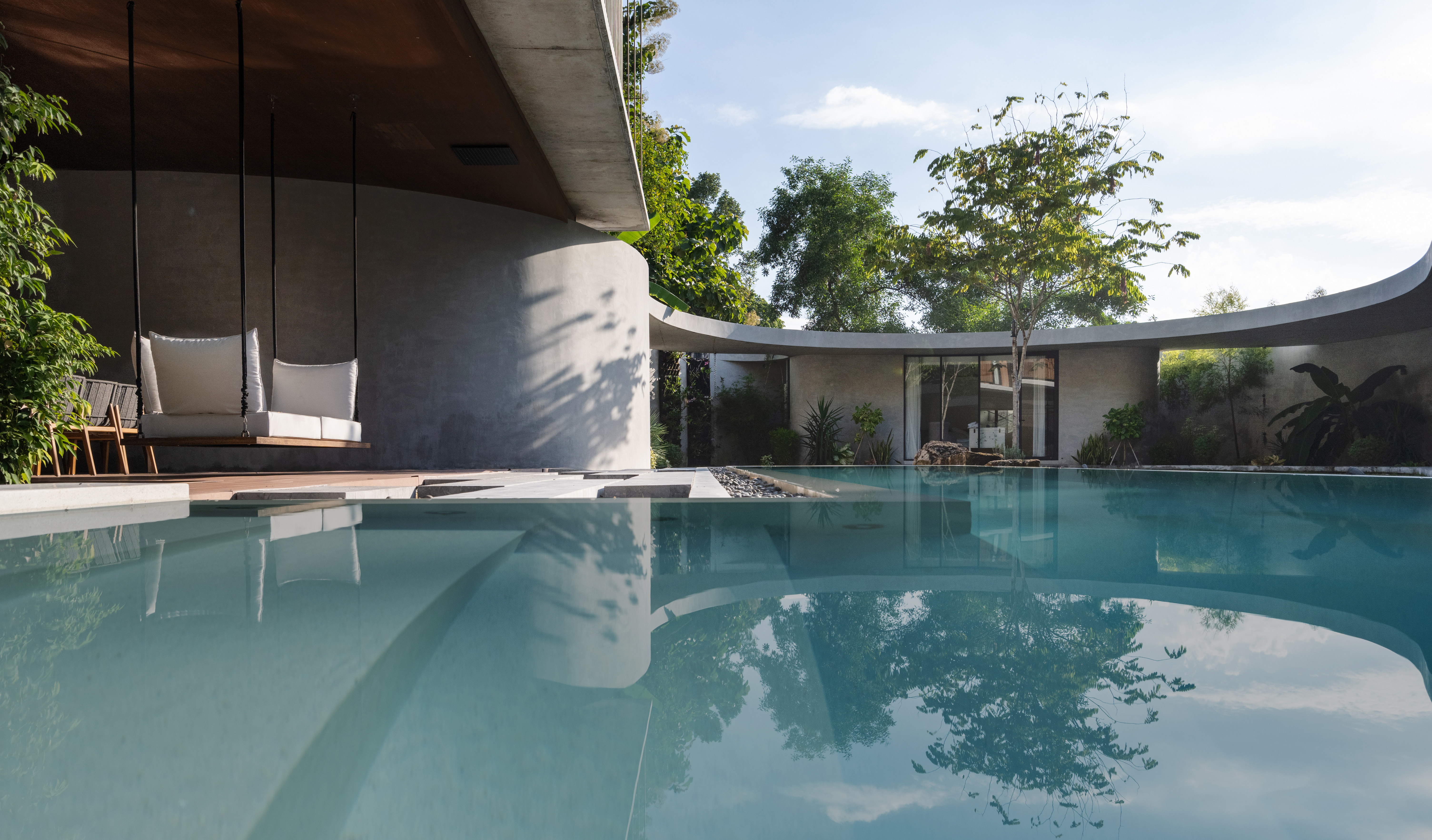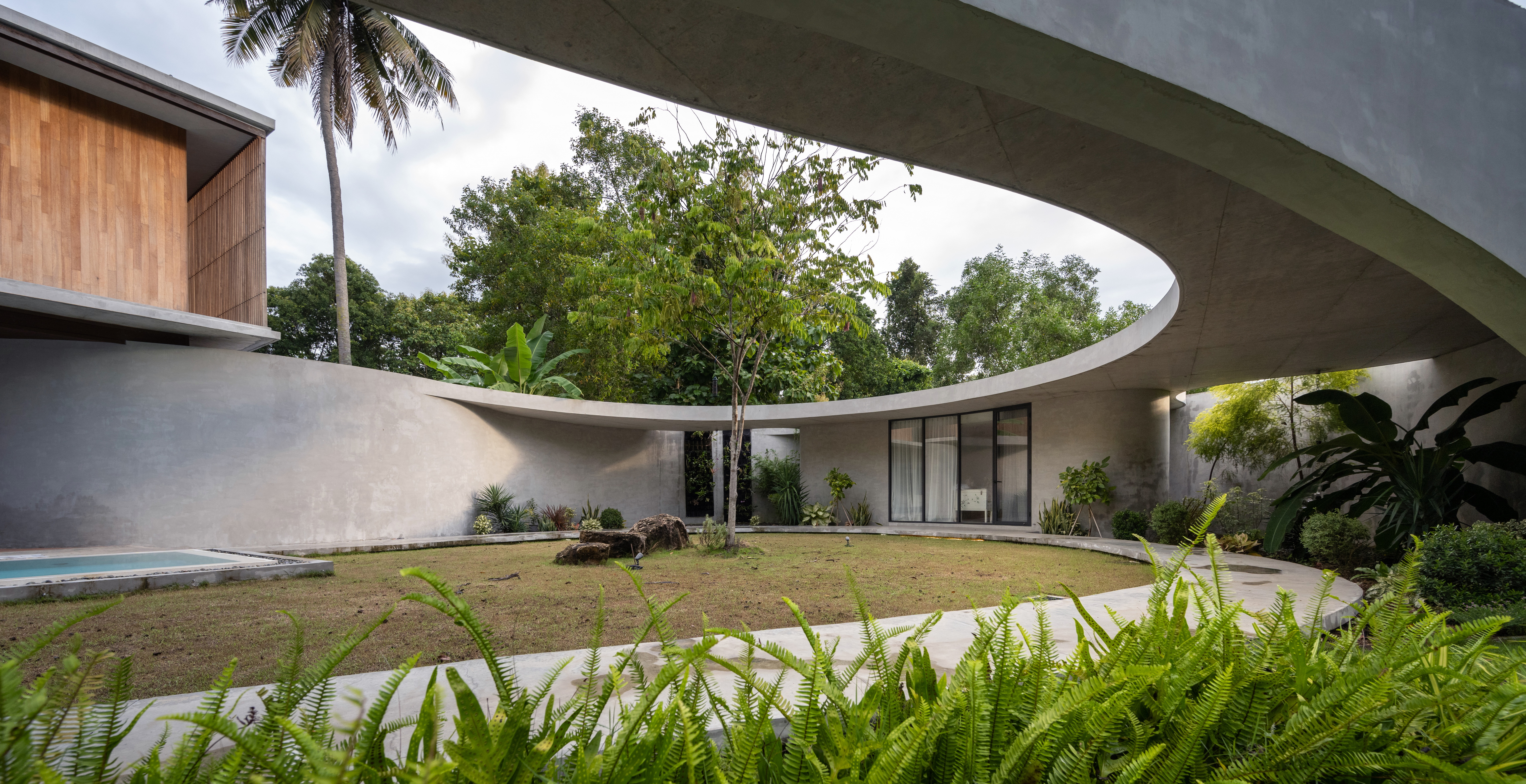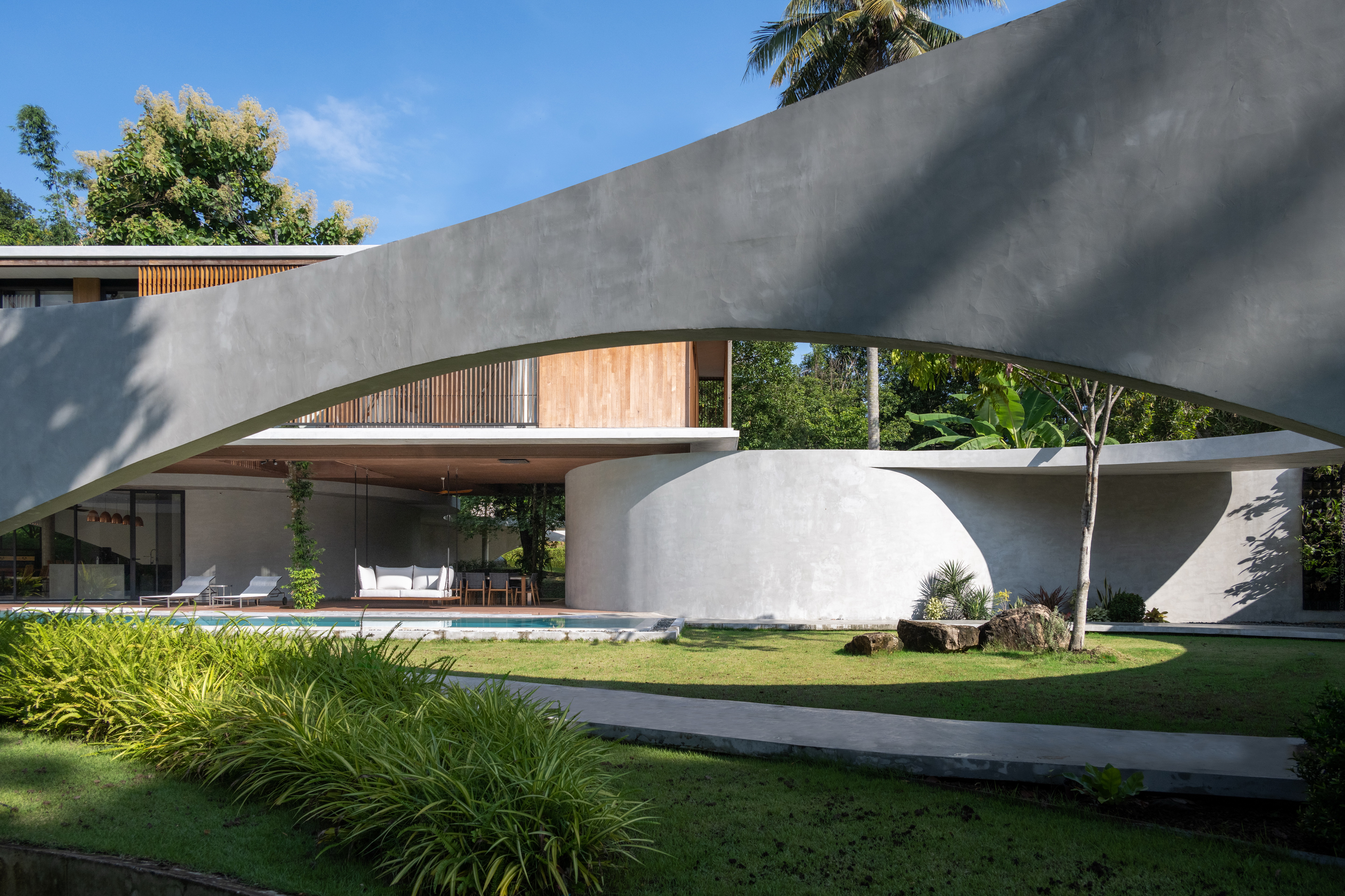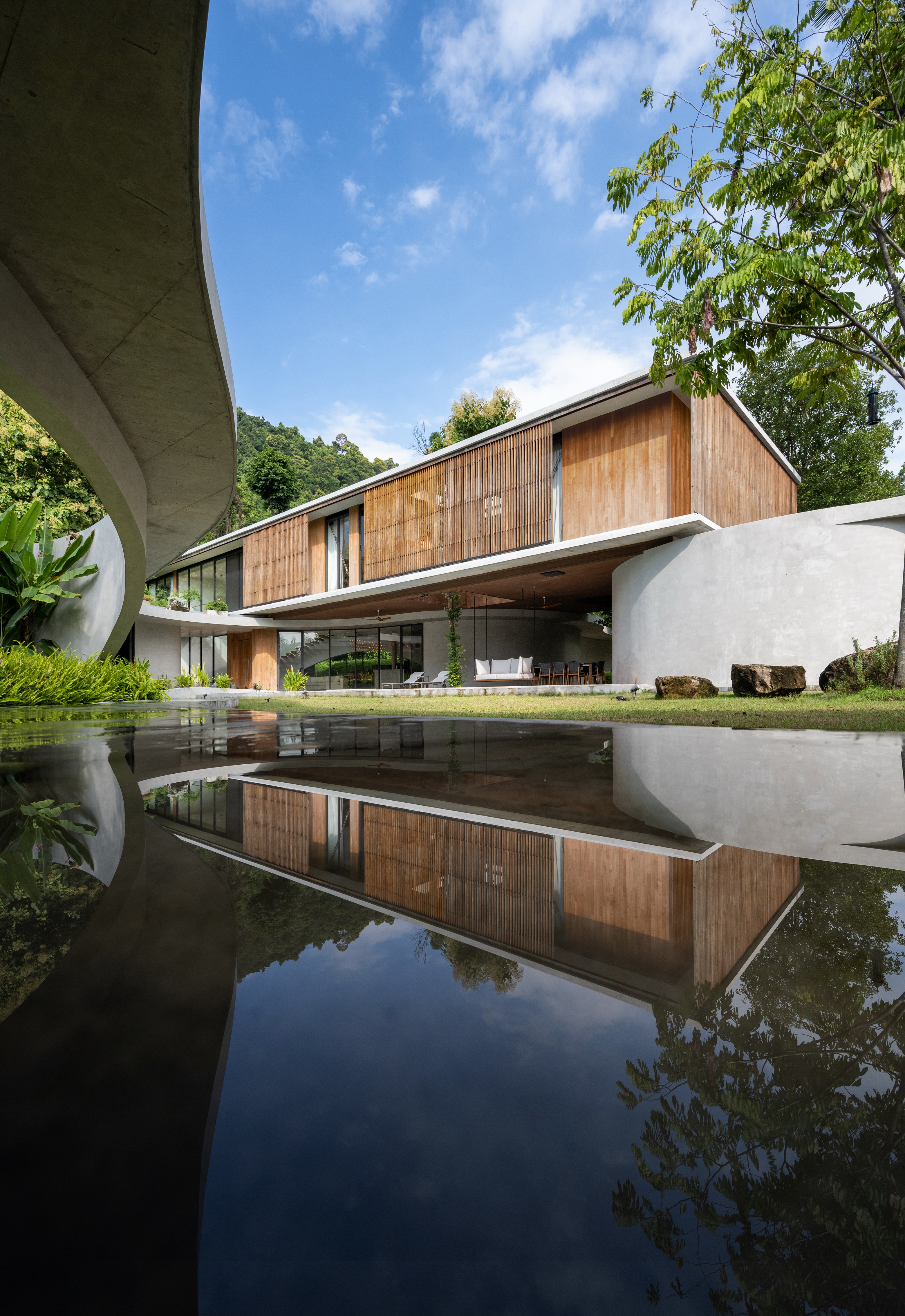 As the curved boundary wall winds around the site, it transforms itself from walls to walkways and corridors, and into living spaces. This organic curve wall also lifts up into arches, creating both physical and visual connection to the site outside the villa’s boundary. At its largest opening, the ground condition transforms from grass to reflection ponds, to discourage wild animals from entering the villa in the most natural way possible.