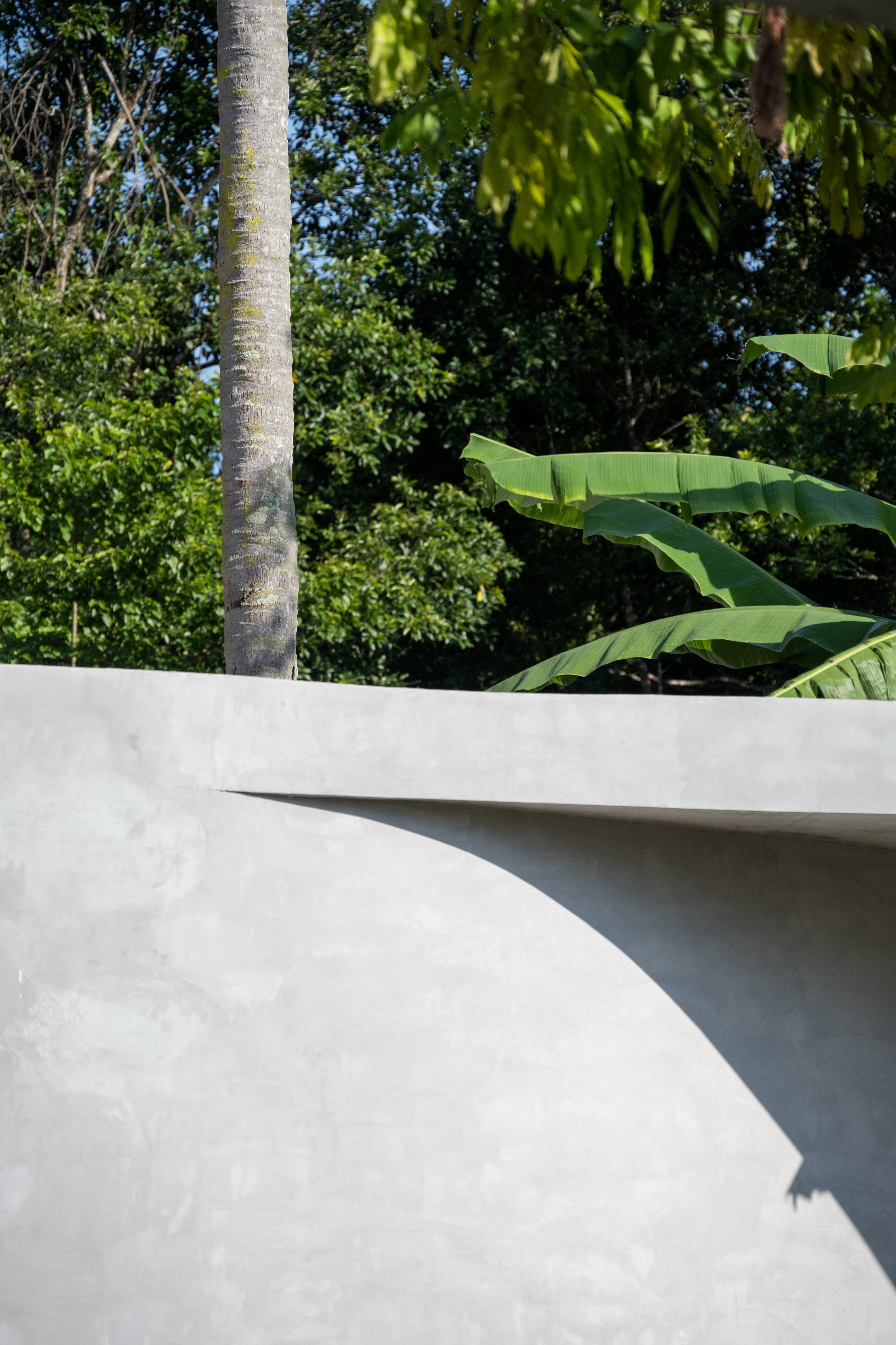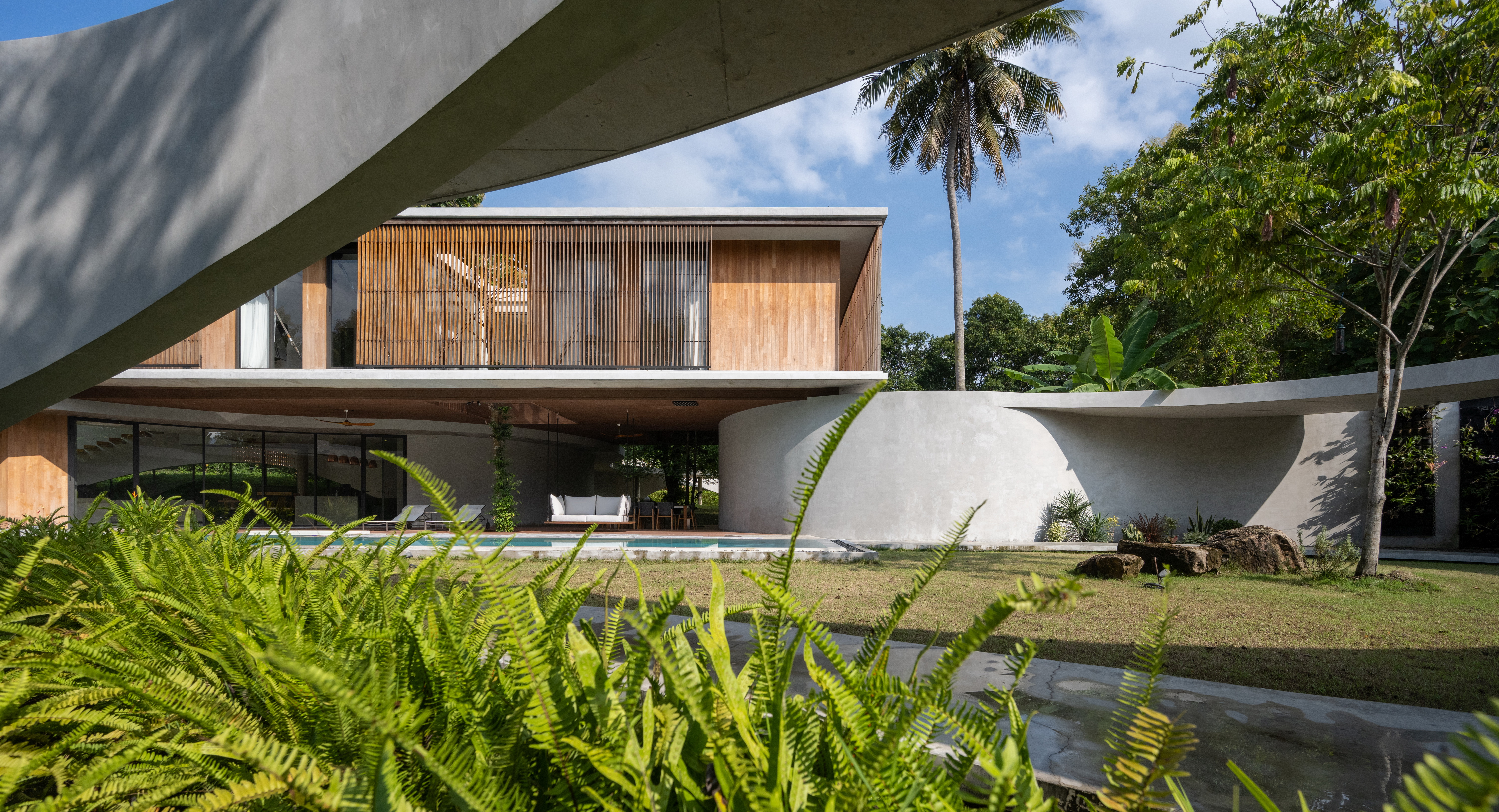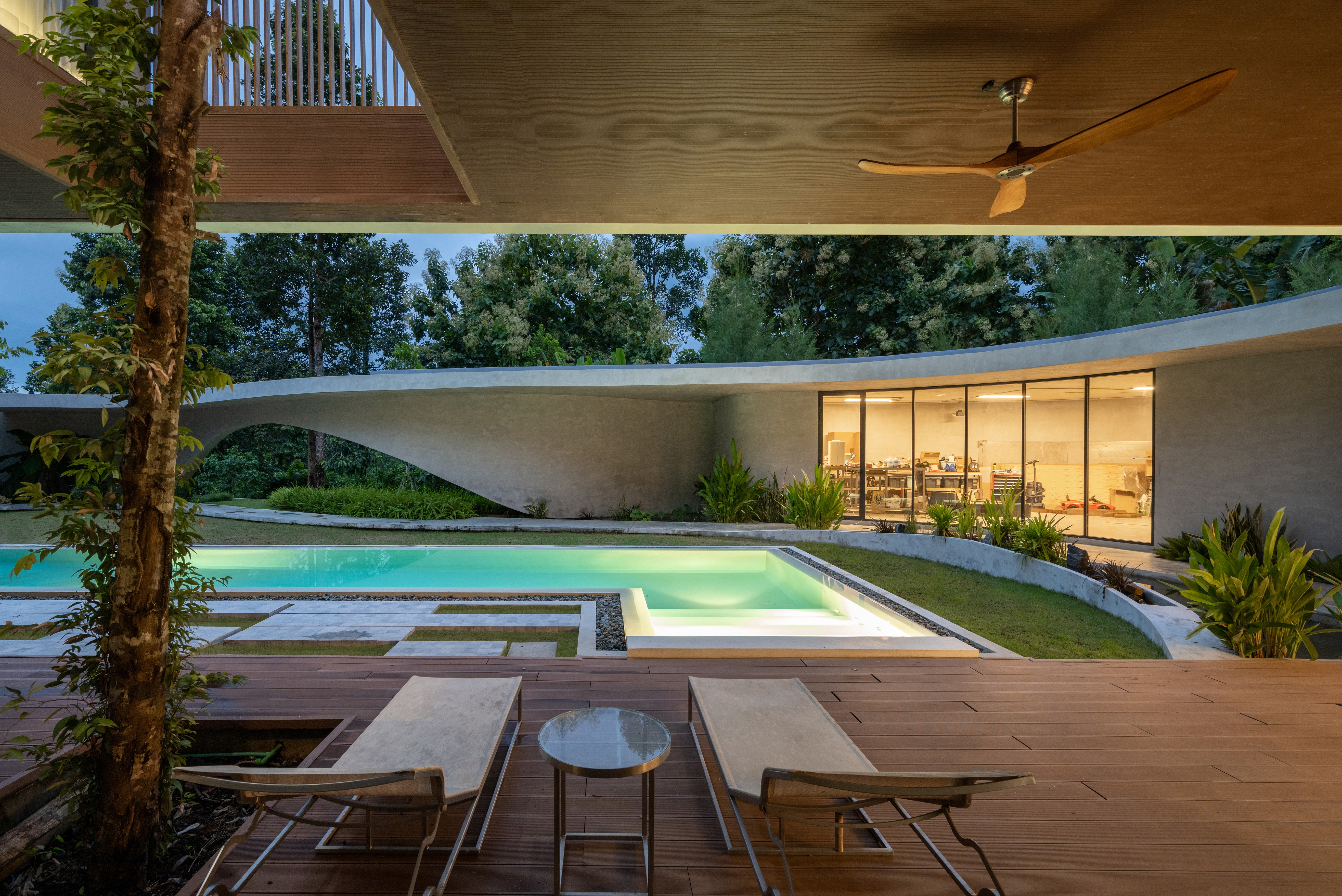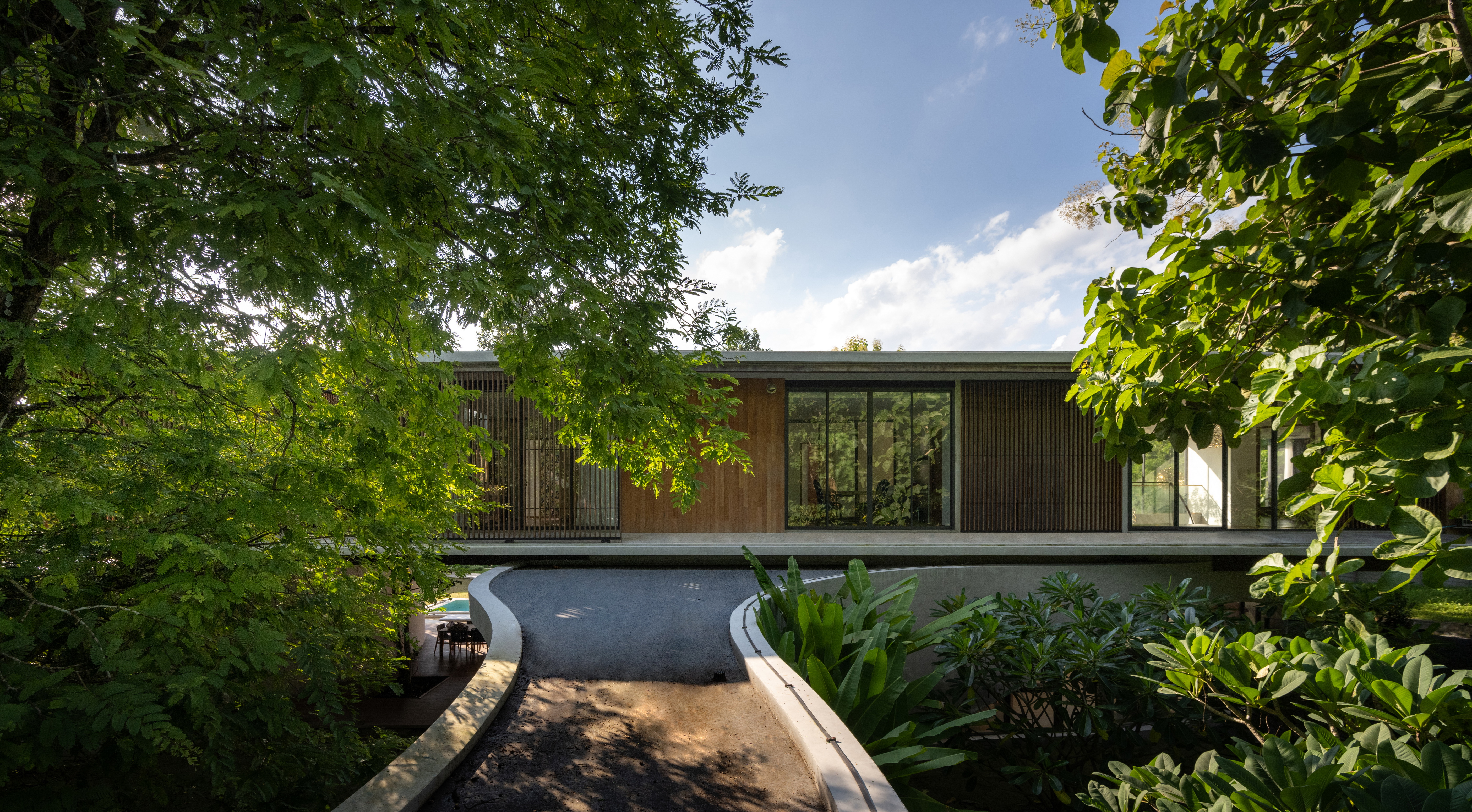 As the curved boundary wall winds around the site, it transforms itself from walls to walkways and corridors, and into living spaces. This organic curve wall also lifts up into arches, creating both physical and visual connection to the site outside the villa’s boundary. At its largest opening, the ground condition transforms from grass to reflection ponds, to discourage wild animals from entering the villa in the most natural way possible.