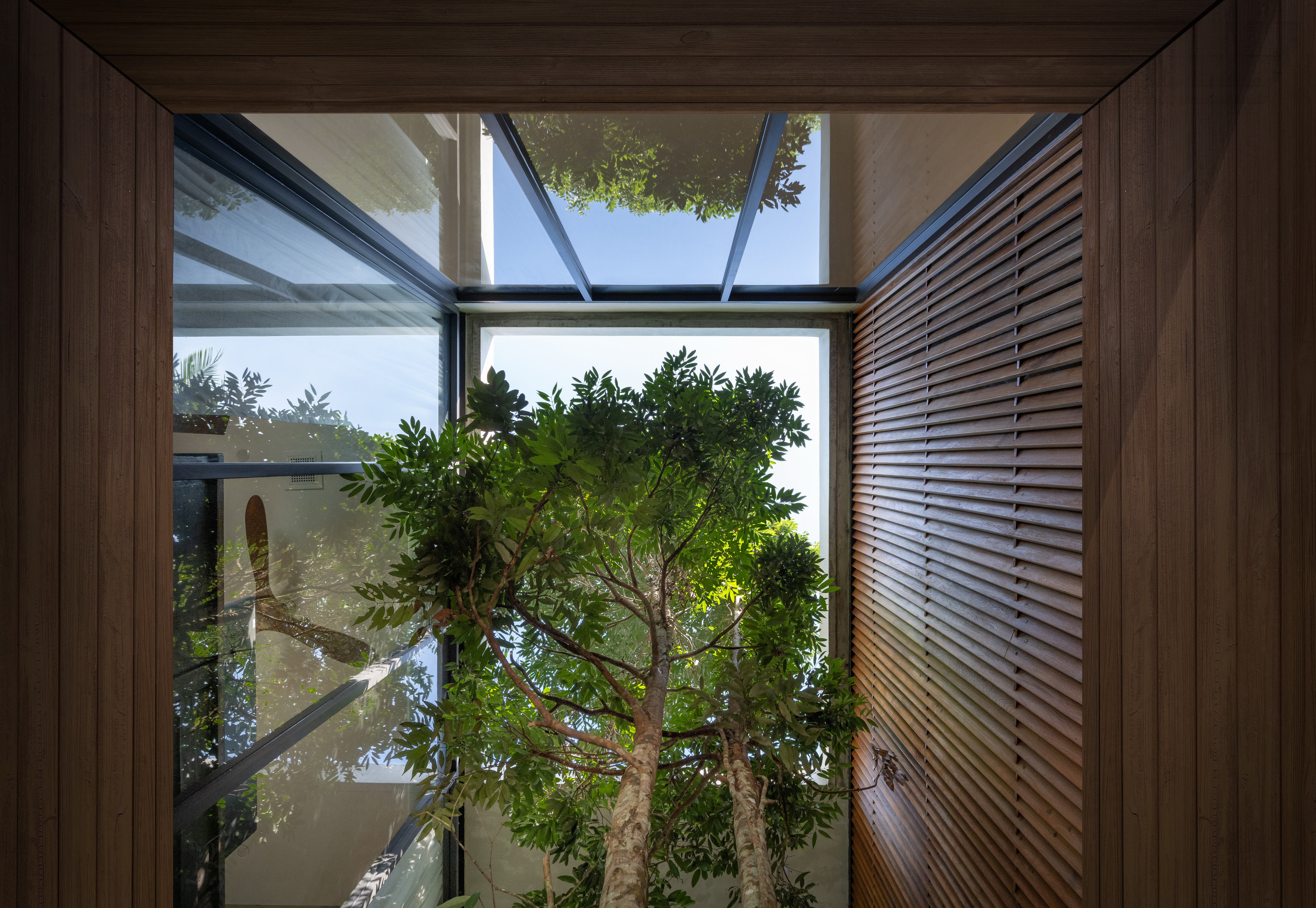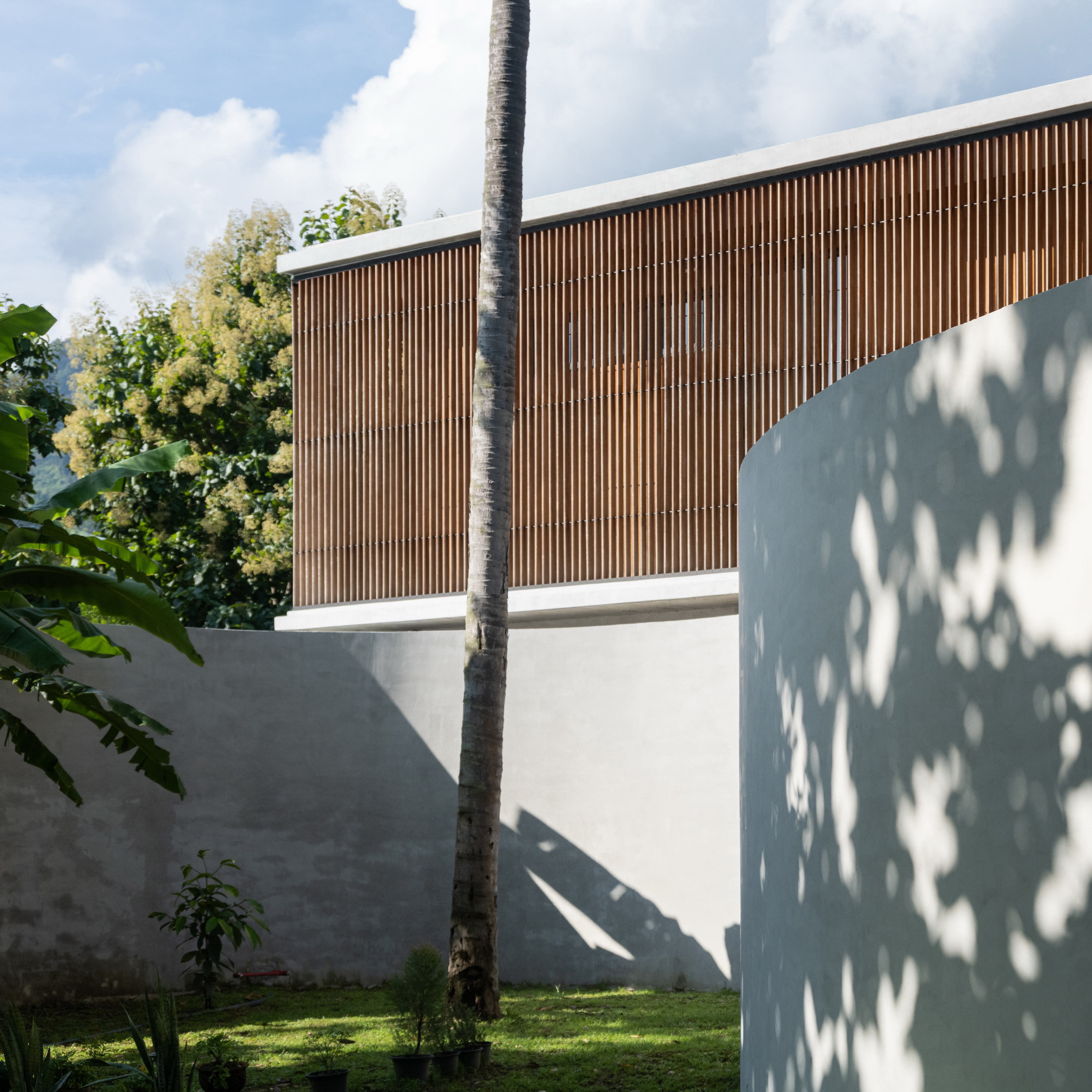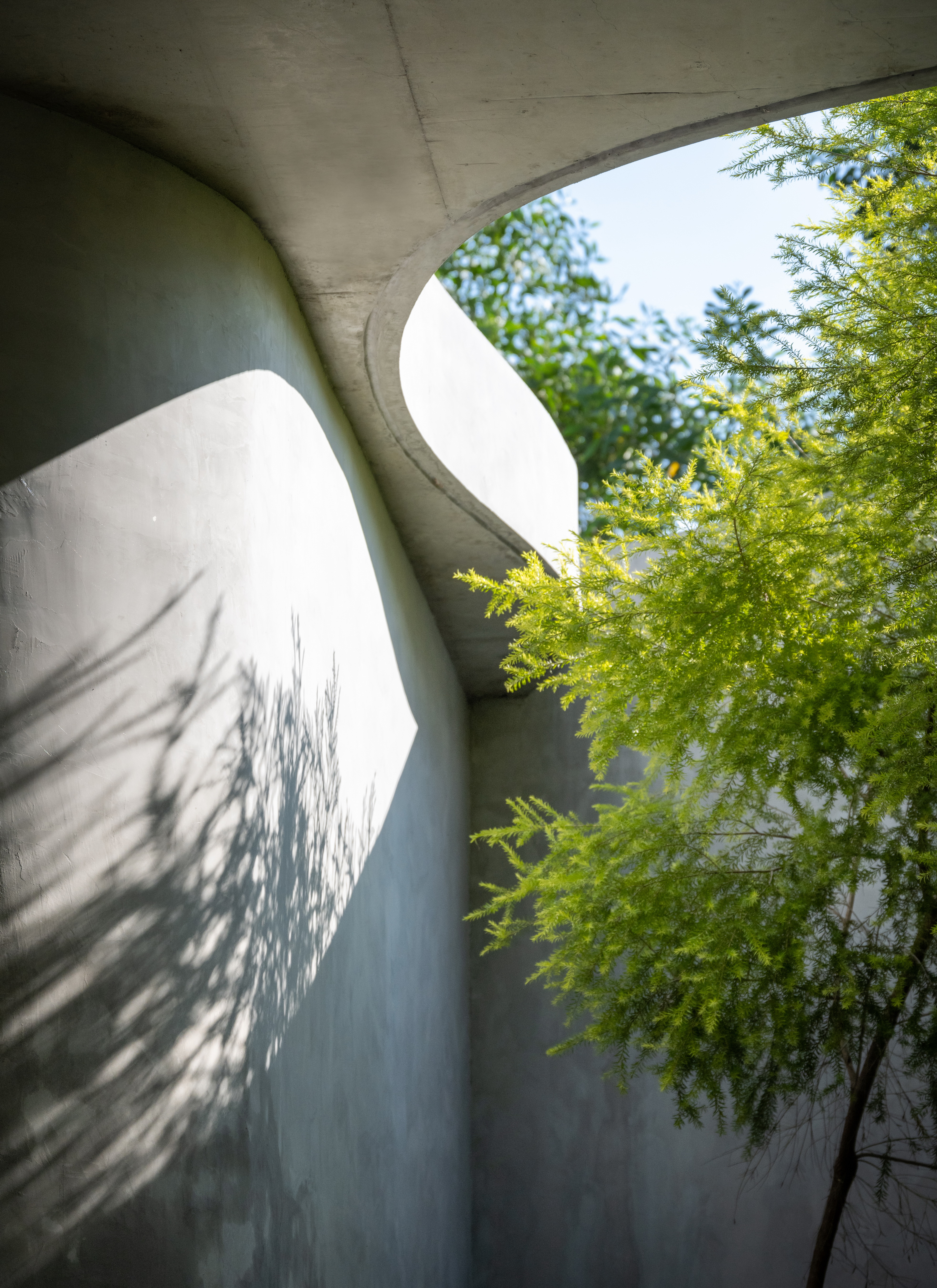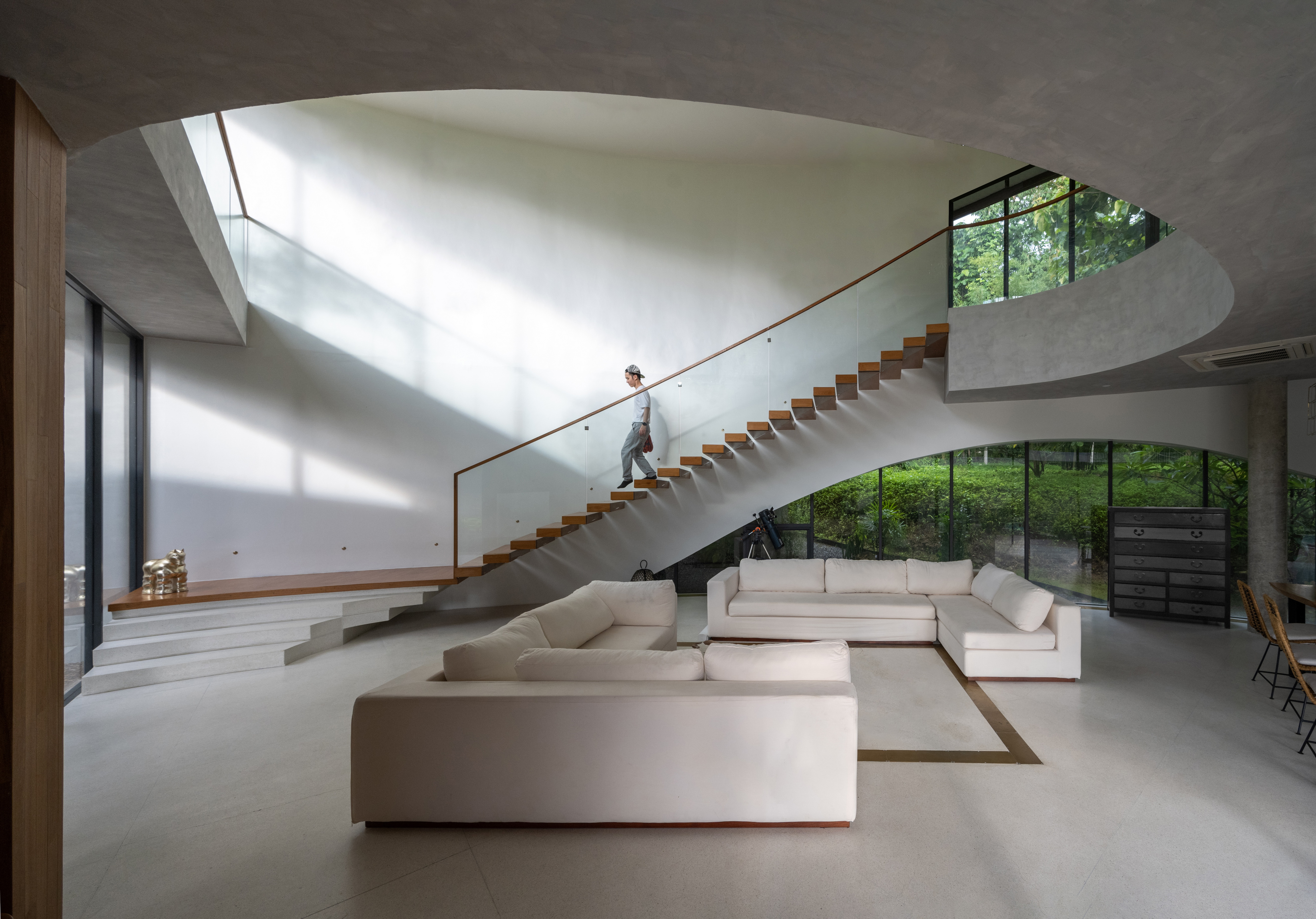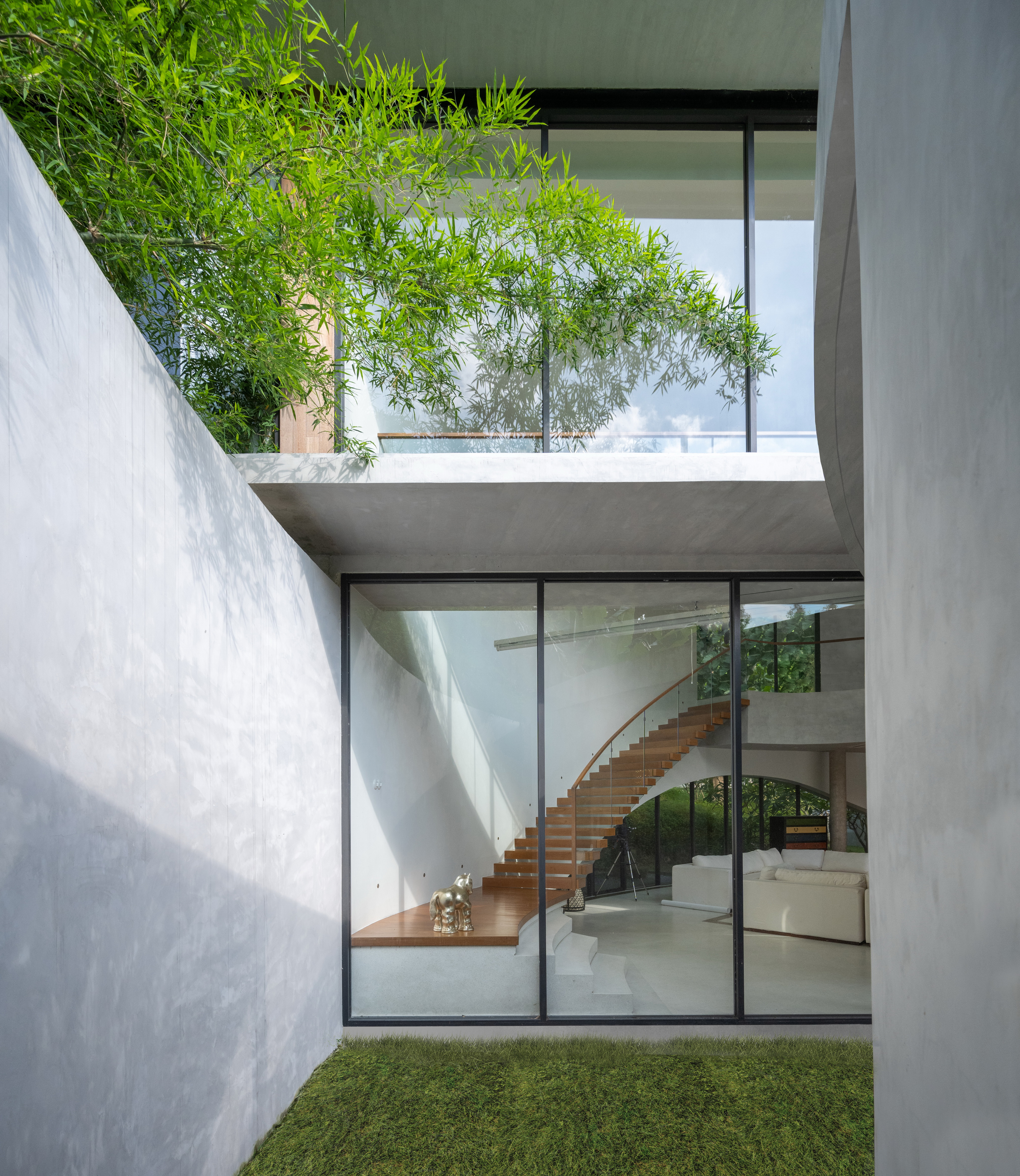 As the curved boundary wall winds around the site, it transforms itself from walls to walkways and corridors, and into living spaces. This organic curve wall also lifts up into arches, creating both physical and visual connection to the site outside the villa’s boundary. At its largest opening, the ground condition transforms from grass to reflection ponds, to discourage wild animals from entering the villa in the most natural way possible.